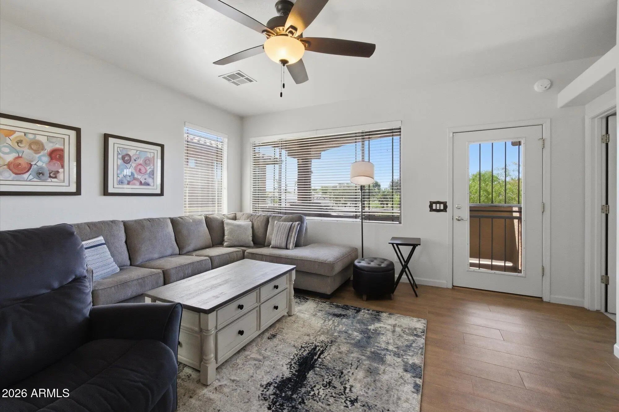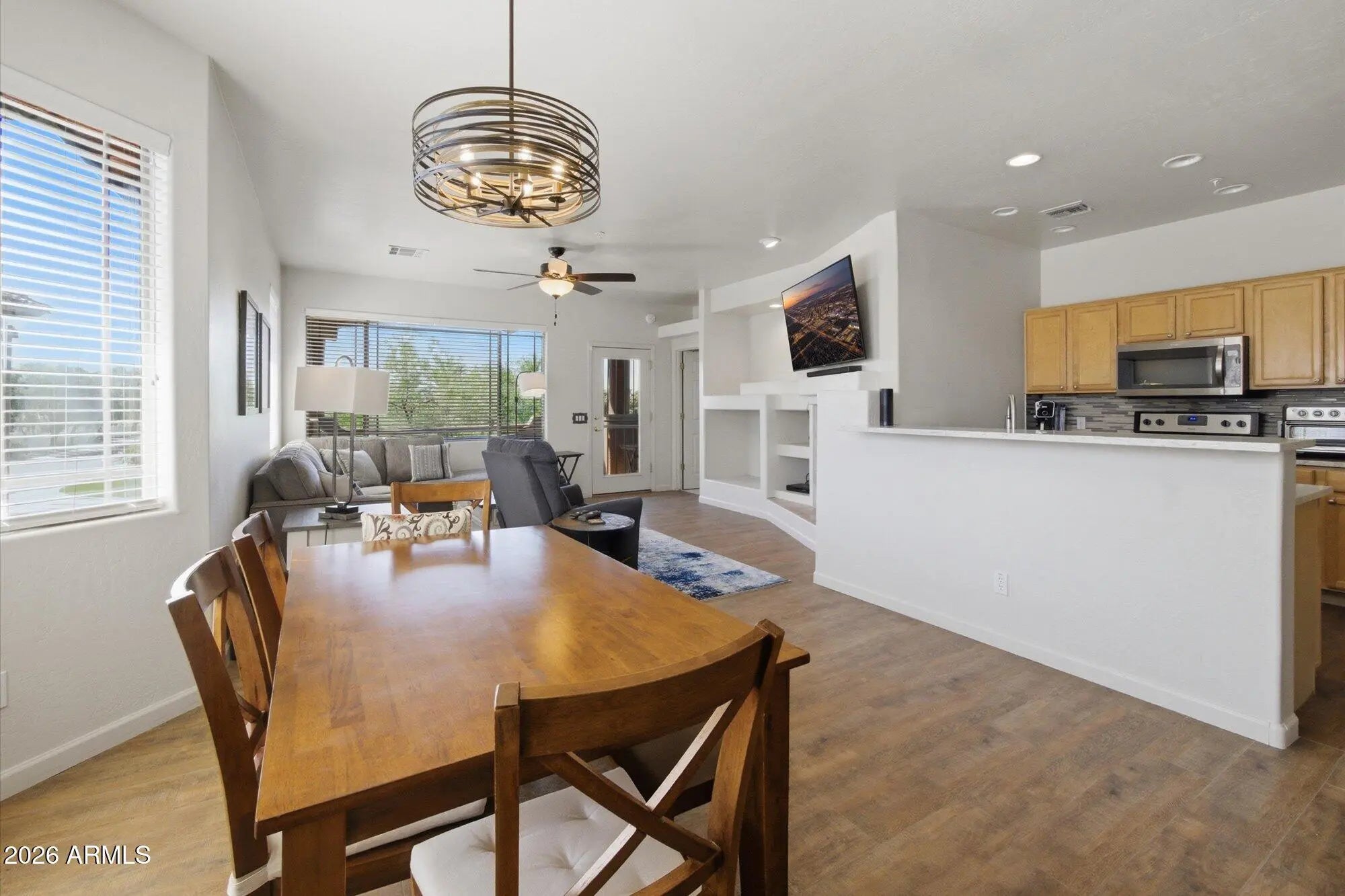 Experience the ultimate resort lifestyle in this picturesque, community! Residents enjoy premium on-site amenities, including a sparkling community pool and spa, a community fitness center, and a clubhouse perfect for hosting private gatherings. Outdoor entertaining is a breeze with multiple BBQ grills conveniently located throughout the complex. Nestled within this vibrant setting is a beautifully appointed, fully furnished end-unit home offering a truly turnkey, move-in ready experience. Step inside to discover an inviting, open-concept floor plan highlighted by elegant wood-look flooring, modern lighting, and contemporary finishes throughout. The spacious living room features a cozy fireplace and flows seamlessly into the dedicated dining area. The well-equipped kitchen is an entertainer's dream, boasting stainless steel appliances, light wood cabinetry, and a stylish tiled backsplash. Retreat to the beautifully updated bathrooms, or step outside to your private balcony to soak in the famous Arizona sunshine while taking in stunning mountain views. Don't miss this exceptional opportunity for effortless desert living!
