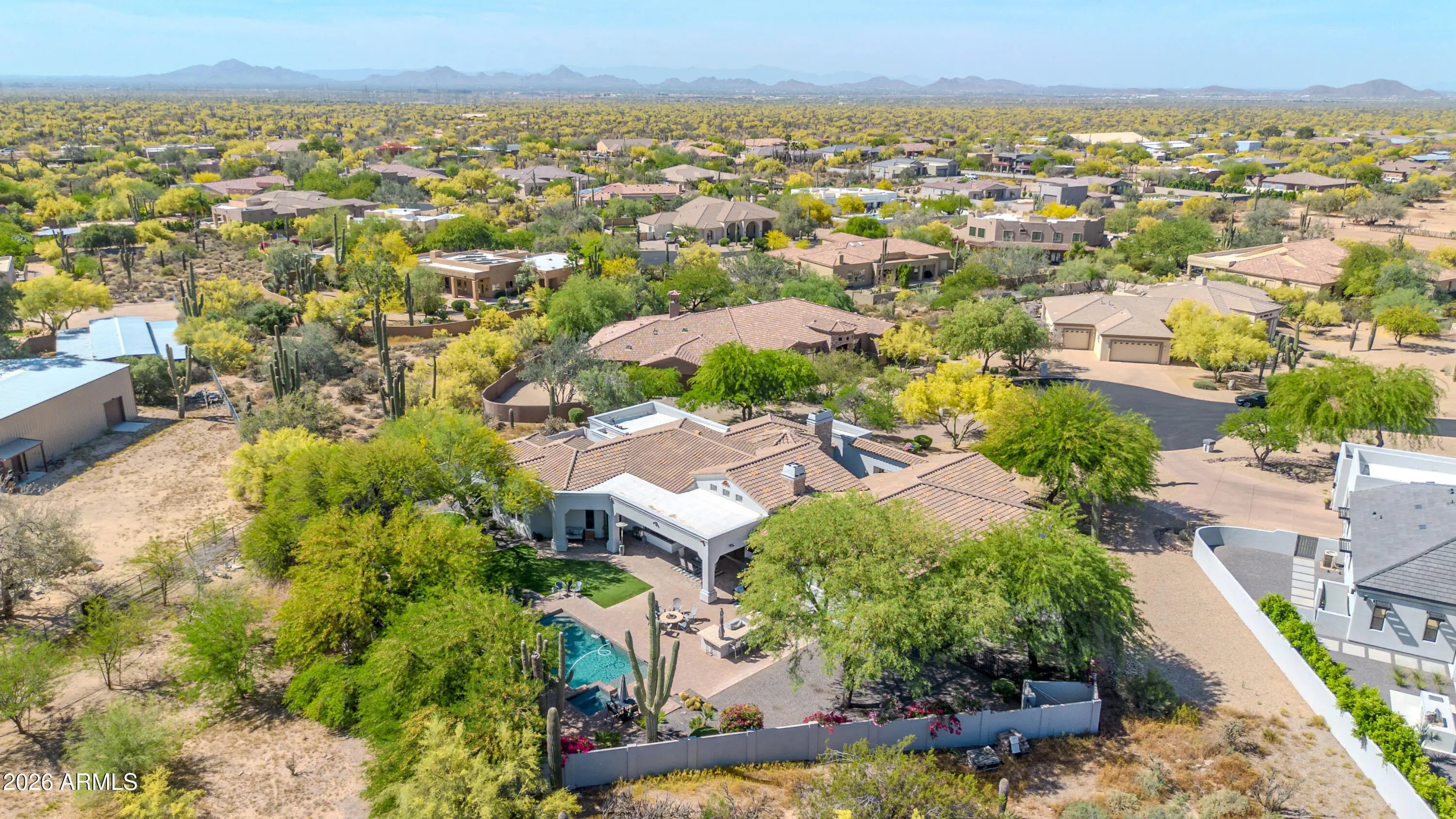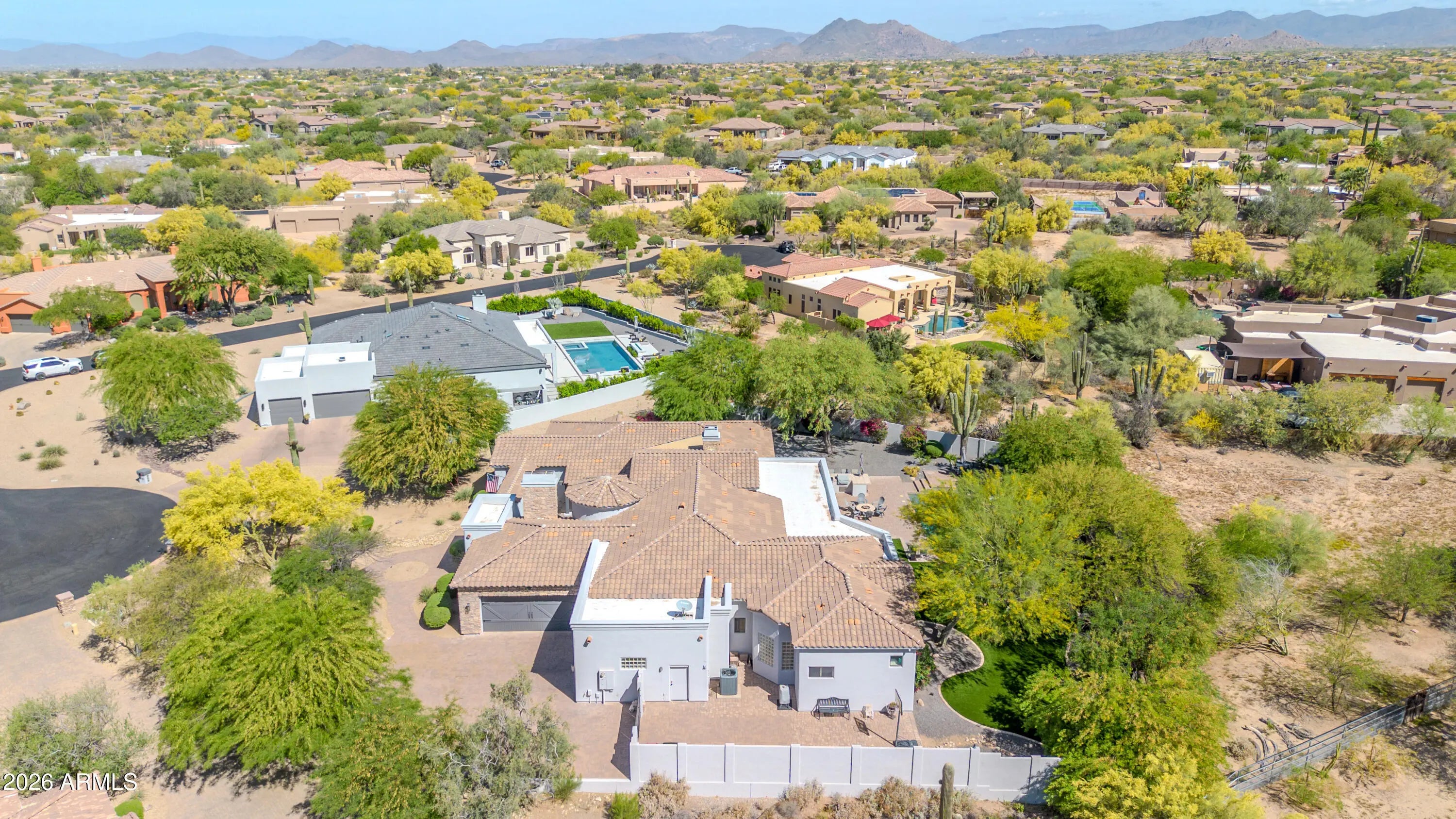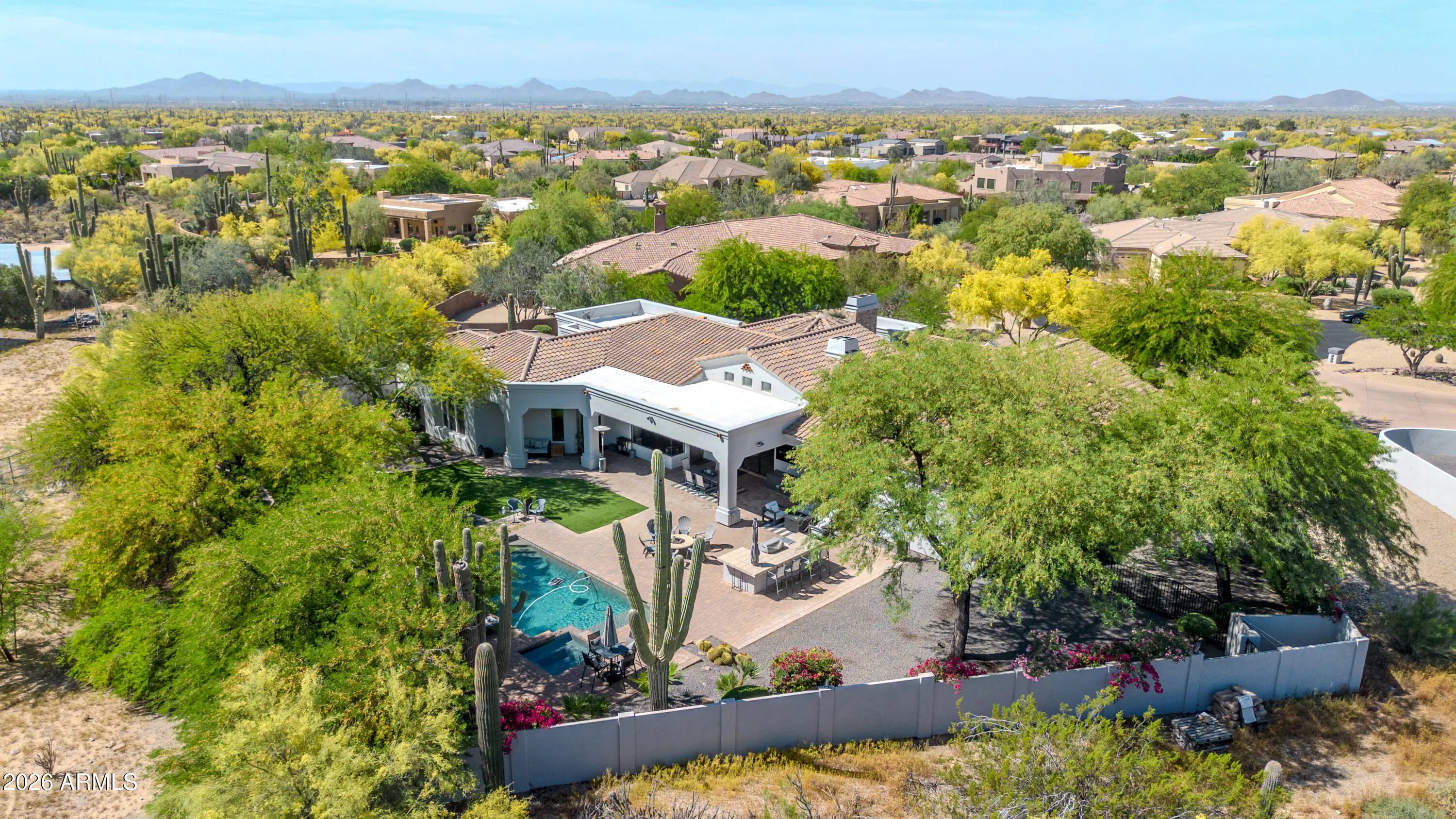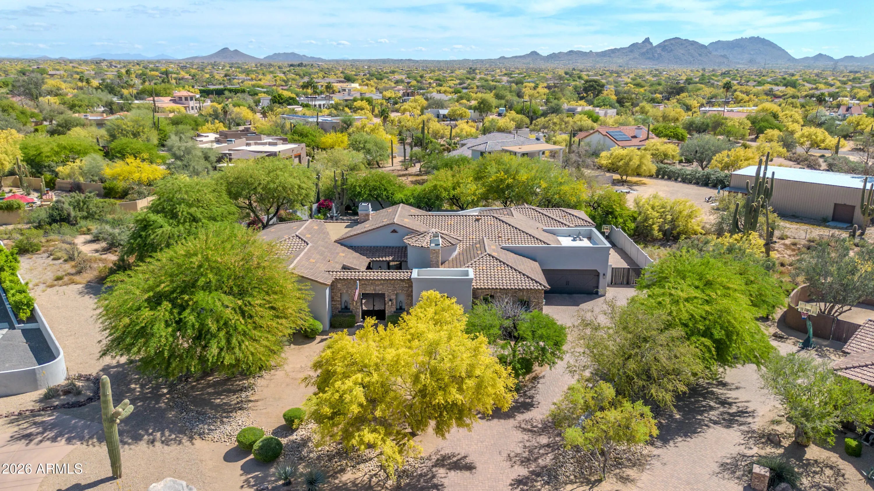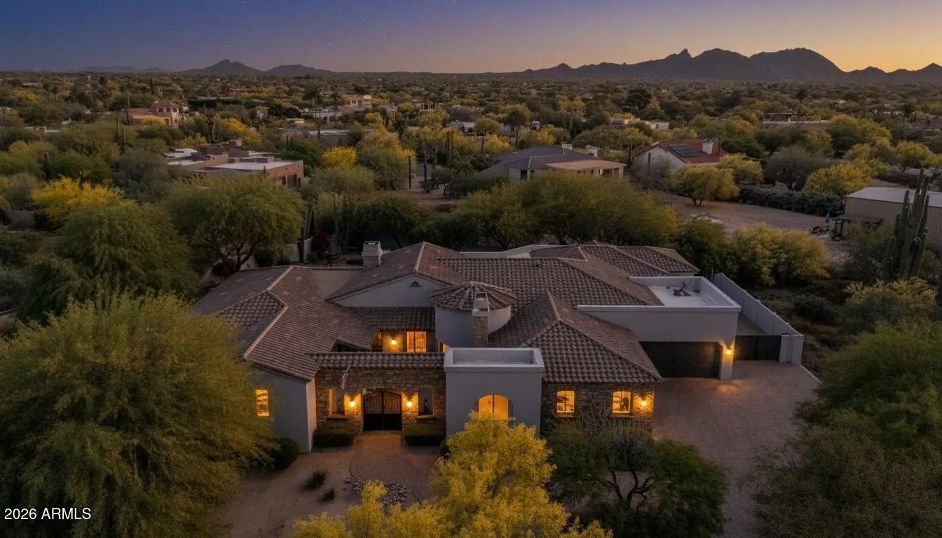 Breathtaking custom luxury home in Scottsdale's highly sought-after Desert Foothills, nestled on a private cul-de-sac lot just under an acre with a 4-car garage featuring built-in storage, epoxy floors, and RV parking. This stunning 4,664 sq ft residence showcases exceptional craftsmanship and timeless design throughout. Enter through a charming front courtyard with fireplace into an expansive great room featuring striking wood beam ceilings and seamless indoor-outdoor living with two 12' multi-slide pocket doors. The gourmet kitchen opens to the family room with a masonry fireplace and boasts a large butcher block island, luxury appliances, and custom finishes throughout. A spacious game room with wet bar offers additional entertaining space and opens directly to the front courtyard, creating a seamless indoor-outdoor flow. A thoughtfully designed split floorplan offers 5 spacious bedrooms with en-suite baths and walk-in closets, 4.5 bathrooms, a private office with custom glass doors, and a tiered theater room. Additional features include a whole-home multimedia system, advanced security system, wired speakers, and no interior steps. The resort-style backyard is an entertainer's dream, complete with a fully automated pool and spa with water features, fire pit, built-in BBQ island, outdoor shower, expansive newly installed artificial grass area, side yard for sports, and a large covered patio. A separate, fully fenced dog run is thoughtfully positioned out of view. Lush landscaping, mature tree-lined grounds, a paver driveway, custom carriage garage doors, and an impressive iron front entry complete this exceptional property. Every imaginable feature, exceptional privacy--this is luxury living at its finest.