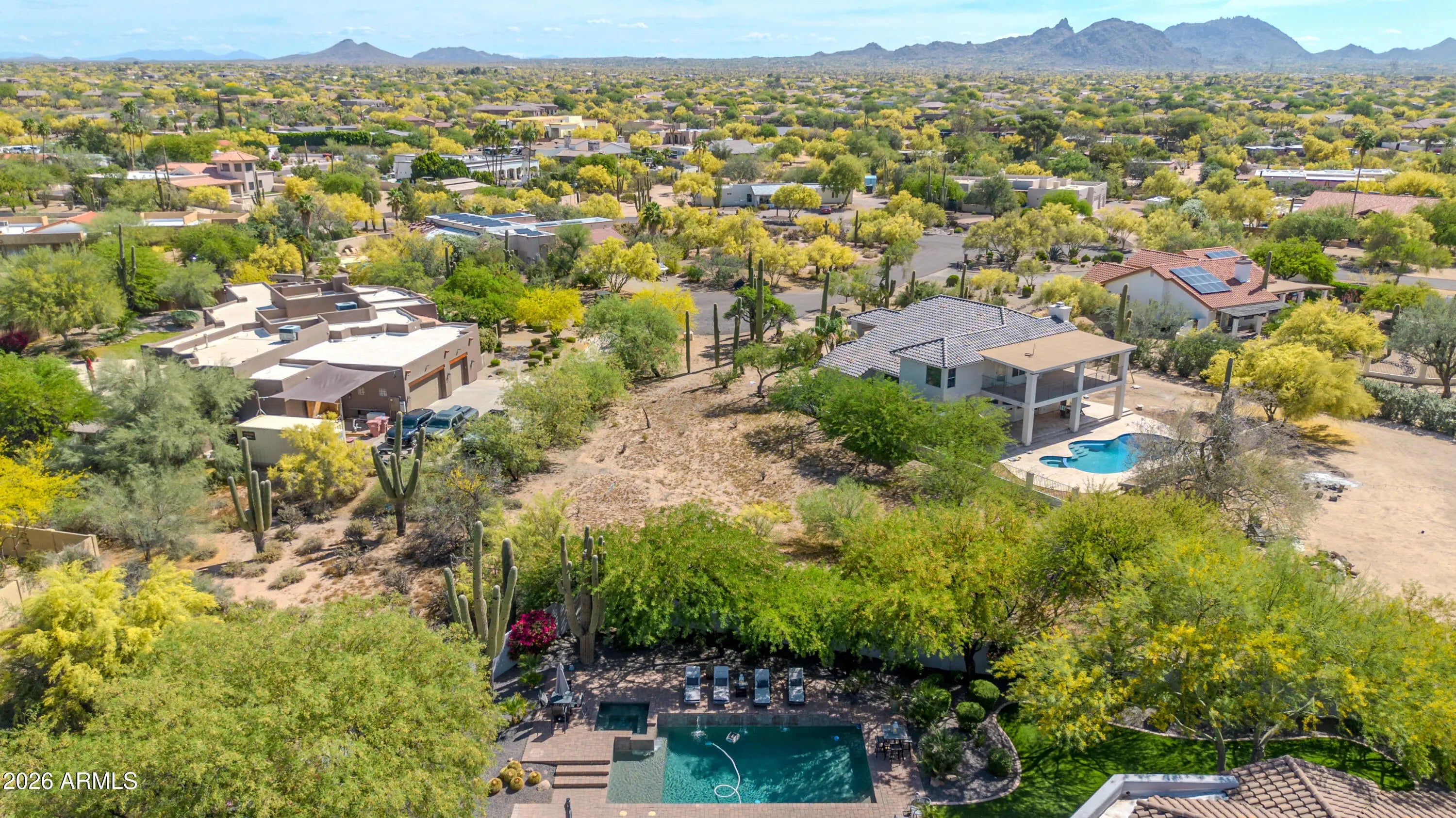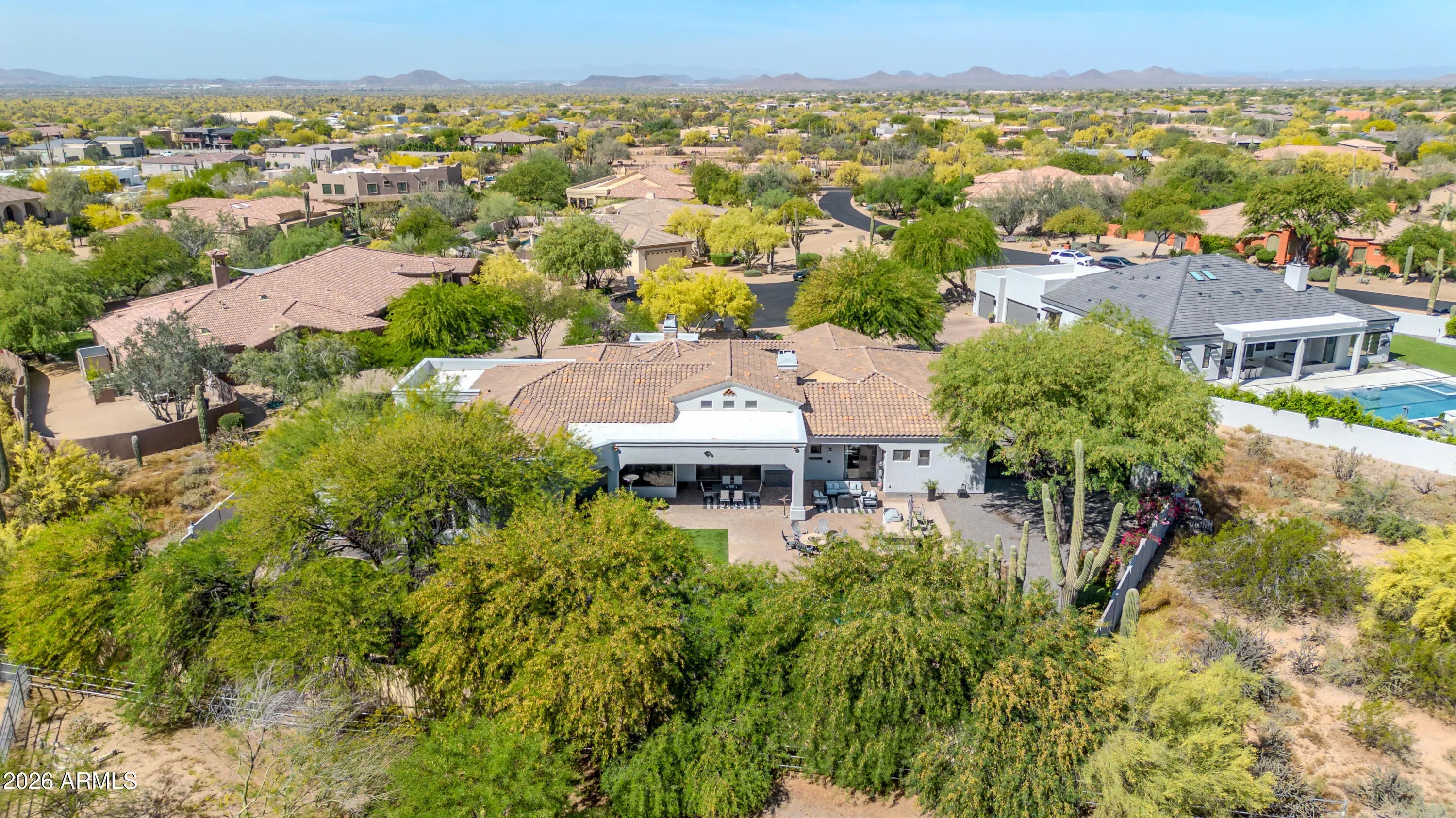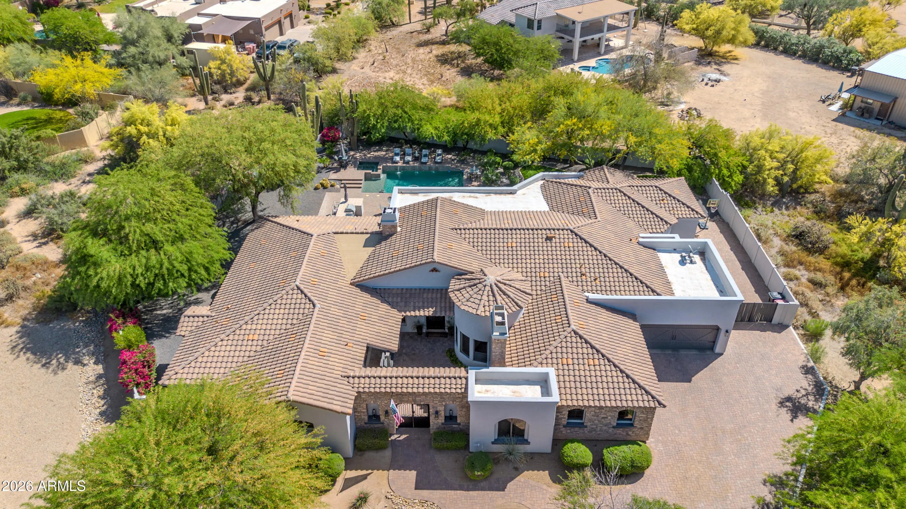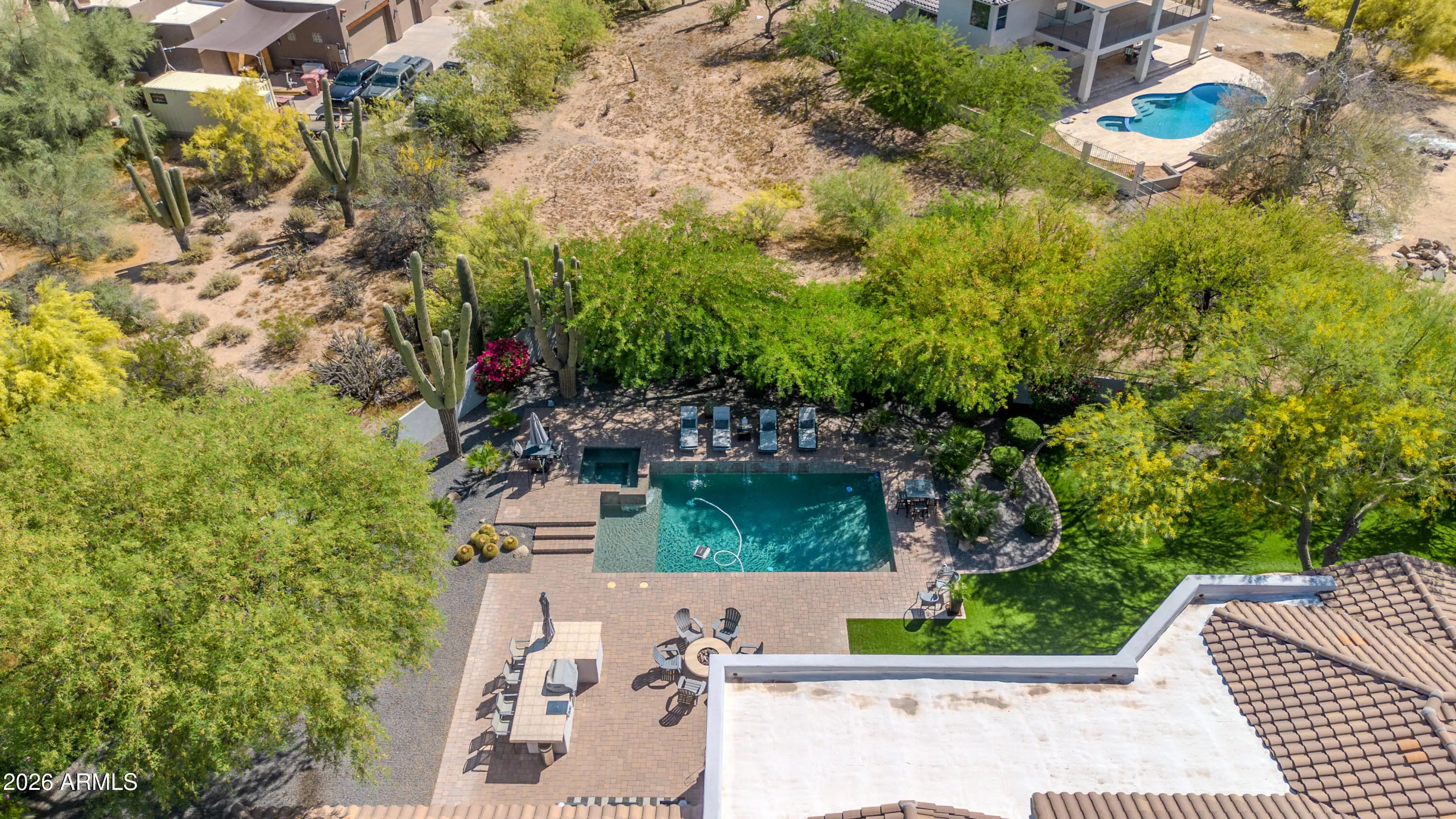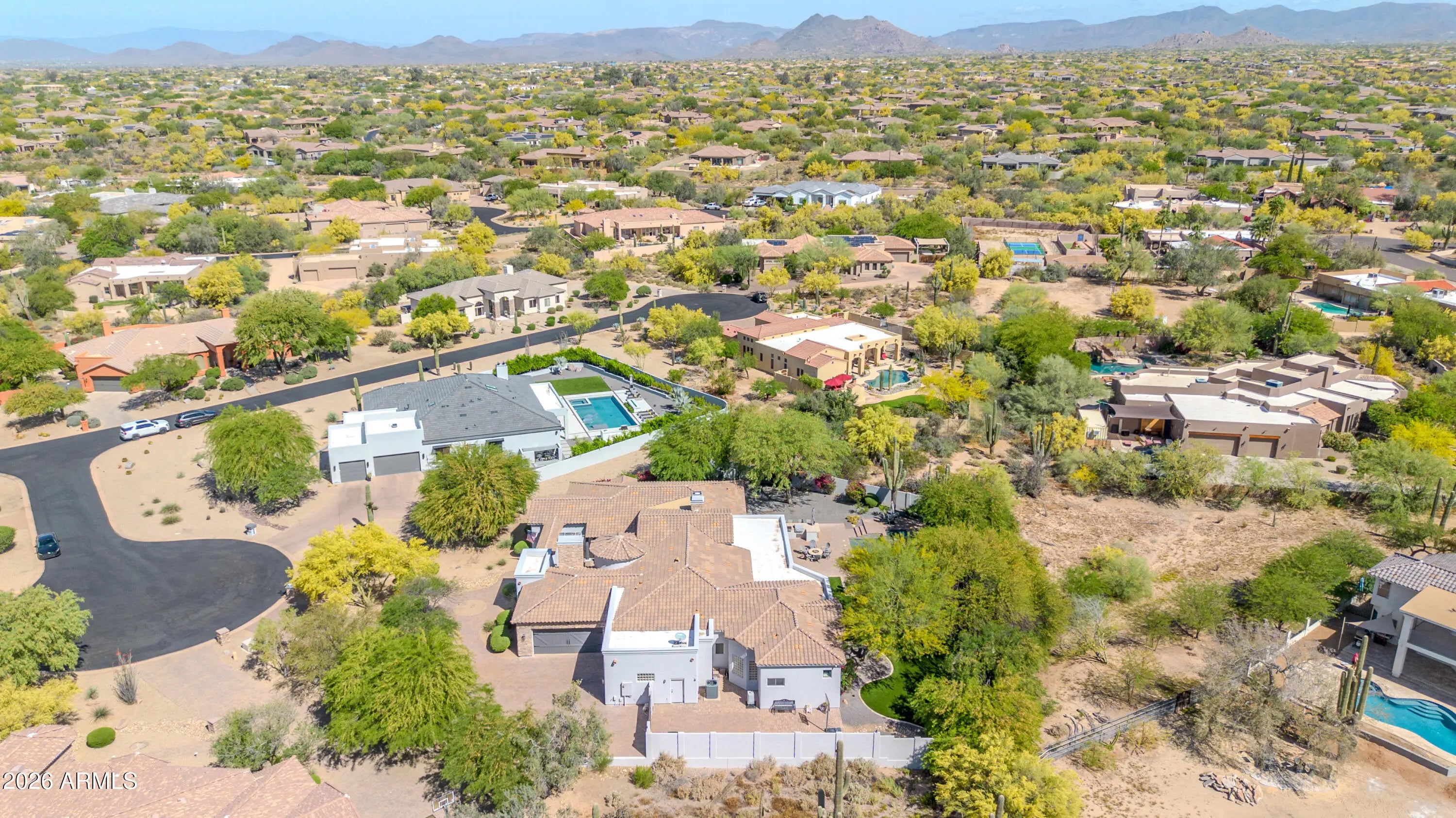 Breathtaking custom luxury home in Scottsdale's highly sought-after Desert Foothills, nestled on a private cul-de-sac lot just under an acre with a 4-car garage featuring built-in storage, epoxy floors, and RV parking. This stunning 4,664 sq ft residence showcases exceptional craftsmanship and timeless design throughout. Enter through a charming front courtyard with fireplace into an expansive great room featuring striking wood beam ceilings and seamless indoor-outdoor living with two 12' multi-slide pocket doors. The gourmet kitchen opens to the family room with a masonry fireplace and boasts a large butcher block island, luxury appliances, and custom finishes throughout. A spacious game room with wet bar offers additional entertaining space and opens directly to the front courtyard, creating a seamless indoor-outdoor flow. A thoughtfully designed split floorplan offers 5 spacious bedrooms with en-suite baths and walk-in closets, 4.5 bathrooms, a private office with custom glass doors, and a tiered theater room. Additional features include a whole-home multimedia system, advanced security system, wired speakers, and no interior steps. The resort-style backyard is an entertainer's dream, complete with a fully automated pool and spa with water features, fire pit, built-in BBQ island, outdoor shower, expansive newly installed artificial grass area, side yard for sports, and a large covered patio. A separate, fully fenced dog run is thoughtfully positioned out of view. Lush landscaping, mature tree-lined grounds, a paver driveway, custom carriage garage doors, and an impressive iron front entry complete this exceptional property. Every imaginable feature, exceptional privacy--this is luxury living at its finest.