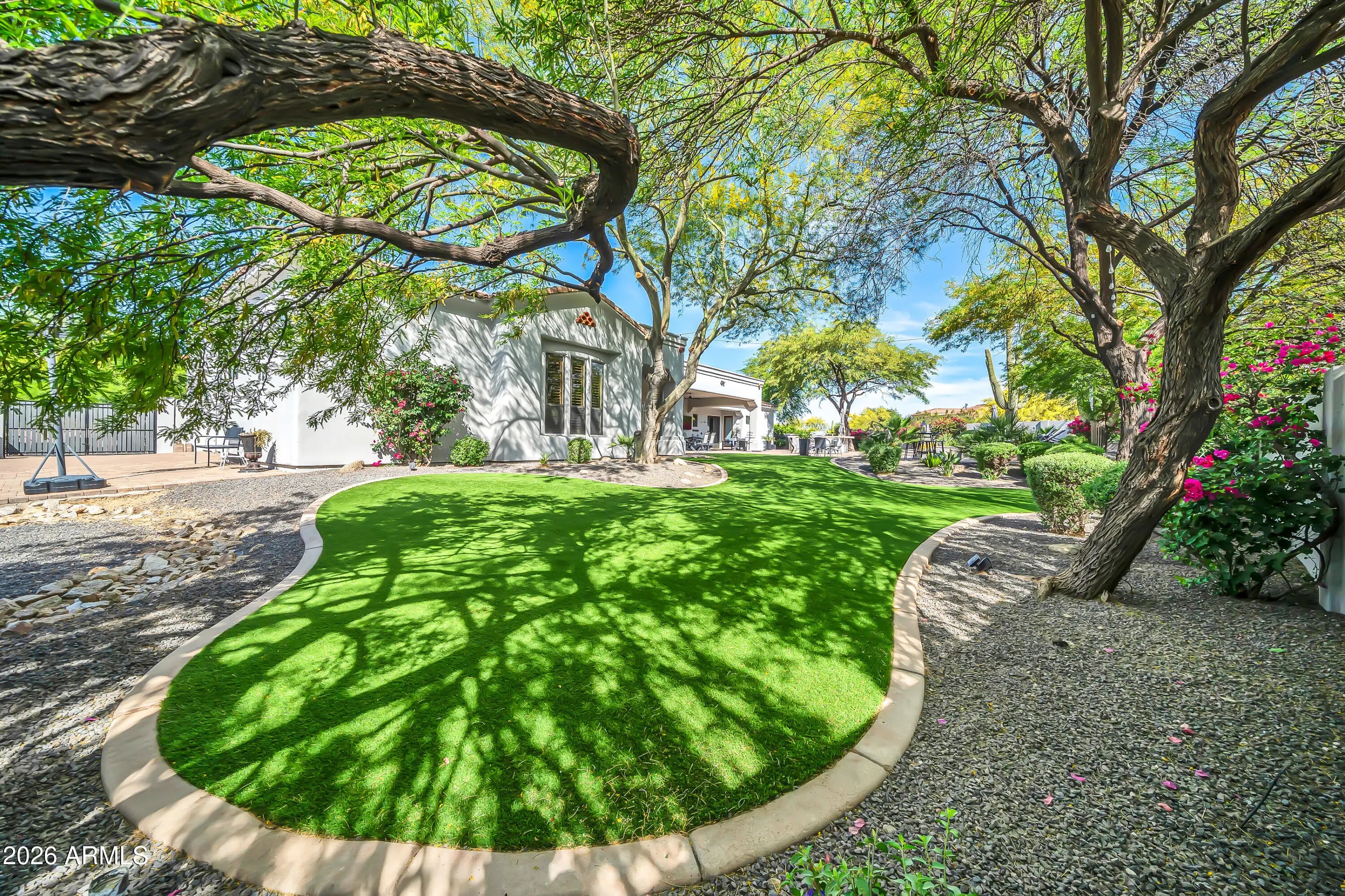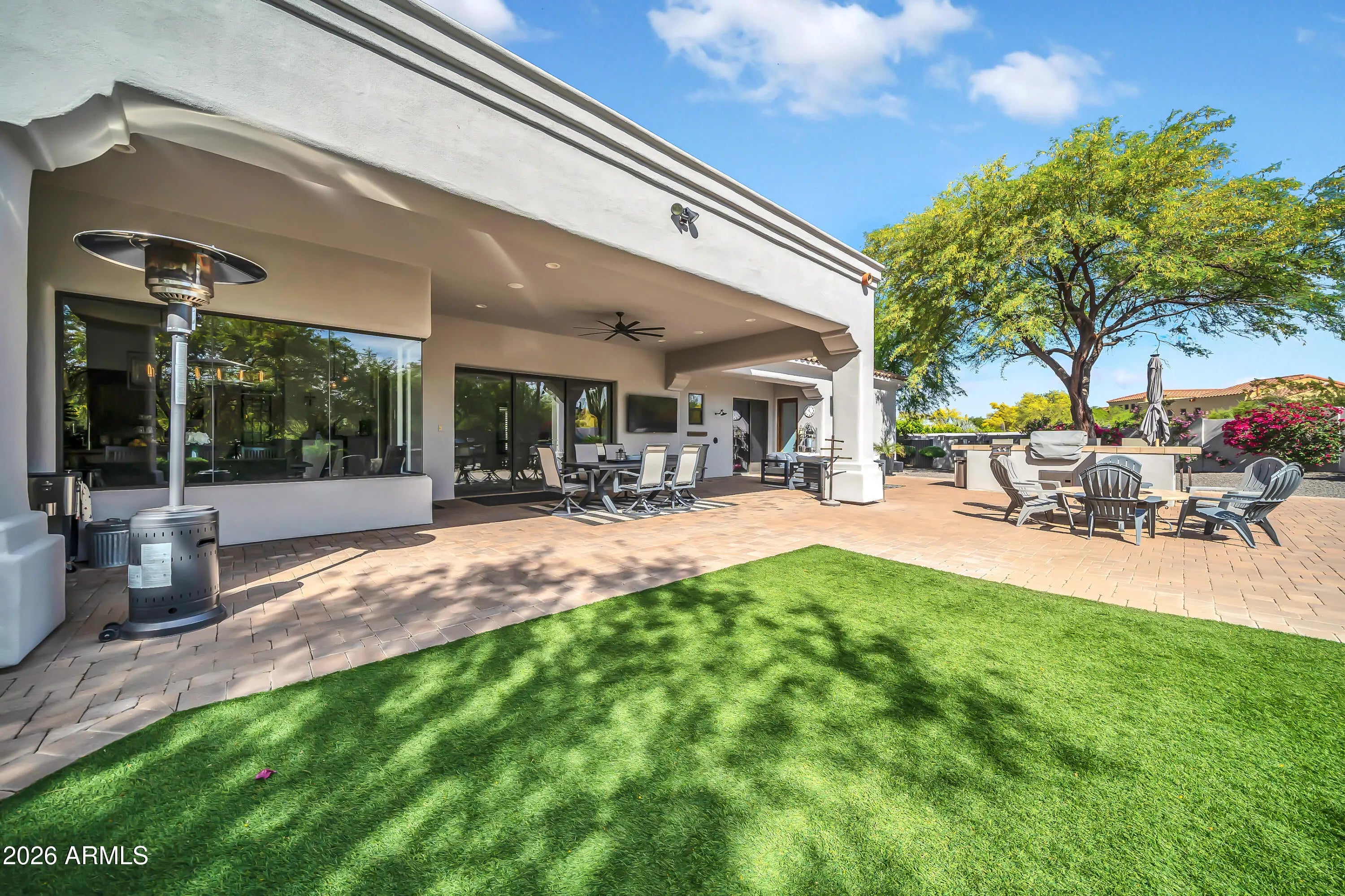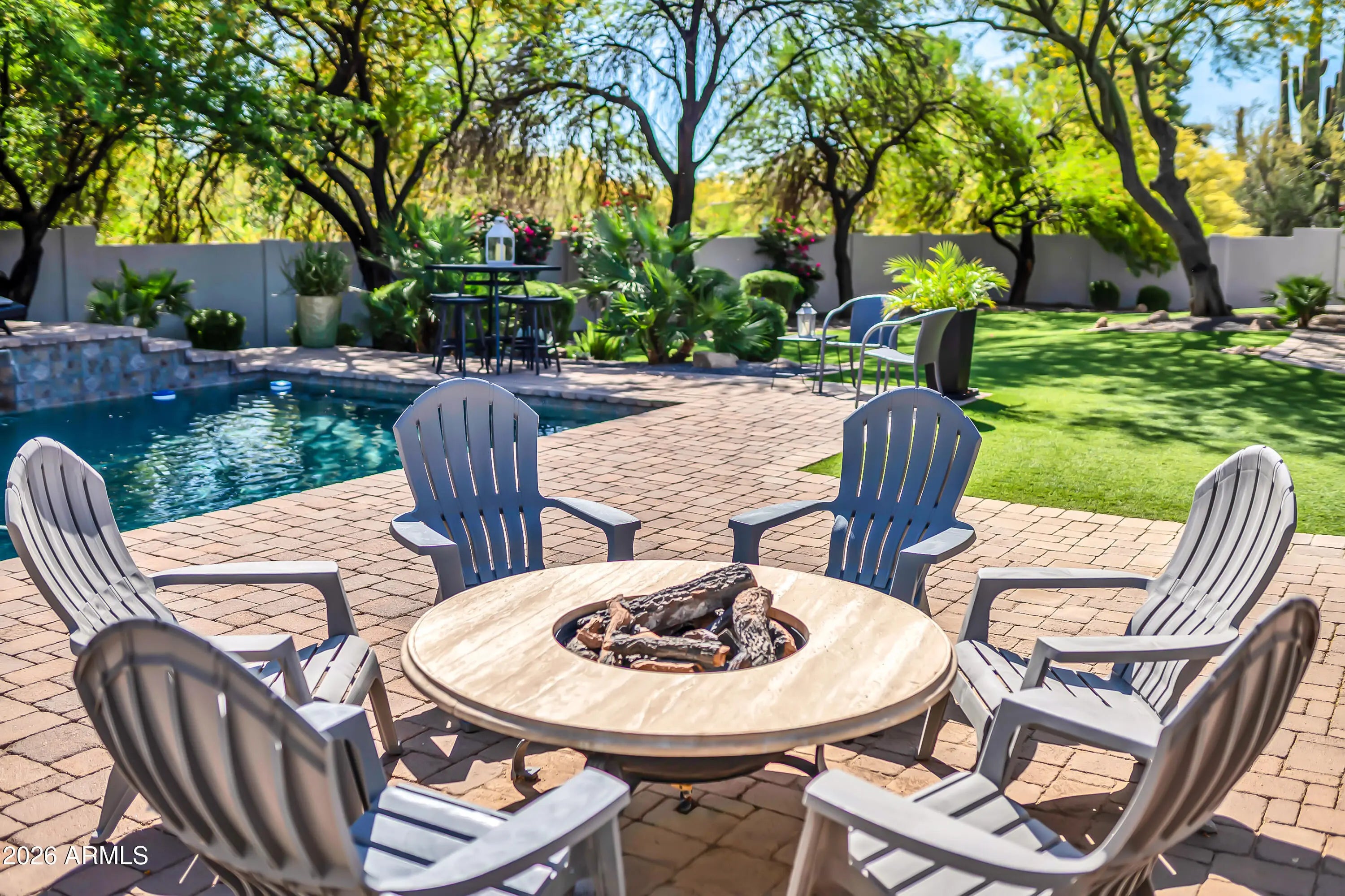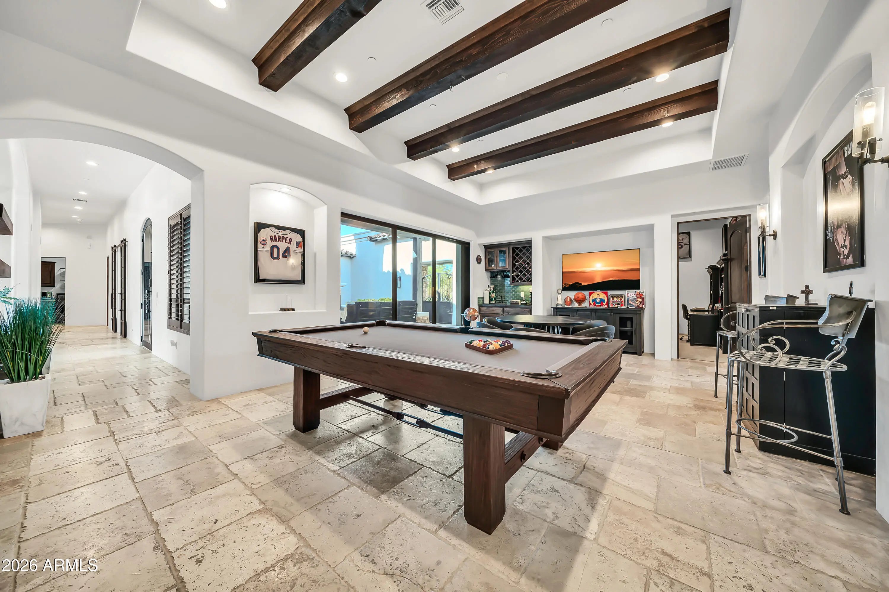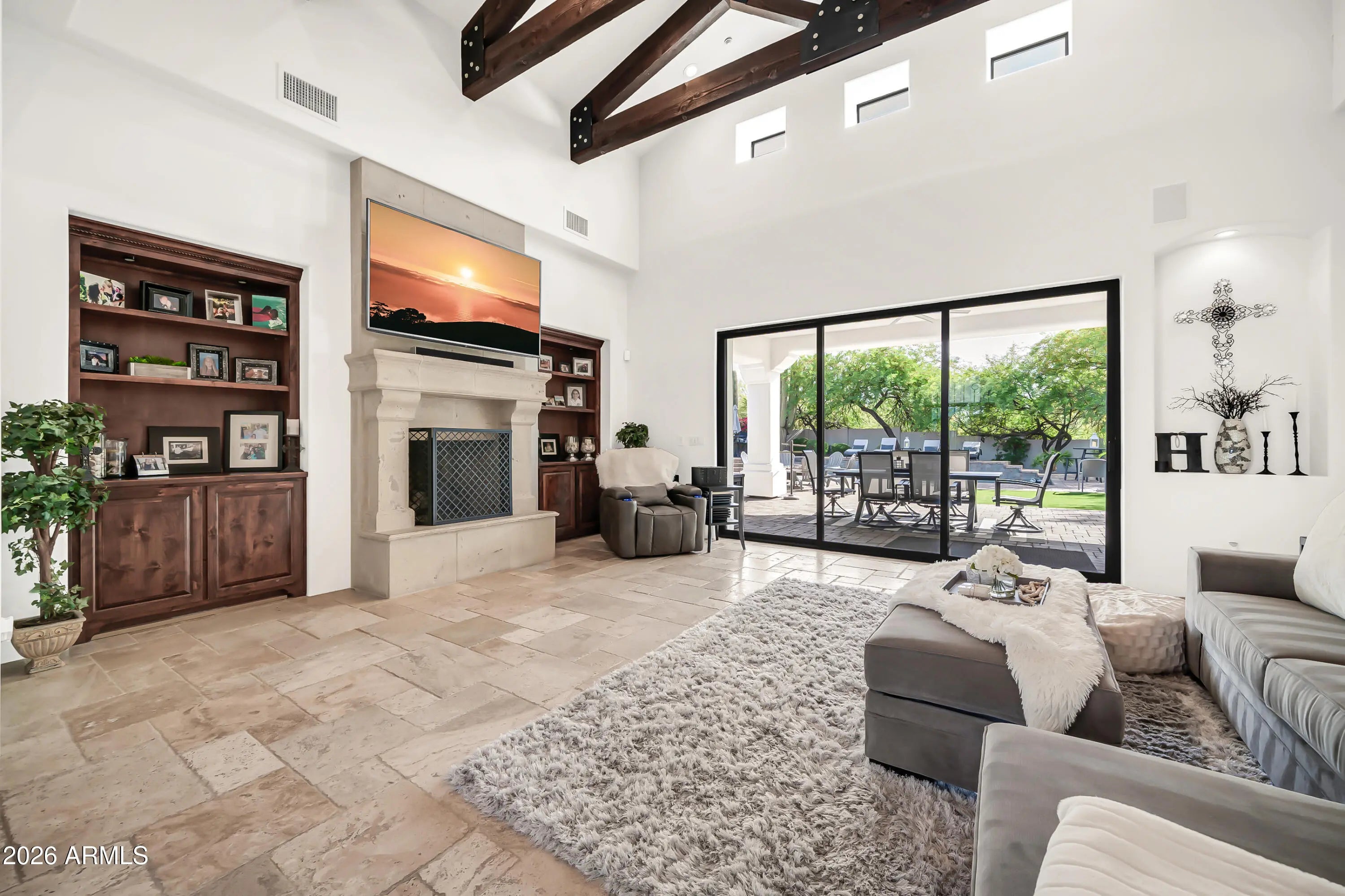 Breathtaking custom luxury home in Scottsdale's highly sought-after Desert Foothills, nestled on a private cul-de-sac lot just under an acre with a 4-car garage featuring built-in storage, epoxy floors, and RV parking. This stunning 4,664 sq ft residence showcases exceptional craftsmanship and timeless design throughout. Enter through a charming front courtyard with fireplace into an expansive great room featuring striking wood beam ceilings and seamless indoor-outdoor living with two 12' multi-slide pocket doors. The gourmet kitchen opens to the family room with a masonry fireplace and boasts a large butcher block island, luxury appliances, and custom finishes throughout. A spacious game room with wet bar offers additional entertaining space and opens directly to the front courtyard, creating a seamless indoor-outdoor flow. A thoughtfully designed split floorplan offers 5 spacious bedrooms with en-suite baths and walk-in closets, 4.5 bathrooms, a private office with custom glass doors, and a tiered theater room. Additional features include a whole-home multimedia system, advanced security system, wired speakers, and no interior steps. The resort-style backyard is an entertainer's dream, complete with a fully automated pool and spa with water features, fire pit, built-in BBQ island, outdoor shower, expansive newly installed artificial grass area, side yard for sports, and a large covered patio. A separate, fully fenced dog run is thoughtfully positioned out of view. Lush landscaping, mature tree-lined grounds, a paver driveway, custom carriage garage doors, and an impressive iron front entry complete this exceptional property. Every imaginable feature, exceptional privacy--this is luxury living at its finest.