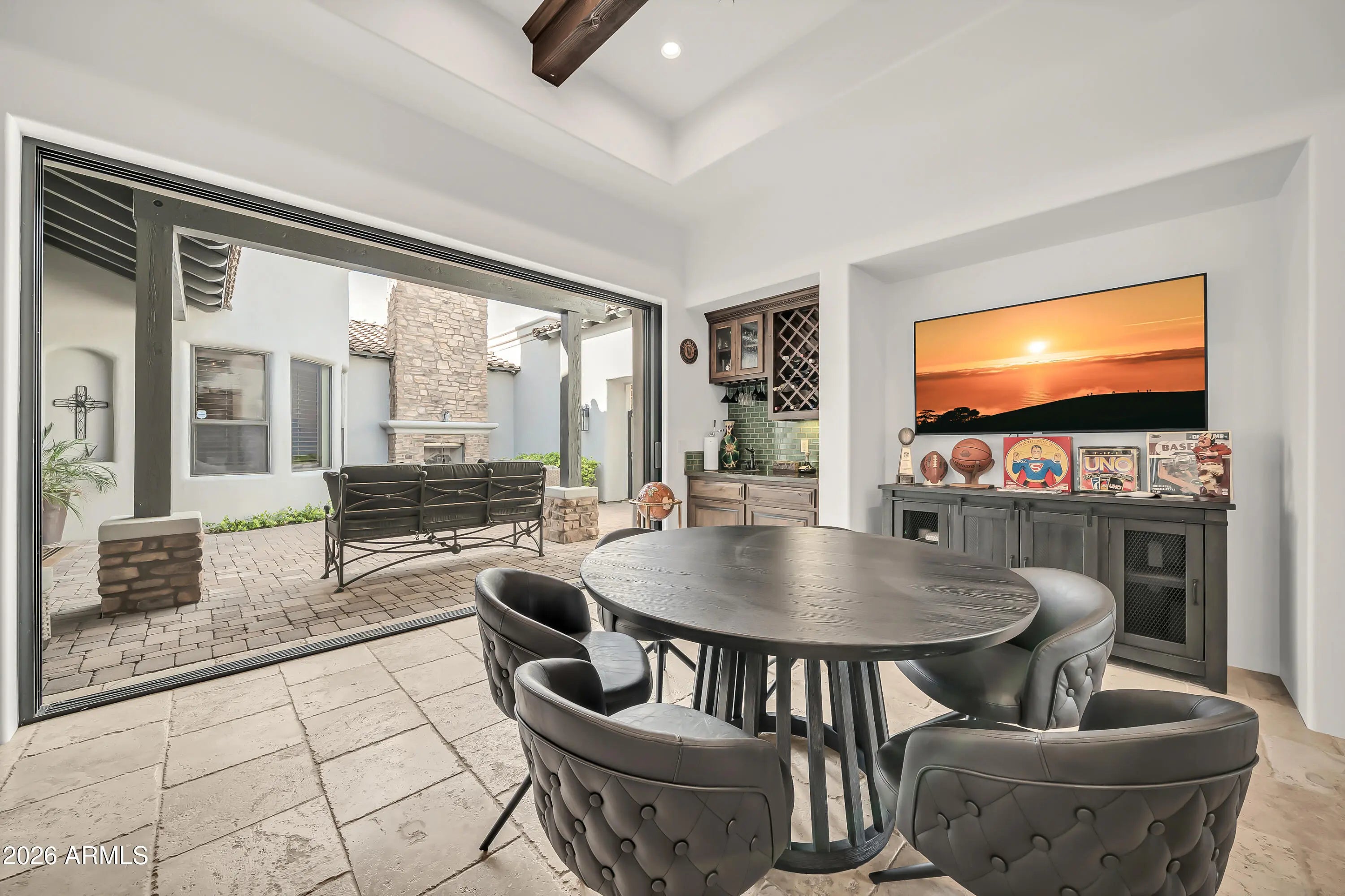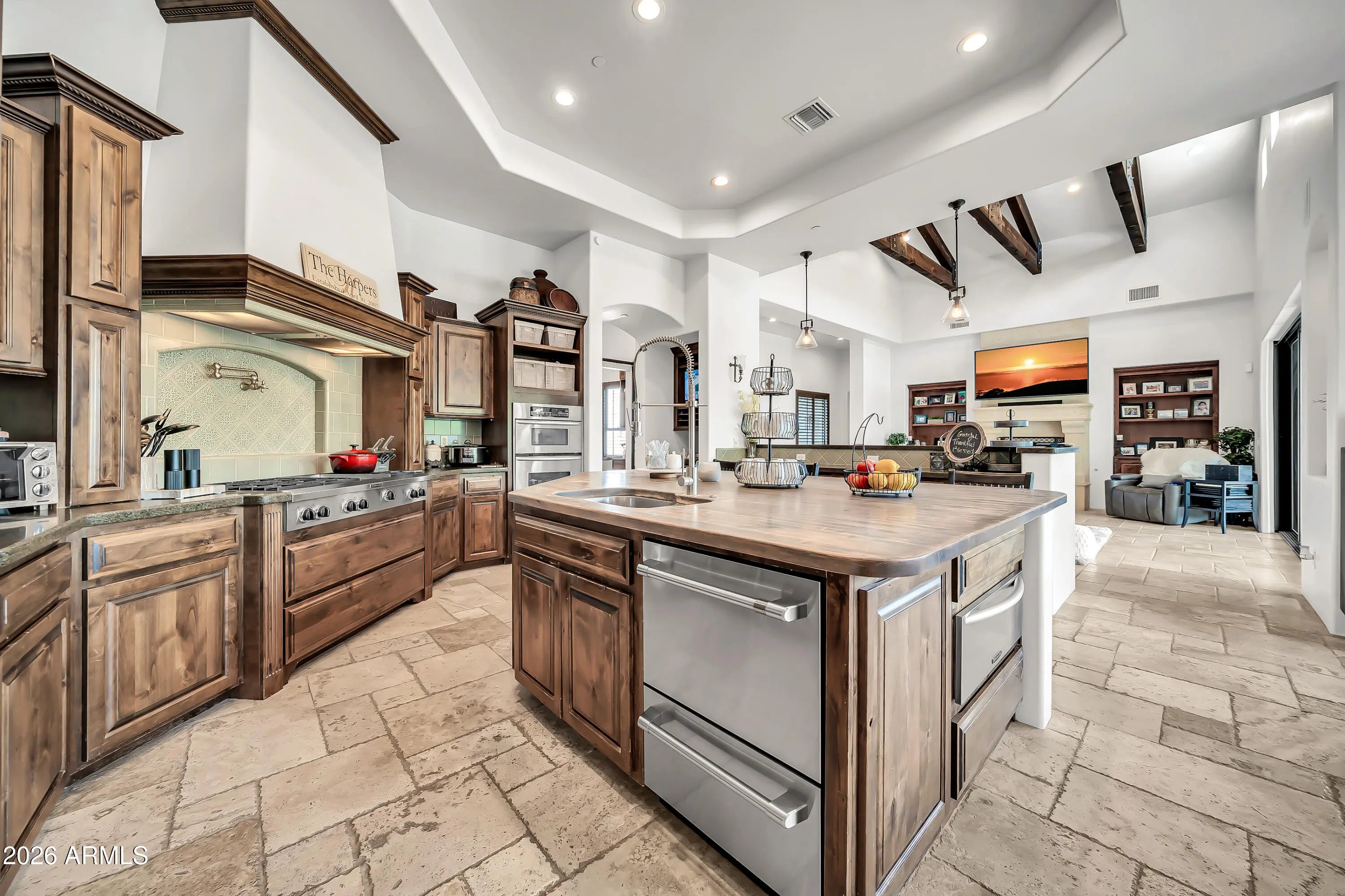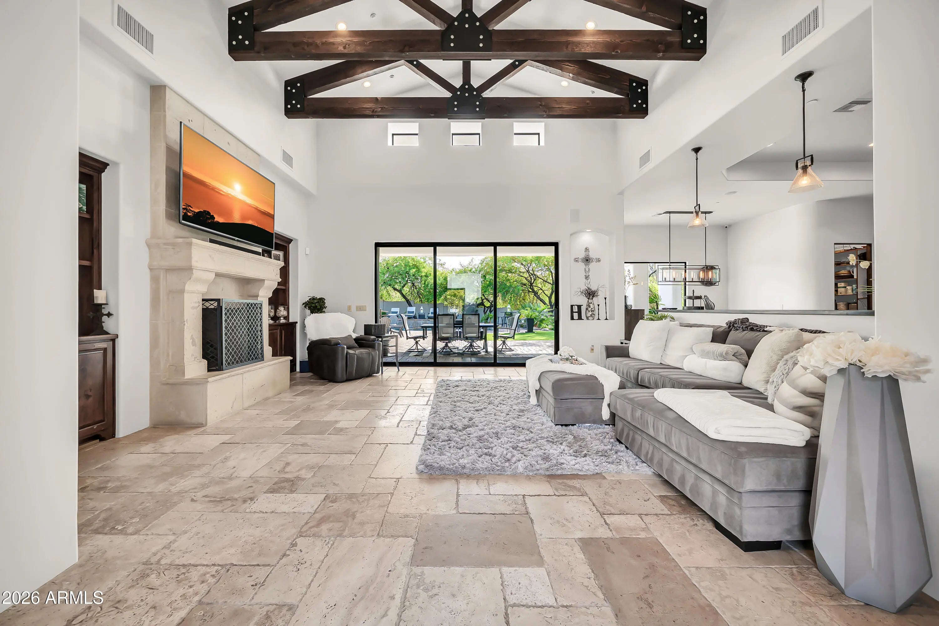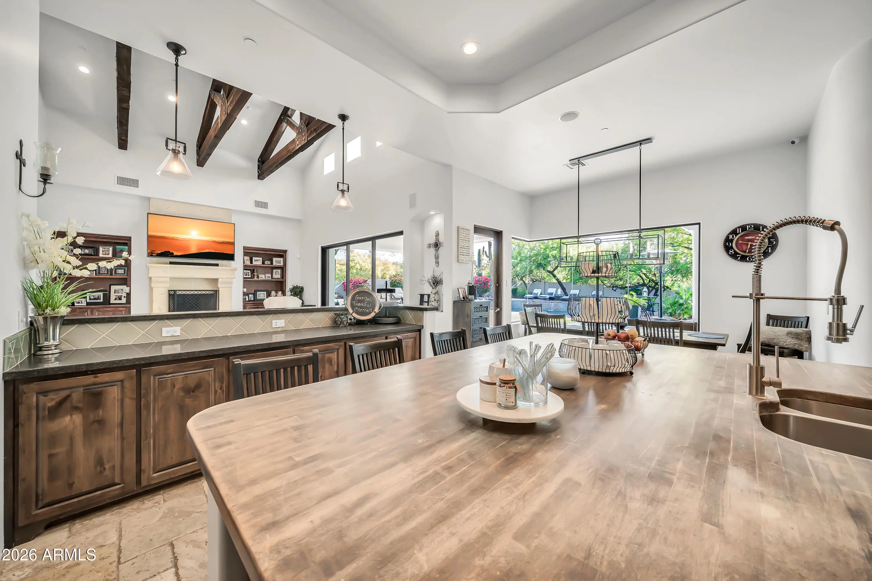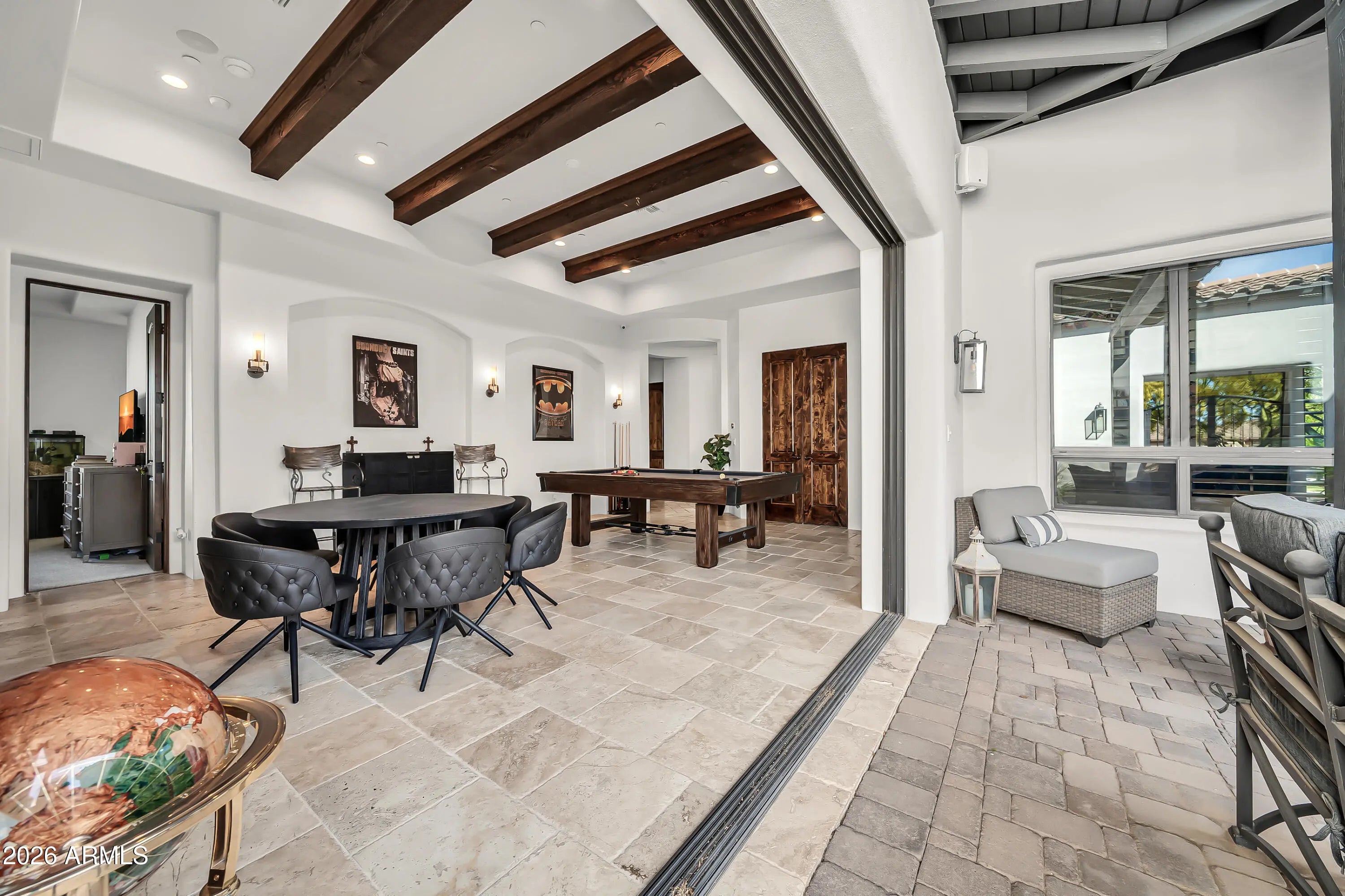 Breathtaking custom luxury home in Scottsdale's highly sought-after Desert Foothills, nestled on a private cul-de-sac lot just under an acre with a 4-car garage featuring built-in storage, epoxy floors, and RV parking. This stunning 4,664 sq ft residence showcases exceptional craftsmanship and timeless design throughout. Enter through a charming front courtyard with fireplace into an expansive great room featuring striking wood beam ceilings and seamless indoor-outdoor living with two 12' multi-slide pocket doors. The gourmet kitchen opens to the family room with a masonry fireplace and boasts a large butcher block island, luxury appliances, and custom finishes throughout. A spacious game room with wet bar offers additional entertaining space and opens directly to the front courtyard, creating a seamless indoor-outdoor flow. A thoughtfully designed split floorplan offers 5 spacious bedrooms with en-suite baths and walk-in closets, 4.5 bathrooms, a private office with custom glass doors, and a tiered theater room. Additional features include a whole-home multimedia system, advanced security system, wired speakers, and no interior steps. The resort-style backyard is an entertainer's dream, complete with a fully automated pool and spa with water features, fire pit, built-in BBQ island, outdoor shower, expansive newly installed artificial grass area, side yard for sports, and a large covered patio. A separate, fully fenced dog run is thoughtfully positioned out of view. Lush landscaping, mature tree-lined grounds, a paver driveway, custom carriage garage doors, and an impressive iron front entry complete this exceptional property. Every imaginable feature, exceptional privacy--this is luxury living at its finest.