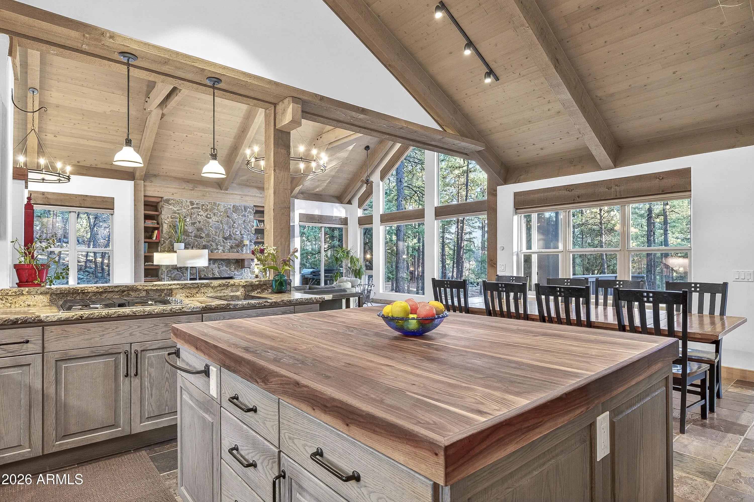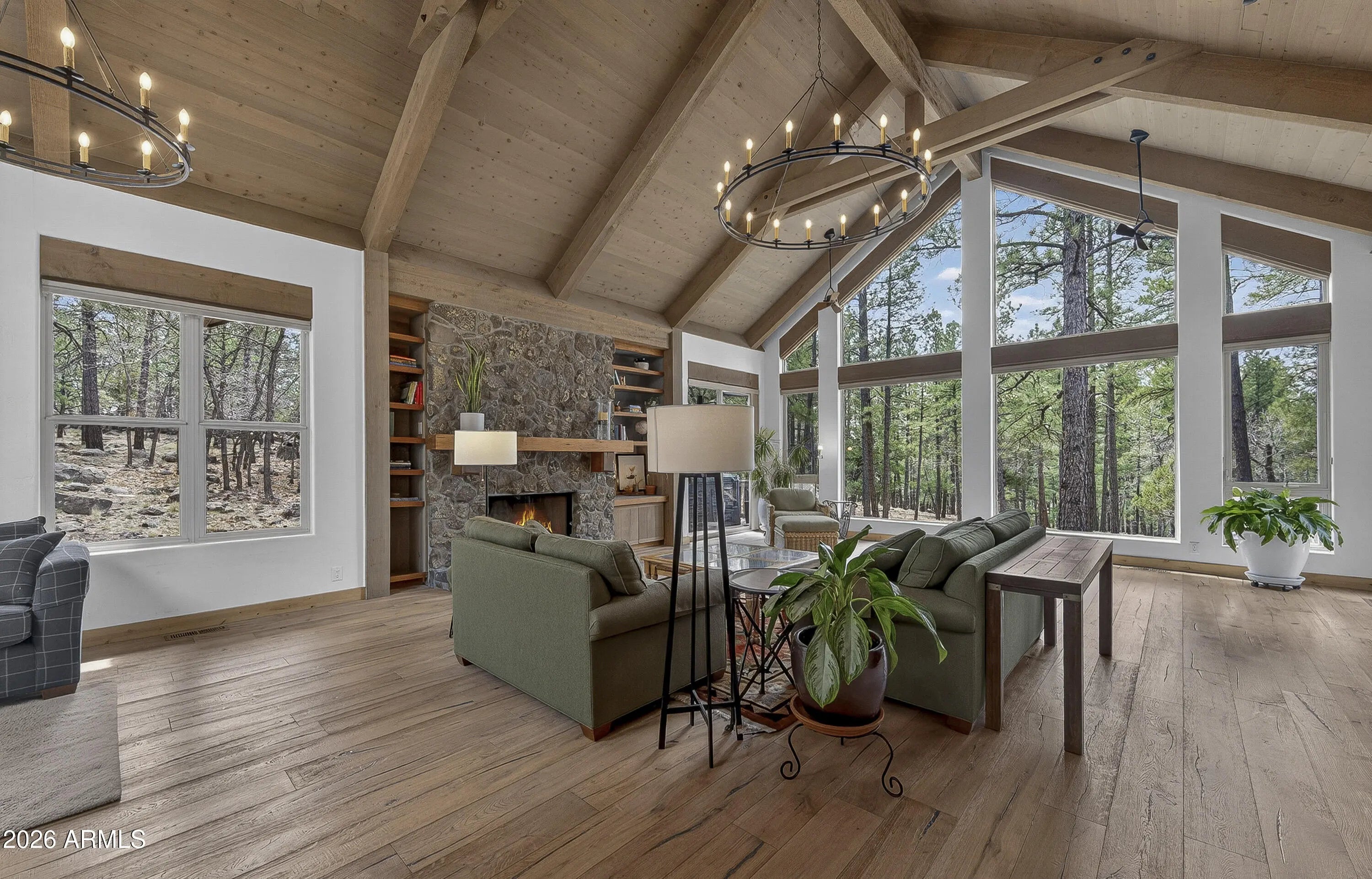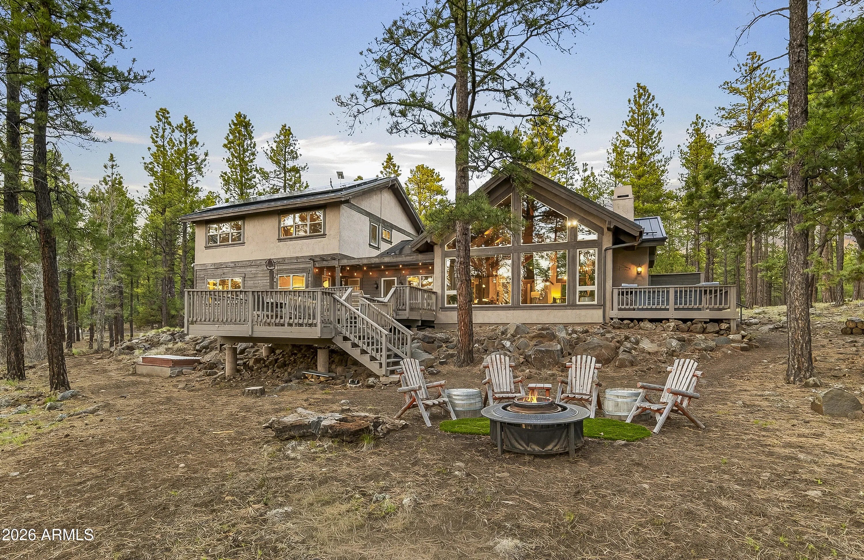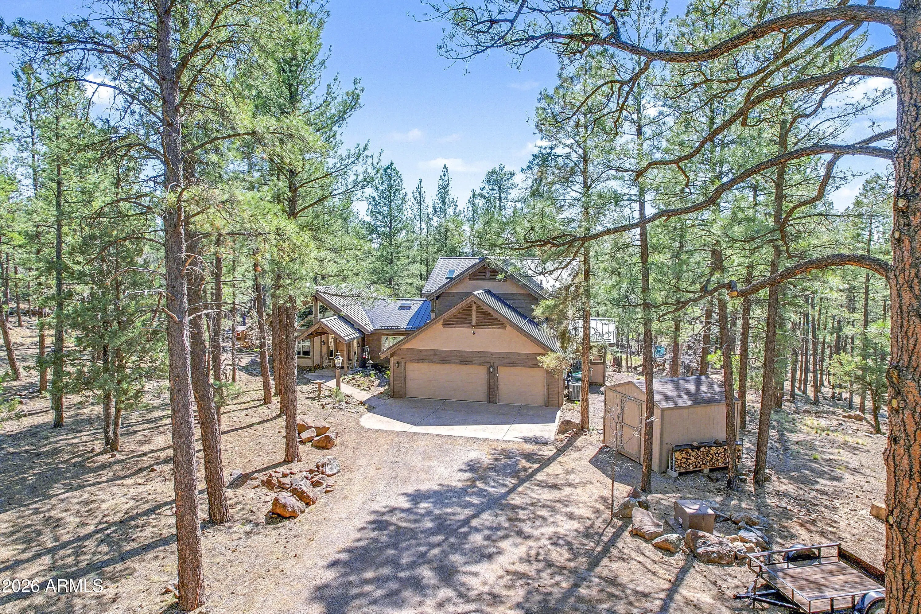 block workstation, double ovens, and a gas cooktop. The main-level primary suite sits near an office or 5th bedroom, with three oversized ensuite bedrooms upstairs, including one with custom triple bunk beds. This home has undergone extensive high-end interior renovations, including Knotty Alder doors and trim, designer lighting, premium wool Berber carpeting, a mix of slate and large plank wood floors, Hunter Douglas window coverings, upgraded stone and granite counters, and a spa-inspired primary bath with a custom slate soaking tub. Recent major investments elevate long-term reliability: owned solar, a premium metal roof, whole-home air sealing by Cozy Home, a high-efficiency heat pump system, and an upgraded 10,000-gallon galvanized cistern. The property has been professionally fire-wise treated, with over 150 additional trees and hazardous limbs removed. A mudroom and laundry area connect to the oversized 3-car garage, and the home includes two heaters, a hot tub, two A/C units, a large shed, a central vacuum, and more. This turnkey mountain retreat blends luxury, durability, privacy, and an unmatched outdoor lifestyle, all on a paved county road in one of Flagstaff's most coveted settings.