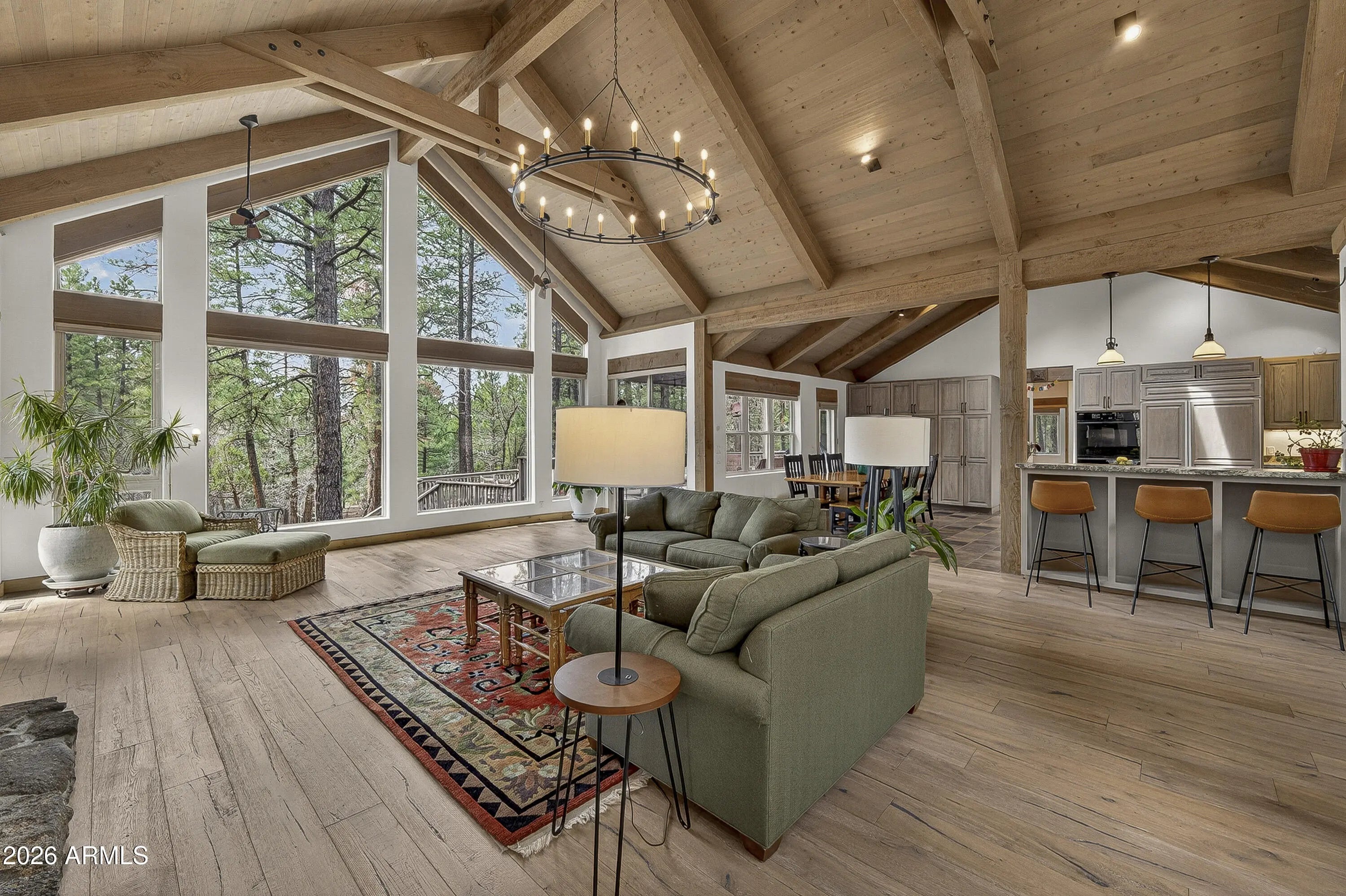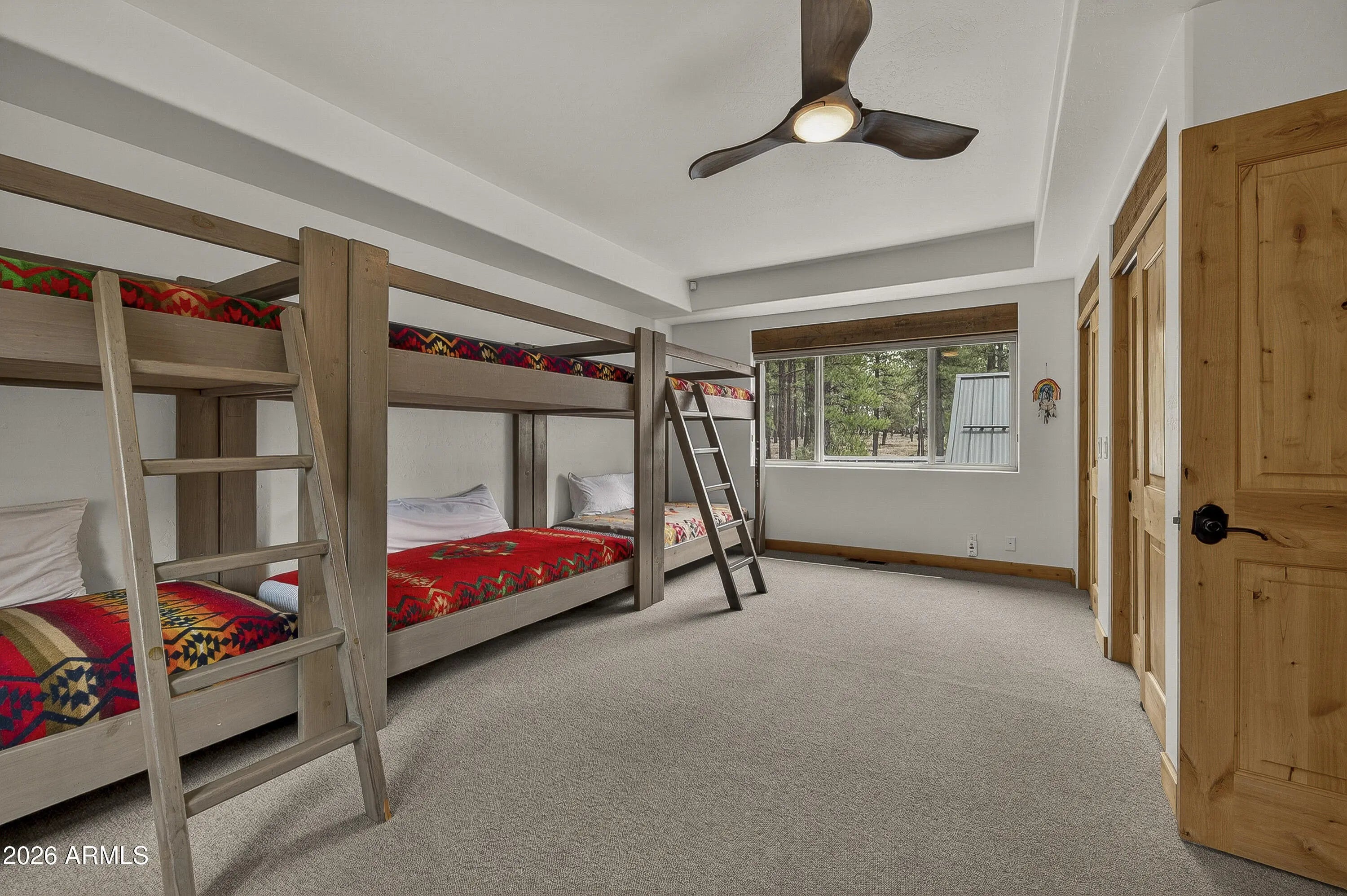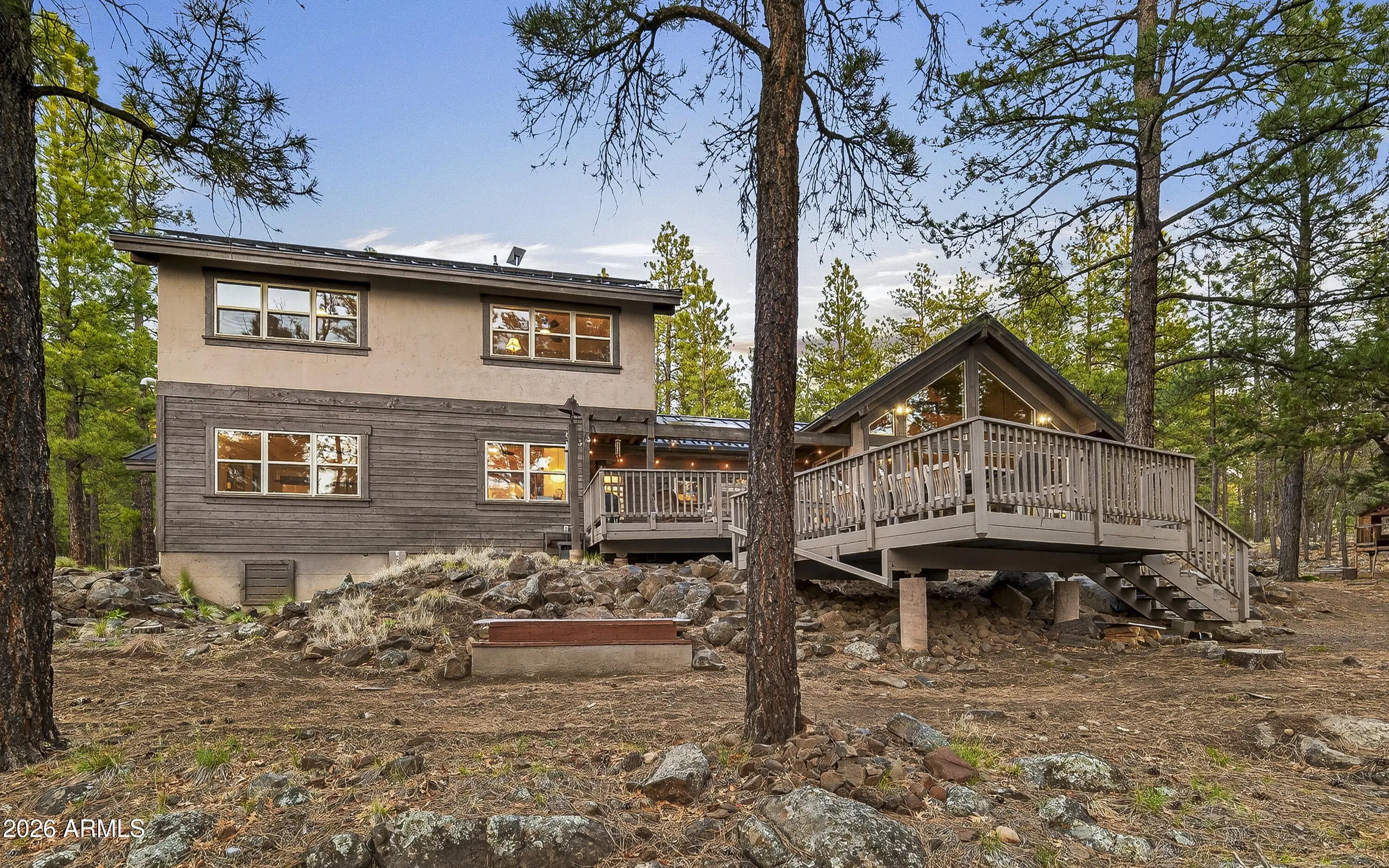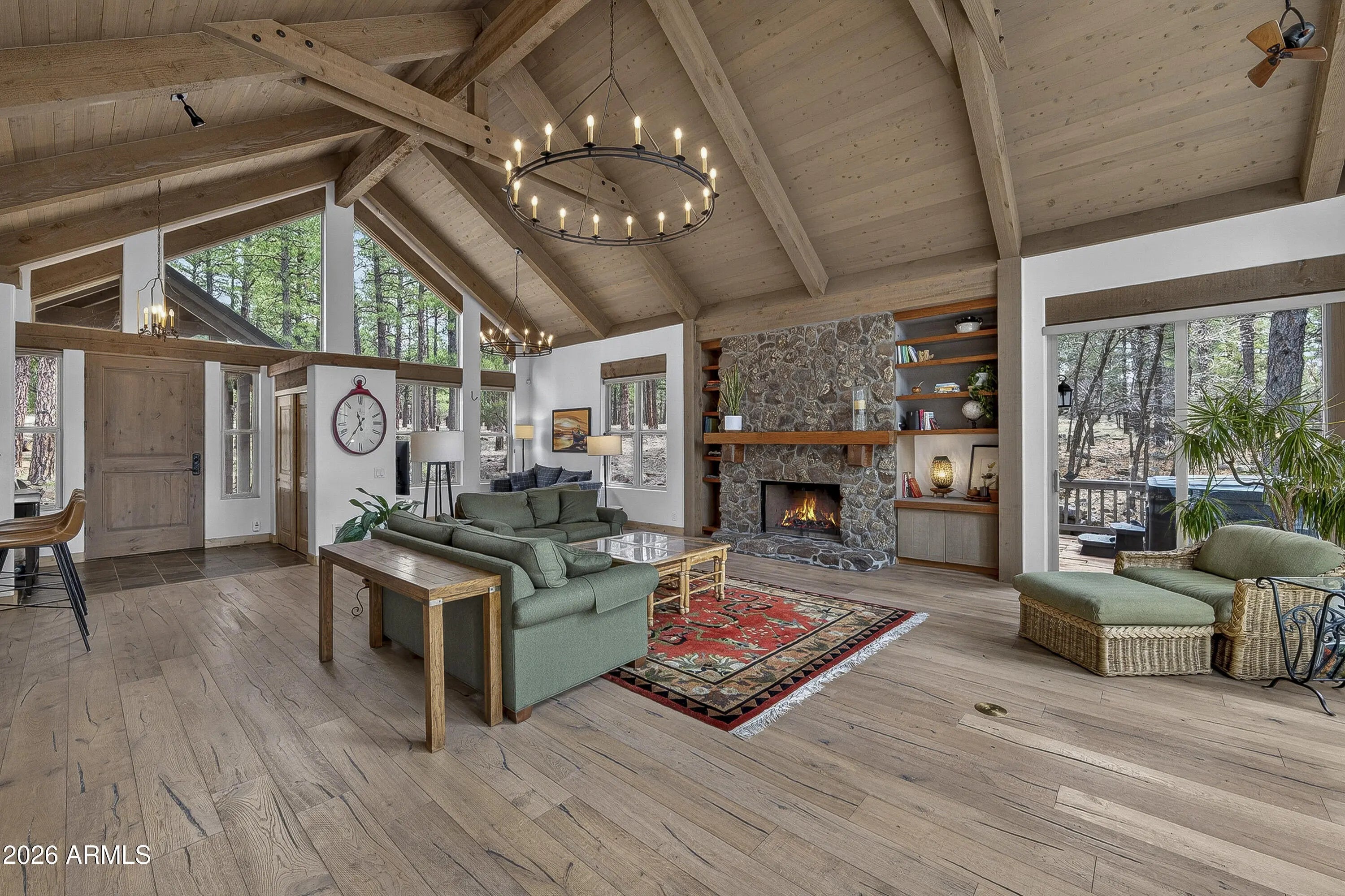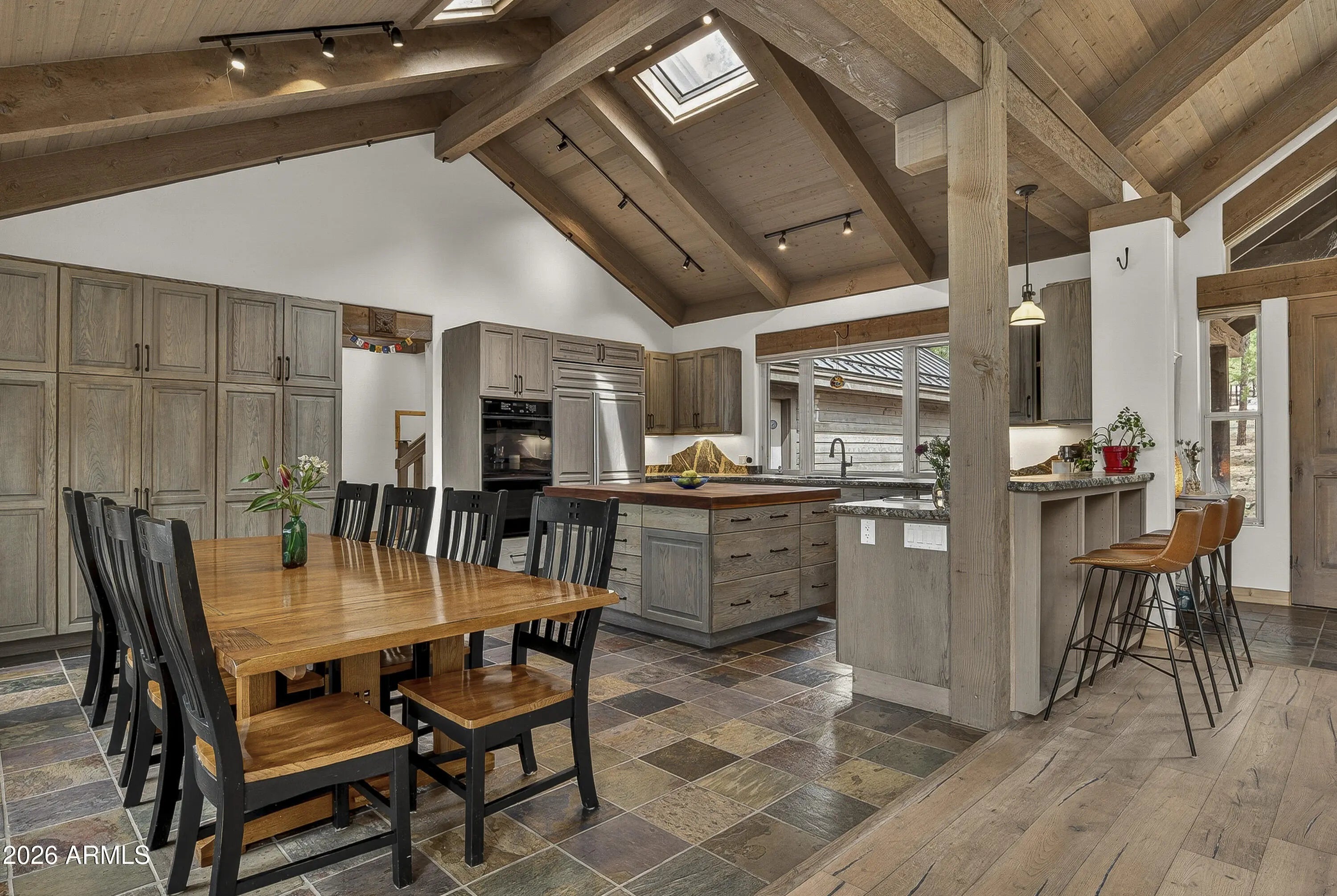 block workstation, double ovens, and a gas cooktop. The main-level primary suite sits near an office or 5th bedroom, with three oversized ensuite bedrooms upstairs, including one with custom triple bunk beds. This home has undergone extensive high-end interior renovations, including Knotty Alder doors and trim, designer lighting, premium wool Berber carpeting, a mix of slate and large plank wood floors, Hunter Douglas window coverings, upgraded stone and granite counters, and a spa-inspired primary bath with a custom slate soaking tub. Recent major investments elevate long-term reliability: owned solar, a premium metal roof, whole-home air sealing by Cozy Home, a high-efficiency heat pump system, and an upgraded 10,000-gallon galvanized cistern. The property has been professionally fire-wise treated, with over 150 additional trees and hazardous limbs removed. A mudroom and laundry area connect to the oversized 3-car garage, and the home includes two heaters, a hot tub, two A/C units, a large shed, a central vacuum, and more. This turnkey mountain retreat blends luxury, durability, privacy, and an unmatched outdoor lifestyle, all on a paved county road in one of Flagstaff's most coveted settings.