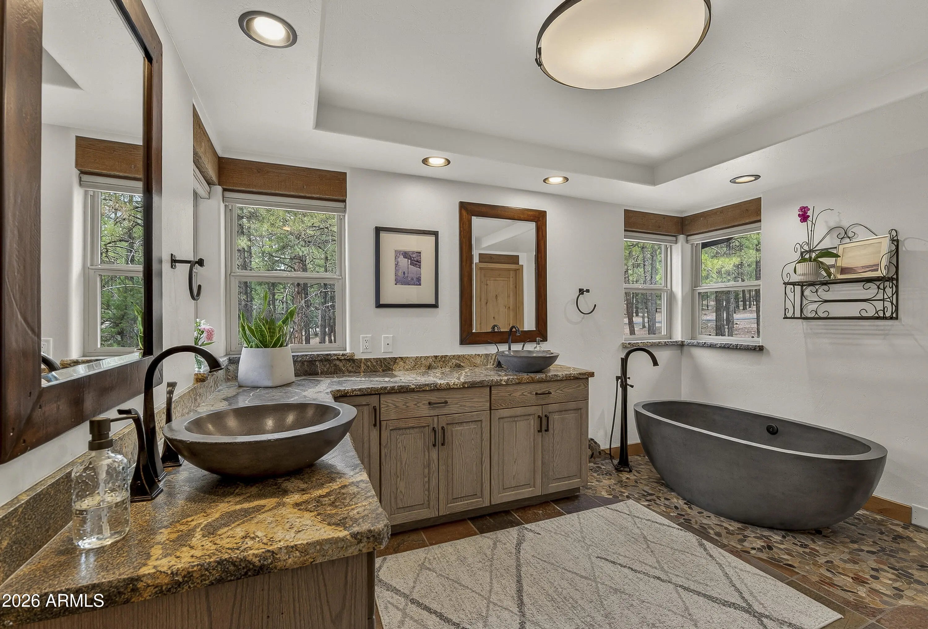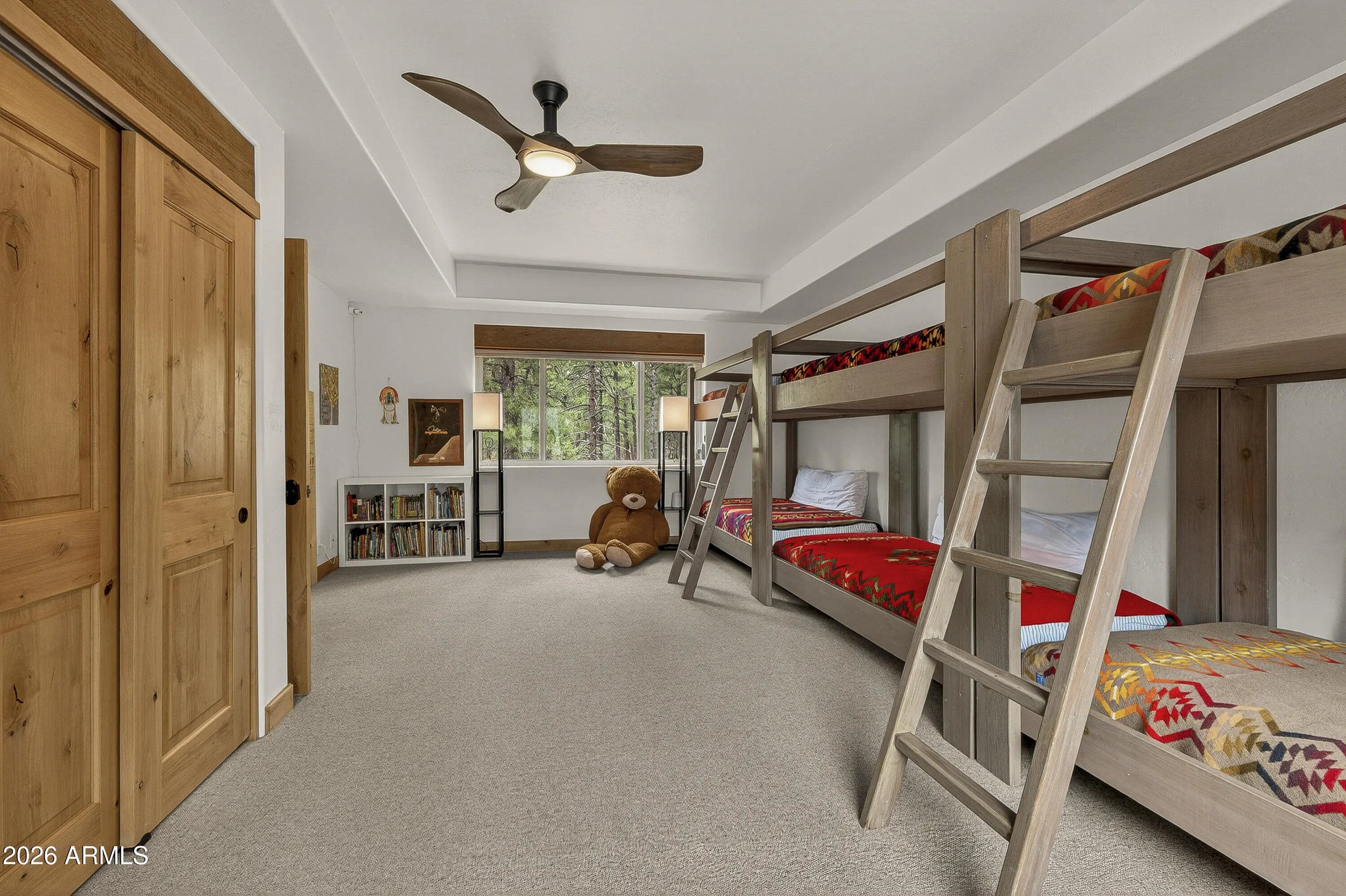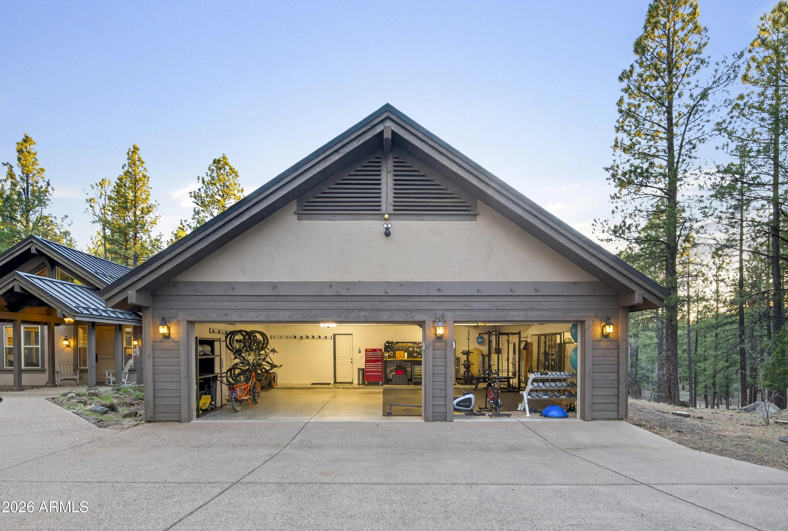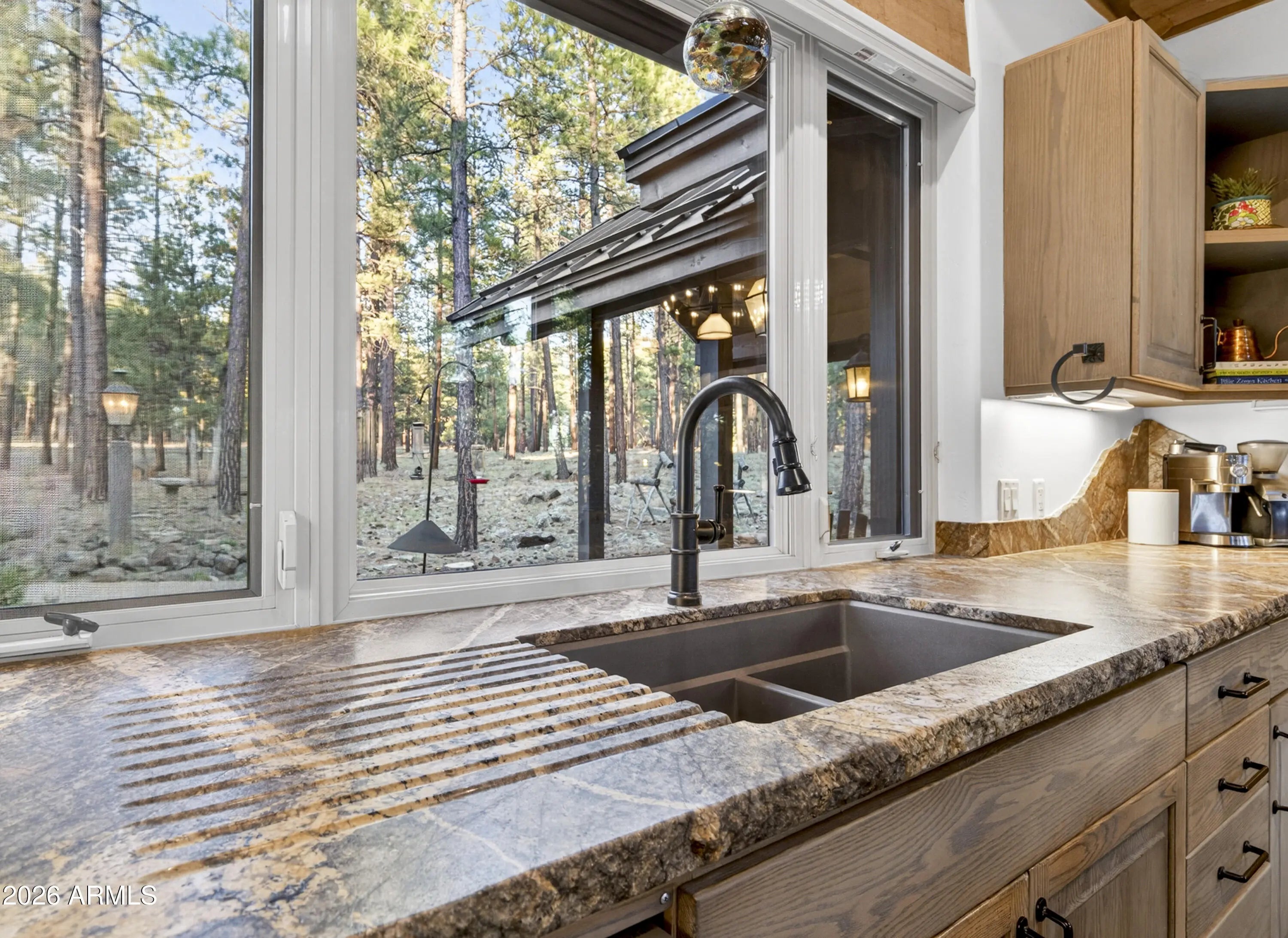 block workstation, double ovens, and a gas cooktop. The main-level primary suite sits near an office or 5th bedroom, with three oversized ensuite bedrooms upstairs, including one with custom triple bunk beds. This home has undergone extensive high-end interior renovations, including Knotty Alder doors and trim, designer lighting, premium wool Berber carpeting, a mix of slate and large plank wood floors, Hunter Douglas window coverings, upgraded stone and granite counters, and a spa-inspired primary bath with a custom slate soaking tub. Recent major investments elevate long-term reliability: owned solar, a premium metal roof, whole-home air sealing by Cozy Home, a high-efficiency heat pump system, and an upgraded 10,000-gallon galvanized cistern. The property has been professionally fire-wise treated, with over 150 additional trees and hazardous limbs removed. A mudroom and laundry area connect to the oversized 3-car garage, and the home includes two heaters, a hot tub, two A/C units, a large shed, a central vacuum, and more. This turnkey mountain retreat blends luxury, durability, privacy, and an unmatched outdoor lifestyle, all on a paved county road in one of Flagstaff's most coveted settings.