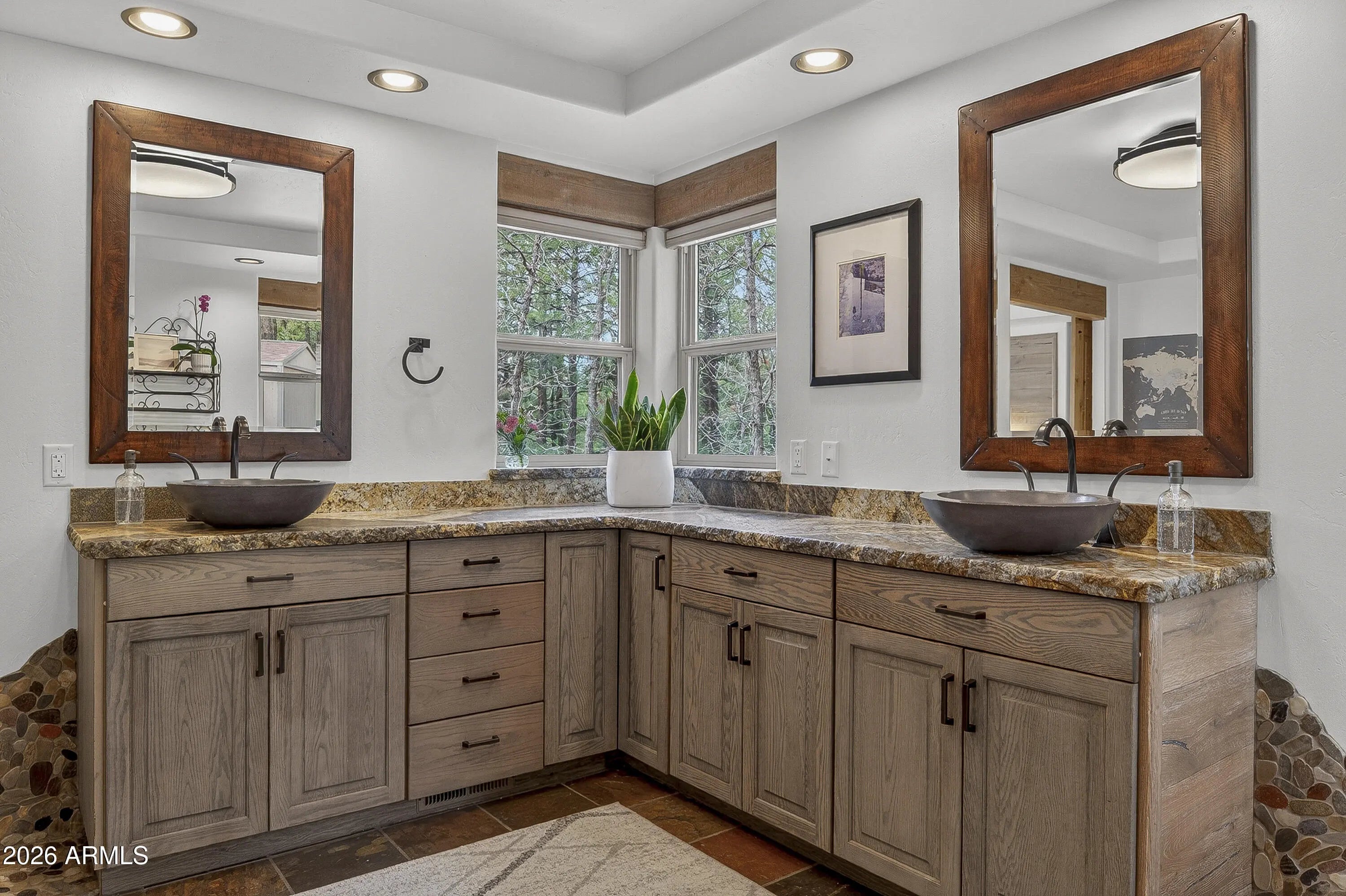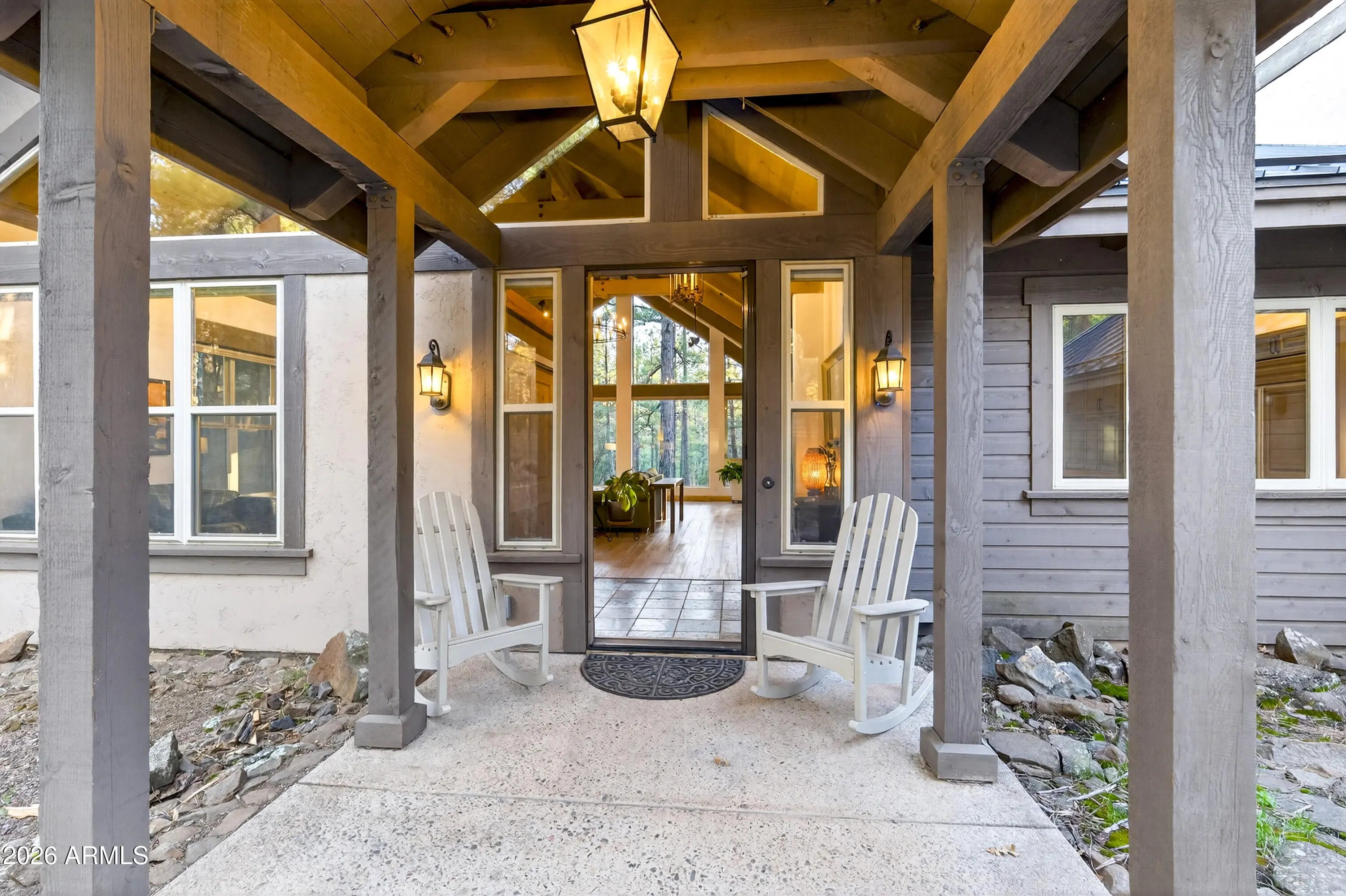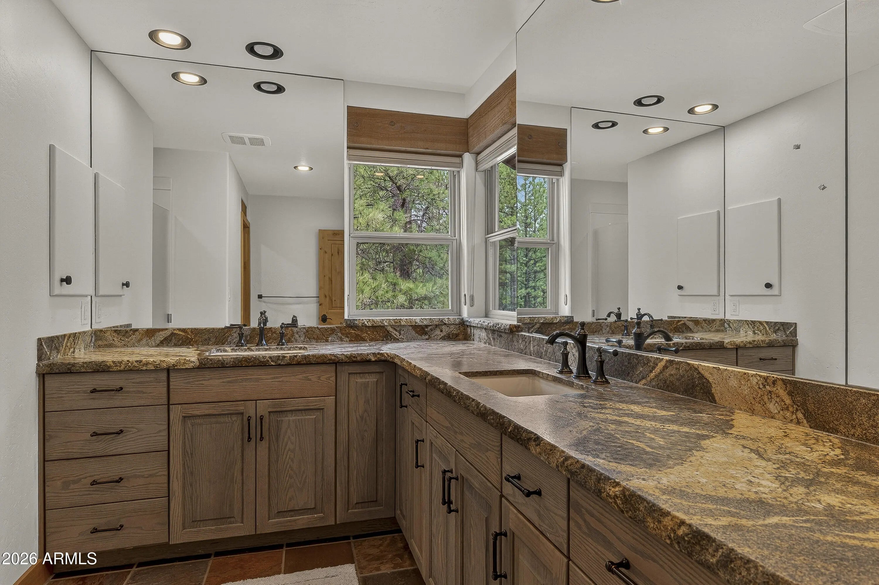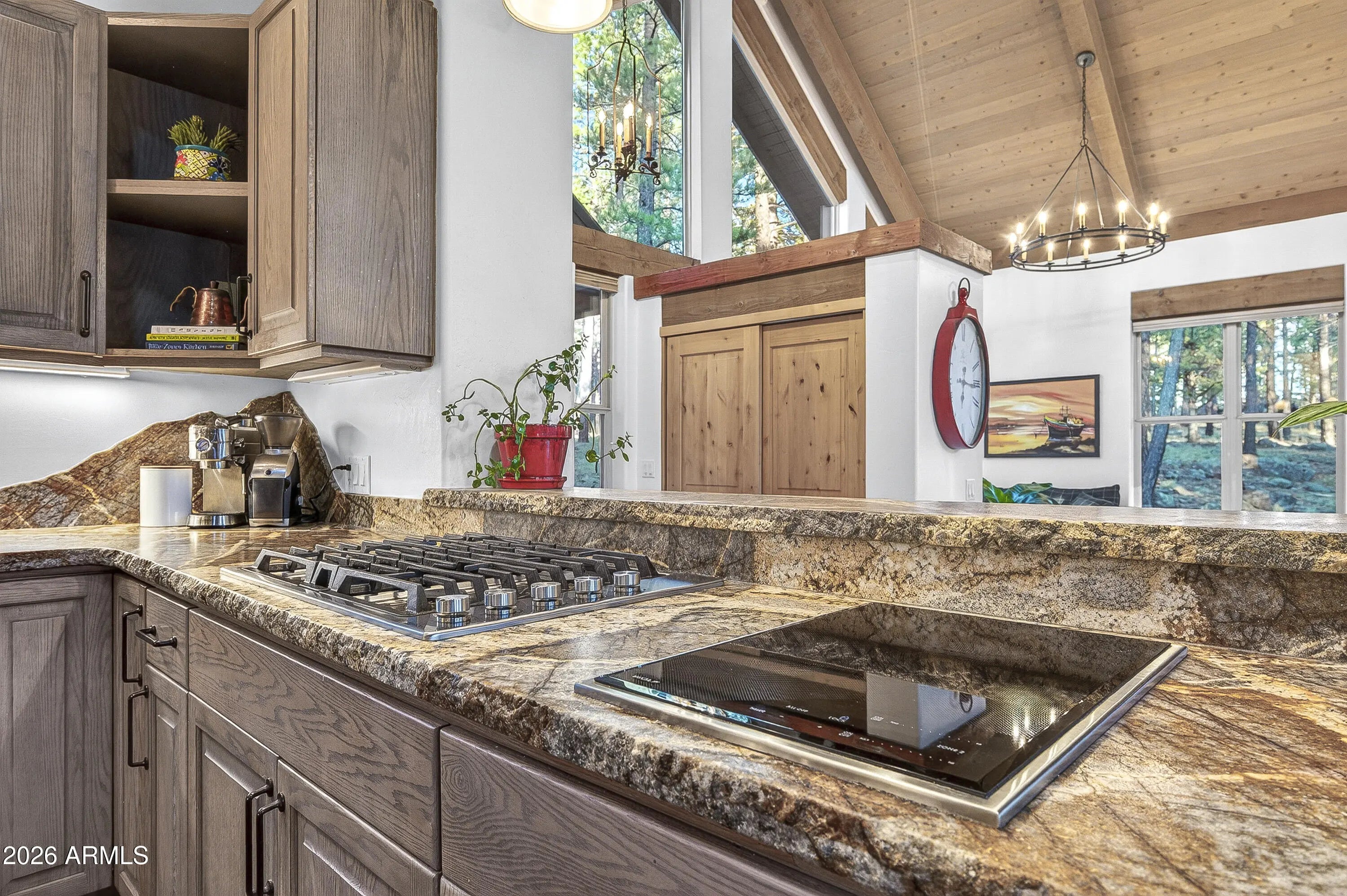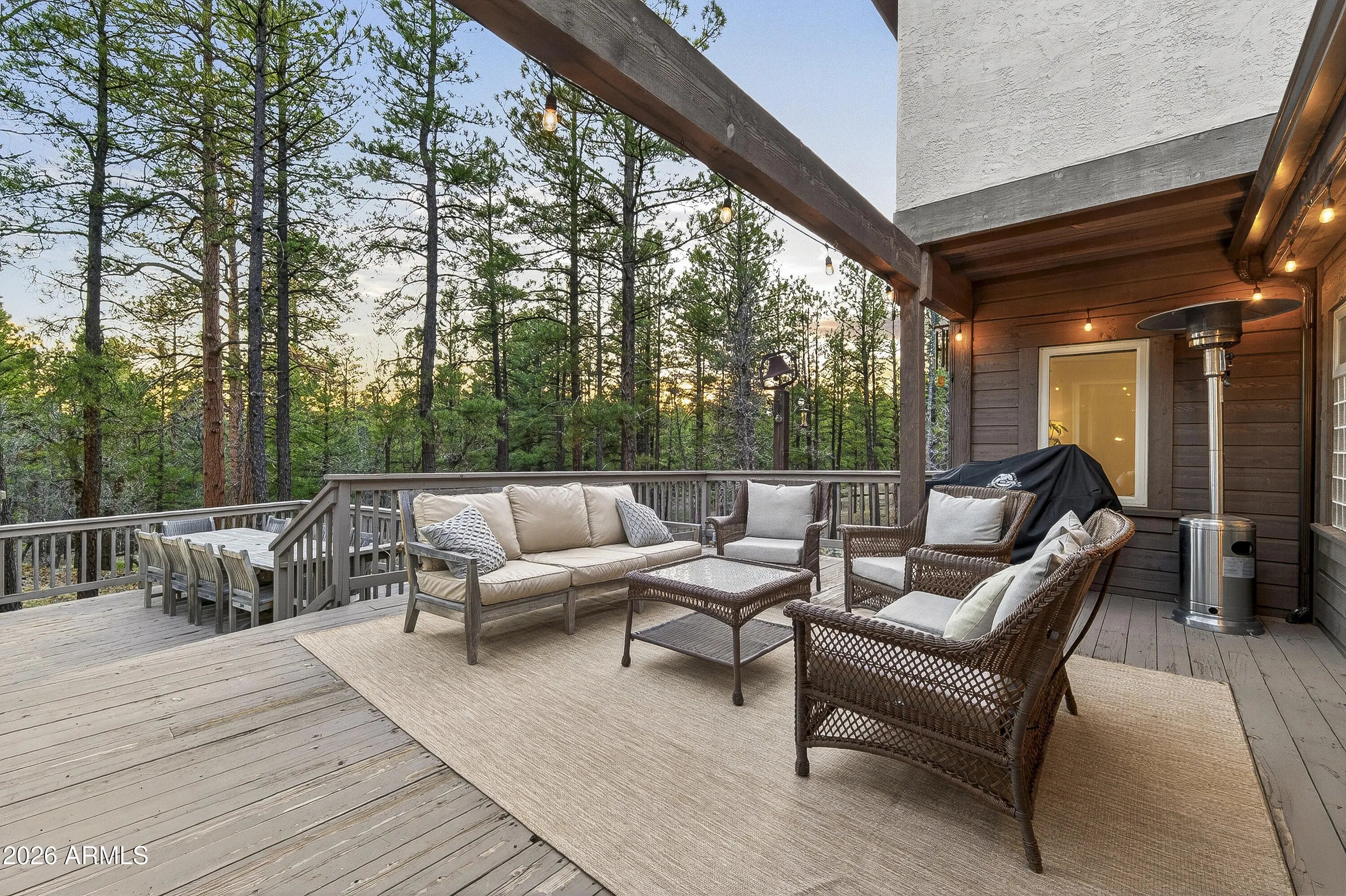 block workstation, double ovens, and a gas cooktop. The main-level primary suite sits near an office or 5th bedroom, with three oversized ensuite bedrooms upstairs, including one with custom triple bunk beds. This home has undergone extensive high-end interior renovations, including Knotty Alder doors and trim, designer lighting, premium wool Berber carpeting, a mix of slate and large plank wood floors, Hunter Douglas window coverings, upgraded stone and granite counters, and a spa-inspired primary bath with a custom slate soaking tub. Recent major investments elevate long-term reliability: owned solar, a premium metal roof, whole-home air sealing by Cozy Home, a high-efficiency heat pump system, and an upgraded 10,000-gallon galvanized cistern. The property has been professionally fire-wise treated, with over 150 additional trees and hazardous limbs removed. A mudroom and laundry area connect to the oversized 3-car garage, and the home includes two heaters, a hot tub, two A/C units, a large shed, a central vacuum, and more. This turnkey mountain retreat blends luxury, durability, privacy, and an unmatched outdoor lifestyle, all on a paved county road in one of Flagstaff's most coveted settings.