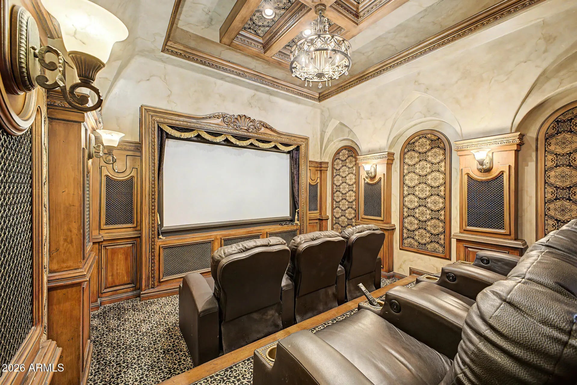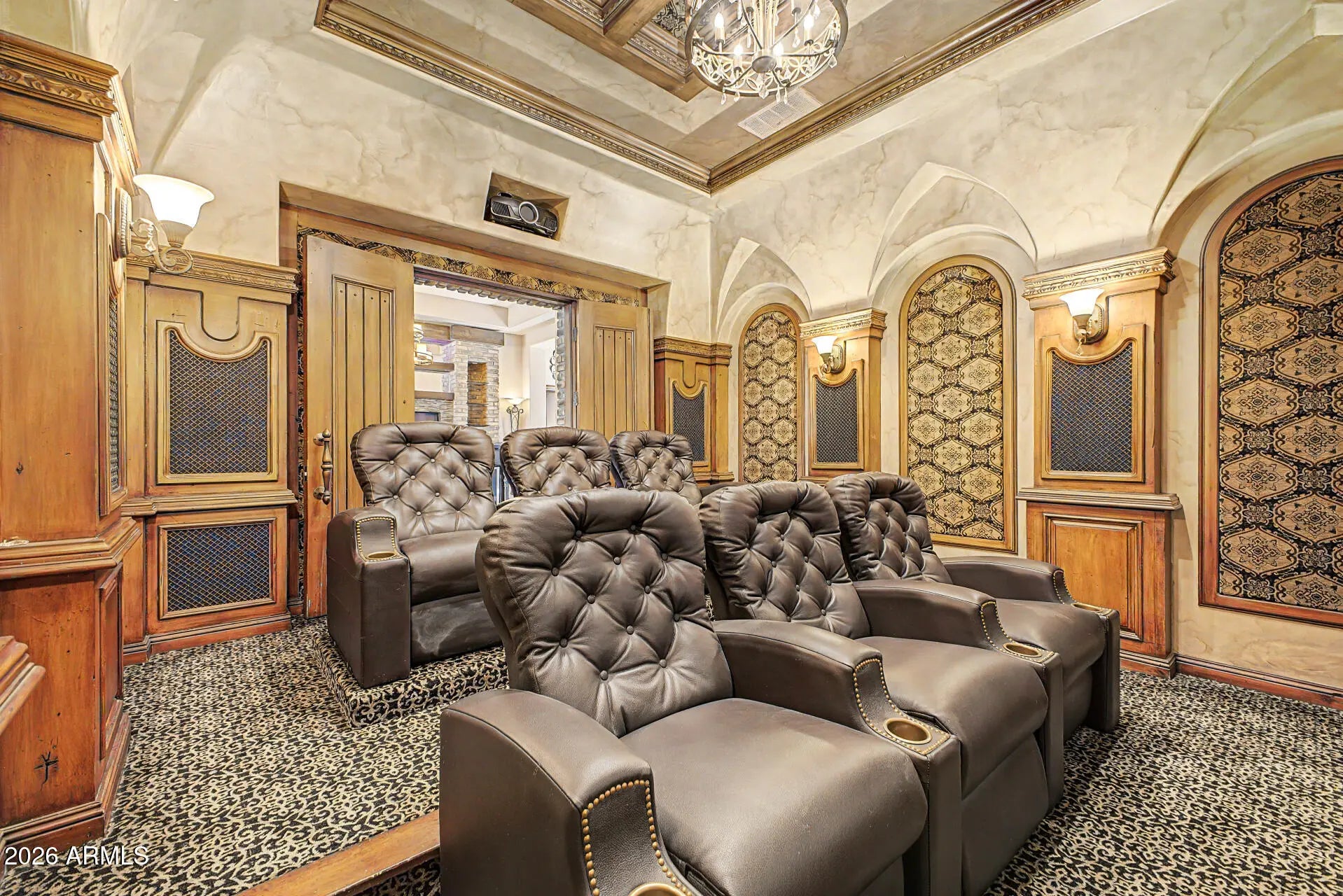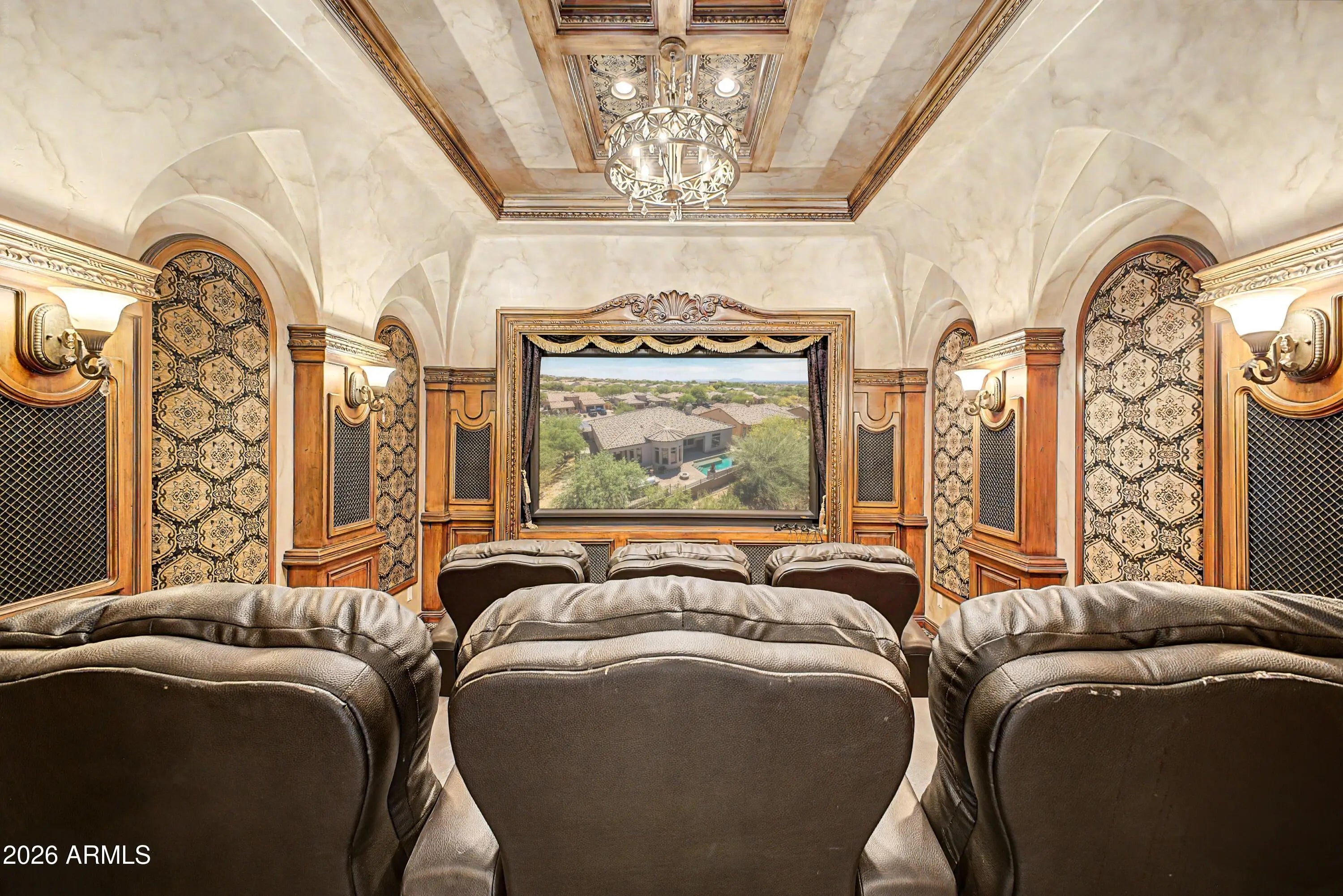 Beautiful corner-lot Las Sendas Mountain home, perfect for entertaining. 4 bedrooms, 4.5 baths, with office with outside access, 12-ft ceilings throughout, wood-beam in the living room, fresh interior paint. The $125K built-in home theater with tapestries, high-end vibrating recliners, and top-quality projection system was designed by Joe Courtney. 12-ft bar with taps in the $75K bar/game room. The well-appointed oversized kitchen was professionally and ergonomically designed. Lots of storage in the two master bedroom walk-in closets. The 2nd master suite has its own entrance and is perfect for multi-generational living or guests. Very private back yard with built-in BBQ and pool with water feature. The courtyard has a gated entrance, and there's plenty of room in the 3-car garage.
