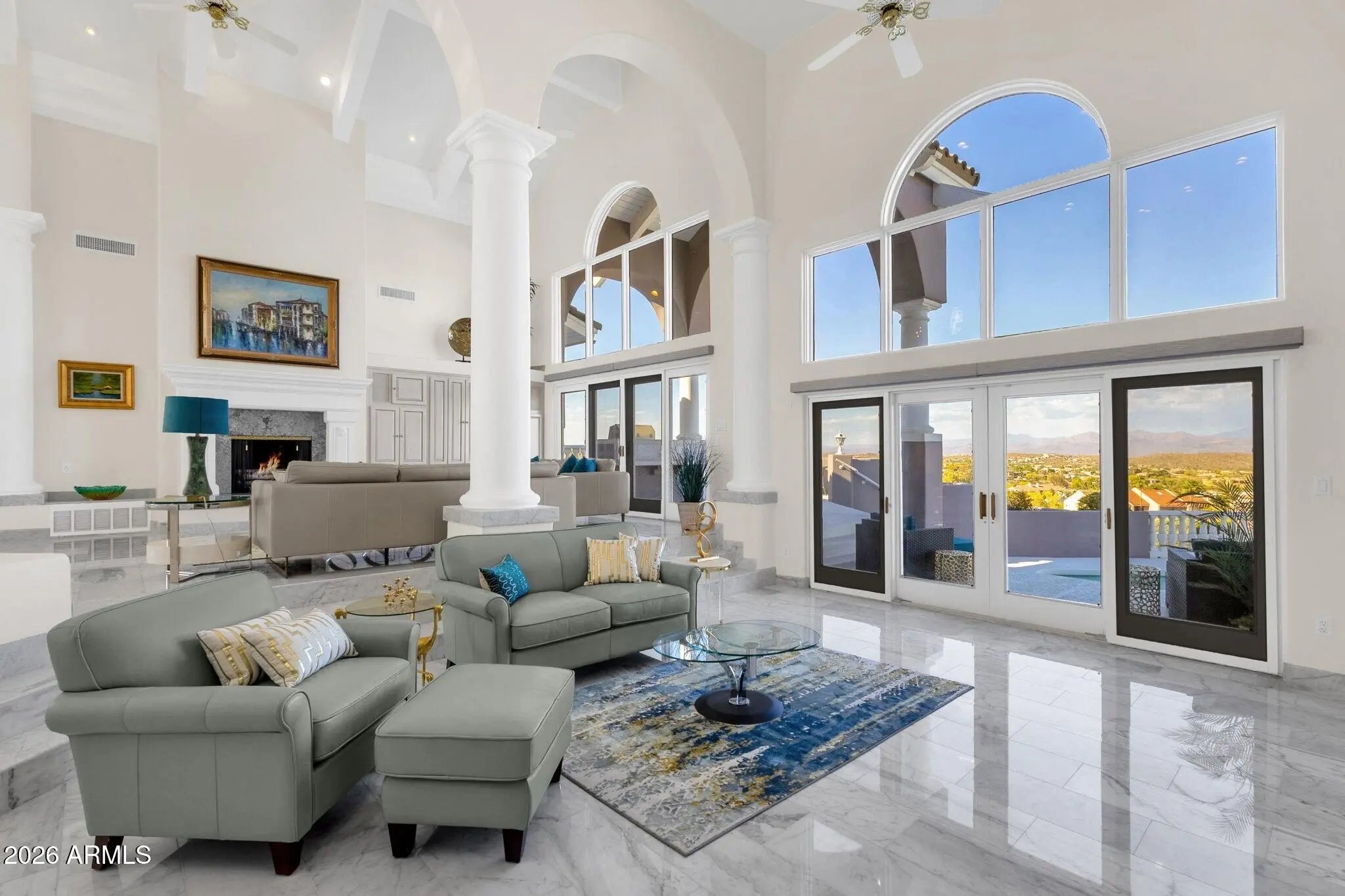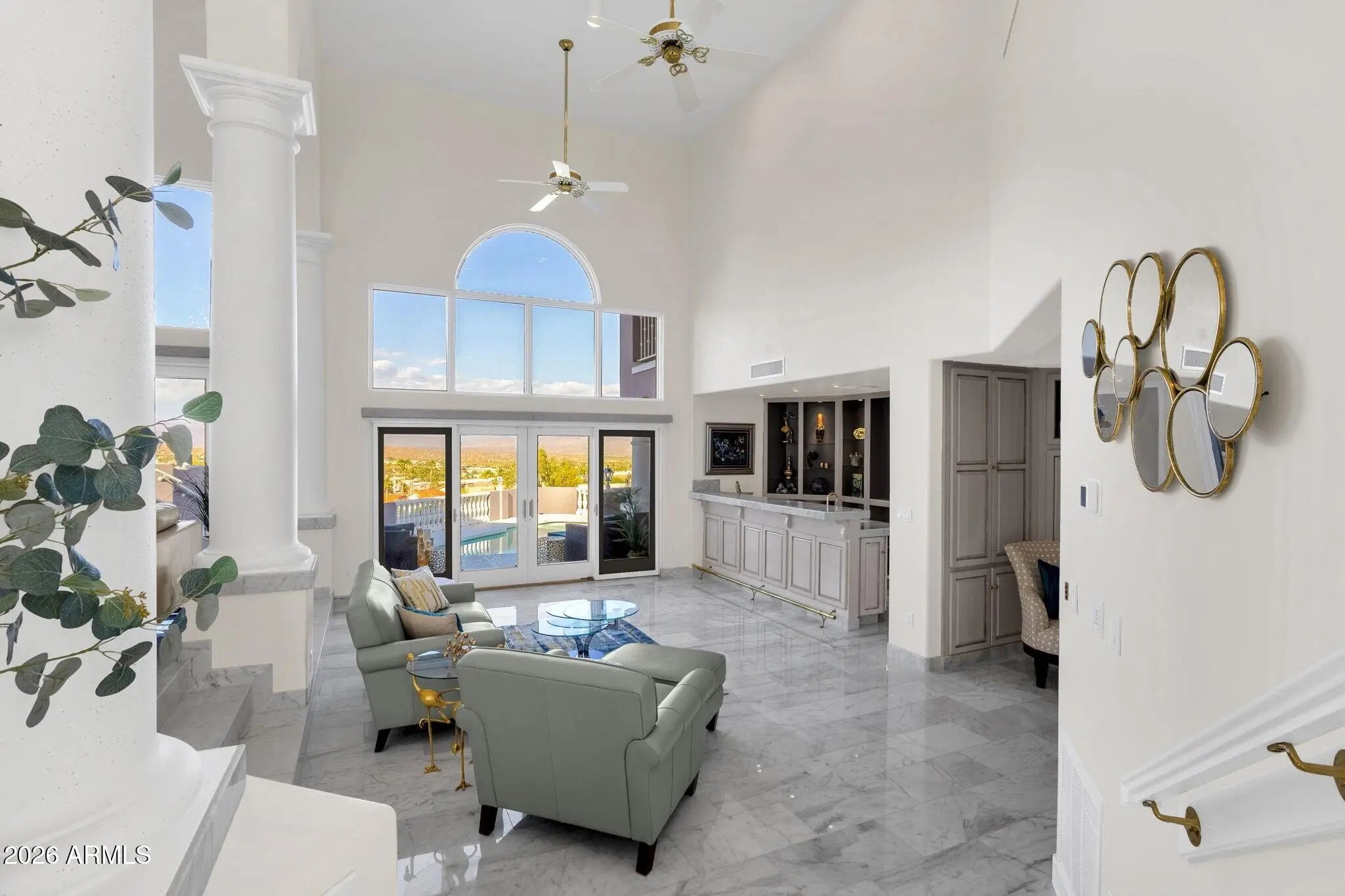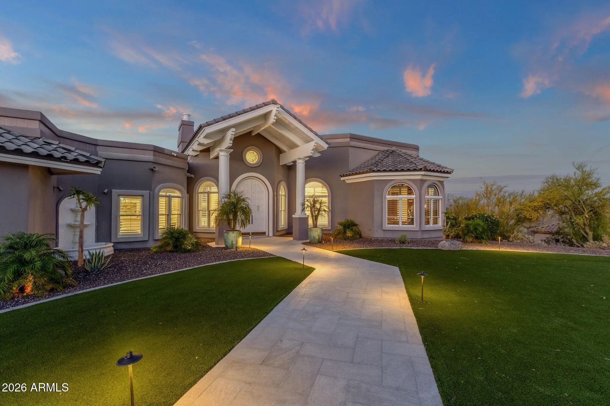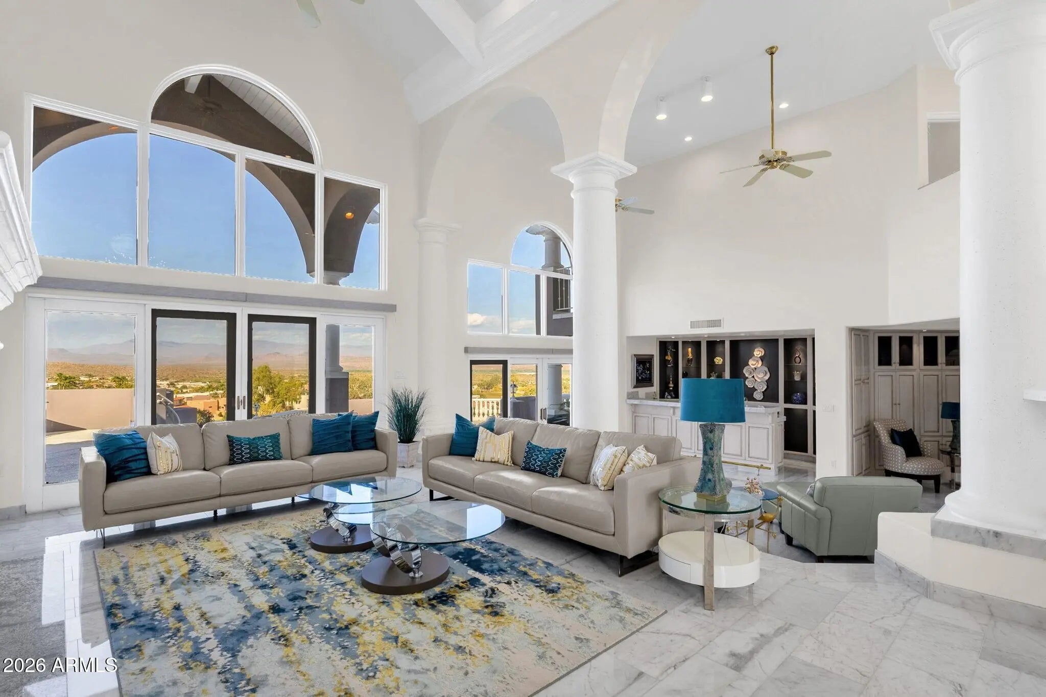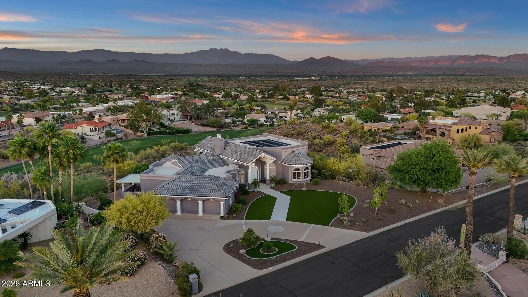 Framed by sweeping desert views from nearly every angle, this Fountain Hills residence captures the essence of elevated desert living, with sightlines that stretch across Red Mountain, Four Peaks, the iconic Fountain, and Desert Canyon Golf Course. A circular driveway and three-car garage set the stage, while the thoughtfully designed front landscape blends curated plantings with lush turf. The entry makes an immediate impression with oversized doors, beautiful flooring, and a direct visual connection to the surrounding mountains. Inside, the home unfolds into expansive living spaces designed for both everyday comfort and effortless entertaining. The main living area offers multiple seating zones, including a formal living space, conversation area, sitting room, sitting room, fireplace, and built-in bar, all oriented to maximize the views.The kitchen is generously sized with ample cabinetry, extensive counter space, a large island, newer dual ovens, warming drawer, and a well-appointed walk-in pantry. Just beyond, the breakfast nook is perfectly positioned to capture breathtaking views, while the formal dining room offers backyard access and designer wallpaper that adds character and warmth. A richly appointed office features beautiful woodwork, built-in bookcases, and abundant natural light. The primary suite is a true retreat, showcasing views of both Four Peaks and Red Mountain, along with private patio access oriented toward the Fountain. The spacious layout includes a large walk-in closet with built-in organization and a well-appointed bath with dual vanities, soaking tub, walk-in shower, and private water closet. Guest accommodations are equally inviting, including a secondary bedroom with built-in shelving and direct patio access, adjacent to a large bath both a soaking tub and walk-in shower. An additional flexible space offers versatility as a third bedroom, secondary living area, or office, allowing the home to adapt to a variety of needs. The backyard is designed to fully embrace the setting, offering a large covered patio, built-in grill, heated pool, and convenient exterior-access half bath, all surrounded by exceptional views. Extensive recent improvements enhance both form and function, including a new roof, full interior and exterior repaint, redesigned landscaping with irrigation, lighting, and turf, marble and onyx flooring throughout, marble countertops, upgraded lighting and fixtures, and significant mechanical updates such as multiple new HVAC units, water heaters, and pool equipment. A rare opportunity to experience refined desert living with truly unmatched views in every direction.