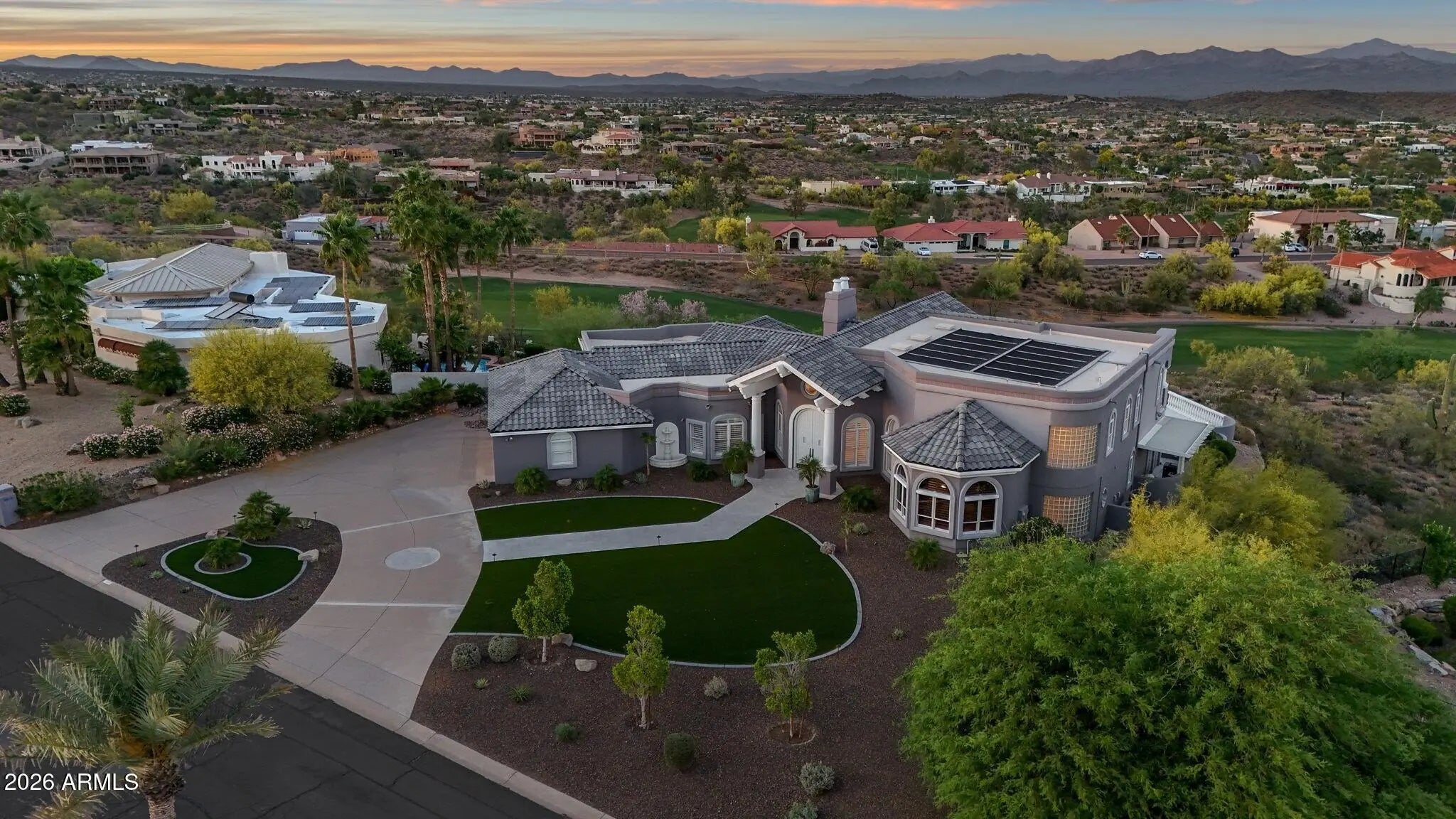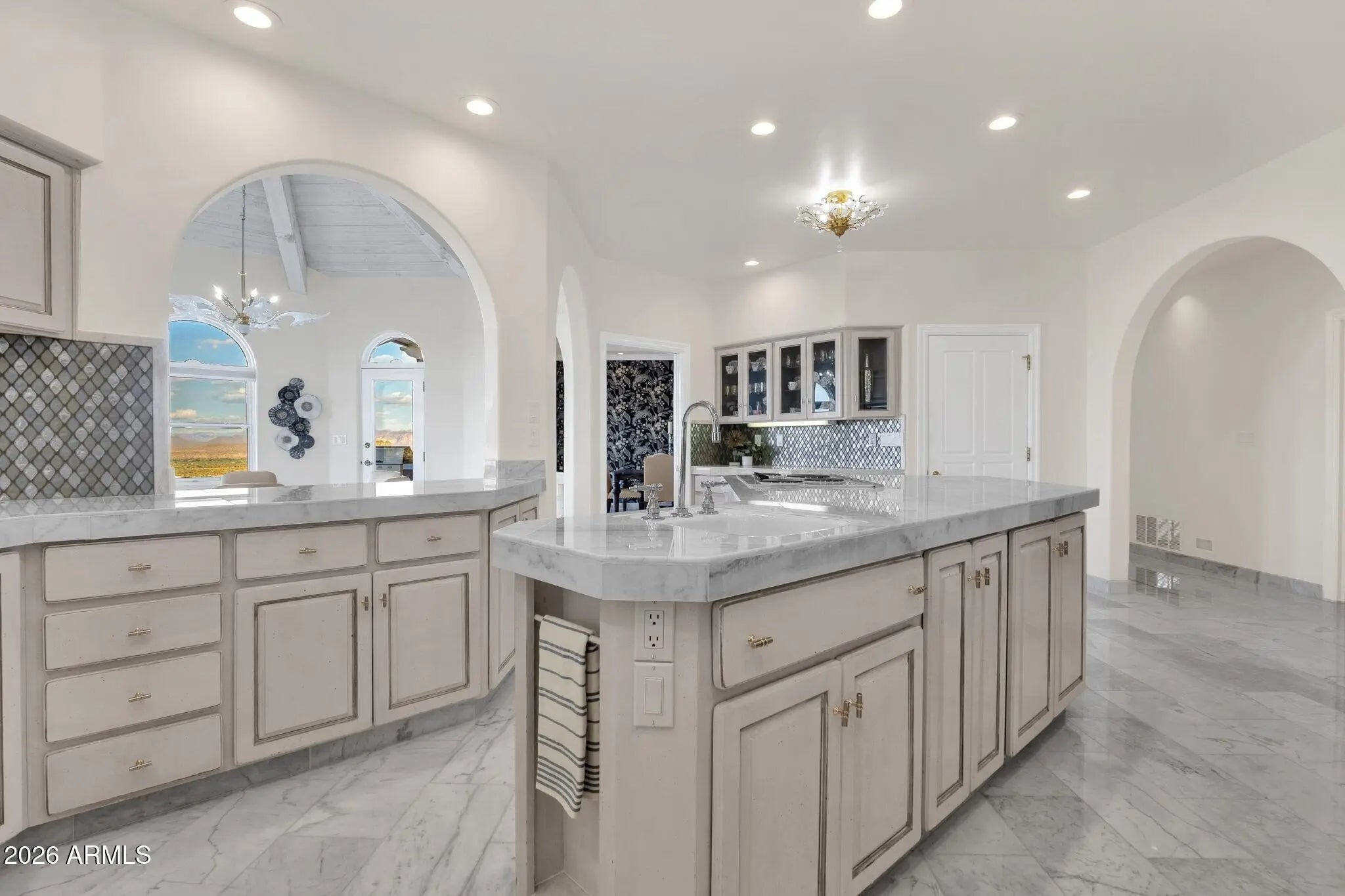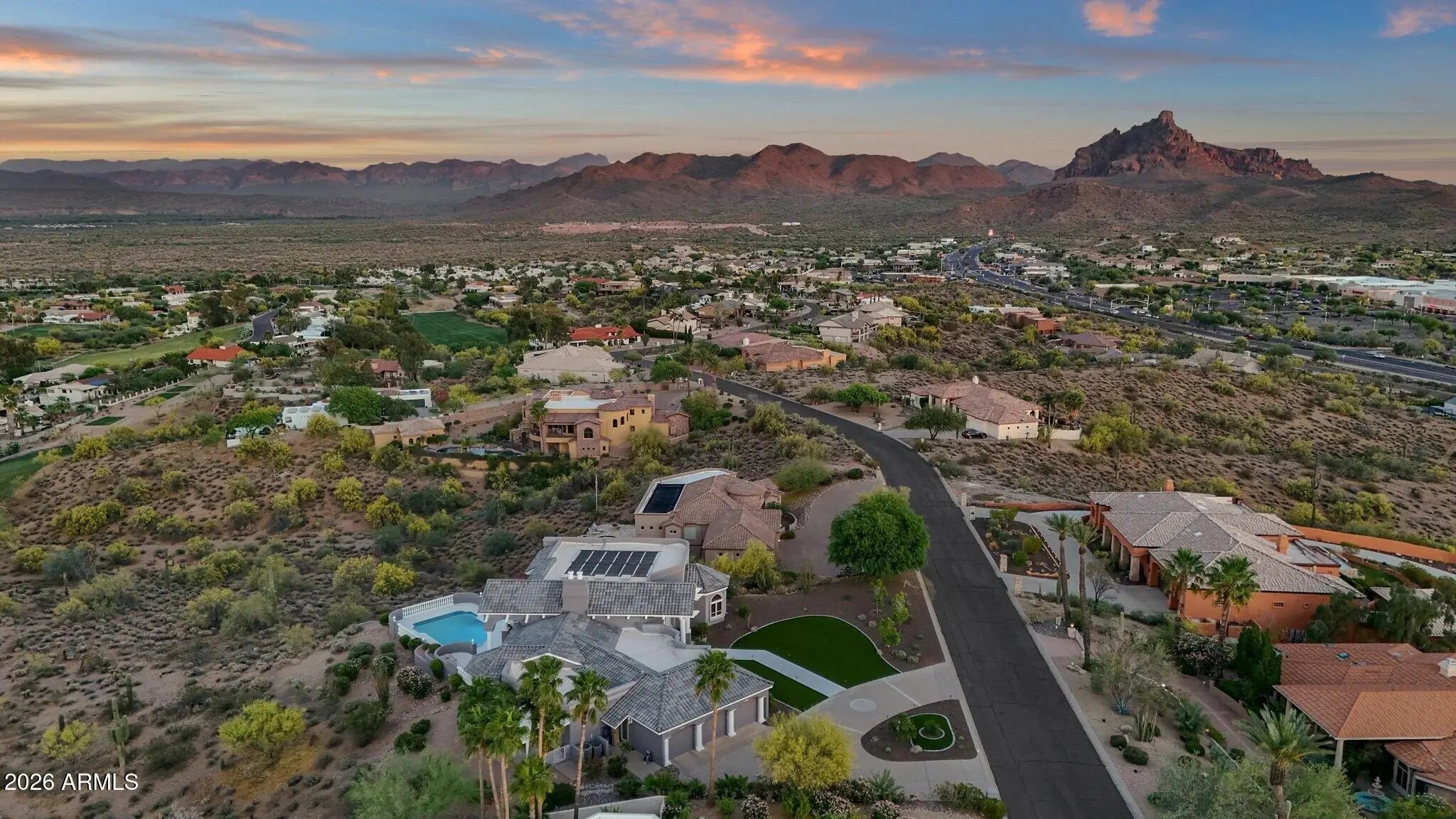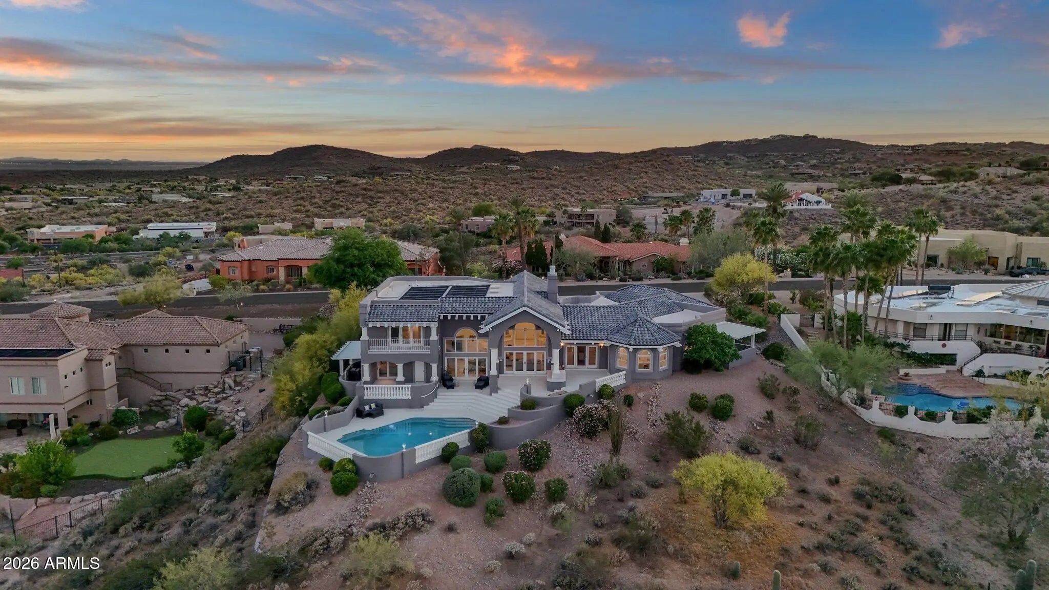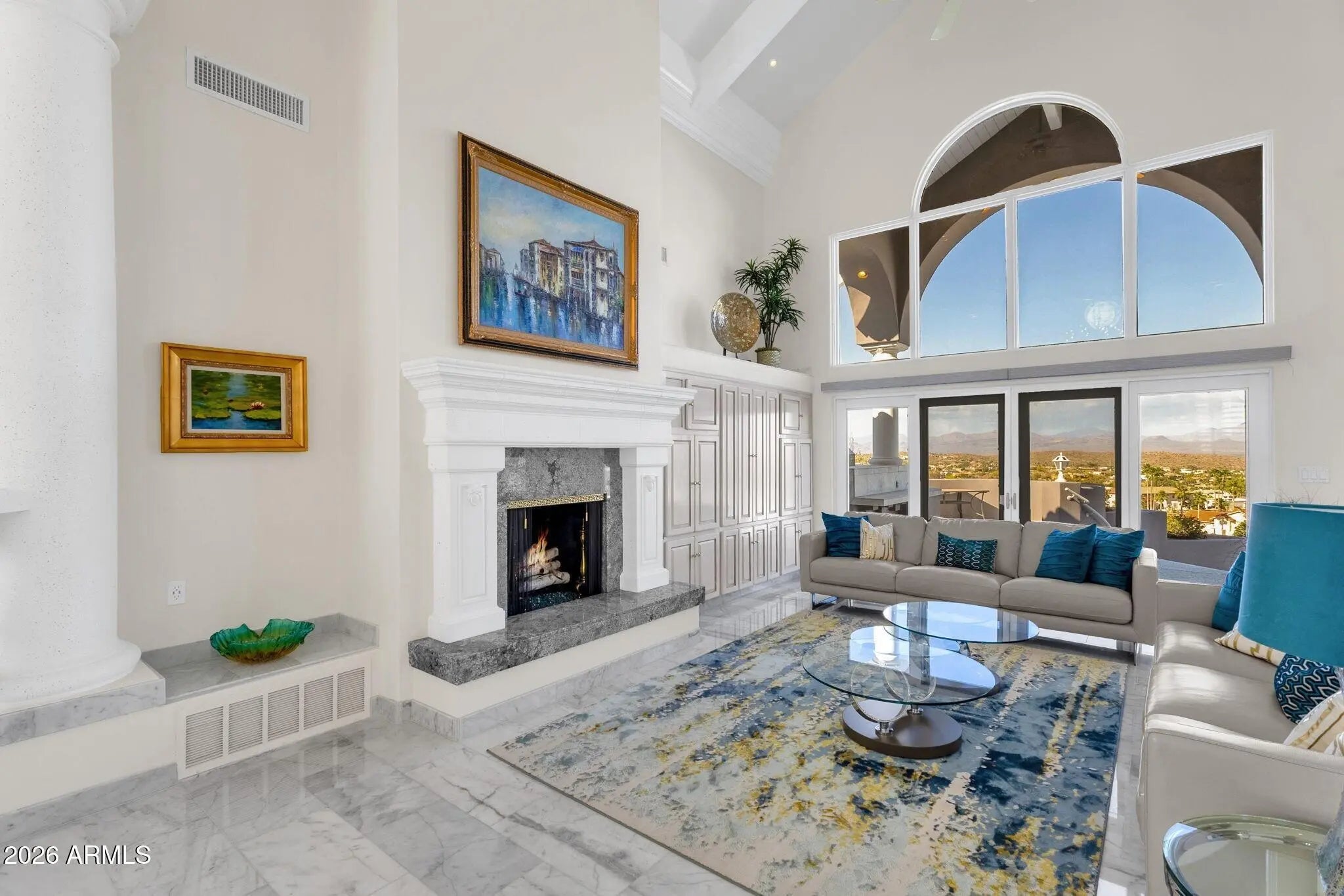Framed by sweeping desert views from nearly every angle, this Fountain Hills residence captures the essence of elevated desert living, with sightlines that stretch across Red Mountain, Four Peaks, the iconic Fountain, and Desert Canyon Golf Course. A circular driveway and three-car garage set the stage, while the thoughtfully designed front landscape blends curated plantings with lush turf. The entry makes an immediate impression with oversized doors, beautiful flooring, and a direct visual connection to the surrounding mountains. Inside, the home unfolds into expansive living spaces designed for both everyday comfort and effortless entertaining. The main living area offers multiple seating zones, including a formal living space, conversation area, sitting room, sitting room, fireplace, and built-in bar, all oriented to maximize the views.The kitchen is generously sized with ample cabinetry, extensive counter space, a large island, newer dual ovens, warming drawer, and a well-appointed walk-in pantry. Just beyond, the breakfast nook is perfectly positioned to capture breathtaking views, while the formal dining room offers backyard access and designer wallpaper that adds character and warmth. A richly appointed office features beautiful woodwork, built-in bookcases, and abundant natural light. The primary suite is a true retreat, showcasing views of both Four Peaks and Red Mountain, along with private patio access oriented toward the Fountain. The spacious layout includes a large walk-in closet with built-in organization and a well-appointed bath with dual vanities, soaking tub, walk-in shower, and private water closet. Guest accommodations are equally inviting, including a secondary bedroom with built-in shelving and direct patio access, adjacent to a large bath both a soaking tub and walk-in shower. An additional flexible space offers versatility as a third bedroom, secondary living area, or office, allowing the home to adapt to a variety of needs. The backyard is designed to fully embrace the setting, offering a large covered patio, built-in grill, heated pool, and convenient exterior-access half bath, all surrounded by exceptional views. Extensive recent improvements enhance both form and function, including a new roof, full interior and exterior repaint, redesigned landscaping with irrigation, lighting, and turf, marble and onyx flooring throughout, marble countertops, upgraded lighting and fixtures, and significant mechanical updates such as multiple new HVAC units, water heaters, and pool equipment. A rare opportunity to experience refined desert living with truly unmatched views in every direction.