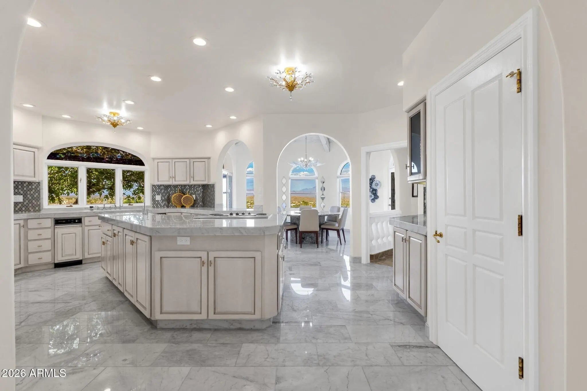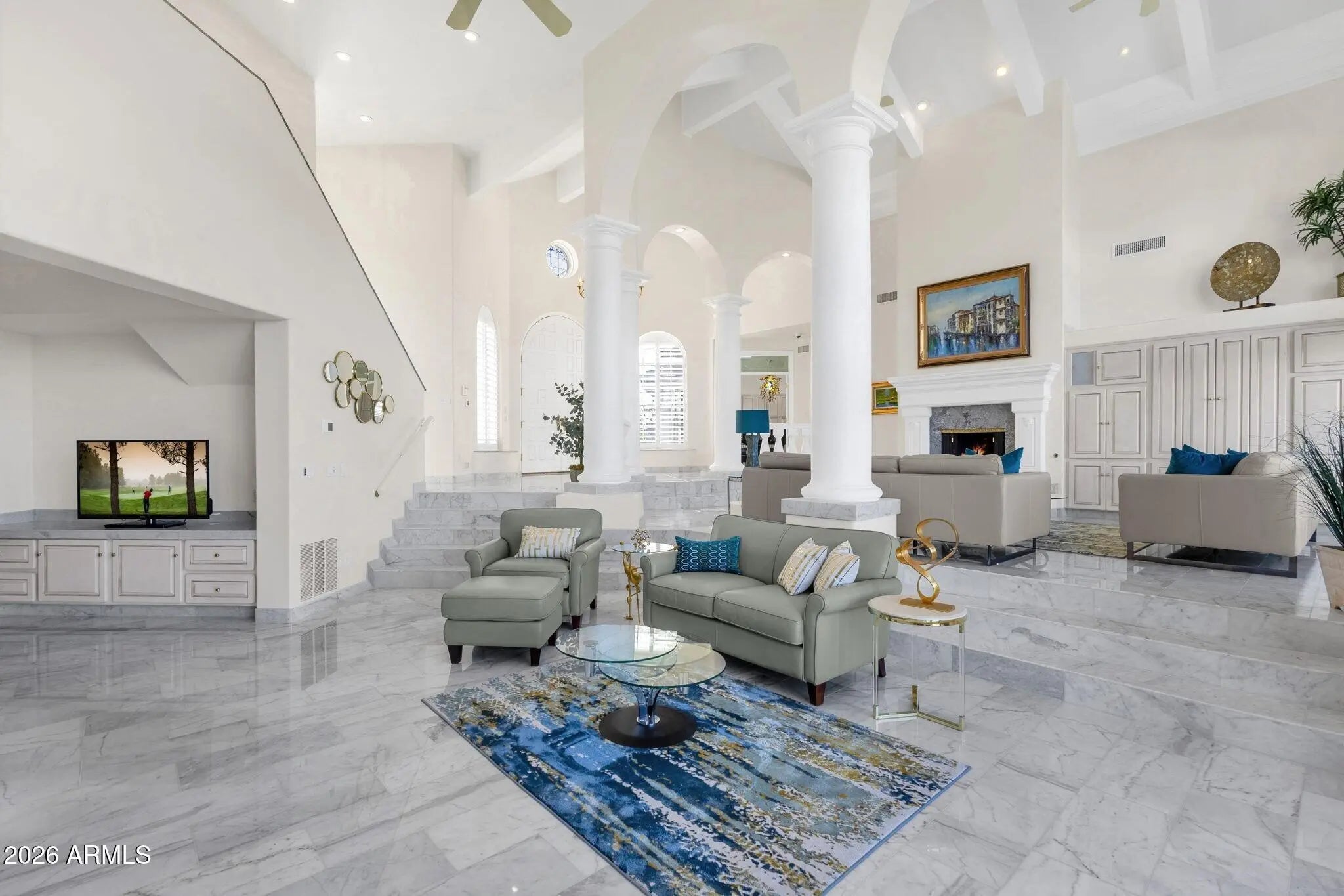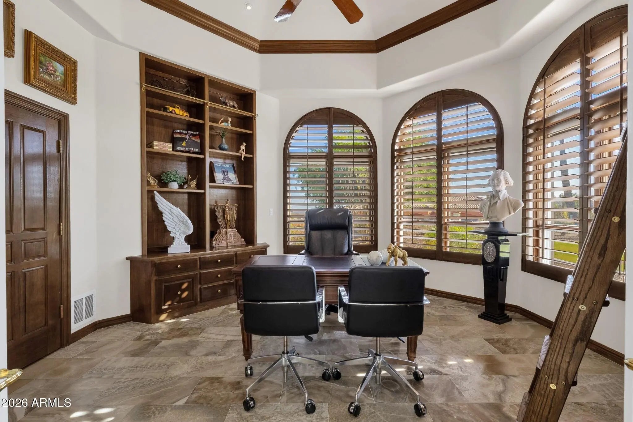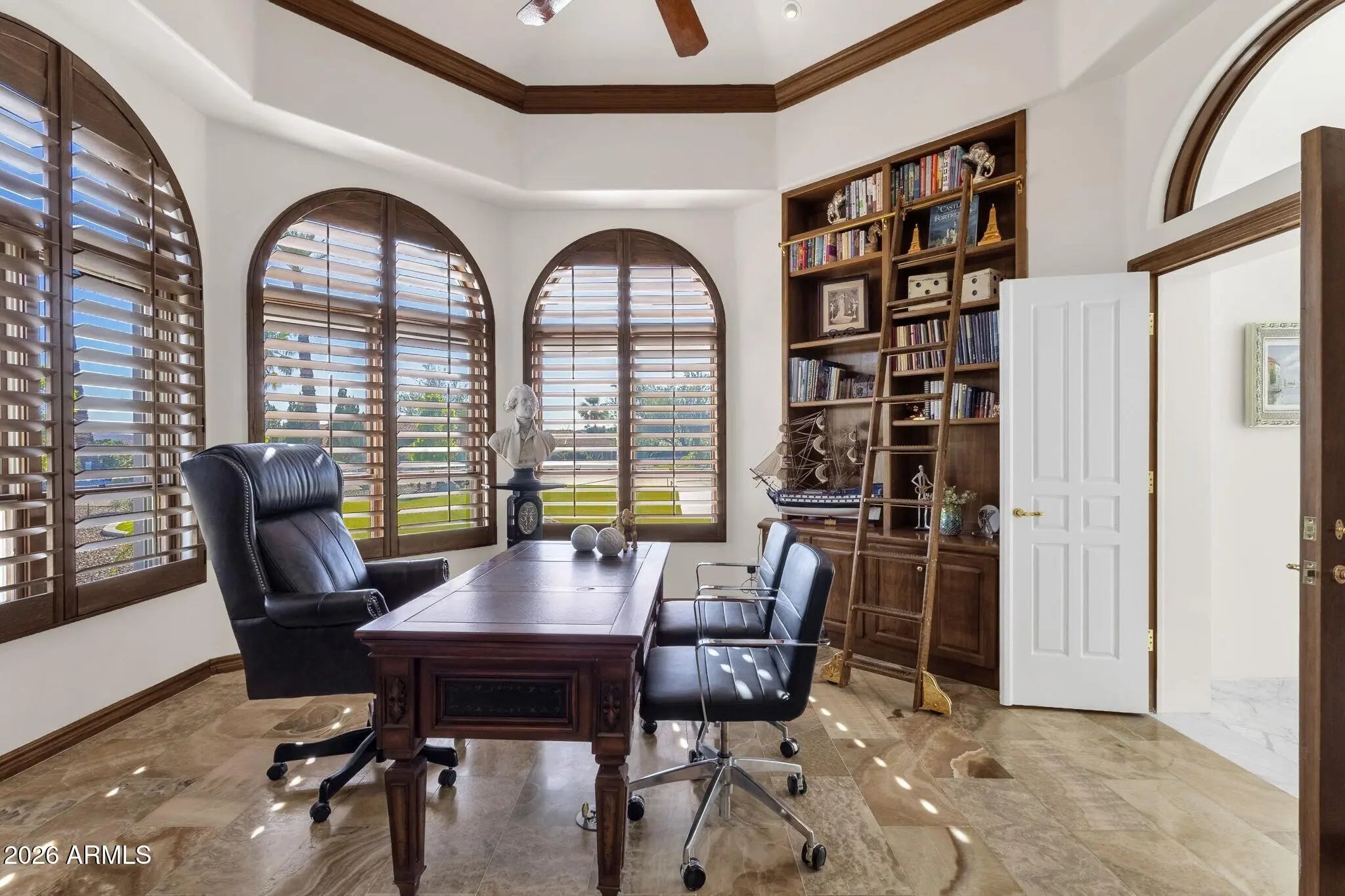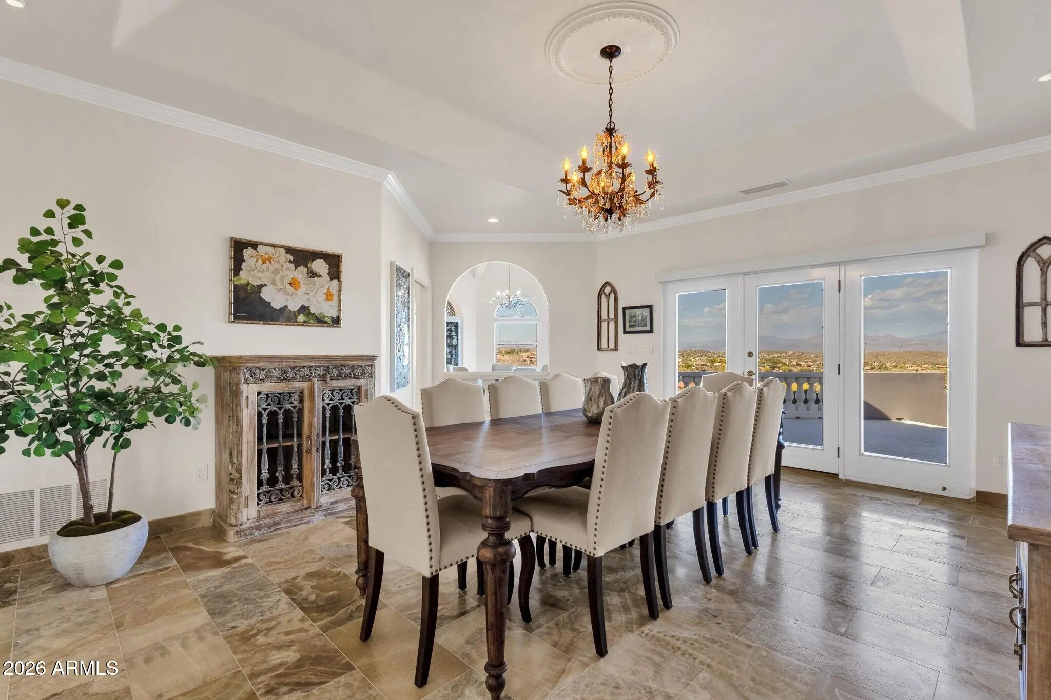 Framed by sweeping desert views from nearly every angle, this Fountain Hills residence captures the essence of elevated desert living, with sightlines that stretch across Red Mountain, Four Peaks, the iconic Fountain, and Desert Canyon Golf Course. A circular driveway and three-car garage set the stage, while the thoughtfully designed front landscape blends curated plantings with lush turf. The entry makes an immediate impression with oversized doors, beautiful flooring, and a direct visual connection to the surrounding mountains. Inside, the home unfolds into expansive living spaces designed for both everyday comfort and effortless entertaining. The main living area offers multiple seating zones, including a formal living space, conversation area, sitting room, sitting room, fireplace, and built-in bar, all oriented to maximize the views.The kitchen is generously sized with ample cabinetry, extensive counter space, a large island, newer dual ovens, warming drawer, and a well-appointed walk-in pantry. Just beyond, the breakfast nook is perfectly positioned to capture breathtaking views, while the formal dining room offers backyard access and designer wallpaper that adds character and warmth. A richly appointed office features beautiful woodwork, built-in bookcases, and abundant natural light. The primary suite is a true retreat, showcasing views of both Four Peaks and Red Mountain, along with private patio access oriented toward the Fountain. The spacious layout includes a large walk-in closet with built-in organization and a well-appointed bath with dual vanities, soaking tub, walk-in shower, and private water closet. Guest accommodations are equally inviting, including a secondary bedroom with built-in shelving and direct patio access, adjacent to a large bath both a soaking tub and walk-in shower. An additional flexible space offers versatility as a third bedroom, secondary living area, or office, allowing the home to adapt to a variety of needs. The backyard is designed to fully embrace the setting, offering a large covered patio, built-in grill, heated pool, and convenient exterior-access half bath, all surrounded by exceptional views. Extensive recent improvements enhance both form and function, including a new roof, full interior and exterior repaint, redesigned landscaping with irrigation, lighting, and turf, marble and onyx flooring throughout, marble countertops, upgraded lighting and fixtures, and significant mechanical updates such as multiple new HVAC units, water heaters, and pool equipment. A rare opportunity to experience refined desert living with truly unmatched views in every direction.