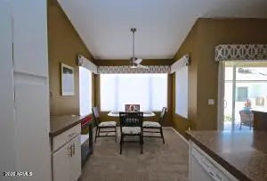 Sunbird 55+Golf Course Community with a 3 story Clubhouse and lots of amenities Carmel Floor Plan, 2-bedroom, 1.75 bathroom well maintained home with unique architectural louvered feature separating the kitchen from the living room. Earth tone colors provide for a warm and charming feel. Fully furnished with built-in shelving in the living room. Fully carpeted throughout. Large walk-in closet for the master bedroom. New asphalt roof within the past 5 years and hot water heater replaced in 2022. House comes with a six year transferable home warranty. Garage presently has a work bench but can hold a car and golf cart if preferred. Easy maintained yard. Washer-Dryer in the garage and kitchen amenities include all major appliances. All measurements are approx. Must see to appreciate.
