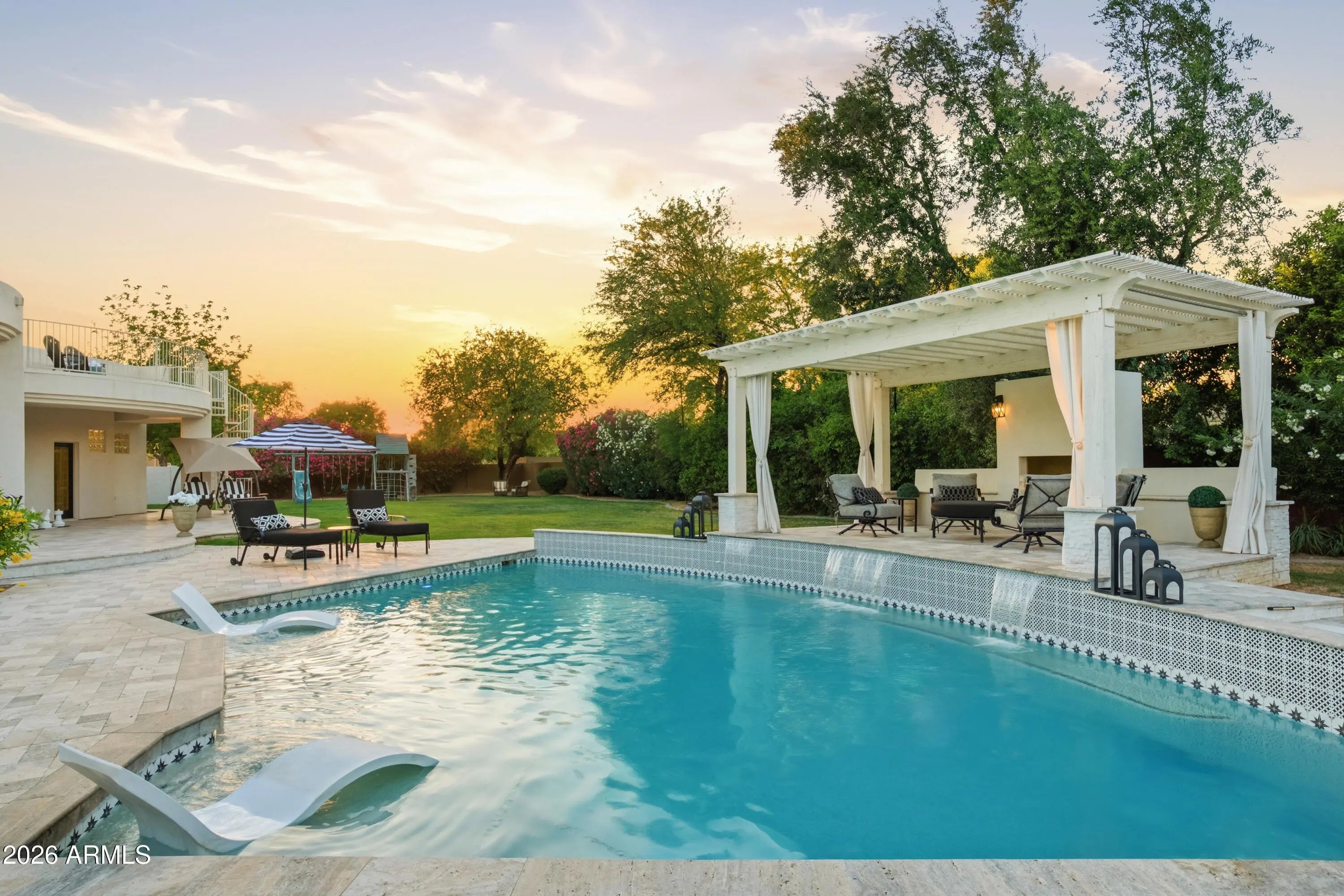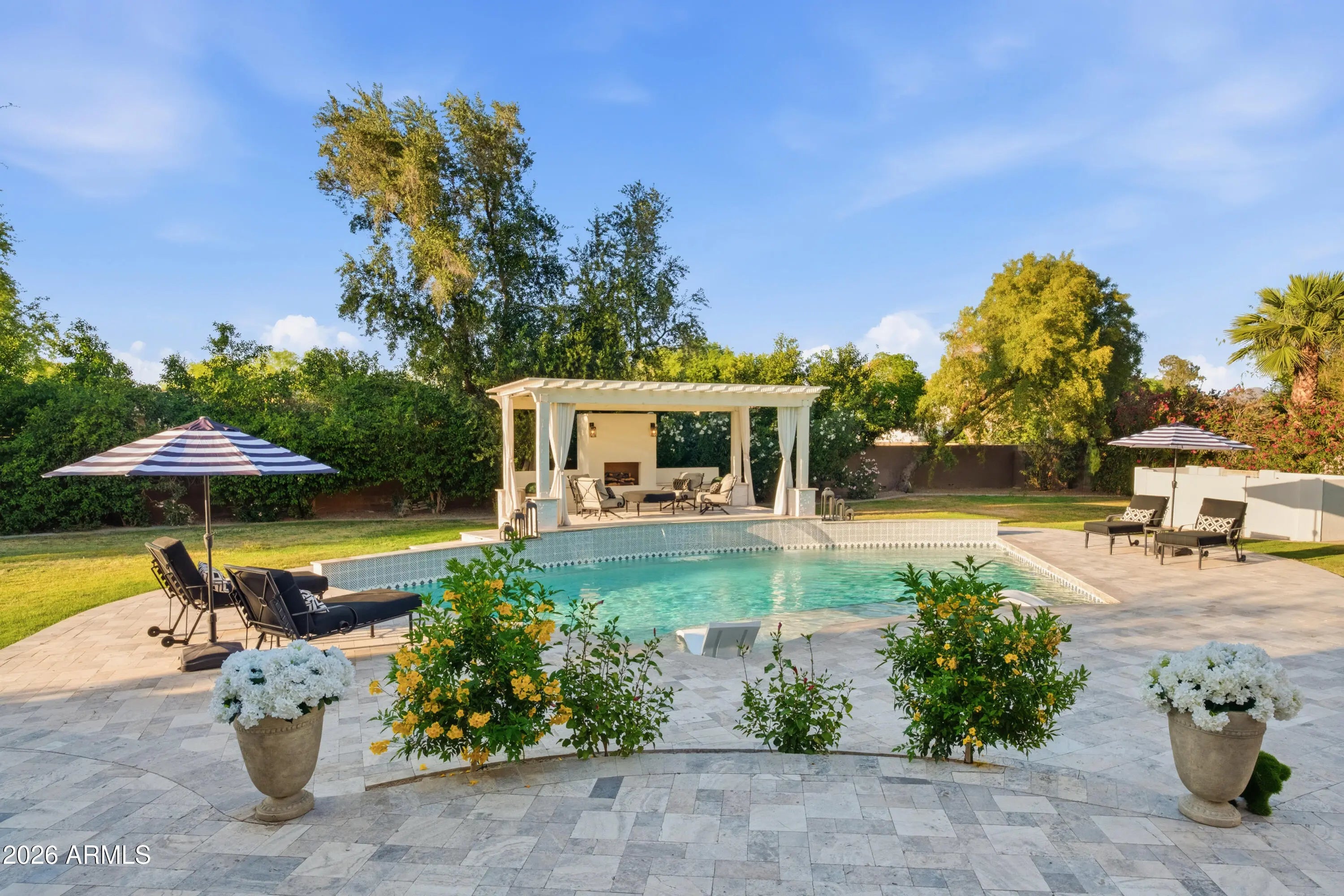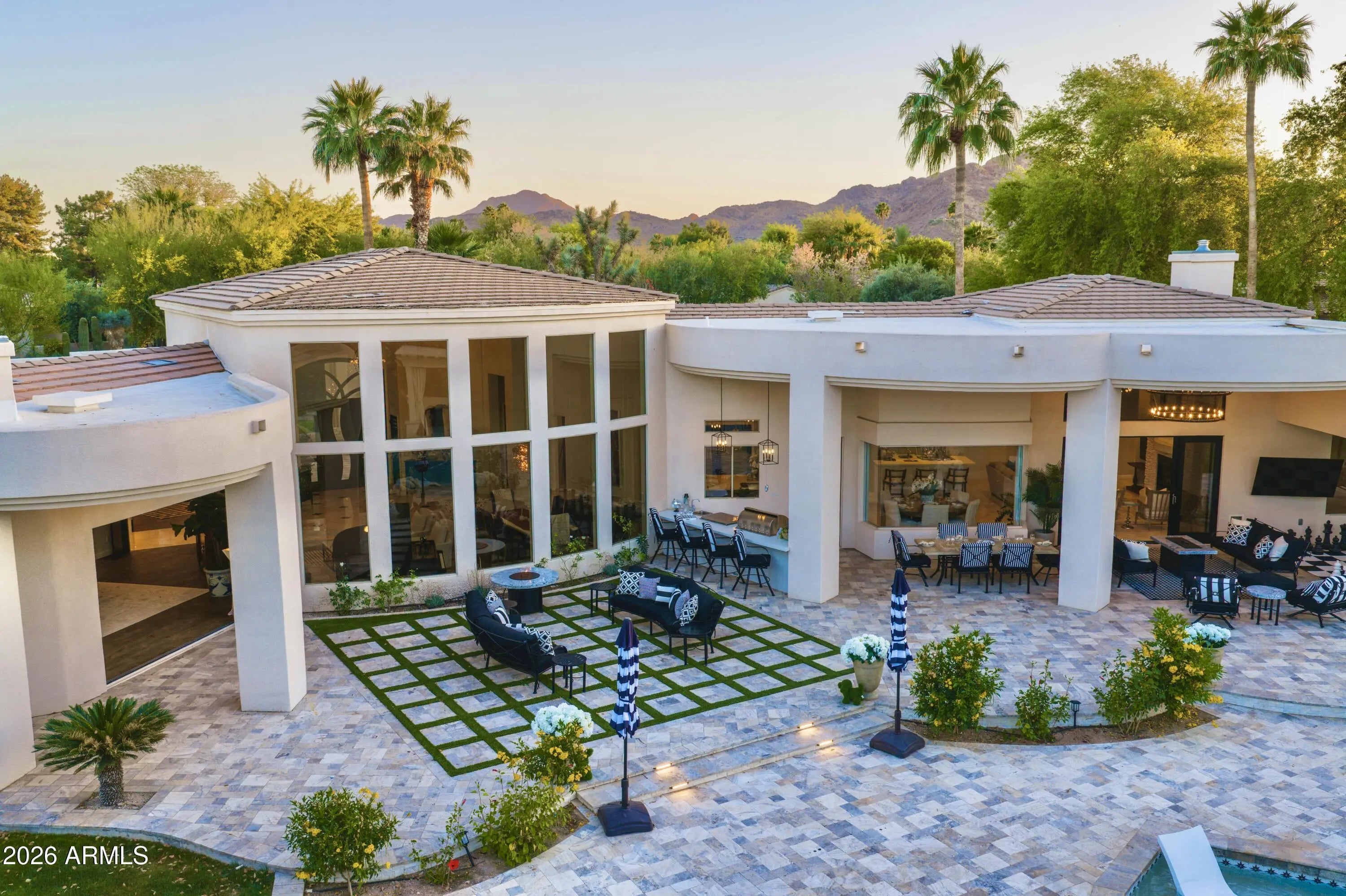 Exceptional opportunity to secure a private retreat within one of Paradise Valley's most prestigious enclaves. Perfectly positioned on a peaceful, tree-lined street, yet moments from Scottsdale's finest shopping and dining, this elegant home in Doubletree Estates offers both seclusion and convenience. A stunning, light-filled living room features soaring ceilings, refined wall detailing and expansive windows framing breathtaking views of the resort style backyard. Inviting and refined, the soft contemporary home continues with an open and bright kitchen, large island and bar, seamlessly connecting to a striking family room, grand fireplace and beautiful glass doors that create indoor/outdoor living. The sophisticated and newly updated primary suite offers a floor-to-ceiling fireplace and panoramic glass doors overlooking the stunning backyard oasis. Enjoy modern luxury in the newly renovated master bath with double walk-in closets. Two additional updated ensuite bedrooms add a touch of modern luxury throughout. The home offers an additional office and flex space ideal for a fitness area or playroom etc. Step outside to experience beautifully paver-ed patios that extend across the entire backyard, creating multiple areas for relaxation and entertaining. The expansive outdoor spaces are perfect for hosting large gatherings- all set against a backdrop of resort-style grounds that feature a generous pool, elegant ramada with fireplace and outdoor kitchen with expansive bar seating. You'll also discover stunning mountain and sunset views from the rooftop deck. If you are seeking an elevated living experience, this residence delivers a timeless style and unparalleled sophistication. Expansion plans available upon request.
