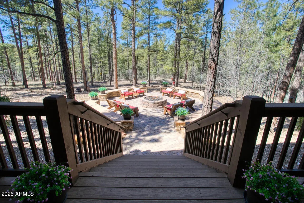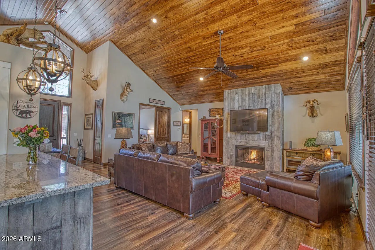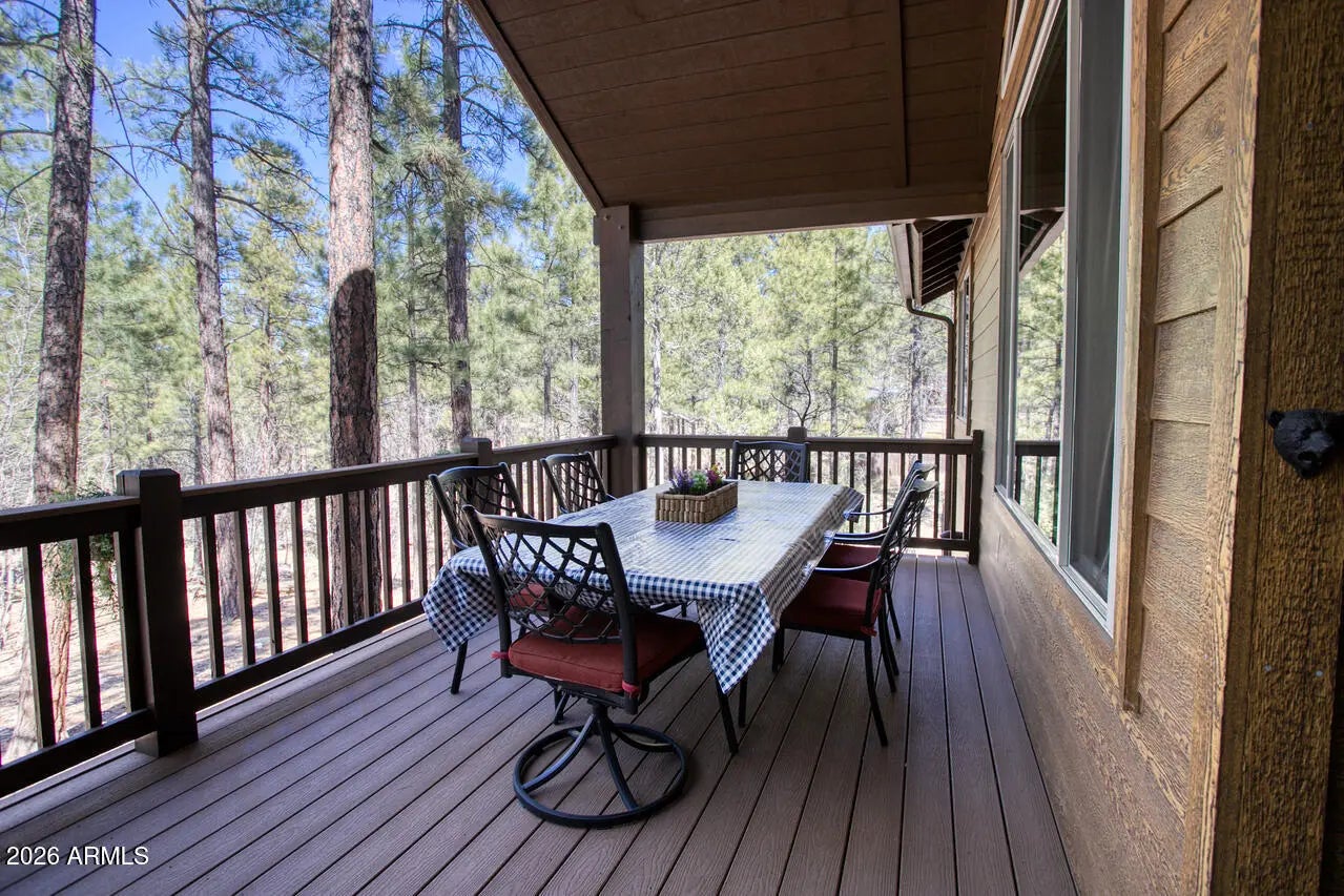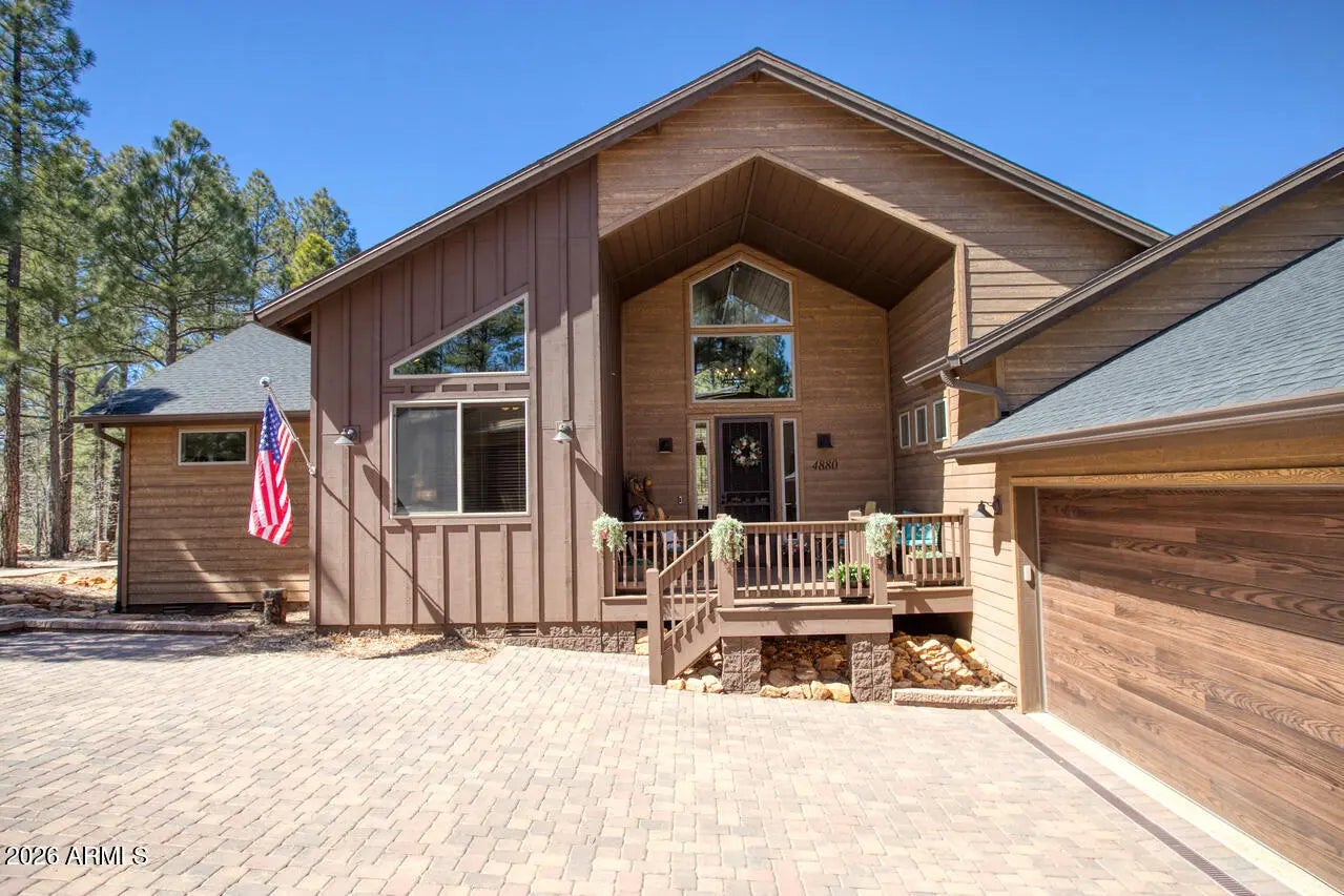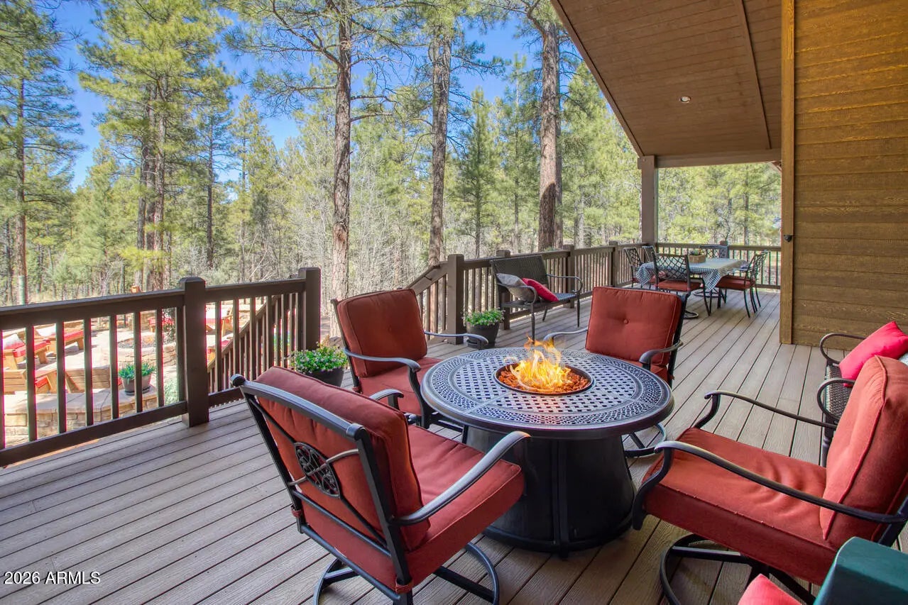 This exceptional luxury home in Arizona's White Mountains is a rare collaboration between premier builders Cambric Construction and Triple R Construction, offering quality craftsmanship and thoughtful design throughout. Located on approximately 0.91 acres in the private, gated Torreon community of Show Low, the property backs to the Sitgreaves National Forest, providing unmatched privacy and scenic surroundings. The main home/casita features approximately 3,467 square feet of living space, with expansive front and back decks ideal for relaxing or entertaining. A six-person heated Jacuzzi spa sits just off the primary suite, creating a private retreat. A fully furnished detached casita includes a full kitchen and bathroom, perfect for guests or extended family. The property also offers flexible garage space for up to six vehicles, or four vehicles plus a fully enclosed workshop. Both the garage and workshop include half bathrooms. Outdoor features include a paver driveway, five parking spaces, and a walkway leading to a spacious 25' x 25' seating area with a raised fire pit, perfect for gathering and enjoying the mountain setting. This home features 6 spacious bedrooms, 5 full bathrooms, and 2 half bathrooms, including those in the garage and workshop. The open-concept layout includes a well-appointed kitchen with stainless steel appliances, double ovens, ample cabinetry, a wine cooler, and a dedicated wine bar. Each room is comfortably furnished with inviting mountain-style décor. Located within the gated Trailhead community, the home sits approximately one mile from the entrance on a quiet cul-de-sac. At its center is a large, wooded island owned by the HOA, ensuring it will remain unbuildable and preserving the home's sense of space and privacy. The property is being sold fully furnished, both inside and out, offering a true turnkey opportunity; just bring your essentials. This home combines comfort, privacy, and warmth in a peaceful mountain setting