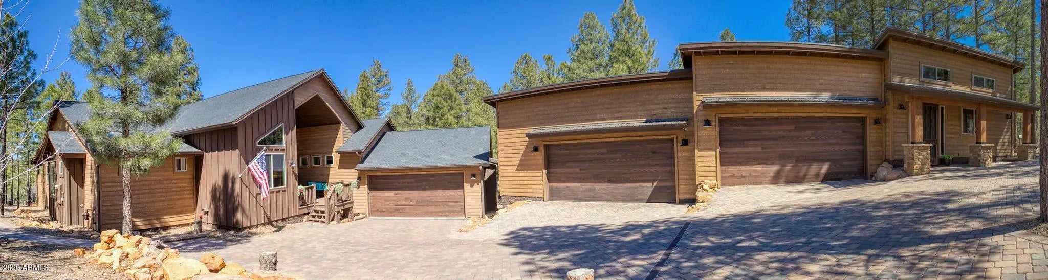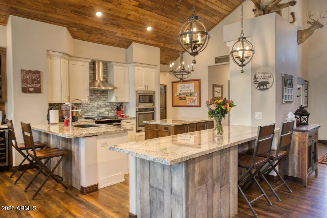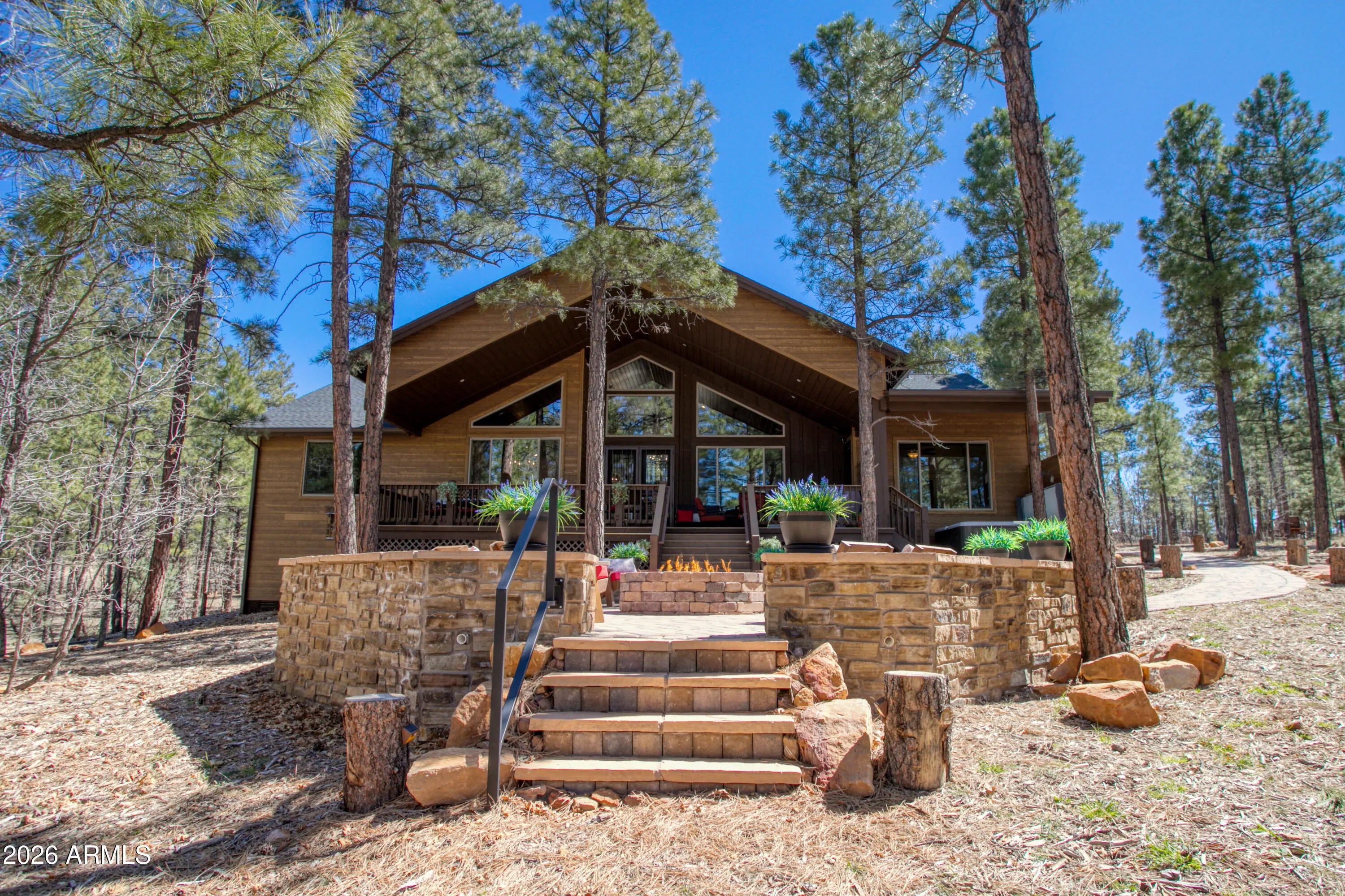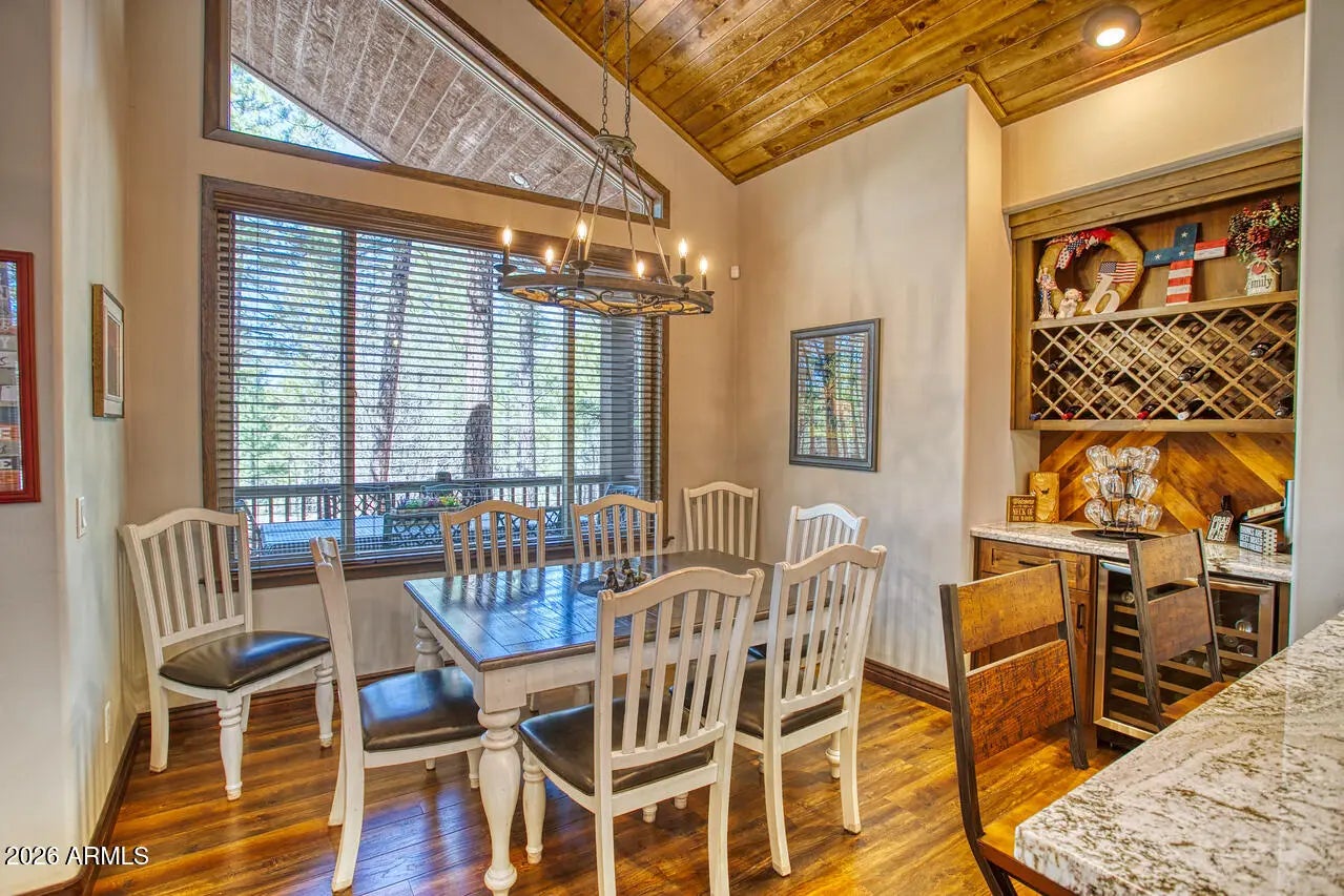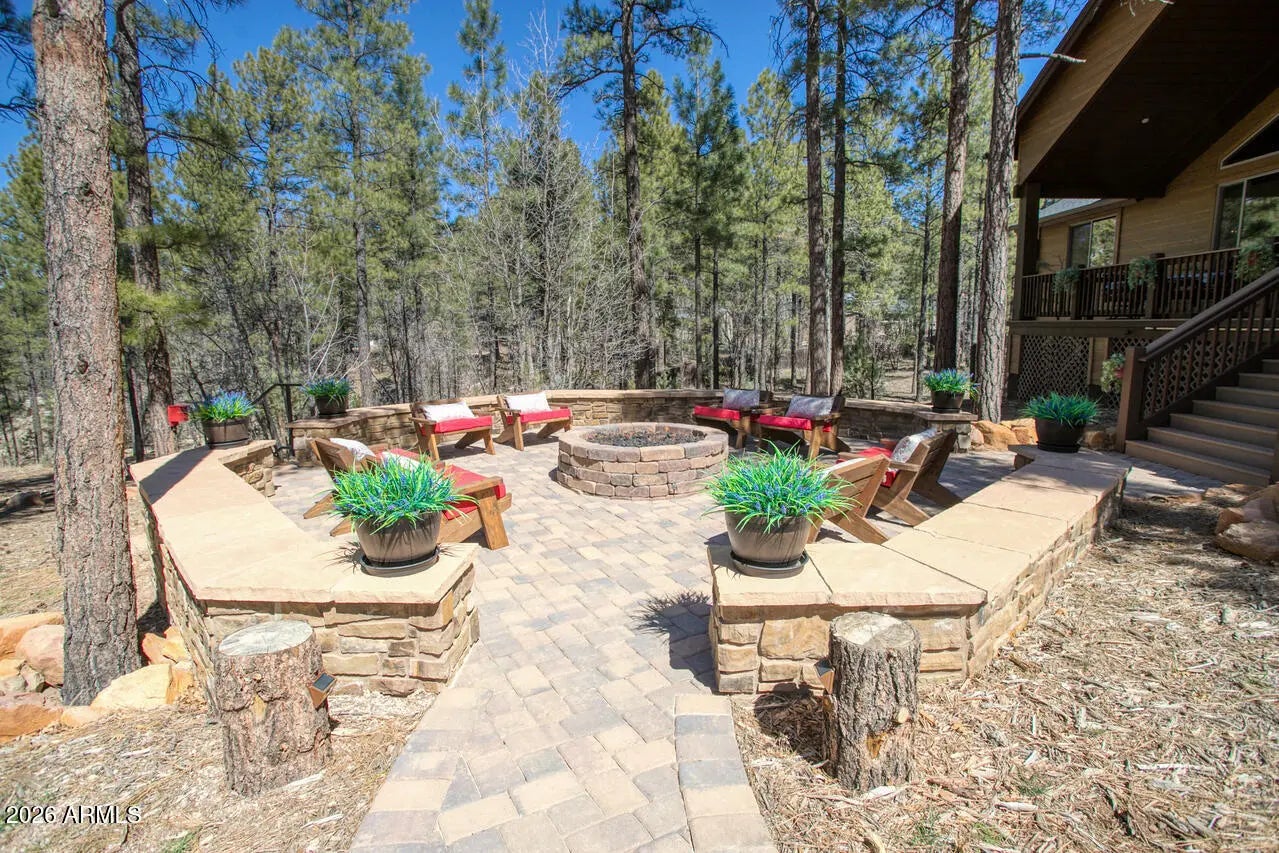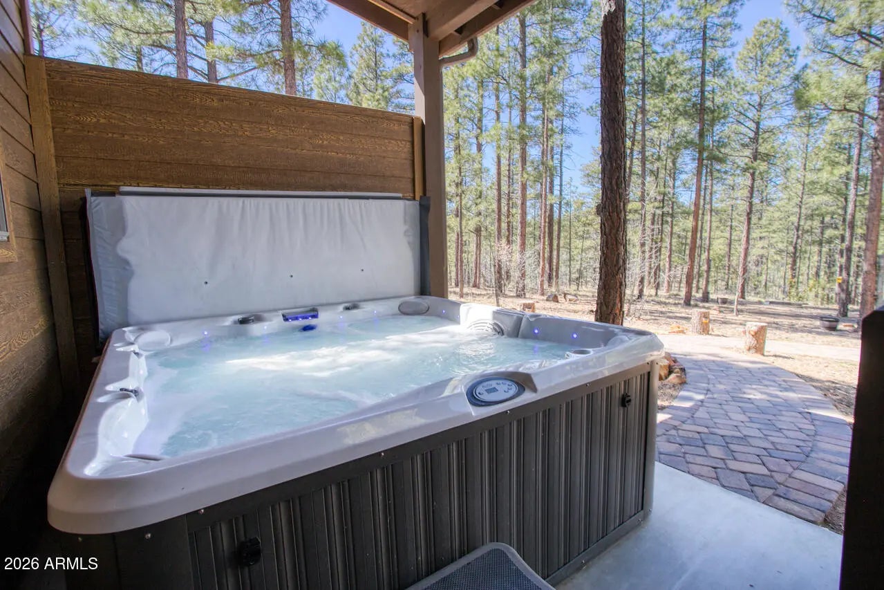 This exceptional luxury home in Arizona's White Mountains is a rare collaboration between premier builders Cambric Construction and Triple R Construction, offering quality craftsmanship and thoughtful design throughout. Located on approximately 0.91 acres in the private, gated Torreon community of Show Low, the property backs to the Sitgreaves National Forest, providing unmatched privacy and scenic surroundings. The main home/casita features approximately 3,467 square feet of living space, with expansive front and back decks ideal for relaxing or entertaining. A six-person heated Jacuzzi spa sits just off the primary suite, creating a private retreat. A fully furnished detached casita includes a full kitchen and bathroom, perfect for guests or extended family. The property also offers flexible garage space for up to six vehicles, or four vehicles plus a fully enclosed workshop. Both the garage and workshop include half bathrooms. Outdoor features include a paver driveway, five parking spaces, and a walkway leading to a spacious 25' x 25' seating area with a raised fire pit, perfect for gathering and enjoying the mountain setting. This home features 6 spacious bedrooms, 5 full bathrooms, and 2 half bathrooms, including those in the garage and workshop. The open-concept layout includes a well-appointed kitchen with stainless steel appliances, double ovens, ample cabinetry, a wine cooler, and a dedicated wine bar. Each room is comfortably furnished with inviting mountain-style décor. Located within the gated Trailhead community, the home sits approximately one mile from the entrance on a quiet cul-de-sac. At its center is a large, wooded island owned by the HOA, ensuring it will remain unbuildable and preserving the home's sense of space and privacy. The property is being sold fully furnished, both inside and out, offering a true turnkey opportunity; just bring your essentials. This home combines comfort, privacy, and warmth in a peaceful mountain setting