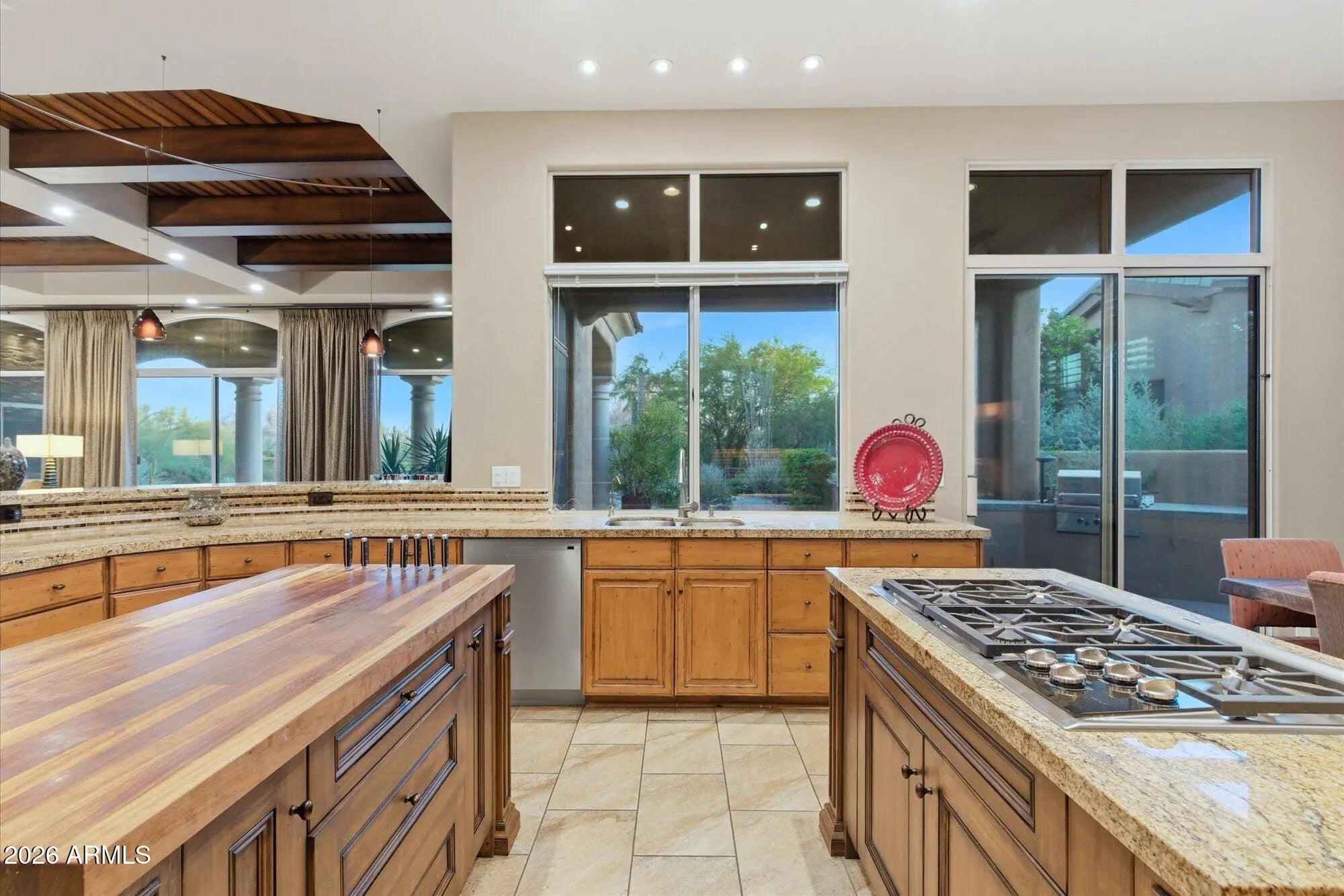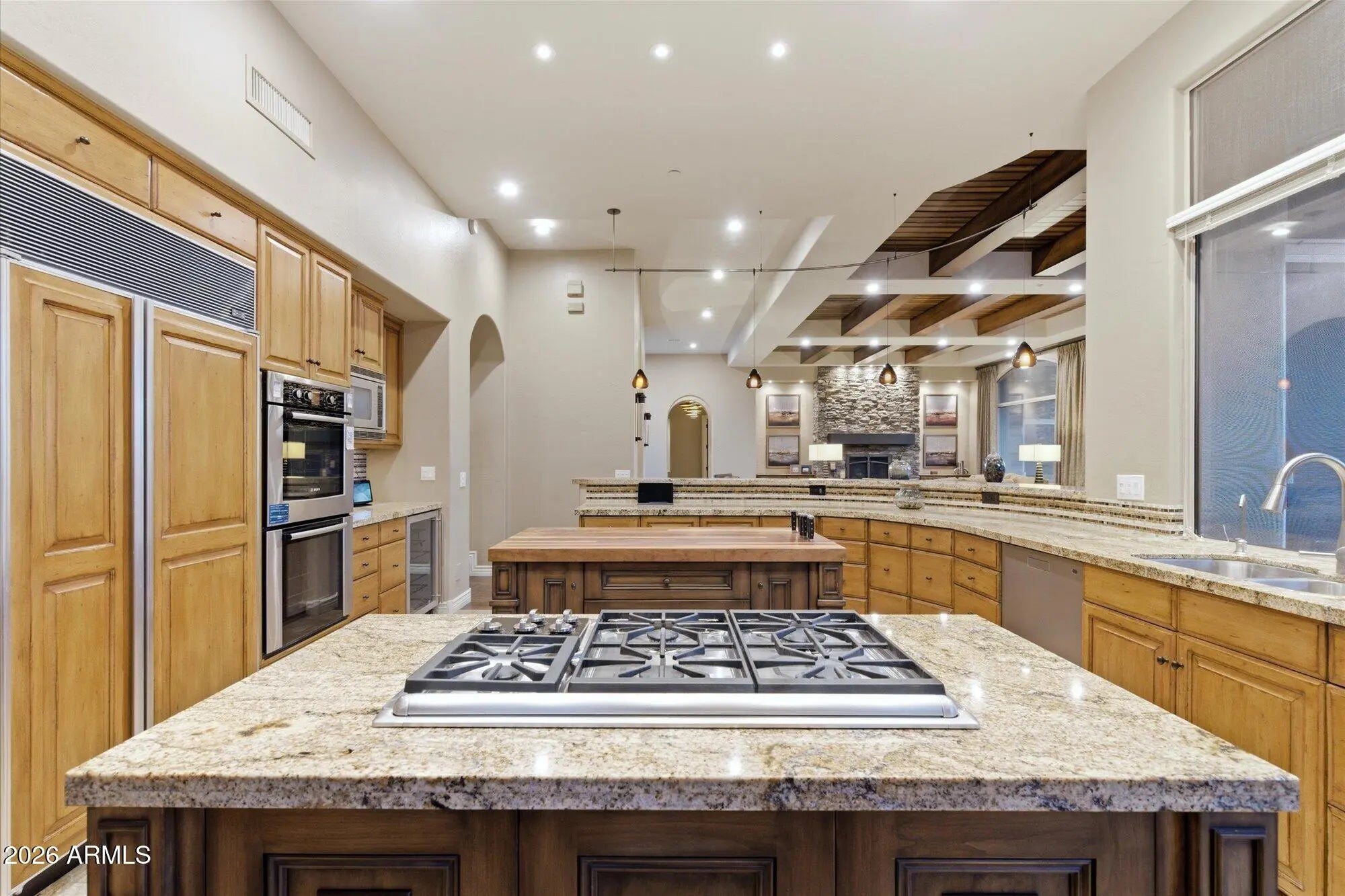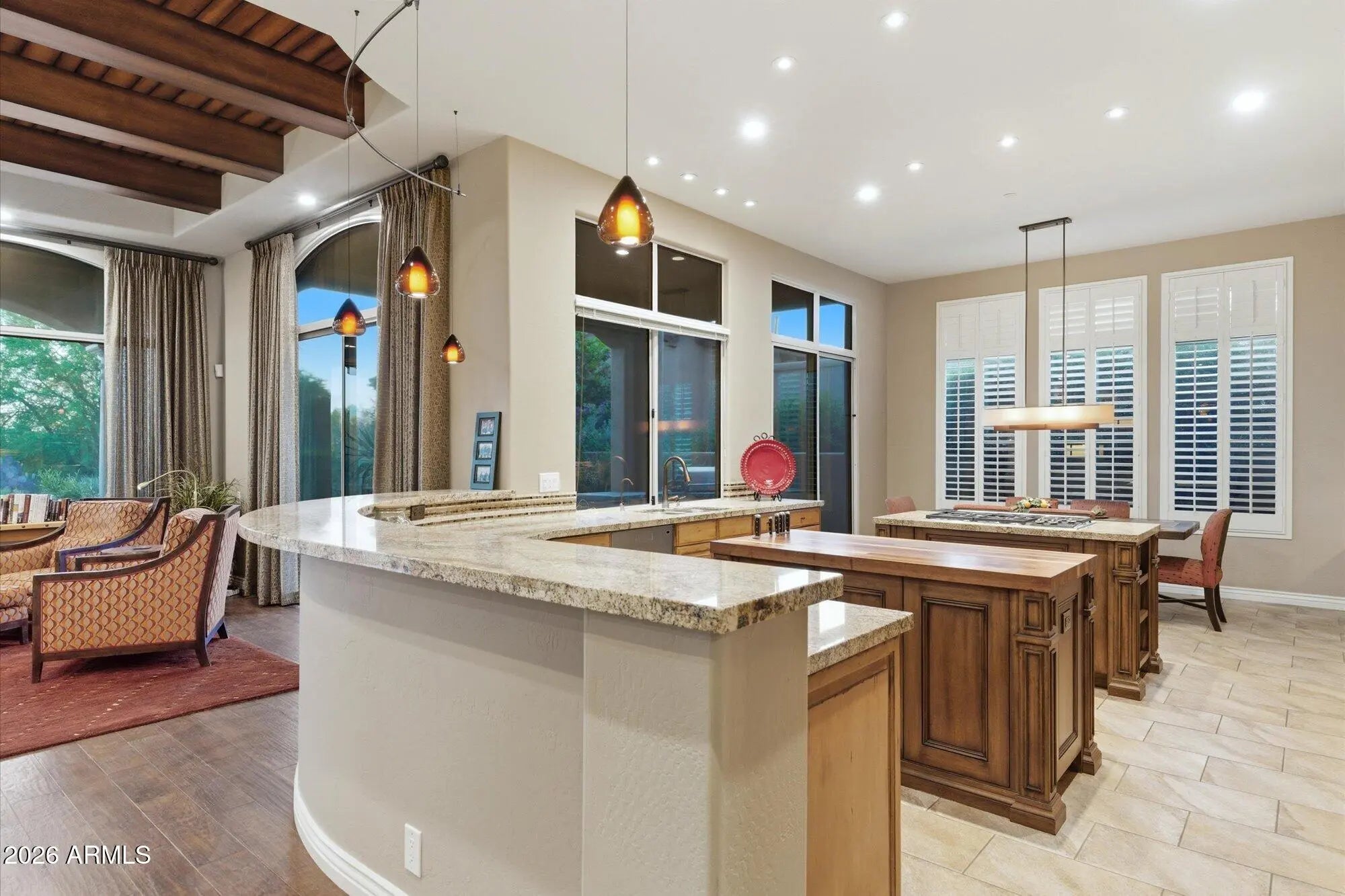 One of the best streets in DC Ranch! This 4 bedroom home has a detached casita, timeless character and warm, classic tones. Professionally designed features like limestone & hand-scraped distressed hardwood flooring, custom marble & French limestone countertops, coffered & wood-beamed ceilings, surround sound, and 3 gas fireplaces. Situated on a unique pie-shaped corner lot with soft curves, this home features two inviting backyards: a private pool oasis courtyard with heated pebble-tec pool, spa, water feature, and stacked-stone gazebo, plus a wrap-around south-east facing backyard with all the benefits of golf course adjacency - complete privacy, breathtaking mountain views - without any golf balls. Boulder water feature feels like a resort. Close to DC Ranch Country Club too!