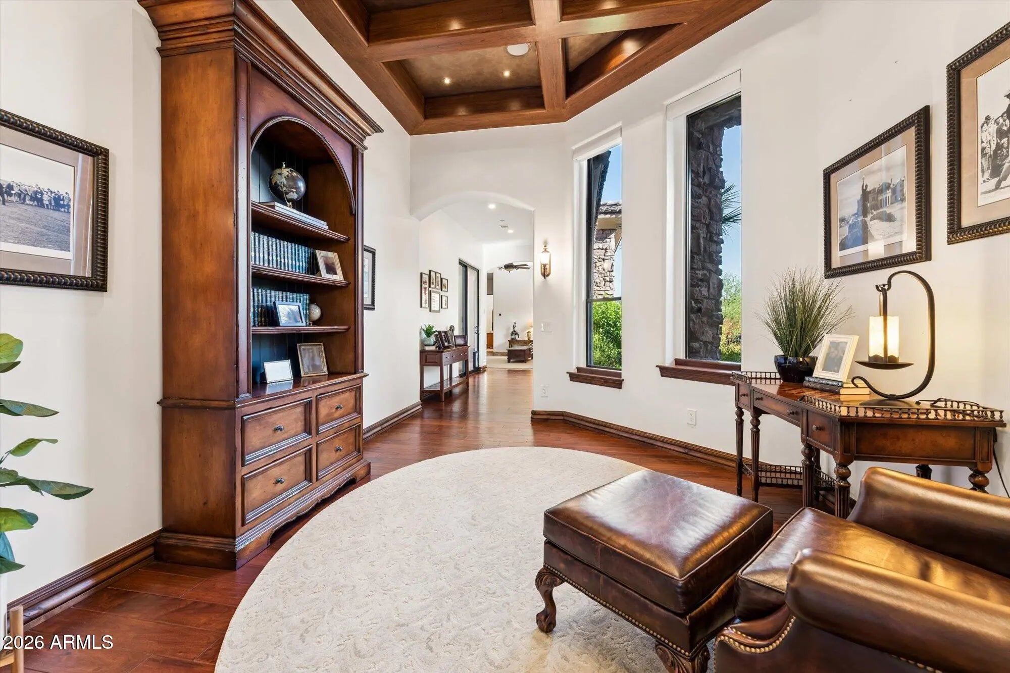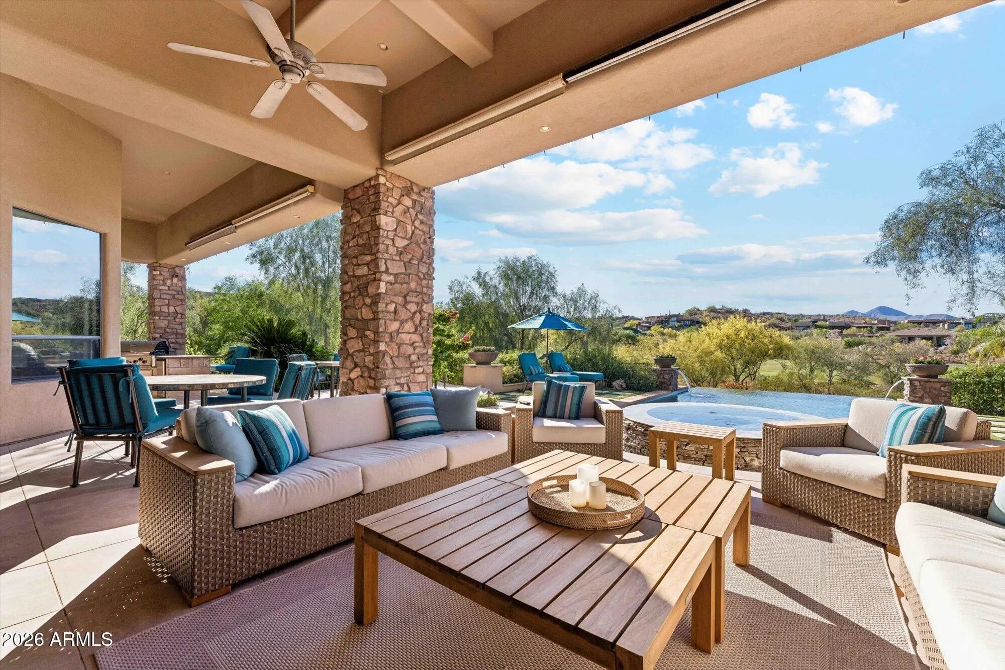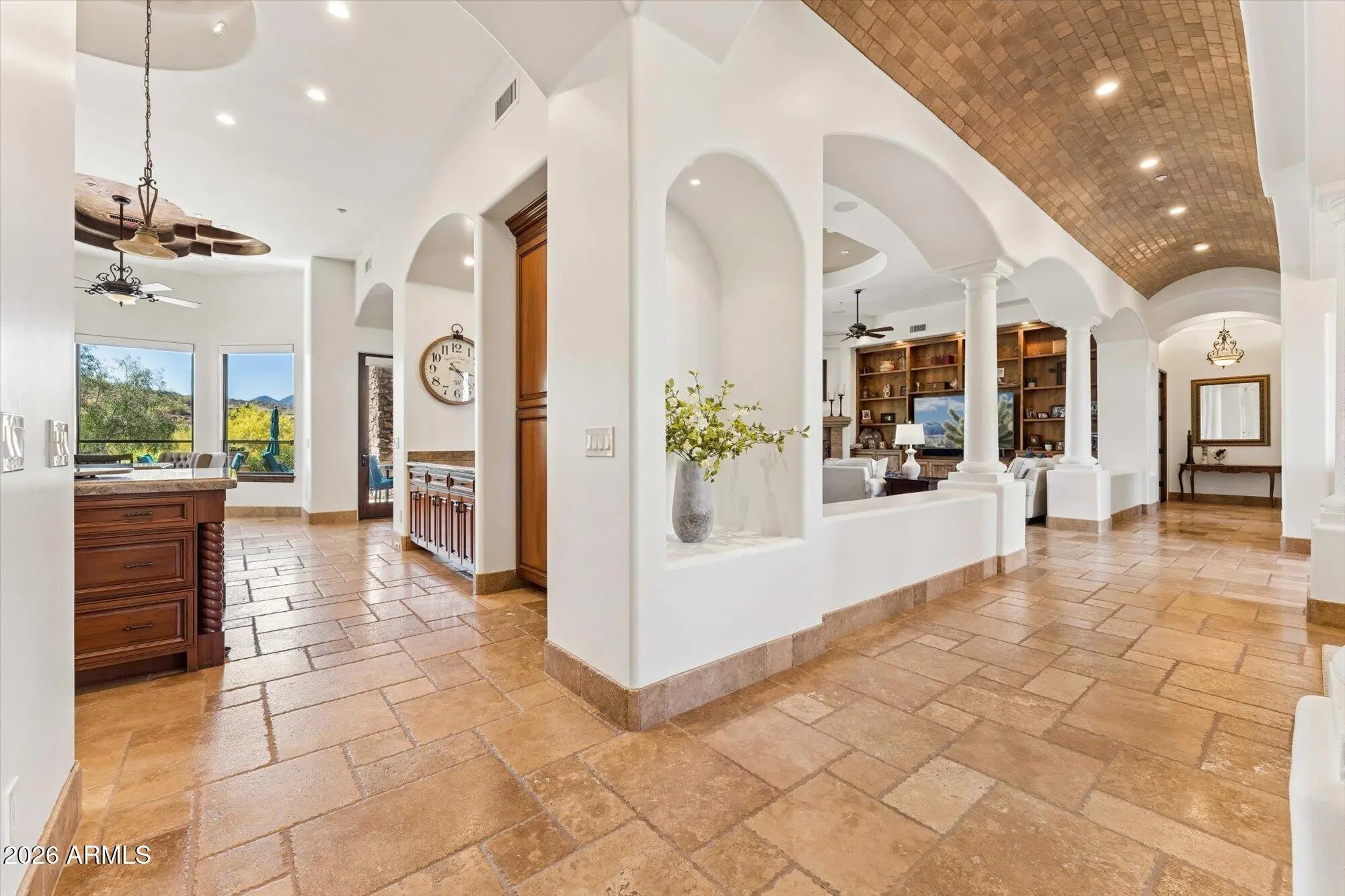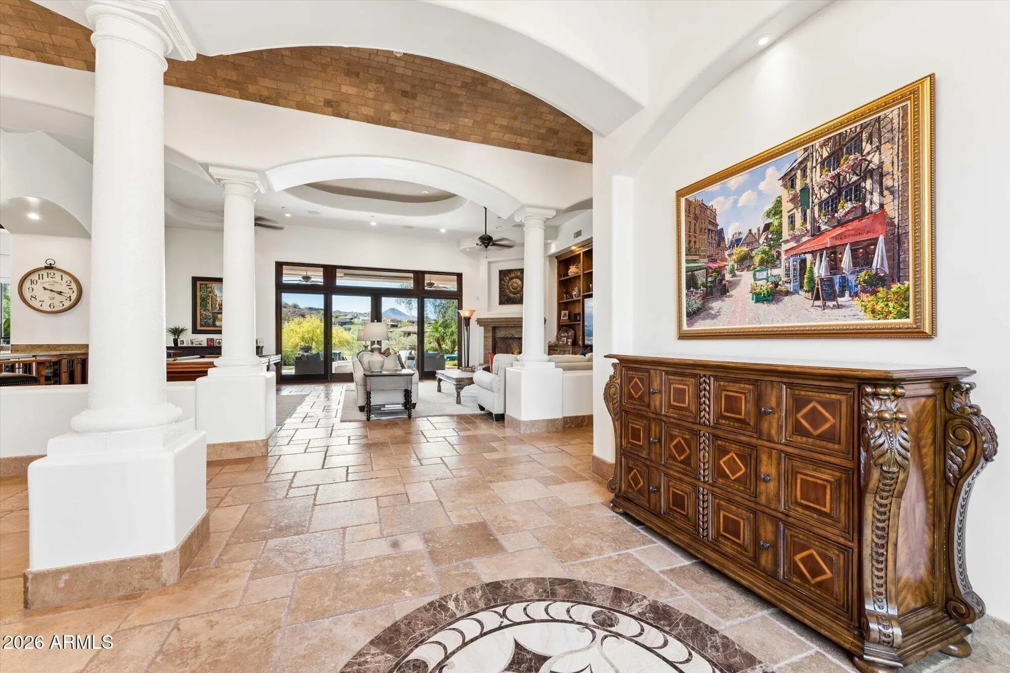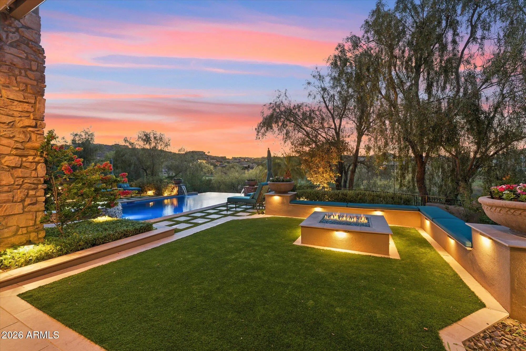Privately gated and gracefully positioned along the 14th fairway of Fire Rock Country Club, this home enjoys a premier golf course setting. This distinguished single-level residence embodies the privacy, elegance, and quiet grandeur that define luxury living in Fountain Hills. Surrounded by mountain views and designed without interior steps, the home balances impressive scale with a floor plan that feels both intimate and exceptionally functional. A refined interior unfolds through soaring ceilings, wood-framed windows, and beautifully selected finishes that lend warmth and permanence throughout. The living spaces are open yet intentional, designed to flow effortlessly from one room to the next and out to the resort-style backyard beyond. At the center of the home, the kitchen is both polished and practical, featuring custom cabinetry, granite countertops, a large prep island with sink, breakfast bar seating, Dacor appliances, a walk-in pantry, and a light-filled breakfast nook. Designed for effortless everyday living, the home is enhanced by a robust smart-home system that integrates Nest climate control, Lutron lighting, automated blinds, Sonos audio, MyQ garage access, Alexa and iPhone connectivity, and iAqualink control for the pool, spa, lighting, and water features. Four zoned HVAC systems, three gas water heaters with recirculation, central vacuum, and a climate-controlled garage further elevate comfort and efficiency throughout. The primary suite offers a luxurious sense of retreat, complete with wood flooring, a spacious bath with jetted tub and separate shower, dual vanities, a dedicated makeup station, and dual walk-in closets. Secondary en-suite bedrooms, a private office, and a reimagined attached guest wing add versatility without compromise. Originally conceived with a detached casita, the home has since been thoughtfully reconfigured by enclosing the breezeway, creating guest quarters that feel fully integrated into the main structure. A rare added amenity, the home also features a professionally designed indoor golf simulator, creating an exceptional at-home experience for practice, entertainment, and year-round enjoyment. Outside, a dramatic three-sided negative-edge pool and spa, artificial turf, expansive covered patio, built-in BBQ, gas fire pit, and cooling misters create a backyard designed for both relaxation and entertaining at the highest level. With its premier fairway setting, sophisticated appointments, and timeless appeal, this is a home of uncommon quality and distinction.