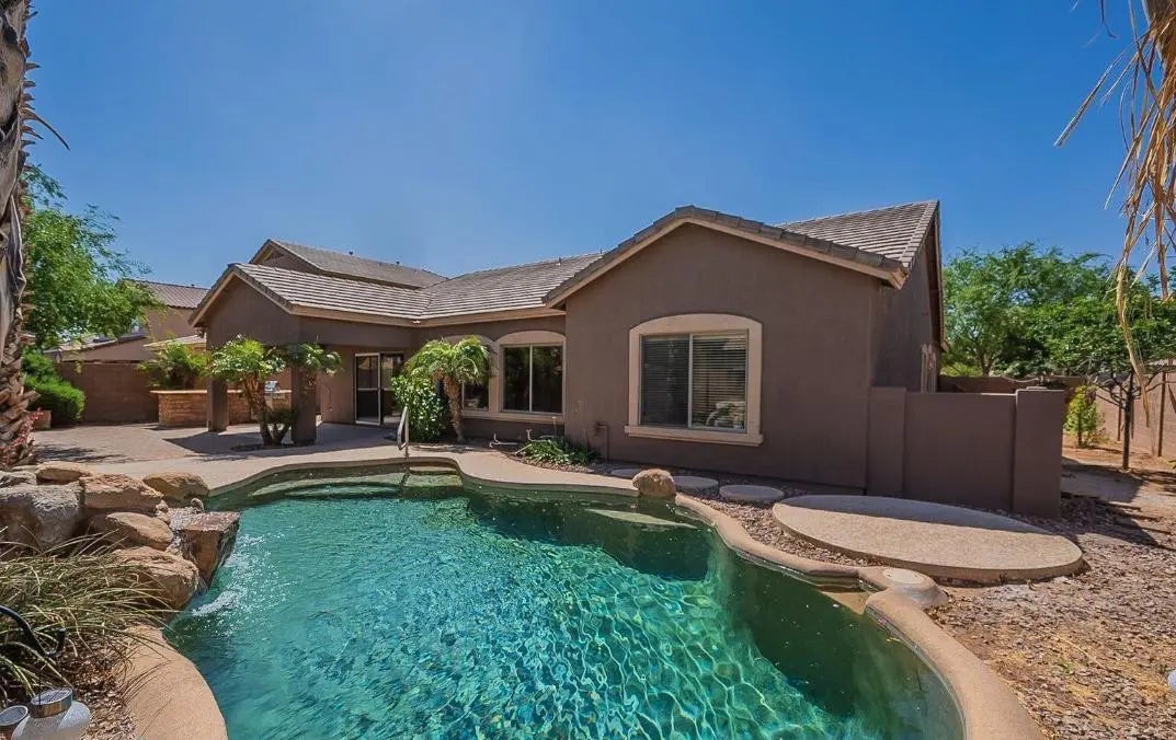 RENTAL AVAILABLE FOR MOVE IN ASAP. This 4 bed, 2 bath gem in Sun Groves is situated on a premium corner lot and is an entertainers dream! Enjoy AZ living in your private oasis which includes a covered patio, built-in-BBQ, outdoor wood burning fireplace and a custom, pebbletec pool. The inside does not disappoint with 2,396 sqft., huge master bedroom with TWO large walk-in-closets, ensuite bath with dual sinks, water closet & separate tub and shower. Fall in LOVE with your spacious kitchen with tons of upgraded maple cabinets, granite countertops, large walk-in pantry and a beautiful island overlooking your back patio and family room. This open concept home truly checks all the boxes!