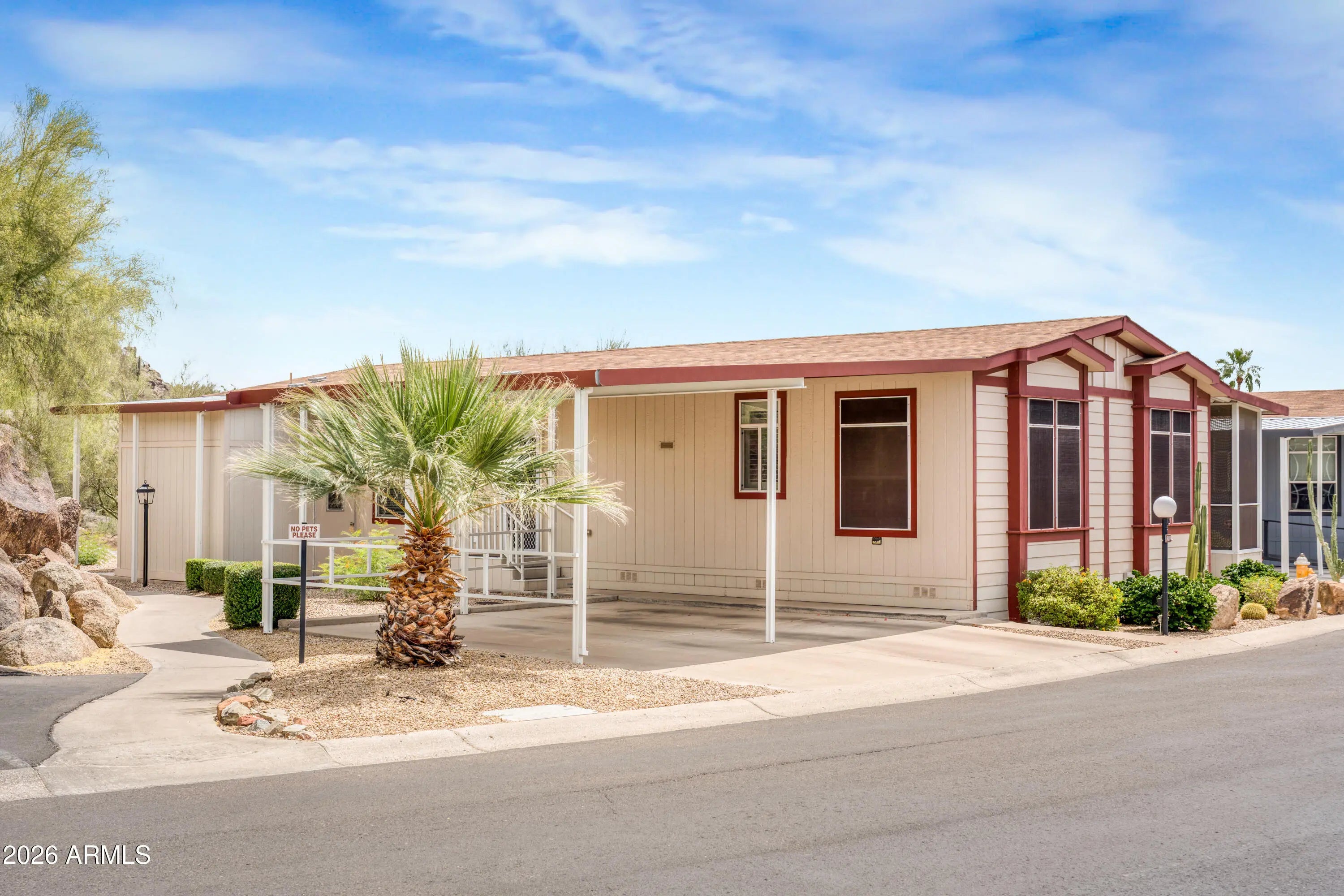 Beautiful 2015 Champion Home, 1,624 sq. ft., nestled beside natural boulders with a large screened-in patio and mountain views. Open great room with oversized island, upgraded cabinets with tall uppers, crown molding, and deep drawers. 3 bed, 2 bath with spacious layout. Primary suite features tray ceiling; third bedroom (ideal office/den) has private slider to porch. Side-by-side covered parking. Upgrades include new flooring, skylight tubes, plantation shutters, Toto toilet/bidet, replaced interior A/C system, whole-house water filtration, new water heater, and new microwave. Dining room light conveys. Short walk to pool and clubhouse. Buyer must be park approved: 750+ credit score, 3x lot rent in verifiable income, proof of savings equal to 6x lot rent, background check. Lot rent $1010 Beautiful 2015 Champion Home, 1,624 sq. ft., nestled beside natural boulders with a large screened-in patio and mountain views. Open great room with oversized island, upgraded cabinets with tall uppers, crown molding, and deep drawers. 3 bed, 2 bath with spacious layout. Primary suite features tray ceiling; third bedroom (ideal office/den) has private slider to porch. Side-by-side covered parking. Upgrades include new flooring, skylight tubes, plantation shutters, Toto toilet/bidet, replaced interior A/C system, whole-house water filtration, new water heater, and new microwave. Dining room light conveys. Short walk to pool and clubhouse.