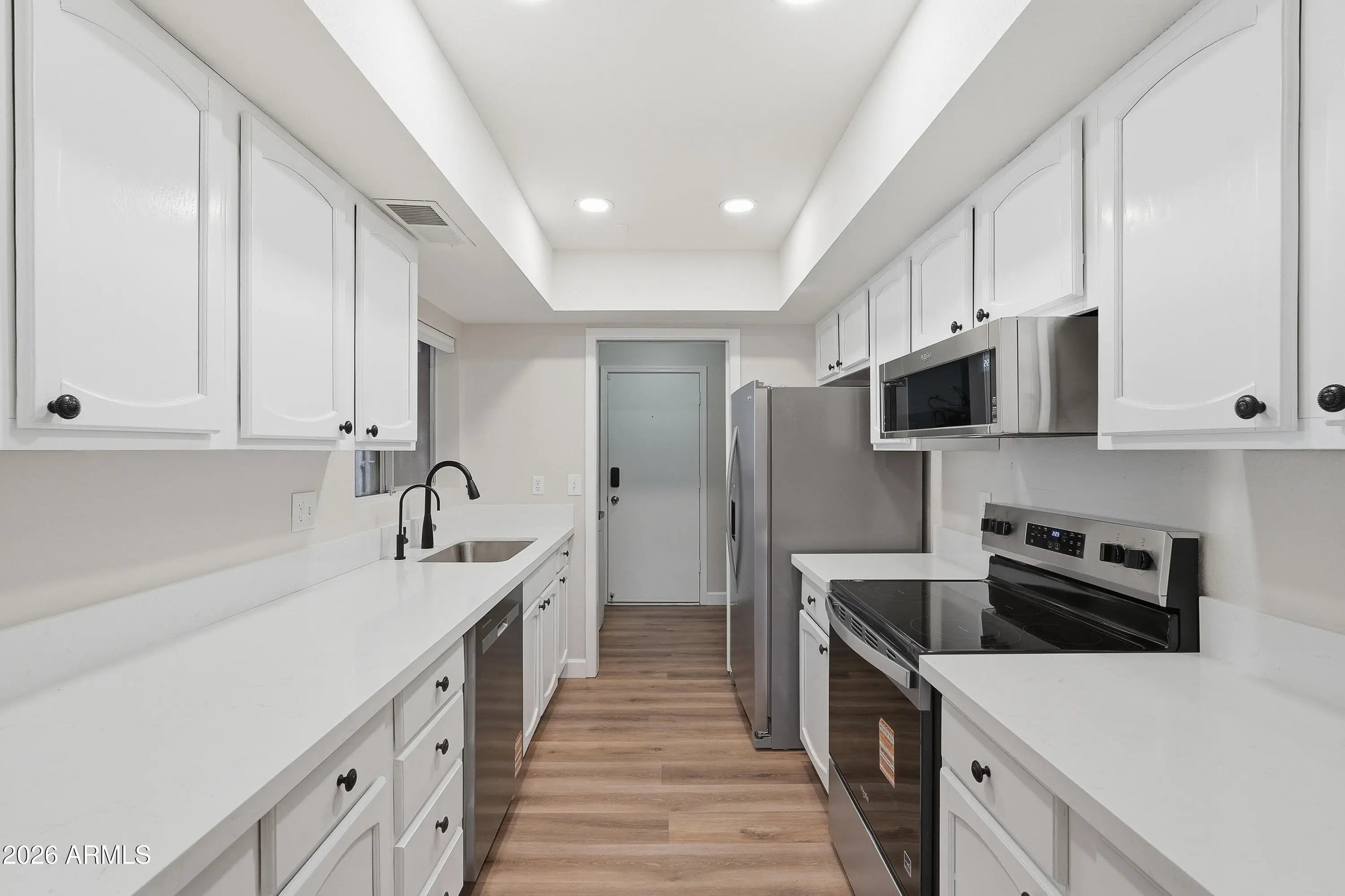 Peaceful Townhome community in North Phoenix with a Community Pool, Pickleball courts and Tennis Court! This 2 bedroom and 2 bathroom home was renovated in 2026 and is * Truly Move-In ready*. Kitchen is light and bright with quartz counters, New stainless Steel appliances including the refrigerator, new stainless sink and faucet. Updated LVP flooring throughout and NO carpet or steps! The open floor plan offers versatility for your own style to shine. Lovely French doors lead to private covered back patio and relaxation. Kitchen access to laundry/storage room with soft water system, leads directly into the 3-sided carport. Carport is large, providing parking for 2 vehicles AND has a storage area. This Townhome community has lush open space, top amenities with a tranquil, welcoming vibe!