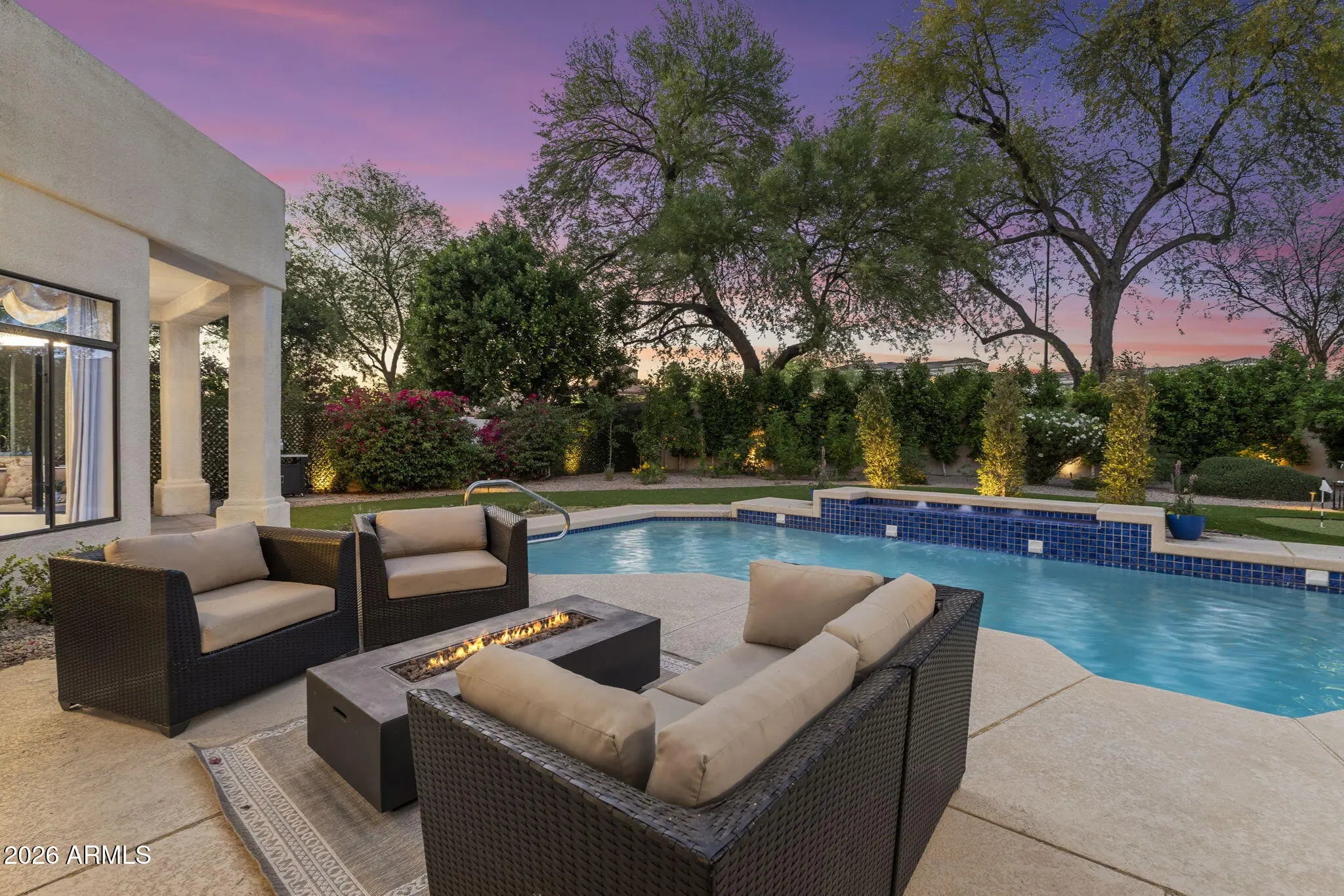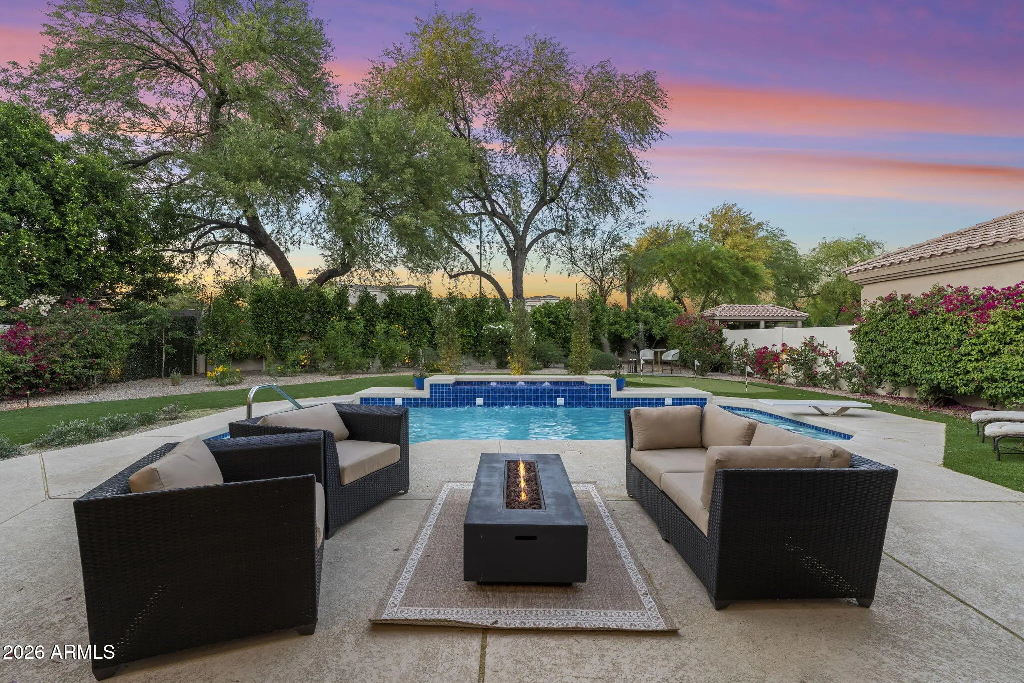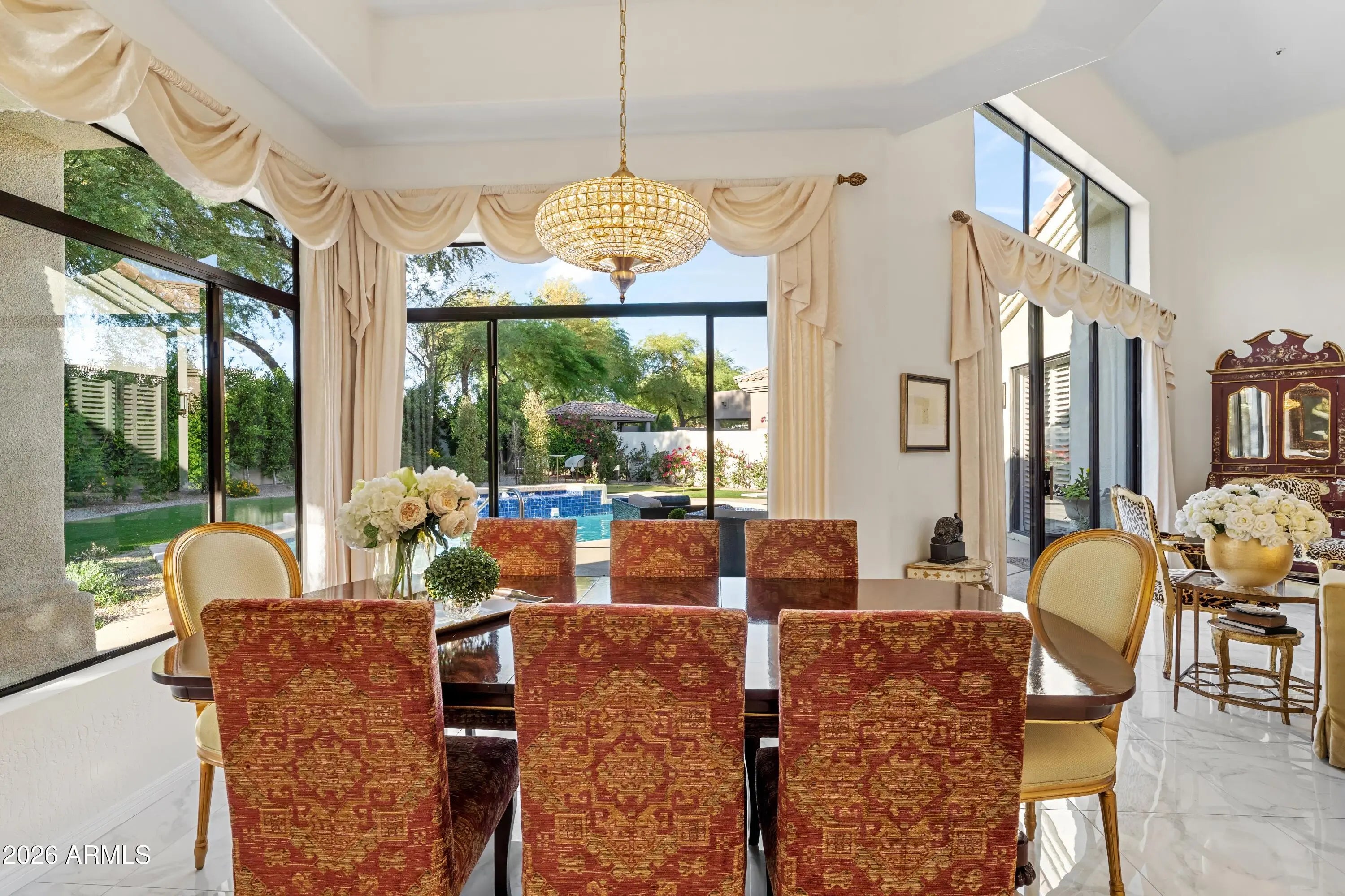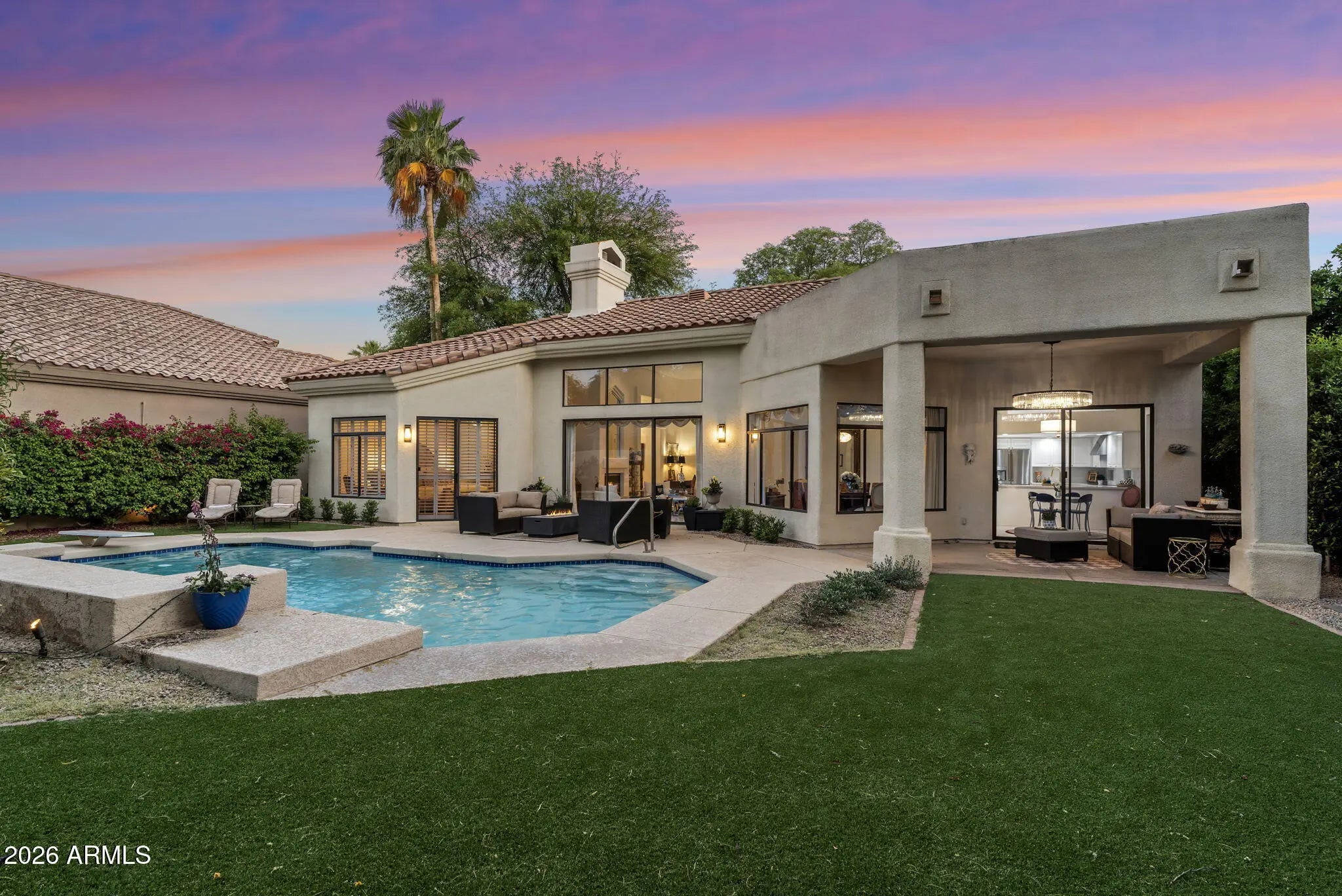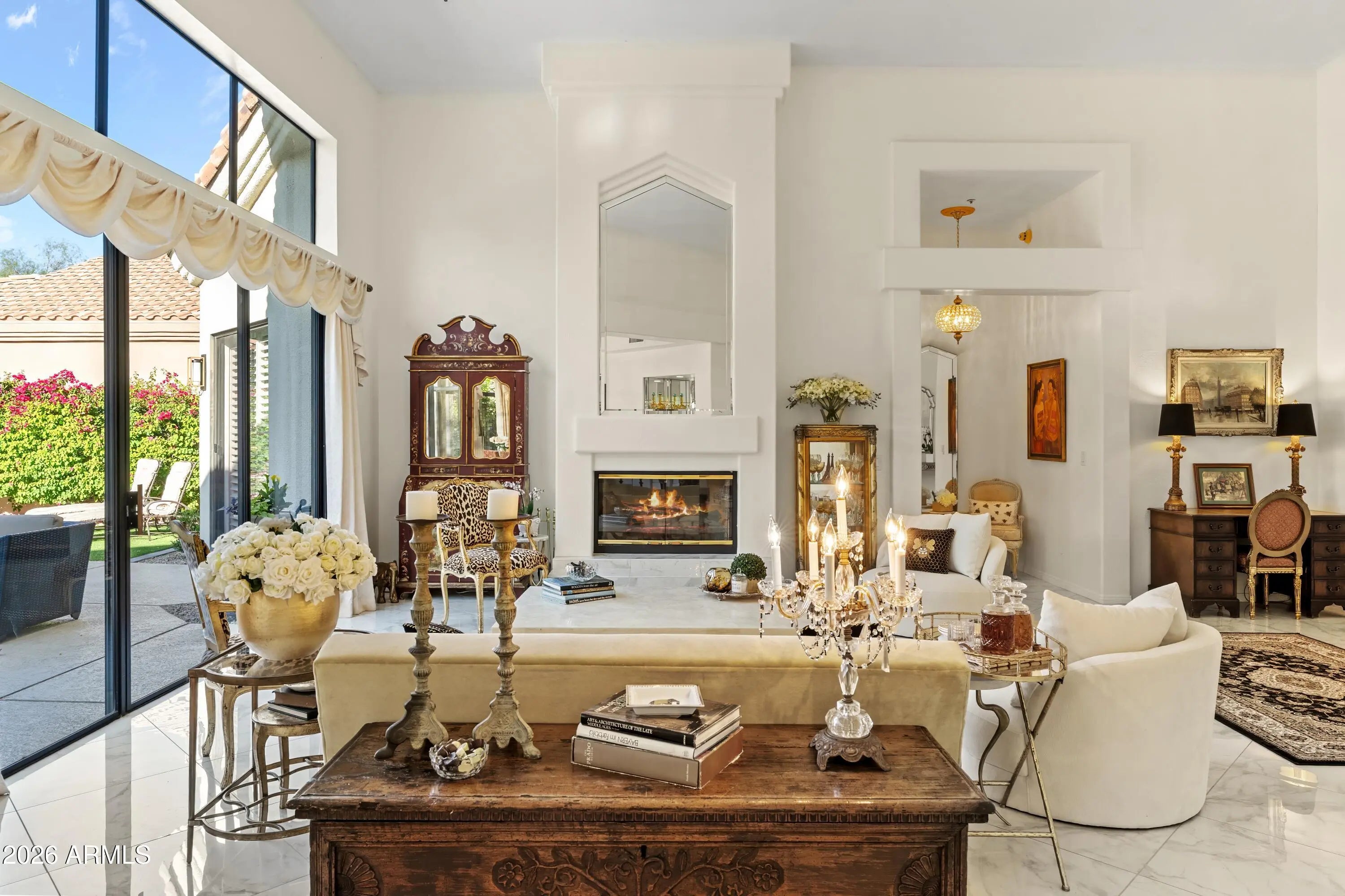 Welcome to 7374 E Onyx Ct, where refined luxury living meets thoughtful design in this meticulously reimagined single-level residence, situated on a serene cul-de-sac within the prestigious gated community of Monterey at Mountain View in Scottsdale, AZ 85258. This exceptional 3-bedroom, 3 bathroom home on nearly one-third acre offers unparalleled privacy and sophistication in central Scottsdale's most desirable enclave. Soaring 14-foot ceilings and abundant natural light define the open-concept great room and dining area, anchored by a striking fireplace that seamlessly transitions to an expansive covered patio. The layout creates effortless indoor-outdoor flow, ideal for sophisticated gatherings or tranquil evenings overlooking the lush gardens and sparkling saltwater pool. The chef-inspired kitchen showcases premium upgrades, including a professional Wolf electric range, GE Café WiFi-enabled smart appliances, designer countertops and fixtures, a walk-in pantry, and a casual breakfast nook with direct garden access for effortless alfresco meals. A custom bar featuring a handmade Mother of Pearl sink and champagne gold faucet adds a touch of glamour for memorable hosting. The serene primary suite, positioned to overlook the private backyard oasis, includes a spa-inspired ensuite bath with dual vanities, a deep soaking tub, and a glass-enclosed shower. Glamorous, adjustable lighting creates a photo-ready ambiance perfect for daily relaxation or preparing for special occasions. The split floor plan provides privacy with a guest bedroom featuring its own ensuite and a flexible third bedroom (ideal as a home office) served by a full bath. Additional highlights include a versatile laundry room adaptable for workspace, surrounded by natural light and mature landscaping with rosebushes, hibiscus, and a magnolia tree. Thoughtful upgrades throughout feature curated chandeliers, specialty lighting, fresh interior paint, and updated electrical wiring for immediate move-in readiness.Outside, resort-caliber amenities await: mature landscaping with LED lighting, privacy fencing and trellises, a saltwater pool, and a custom 3-hole putting green. The expansive covered patio is perfect for year-round outdoor dining and unwinding in complete seclusion. Residents enjoy exclusive community access to a pool, spa, and tennis courts, enhancing the lock-and-leave lifestyle. Nestled in the heart of Scottsdale, this turnkey property lies minutes from premier golf courses, fine dining, and upscale shopping at Kierland Commons and Scottsdale Quarter, plus convenient access to the Scottsdale Airpark and Loop 101. It resides in the acclaimed Scottsdale Unified "3 C's" school district: Cochise Elementary, Cocopah Middle, and Chaparral High. This impeccably maintained, single-story gem in a luxury gated community delivers the ultimate blend of privacy, elegance, and Scottsdale convenience for discerning primary residents or second-home buyers.