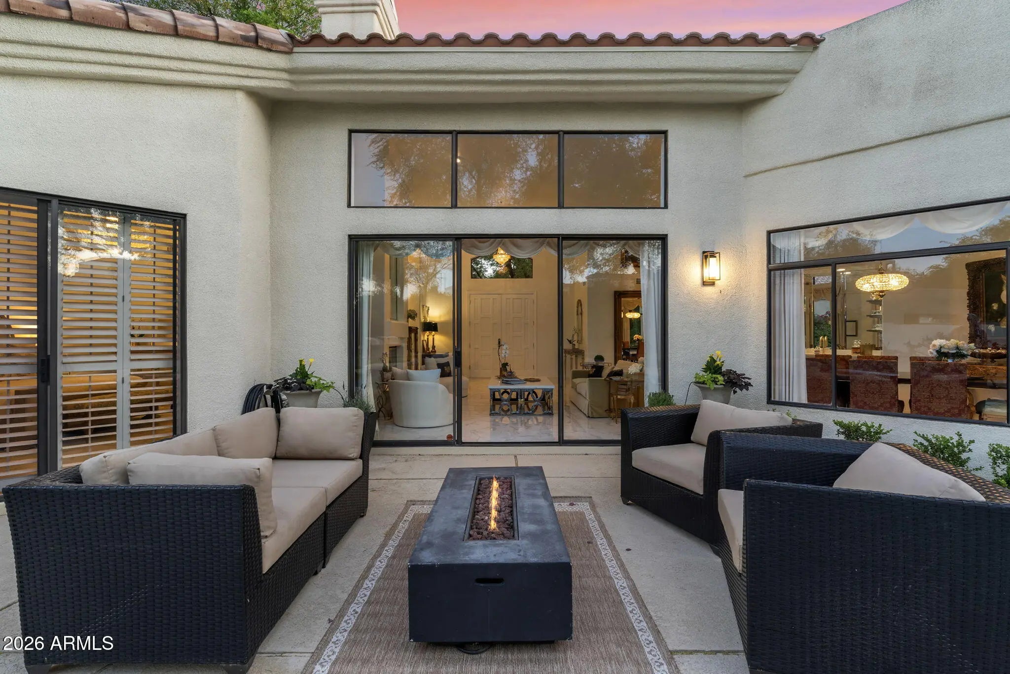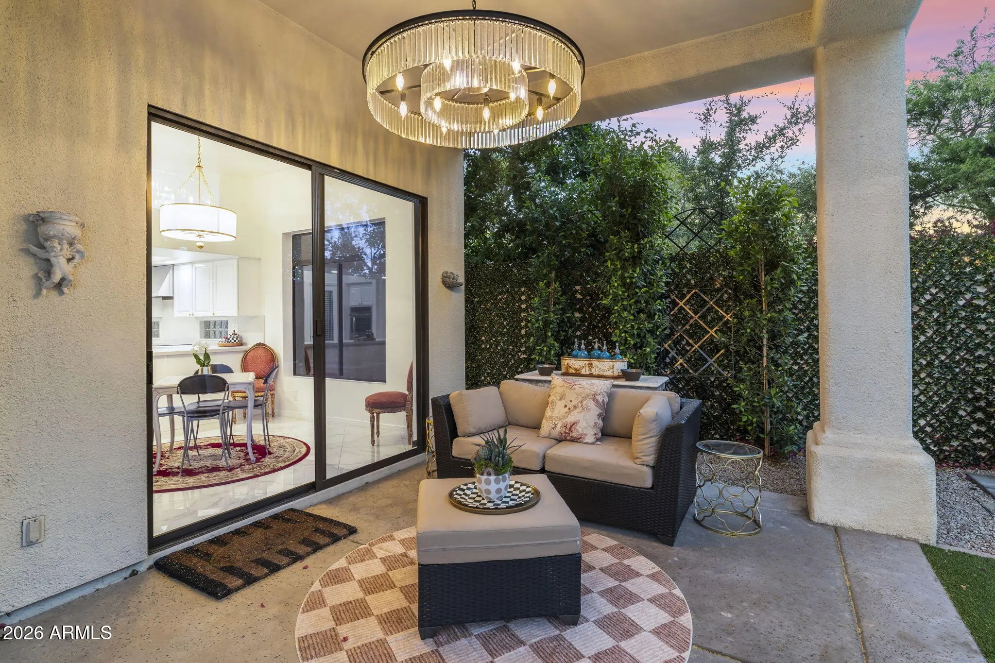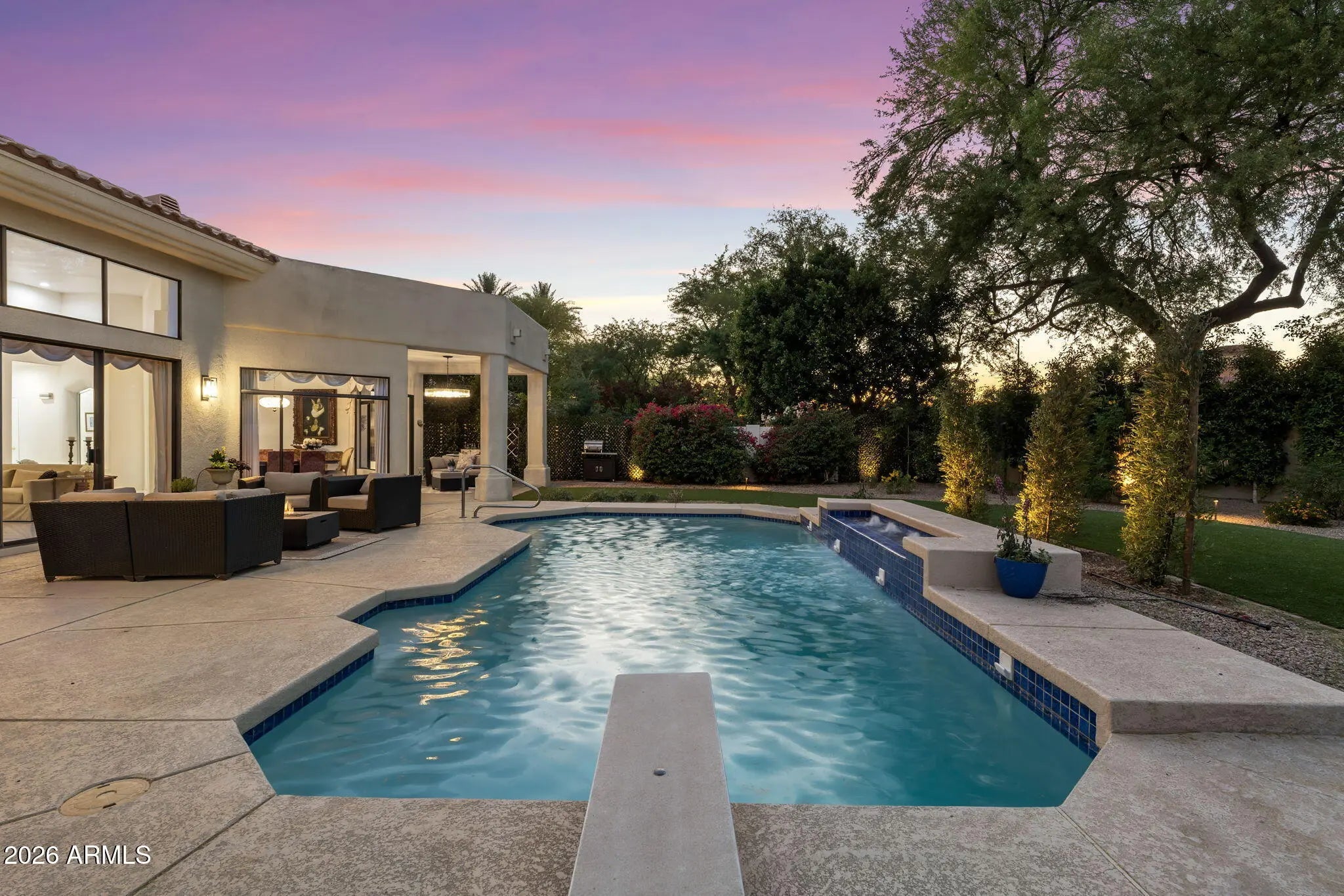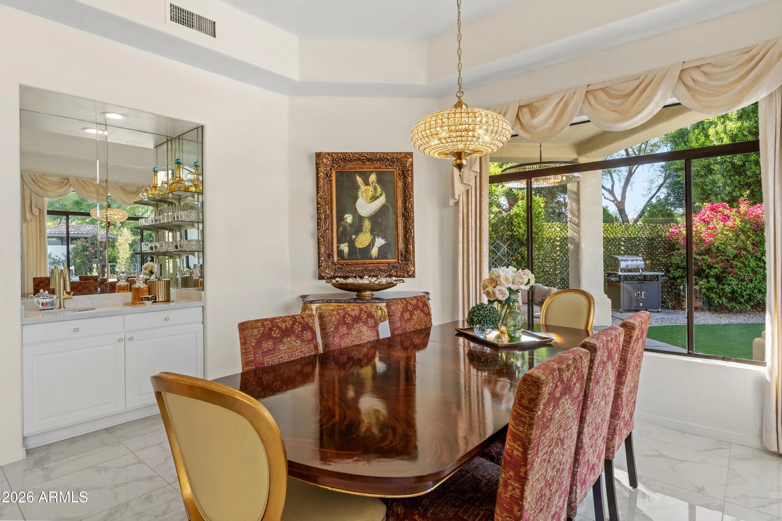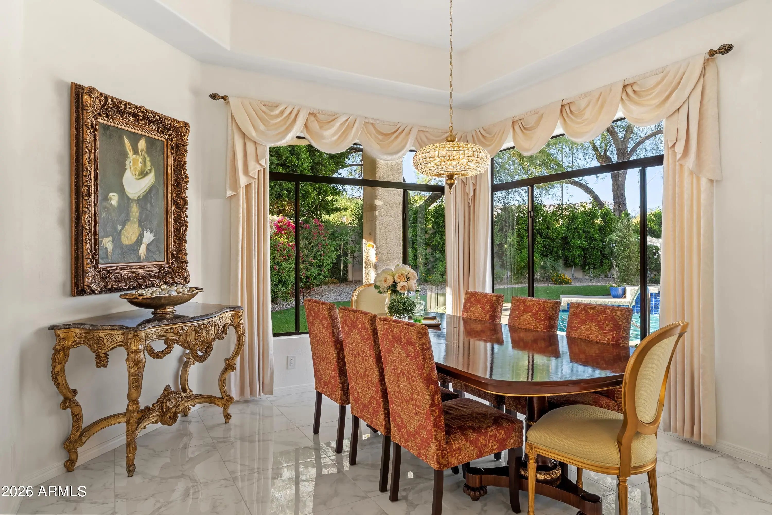 Welcome to 7374 E Onyx Ct, where refined luxury living meets thoughtful design in this meticulously reimagined single-level residence, situated on a serene cul-de-sac within the prestigious gated community of Monterey at Mountain View in Scottsdale, AZ 85258. This exceptional 3-bedroom, 3 bathroom home on nearly one-third acre offers unparalleled privacy and sophistication in central Scottsdale's most desirable enclave. Soaring 14-foot ceilings and abundant natural light define the open-concept great room and dining area, anchored by a striking fireplace that seamlessly transitions to an expansive covered patio. The layout creates effortless indoor-outdoor flow, ideal for sophisticated gatherings or tranquil evenings overlooking the lush gardens and sparkling saltwater pool. The chef-inspired kitchen showcases premium upgrades, including a professional Wolf electric range, GE Café WiFi-enabled smart appliances, designer countertops and fixtures, a walk-in pantry, and a casual breakfast nook with direct garden access for effortless alfresco meals. A custom bar featuring a handmade Mother of Pearl sink and champagne gold faucet adds a touch of glamour for memorable hosting. The serene primary suite, positioned to overlook the private backyard oasis, includes a spa-inspired ensuite bath with dual vanities, a deep soaking tub, and a glass-enclosed shower. Glamorous, adjustable lighting creates a photo-ready ambiance perfect for daily relaxation or preparing for special occasions. The split floor plan provides privacy with a guest bedroom featuring its own ensuite and a flexible third bedroom (ideal as a home office) served by a full bath. Additional highlights include a versatile laundry room adaptable for workspace, surrounded by natural light and mature landscaping with rosebushes, hibiscus, and a magnolia tree. Thoughtful upgrades throughout feature curated chandeliers, specialty lighting, fresh interior paint, and updated electrical wiring for immediate move-in readiness.Outside, resort-caliber amenities await: mature landscaping with LED lighting, privacy fencing and trellises, a saltwater pool, and a custom 3-hole putting green. The expansive covered patio is perfect for year-round outdoor dining and unwinding in complete seclusion. Residents enjoy exclusive community access to a pool, spa, and tennis courts, enhancing the lock-and-leave lifestyle. Nestled in the heart of Scottsdale, this turnkey property lies minutes from premier golf courses, fine dining, and upscale shopping at Kierland Commons and Scottsdale Quarter, plus convenient access to the Scottsdale Airpark and Loop 101. It resides in the acclaimed Scottsdale Unified "3 C's" school district: Cochise Elementary, Cocopah Middle, and Chaparral High. This impeccably maintained, single-story gem in a luxury gated community delivers the ultimate blend of privacy, elegance, and Scottsdale convenience for discerning primary residents or second-home buyers.