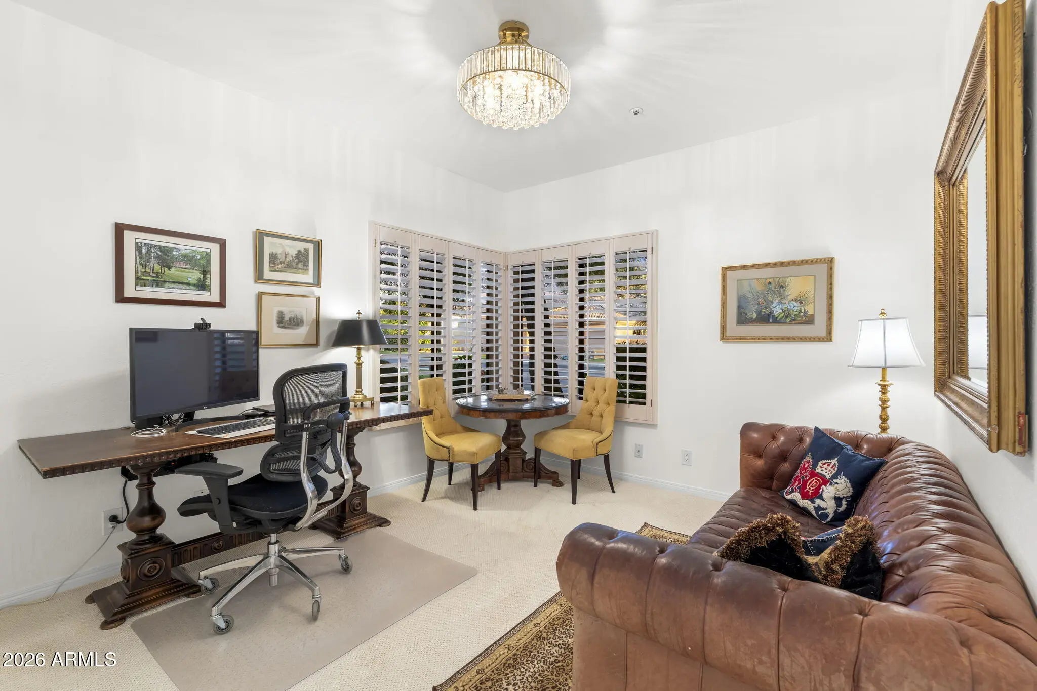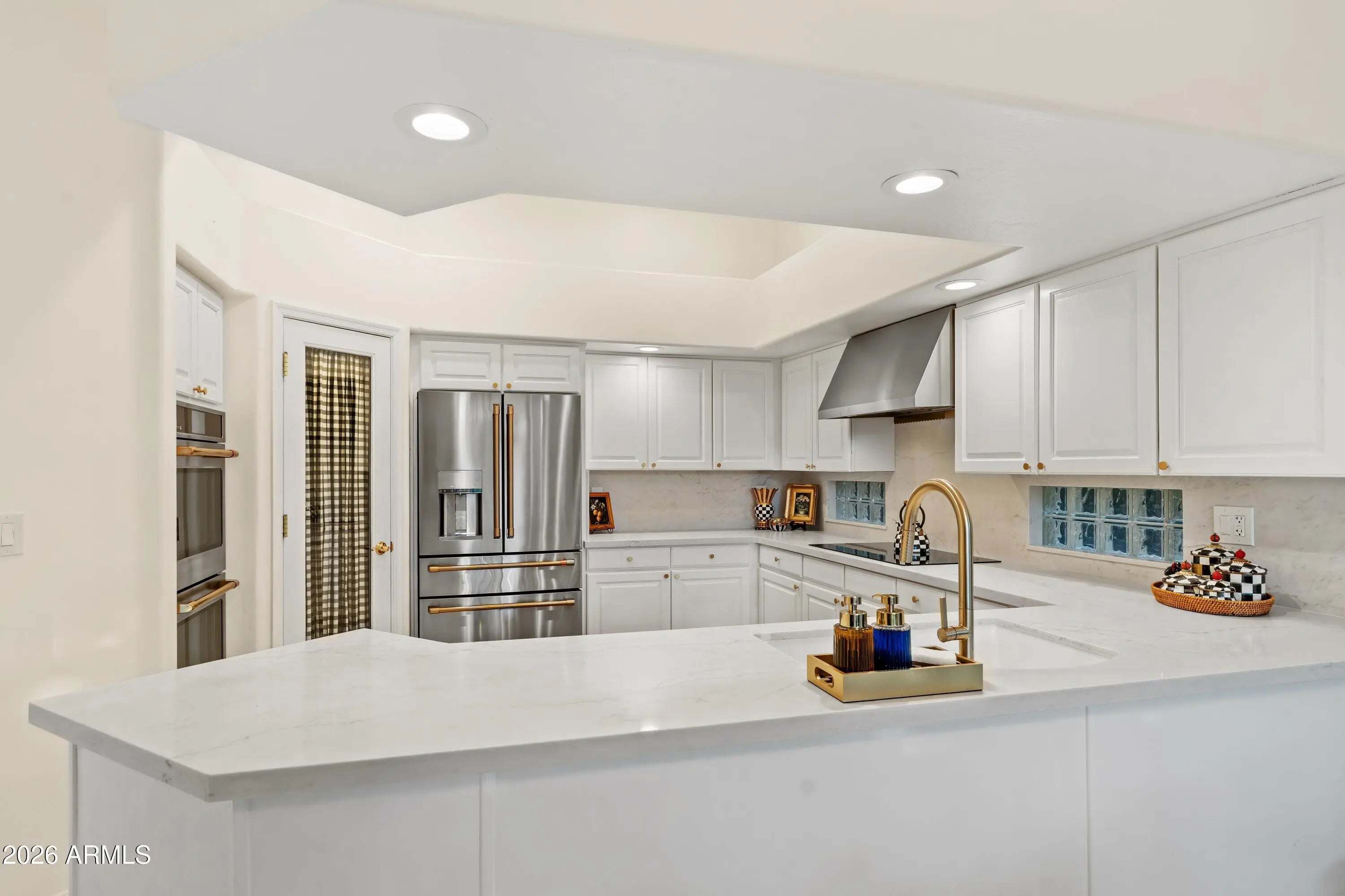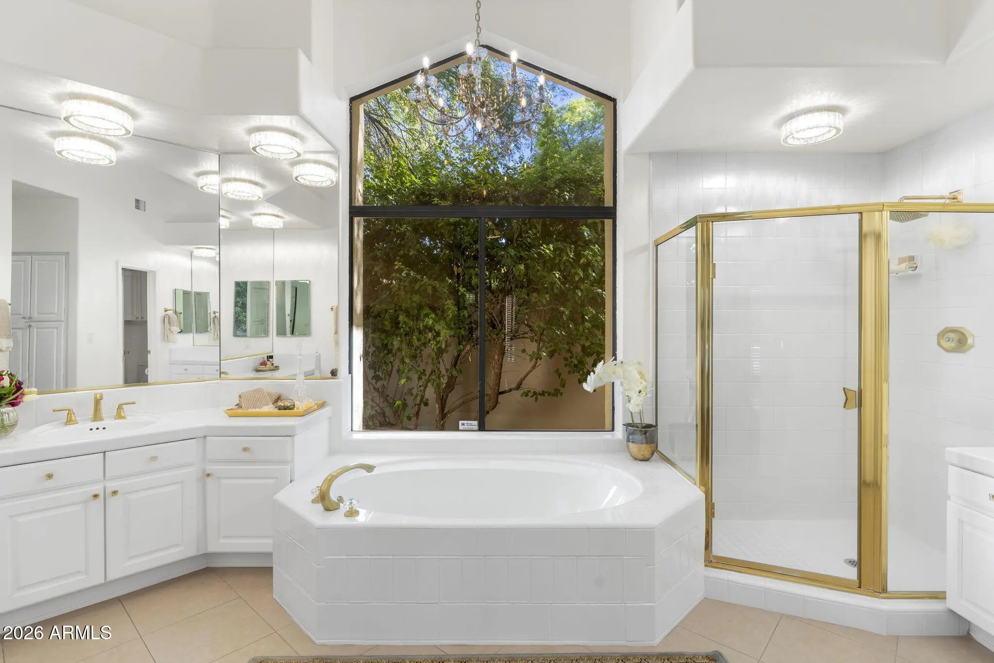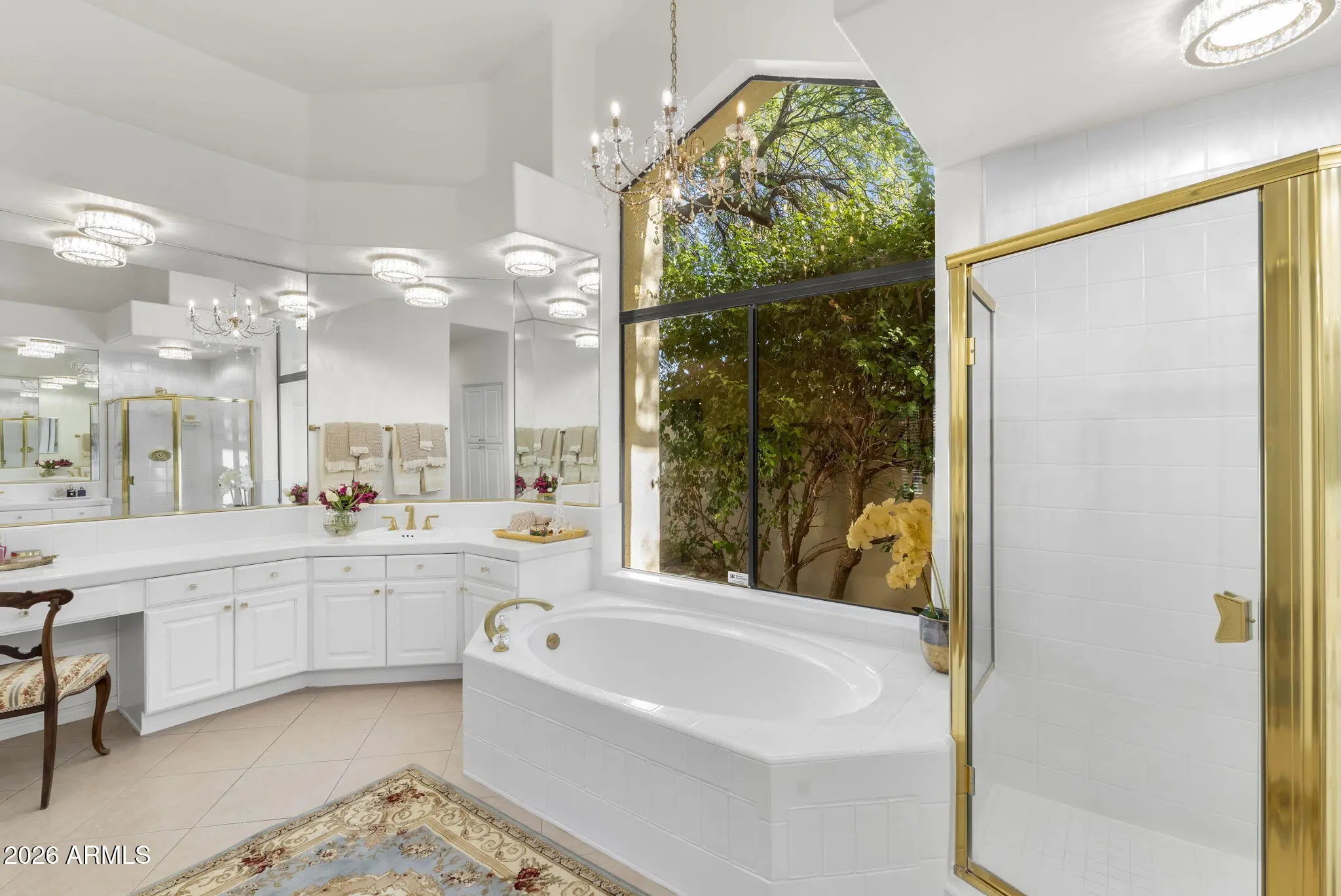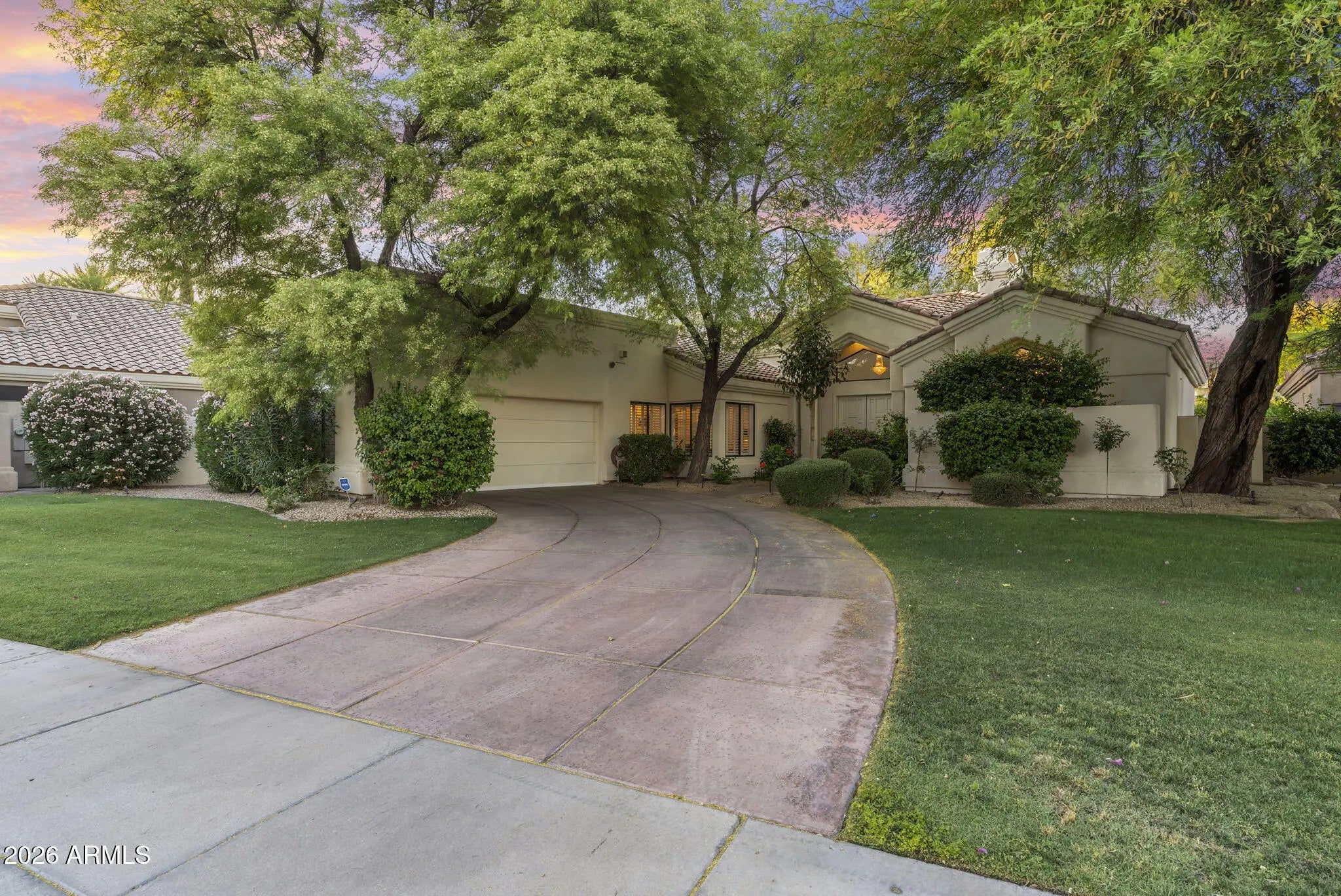 Welcome to 7374 E Onyx Ct, where refined luxury living meets thoughtful design in this meticulously reimagined single-level residence, situated on a serene cul-de-sac within the prestigious gated community of Monterey at Mountain View in Scottsdale, AZ 85258. This exceptional 3-bedroom, 3 bathroom home on nearly one-third acre offers unparalleled privacy and sophistication in central Scottsdale's most desirable enclave. Soaring 14-foot ceilings and abundant natural light define the open-concept great room and dining area, anchored by a striking fireplace that seamlessly transitions to an expansive covered patio. The layout creates effortless indoor-outdoor flow, ideal for sophisticated gatherings or tranquil evenings overlooking the lush gardens and sparkling saltwater pool. The chef-inspired kitchen showcases premium upgrades, including a professional Wolf electric range, GE Café WiFi-enabled smart appliances, designer countertops and fixtures, a walk-in pantry, and a casual breakfast nook with direct garden access for effortless alfresco meals. A custom bar featuring a handmade Mother of Pearl sink and champagne gold faucet adds a touch of glamour for memorable hosting. The serene primary suite, positioned to overlook the private backyard oasis, includes a spa-inspired ensuite bath with dual vanities, a deep soaking tub, and a glass-enclosed shower. Glamorous, adjustable lighting creates a photo-ready ambiance perfect for daily relaxation or preparing for special occasions. The split floor plan provides privacy with a guest bedroom featuring its own ensuite and a flexible third bedroom (ideal as a home office) served by a full bath. Additional highlights include a versatile laundry room adaptable for workspace, surrounded by natural light and mature landscaping with rosebushes, hibiscus, and a magnolia tree. Thoughtful upgrades throughout feature curated chandeliers, specialty lighting, fresh interior paint, and updated electrical wiring for immediate move-in readiness.Outside, resort-caliber amenities await: mature landscaping with LED lighting, privacy fencing and trellises, a saltwater pool, and a custom 3-hole putting green. The expansive covered patio is perfect for year-round outdoor dining and unwinding in complete seclusion. Residents enjoy exclusive community access to a pool, spa, and tennis courts, enhancing the lock-and-leave lifestyle. Nestled in the heart of Scottsdale, this turnkey property lies minutes from premier golf courses, fine dining, and upscale shopping at Kierland Commons and Scottsdale Quarter, plus convenient access to the Scottsdale Airpark and Loop 101. It resides in the acclaimed Scottsdale Unified "3 C's" school district: Cochise Elementary, Cocopah Middle, and Chaparral High. This impeccably maintained, single-story gem in a luxury gated community delivers the ultimate blend of privacy, elegance, and Scottsdale convenience for discerning primary residents or second-home buyers.