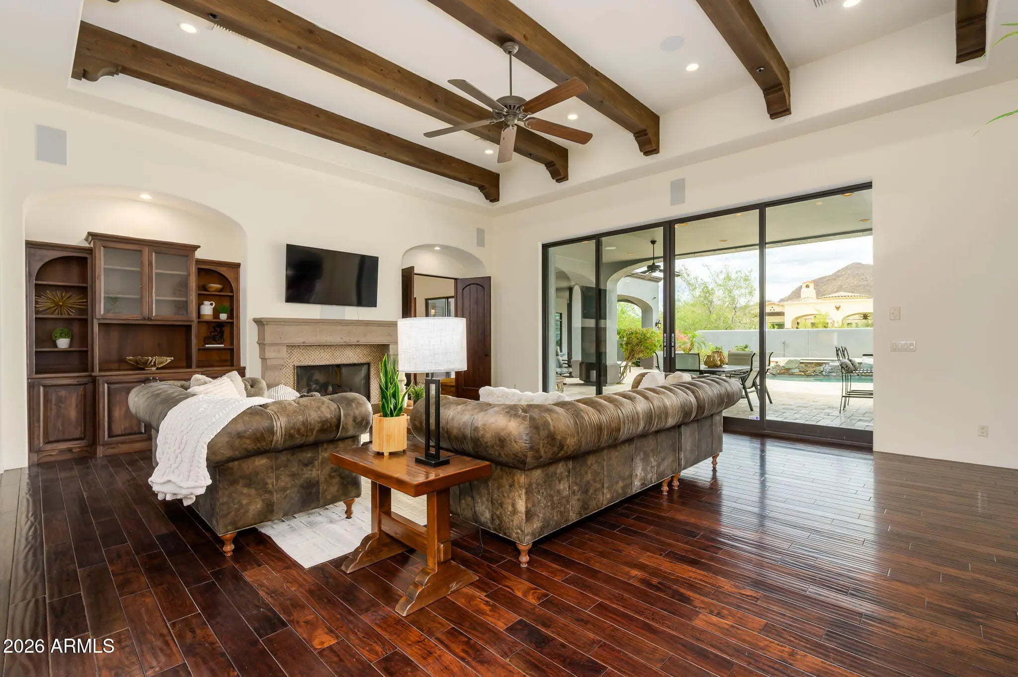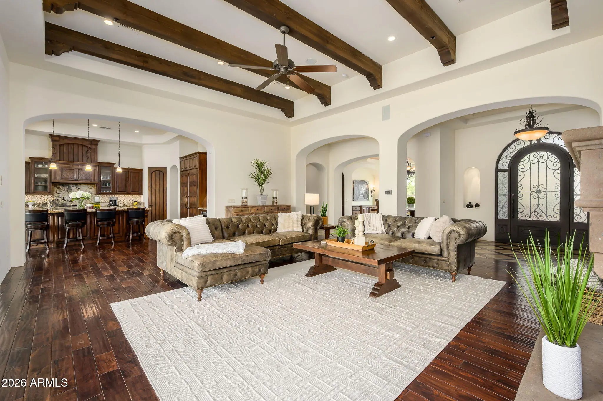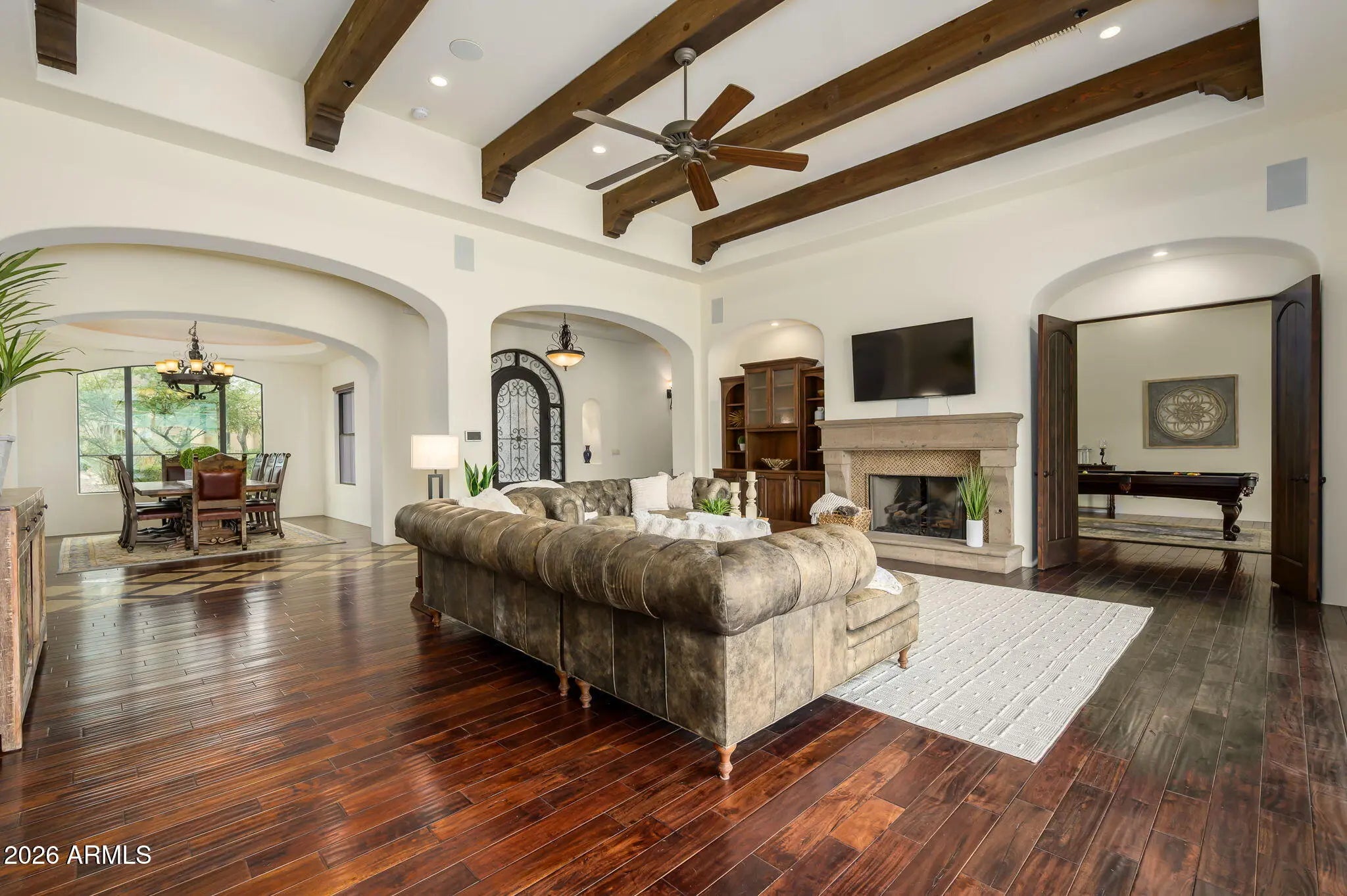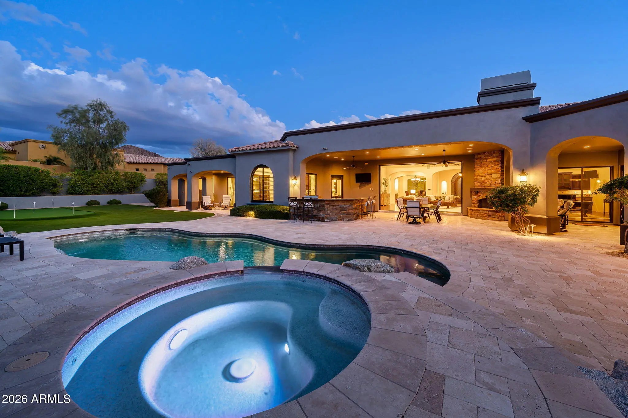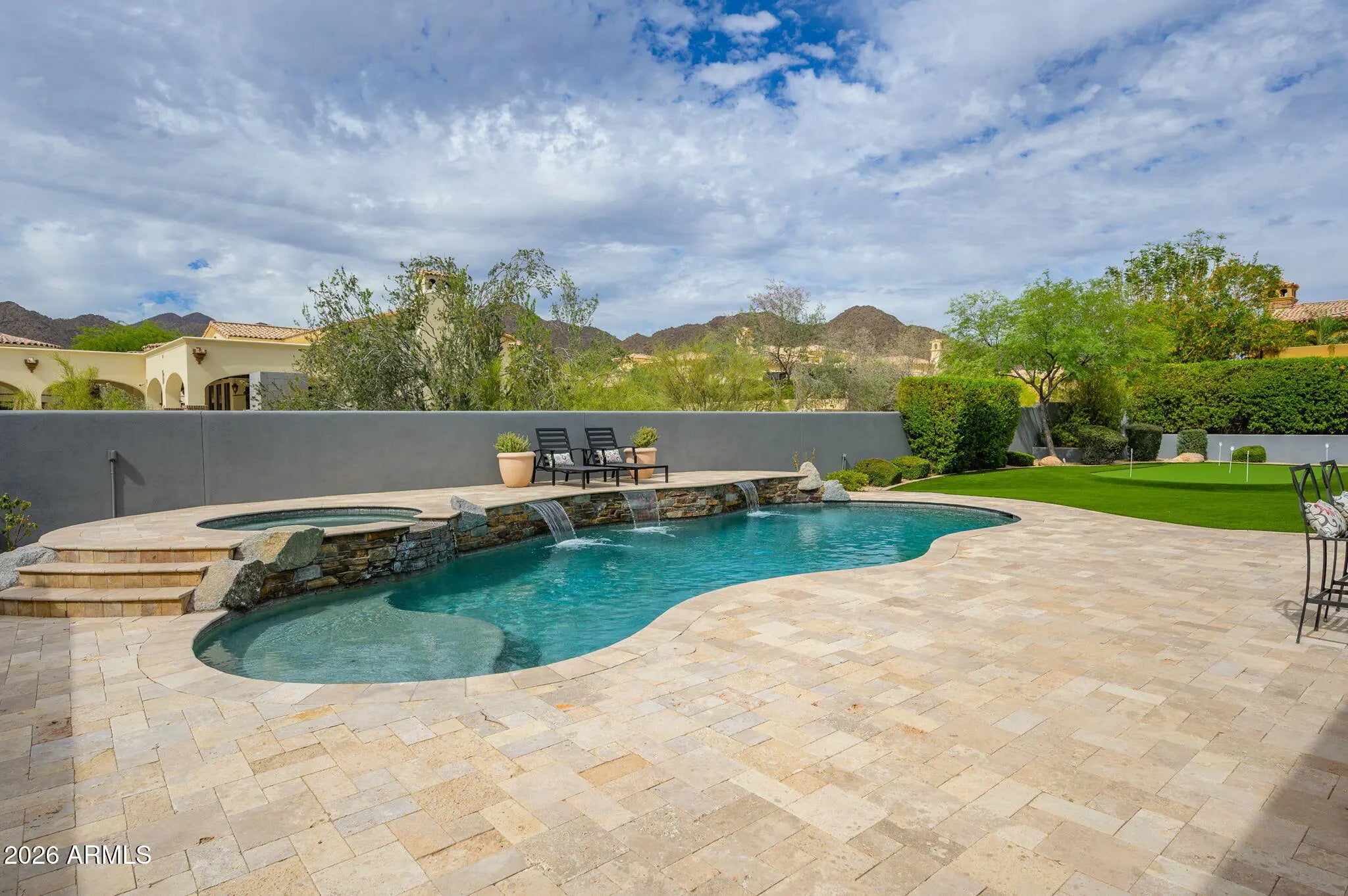 Experience refined desert living in this beautifully crafted residence set on an expansive lot within one of Scottsdale's premier gated enclaves. Hand-scraped acacia wood floors, wood-beam ceilings, and bespoke finishes create a warm, timeless backdrop throughout the home. The living room serves as the central gathering space, while the formal dining room is enhanced by a temperature-controlled wine room. A spacious game room with wet bar adds versatility, and each of the five ensuite bedrooms features its own designer bathroom. The primary bedroom retreat offers true serenity with a cozy fireplace, inviting sitting area, spa-like bathroom, and a huge custom closet. Newer AC units provide for multi-zone comfort, complemented by a new tankless water heater. Outdoor living feels like a private resort, with a large heated pool and spa, synthetic turf, and a putting green and an expansive covered patio with outdoor kitchen, misting system and fireplace--all framed by spectacular mountain and city-light views. A four-car garage with extra storage along with fresh interior and exterior paint complete this exceptional Scottsdale offering.