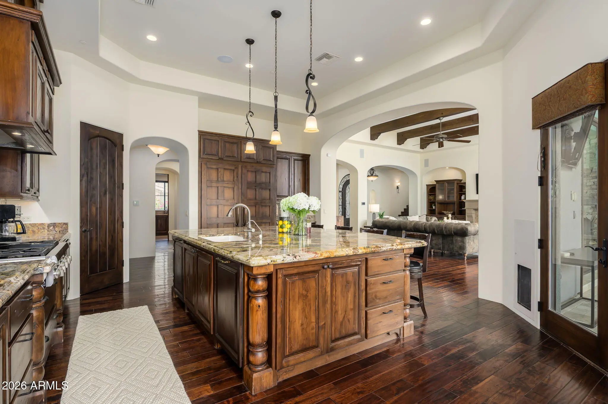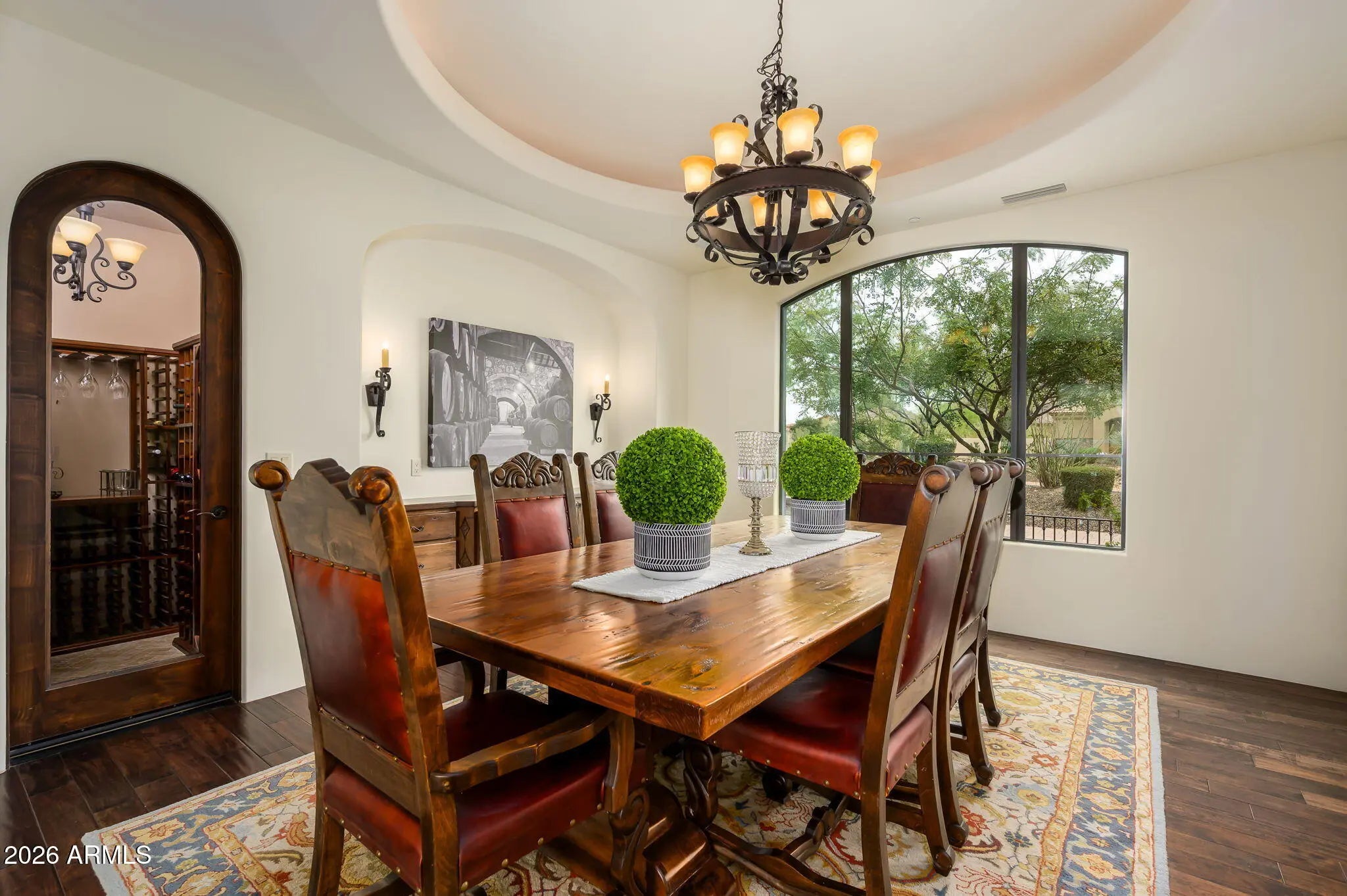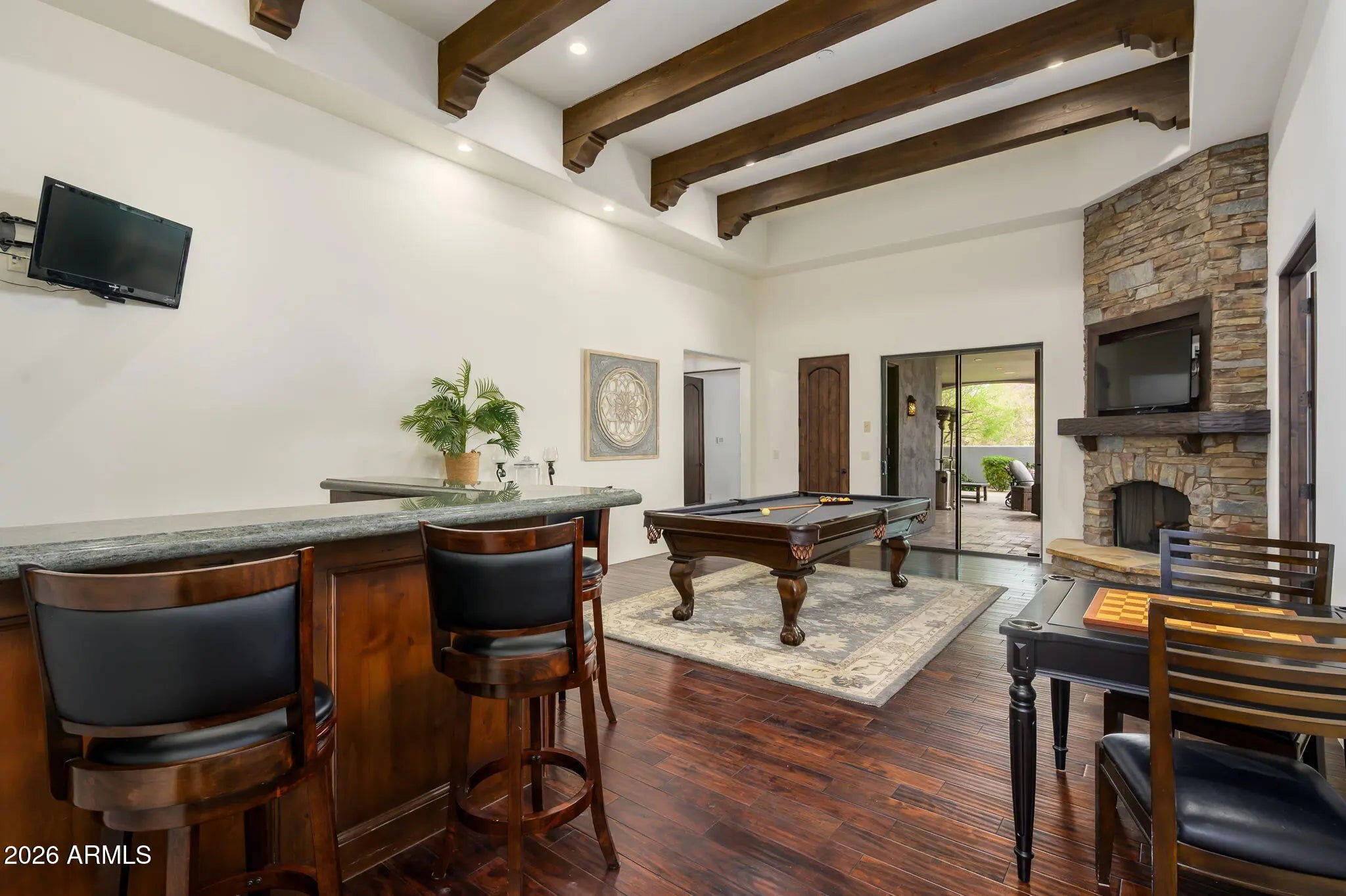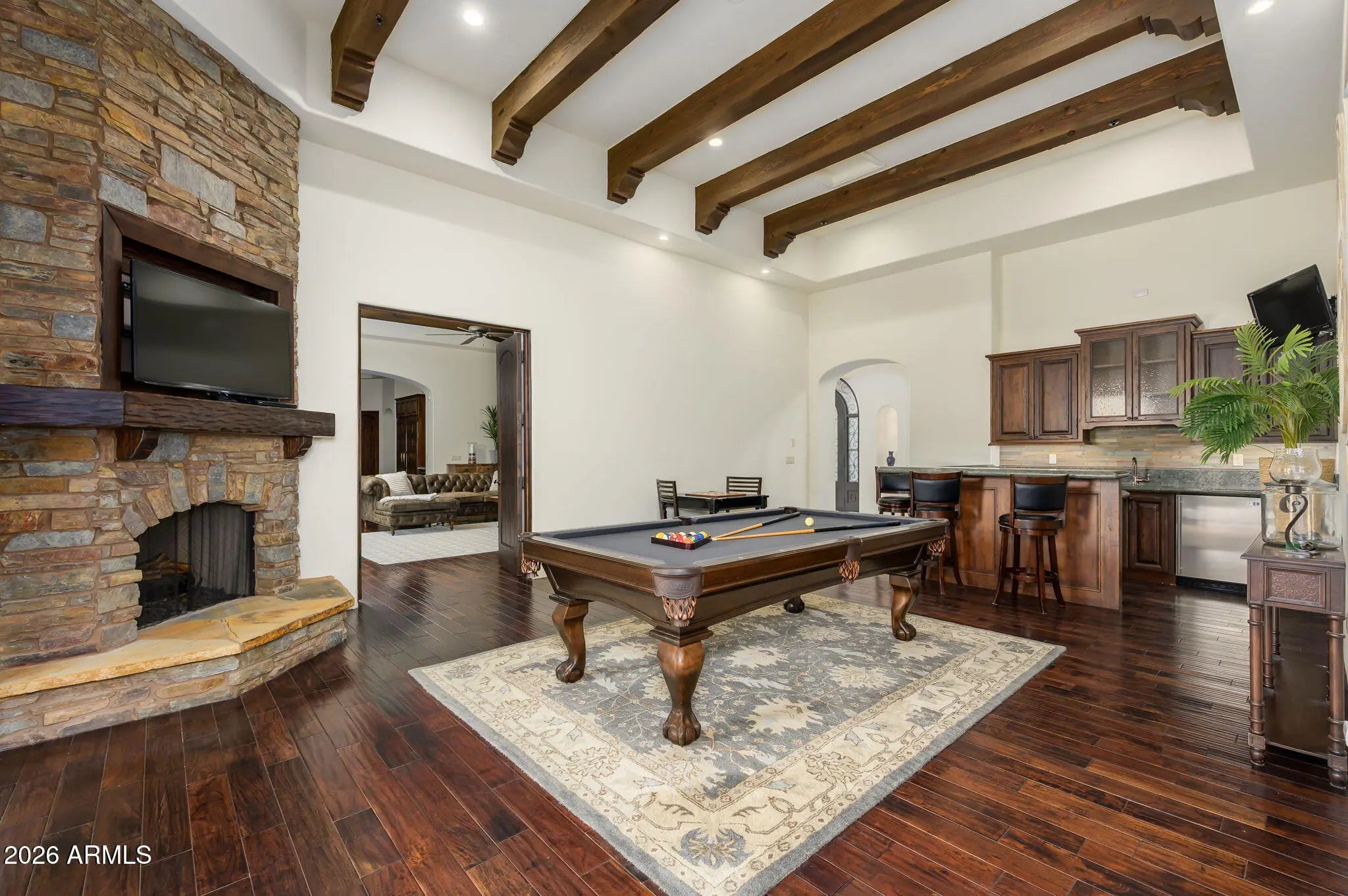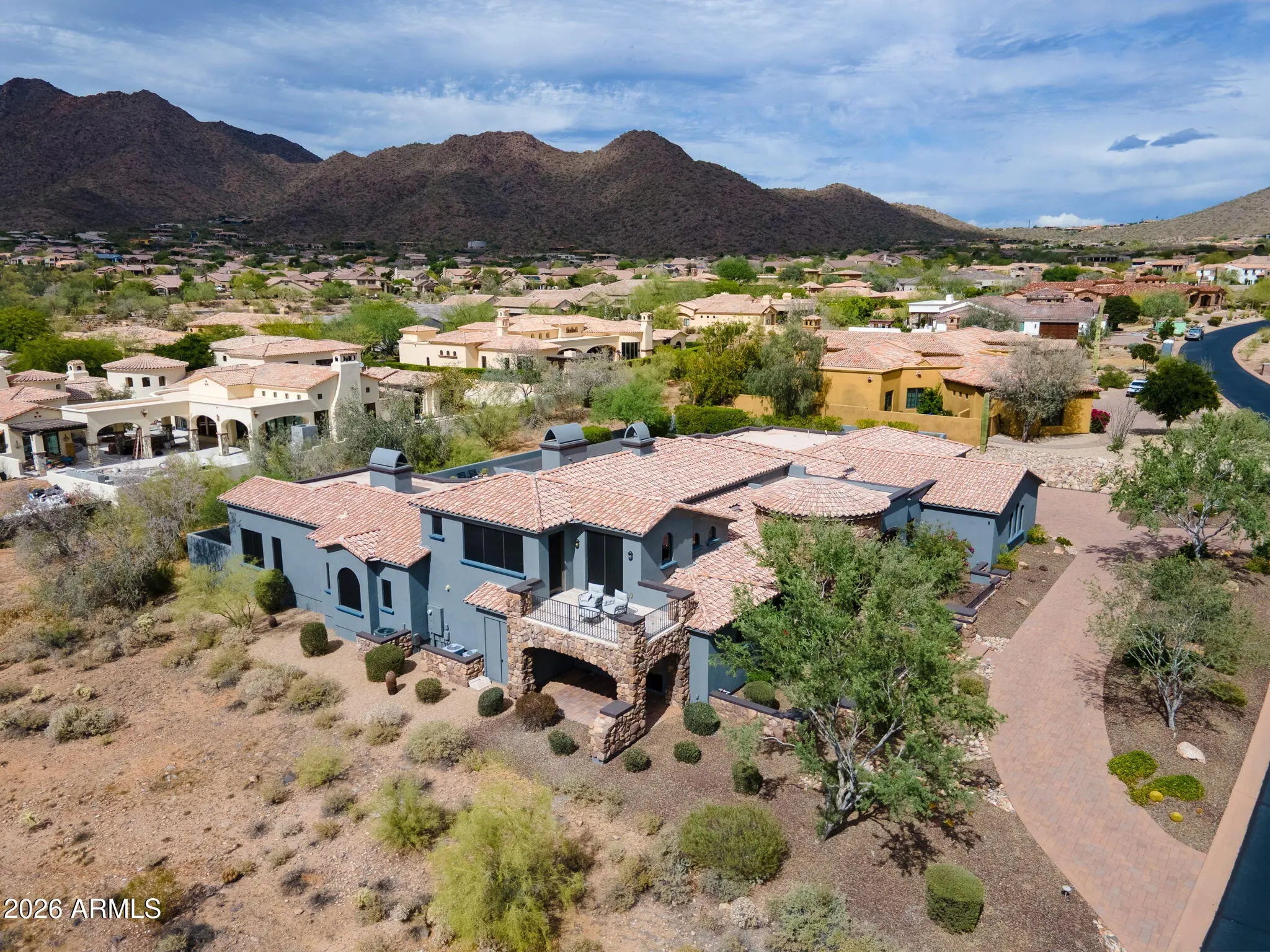 Experience refined desert living in this beautifully crafted residence set on an expansive lot within one of Scottsdale's premier gated enclaves. Hand-scraped acacia wood floors, wood-beam ceilings, and bespoke finishes create a warm, timeless backdrop throughout the home. The living room serves as the central gathering space, while the formal dining room is enhanced by a temperature-controlled wine room. A spacious game room with wet bar adds versatility, and each of the five ensuite bedrooms features its own designer bathroom. The primary bedroom retreat offers true serenity with a cozy fireplace, inviting sitting area, spa-like bathroom, and a huge custom closet. Newer AC units provide for multi-zone comfort, complemented by a new tankless water heater. Outdoor living feels like a private resort, with a large heated pool and spa, synthetic turf, and a putting green and an expansive covered patio with outdoor kitchen, misting system and fireplace--all framed by spectacular mountain and city-light views. A four-car garage with extra storage along with fresh interior and exterior paint complete this exceptional Scottsdale offering.