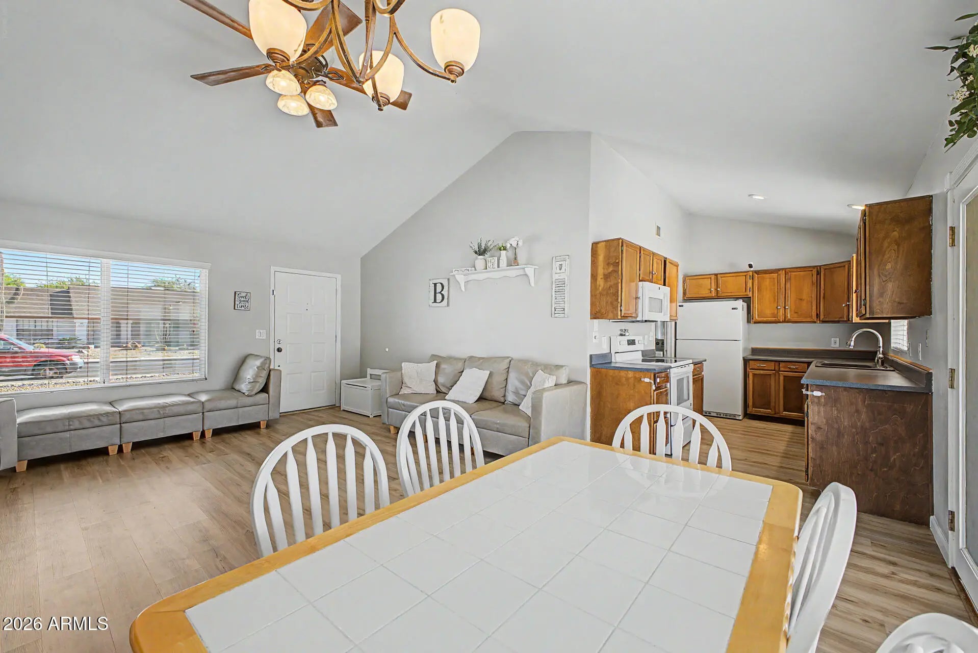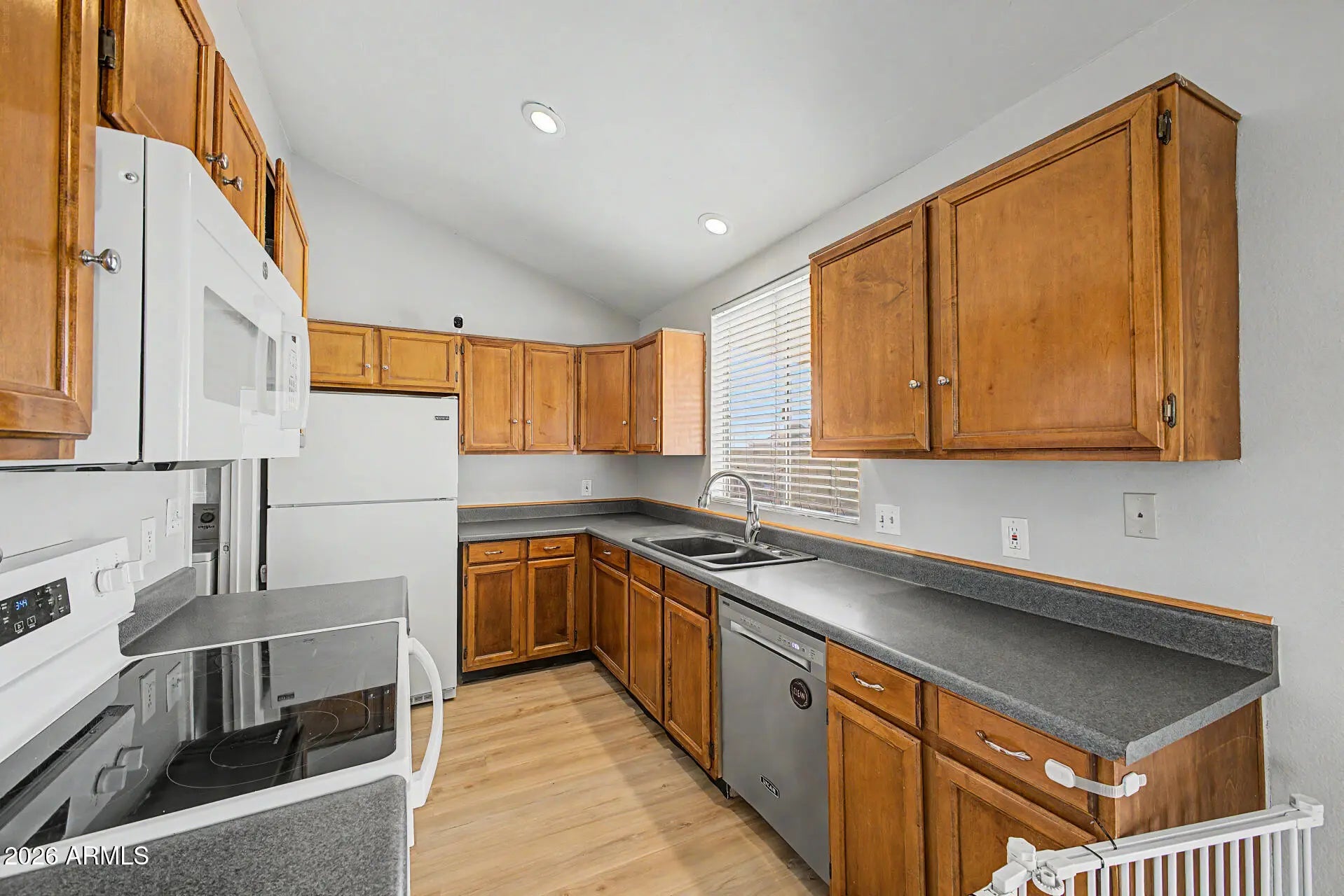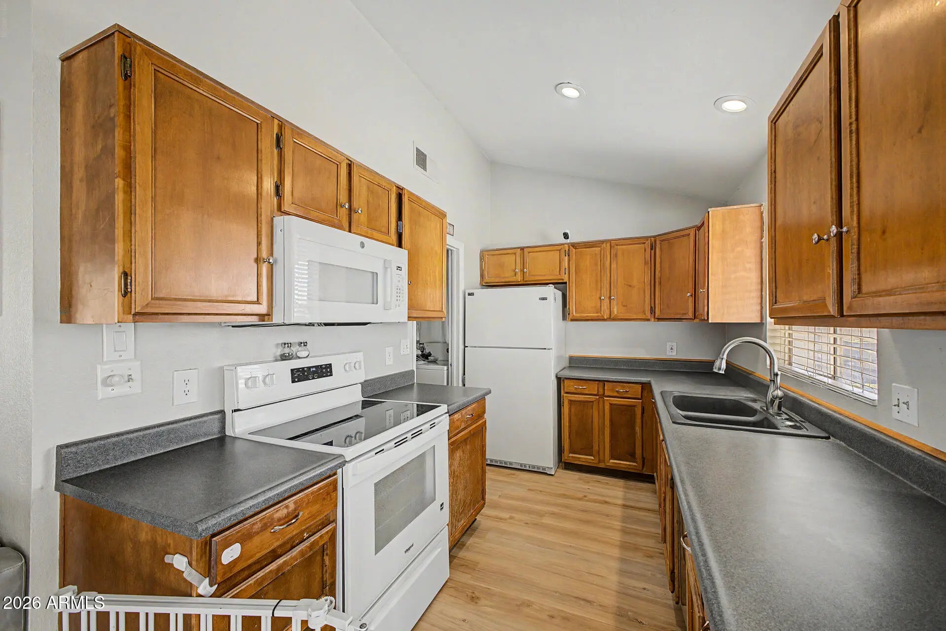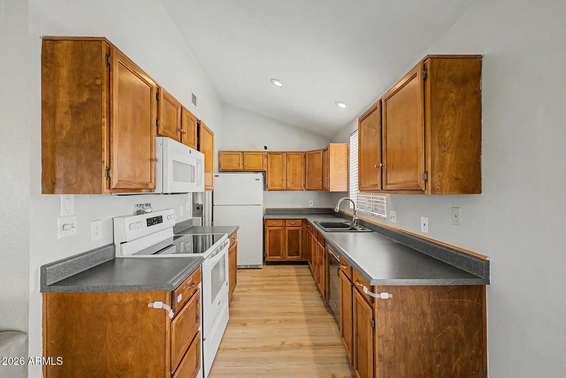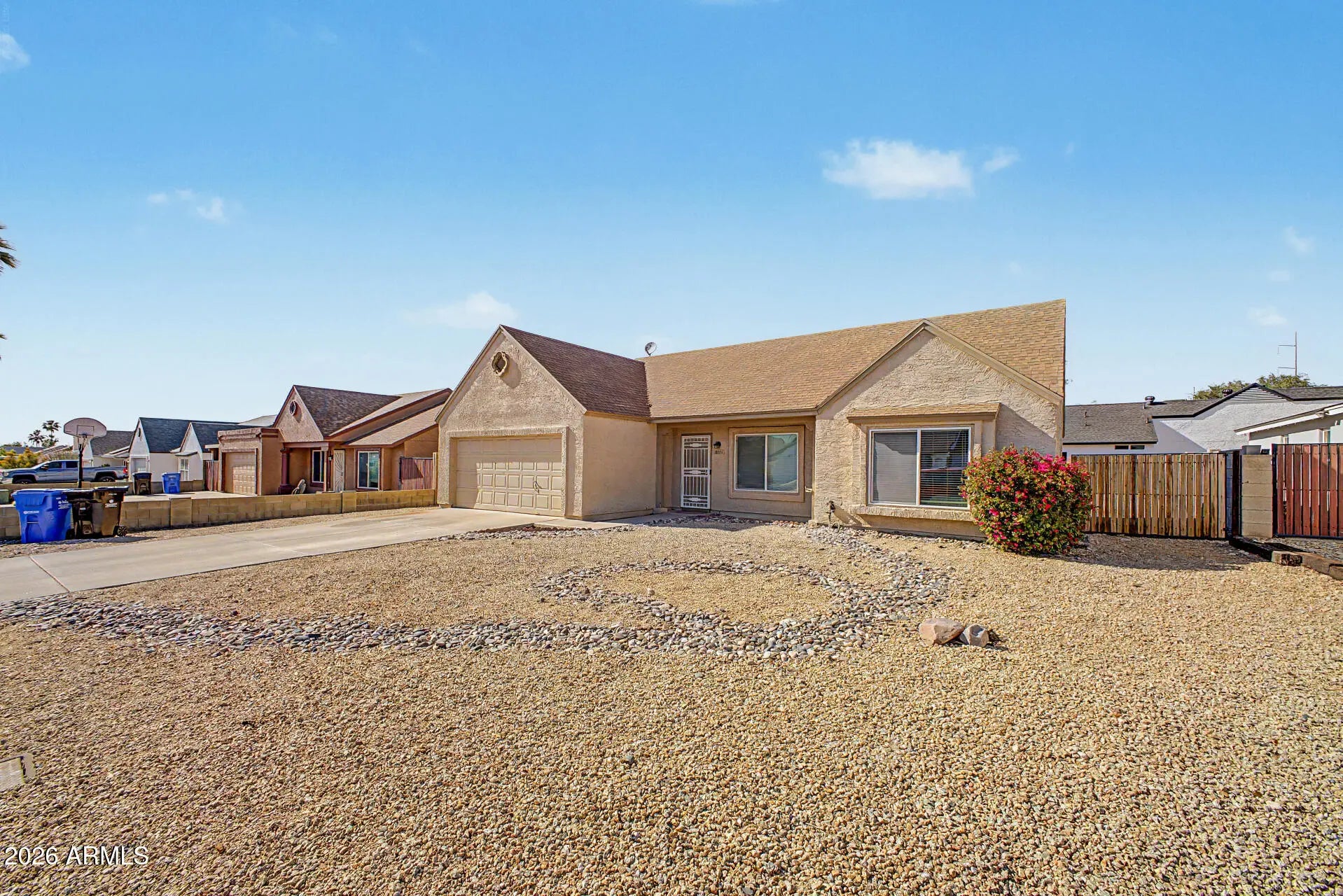 Fantastic opportunity to own this charming single-level home in Phoenix! Offering 2 beds, 1 bath, 2-car garage, RV gate, and a low-care landscape. Enter to find a seamlessly flowing layout, made bright & airy by the vaulted ceiling! Natural light filled the inviting interior, complemented by a neutral palette and wood-look flooring t/out. The kitchen boasts built-in appliances, recessed lighting, and ample cabinetry & counter space. The walk-in pantry ensures extra storage and easy organization. The main bedroom has a full bathroom for added comfort. The secondary bedroom provides versatility, ideal for an office as well. Check out the spacious backyard, featuring a storage shed & a covered patio to relax! With your creative ideas, you can make it a complete outdoor oasis. Make this yours!