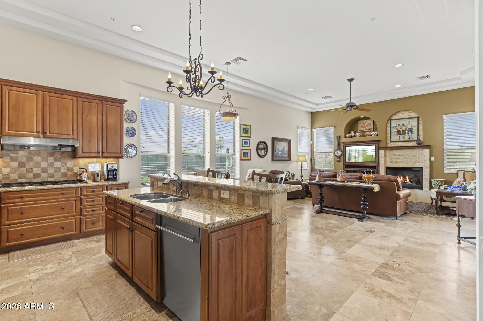 Troon North- Exquisite, Single Level home featuring 4 bedrooms, 2.5 baths, and a 3-car garage tucked on a quiet street and backing to a serene preserve. This custom residence offers privacy, sweeping views, and elevated desert living. Open-concept design blends sophistication and comfort with formal living and dining spaces, soaring 12-foot ceilings, coffered architectural details, travertine floors, and a striking fireplace. The chef's kitchen is beautifully appointed with rich alder cabinetry, granite slab countertops, premium stainless steel appliances, double ovens, and a gas cooktop. The primary suite is a true retreat and ensuite bath with travertine shower and jacuzzi tub. Set on an oversized lot, the backyard is a peaceful retreat featuring natural desert landscaping, bordering untouched desert for enhanced privacy, with striking boulder formations and stunning sunset views. Impeccably maintained and move-in ready. Nestled within one of Arizona's most prestigious golf communities, Troon North offers world-class fairways and breathtaking desert scenery. Perfectly positioned in north scottsdale, moments from fine dining, luxury shopping, hiking trails, and seamless access across the valley.