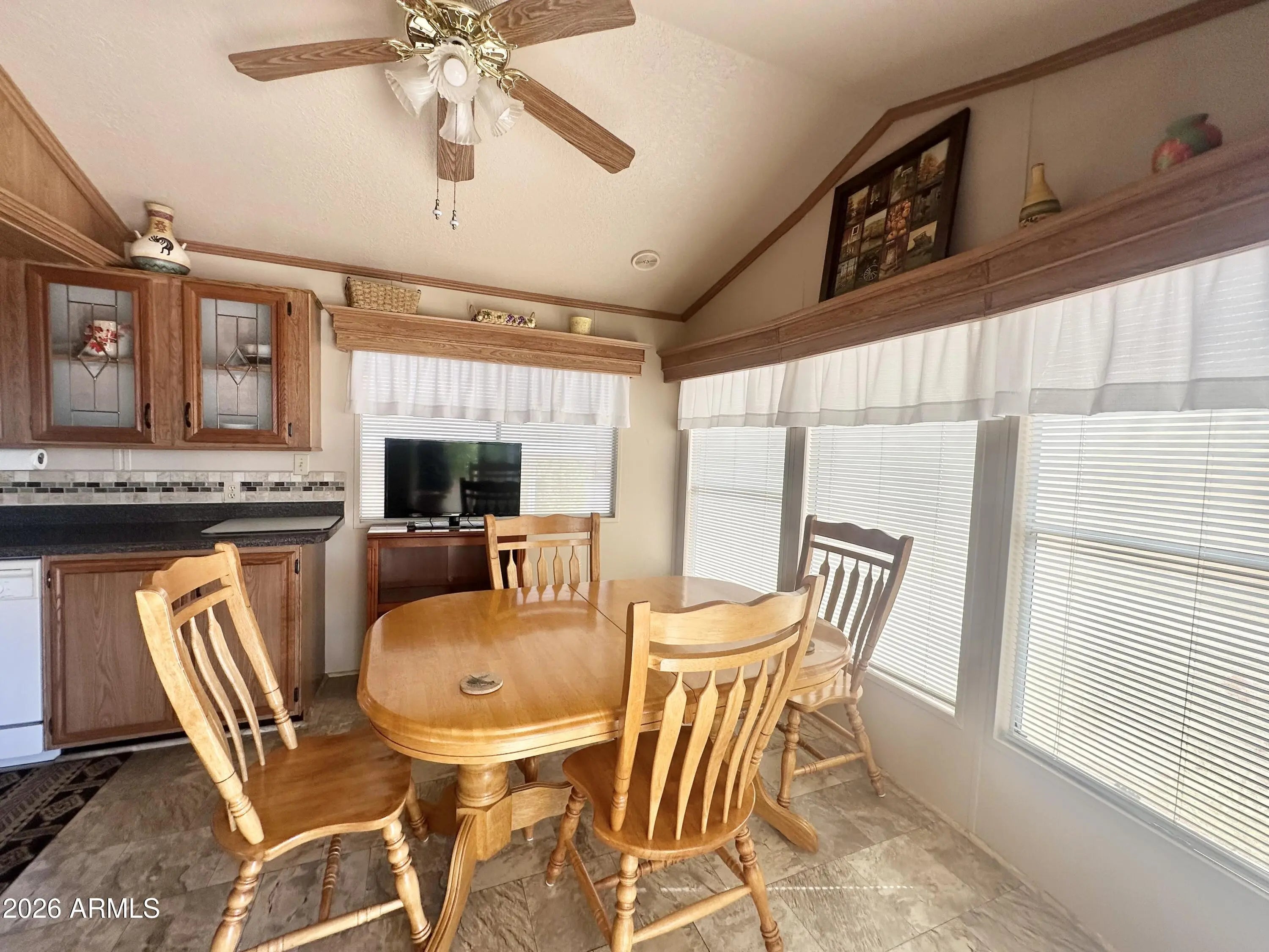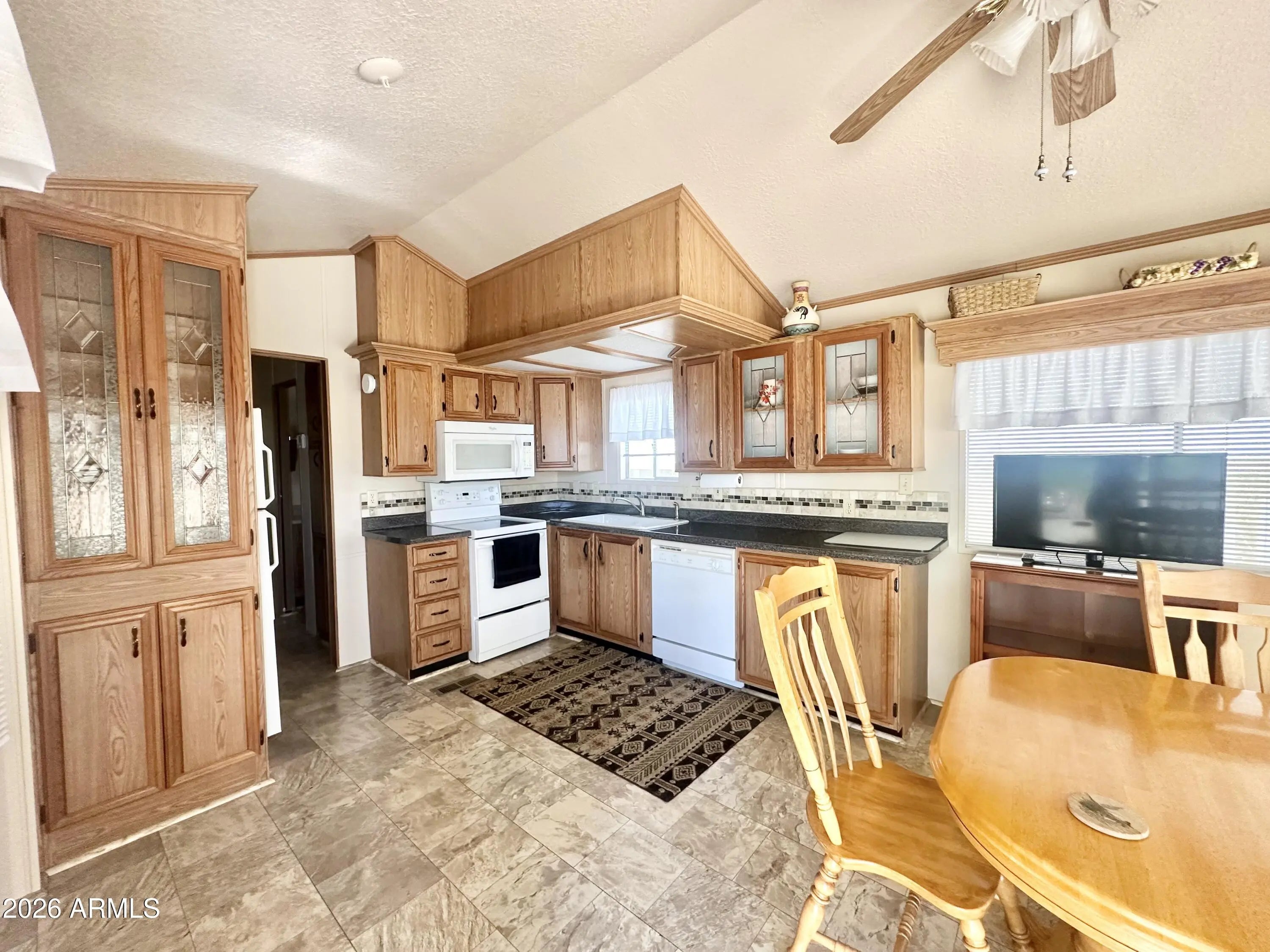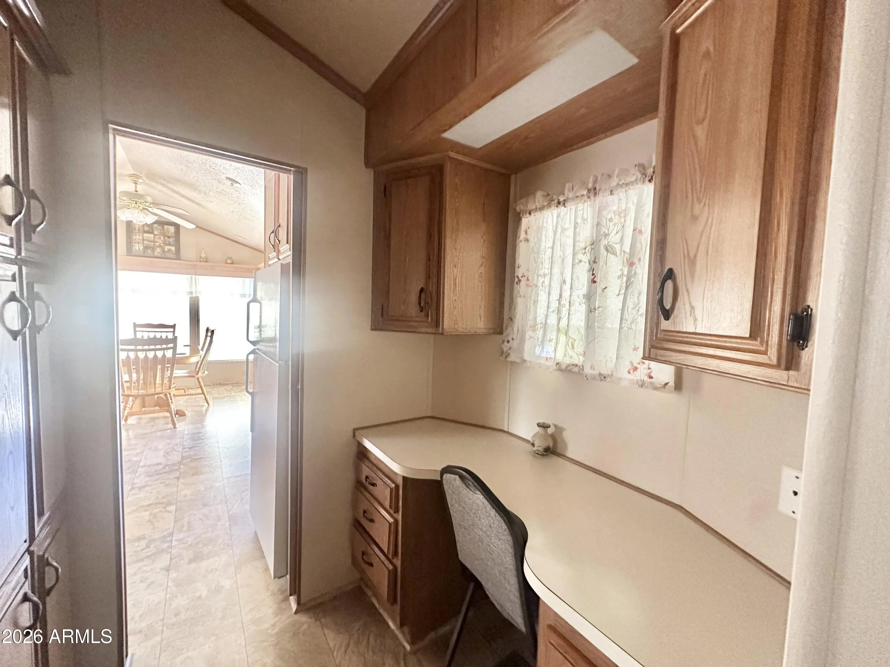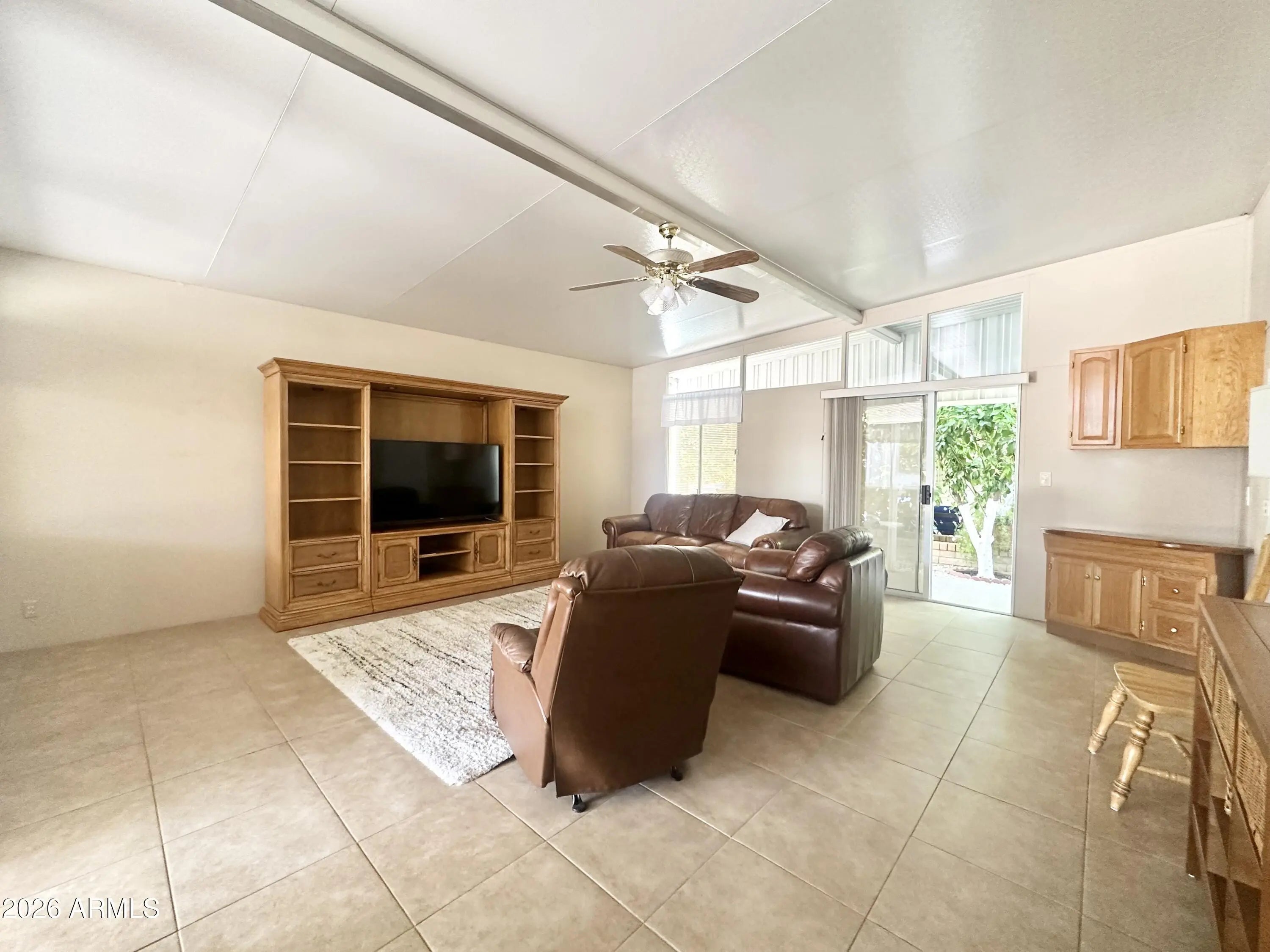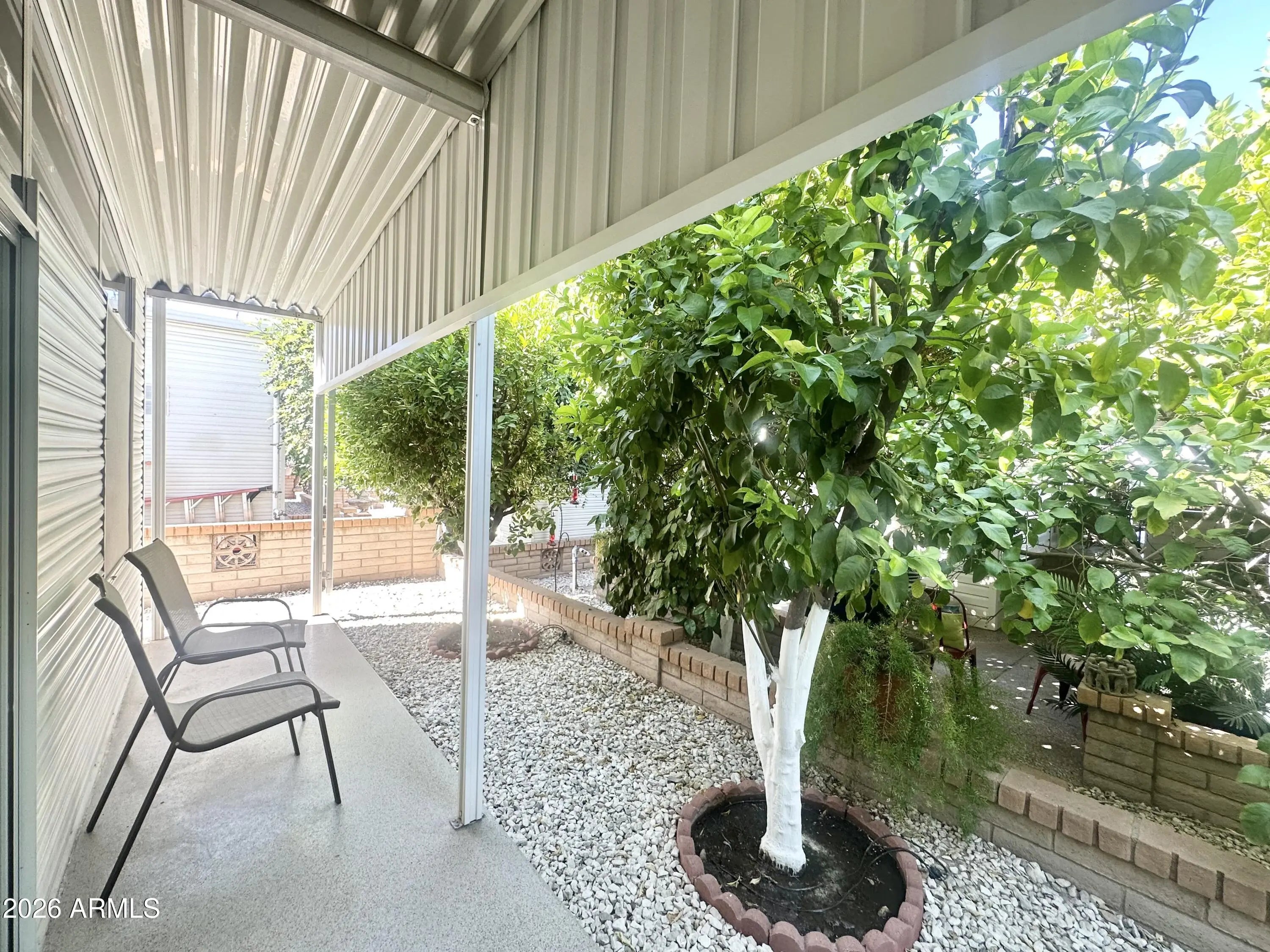 Spacious Home on an Oversized Lot in Greenfield Village! Situated on a large, extended lot, this one-of-a-kind home offers exceptional indoor and outdoor living space, perfect for entertaining, relaxing, and enjoying the Arizona lifestyle. Step onto the huge front deck, ideal for morning coffee or evening gatherings, and into the home's open-concept layout featuring vaulted ceilings and a bright dining area. The kitchen is well-appointed with a flat-top range, microwave, dishwasher, garbage disposal, and a large porcelain sink, making it both functional and inviting. Down the hallway, you'll find a built-in desk with storage, perfect for a home office or hobby space. The spacious bathroom includes a newer walk-in shower and convenient pocket door. The primary bedroom offers a comfortable retreat with a large closet, built-in shelving, and ample storage. One of the standout features is the impressive 20x20 Arizona room, complete with vaulted ceilings, oversized windows, and transom windows that fill the space with natural light. A large patio door provides seamless access to the carport area, while an additional sliding glass door leads to the covered back patio with fruit trees--a perfect setting for outdoor entertaining. Just off the Arizona room, you'll find a super-sized laundry room with a three-quarter bath, walk-in shower, extensive cabinetry, oversized closet, extra refrigerator/freezer, second water heater, and even loft storage above--offering incredible versatility and convenience. Additional highlights include a newer AC unit, sunscreens, a recently coated roof and new PEX plumbing in 2024. This home truly stands out with its generous space, thoughtful layout, and entertaining potential--all located in the highly desirable 55 + Greenfield Village community. Own the land own the fun!