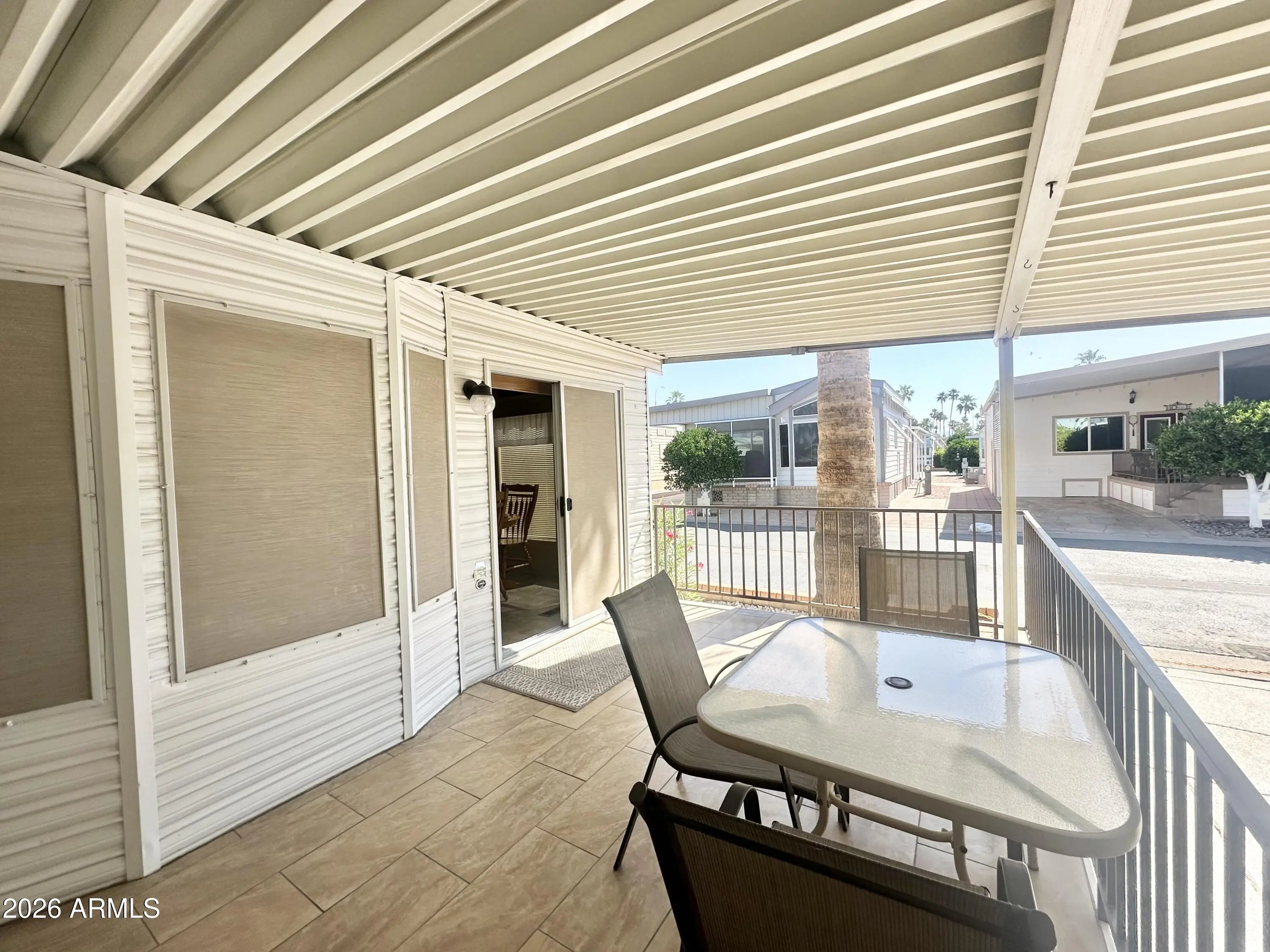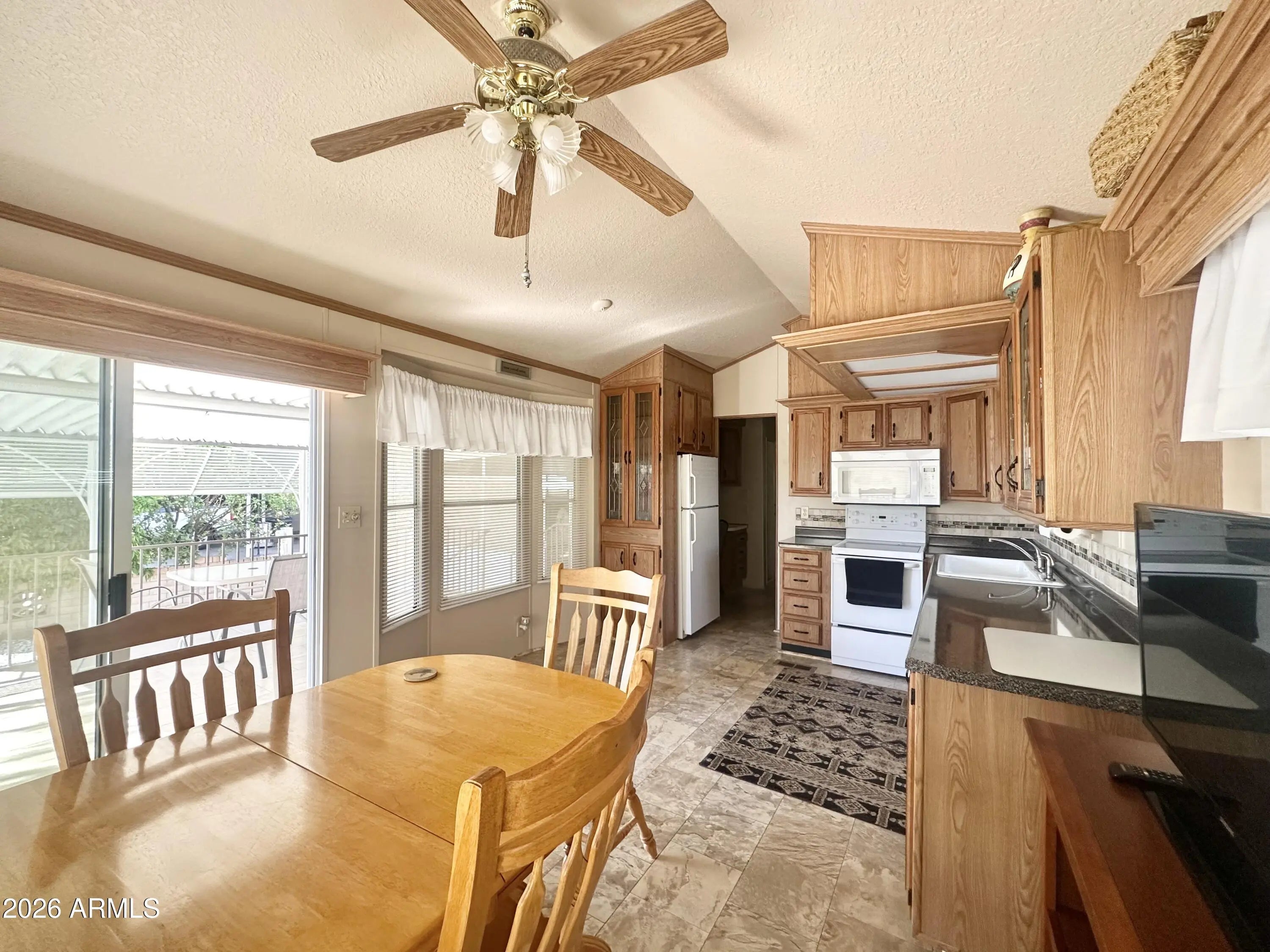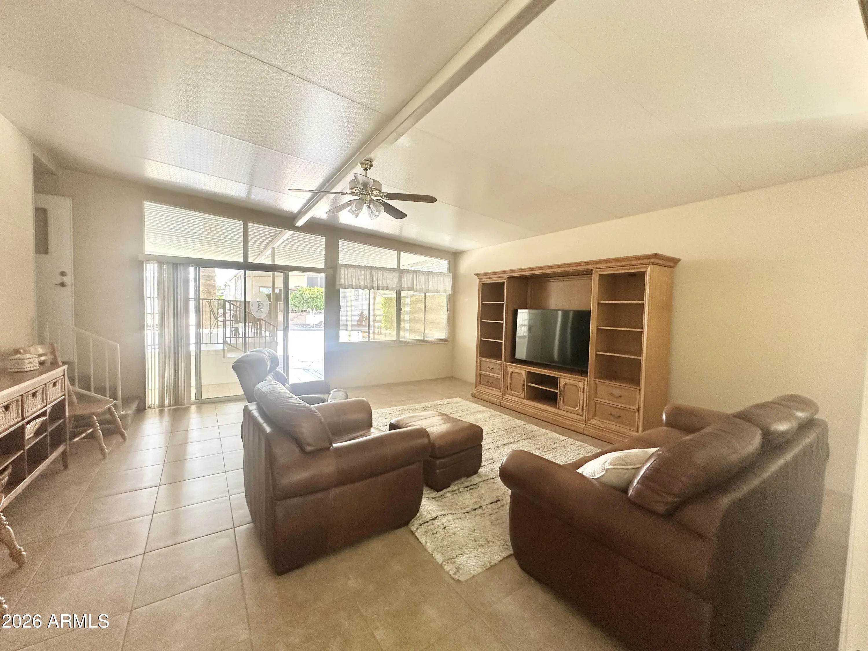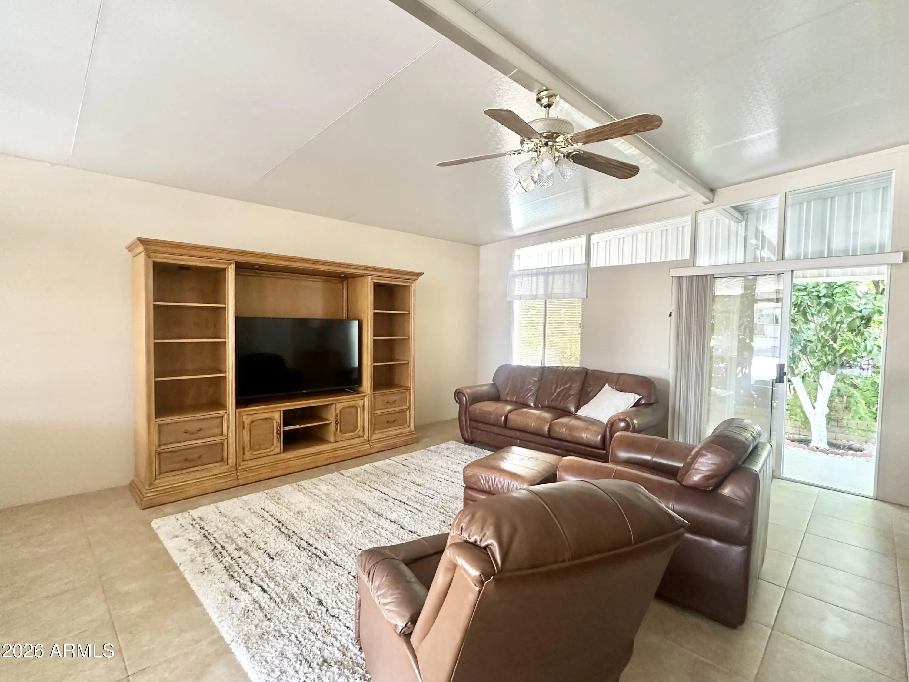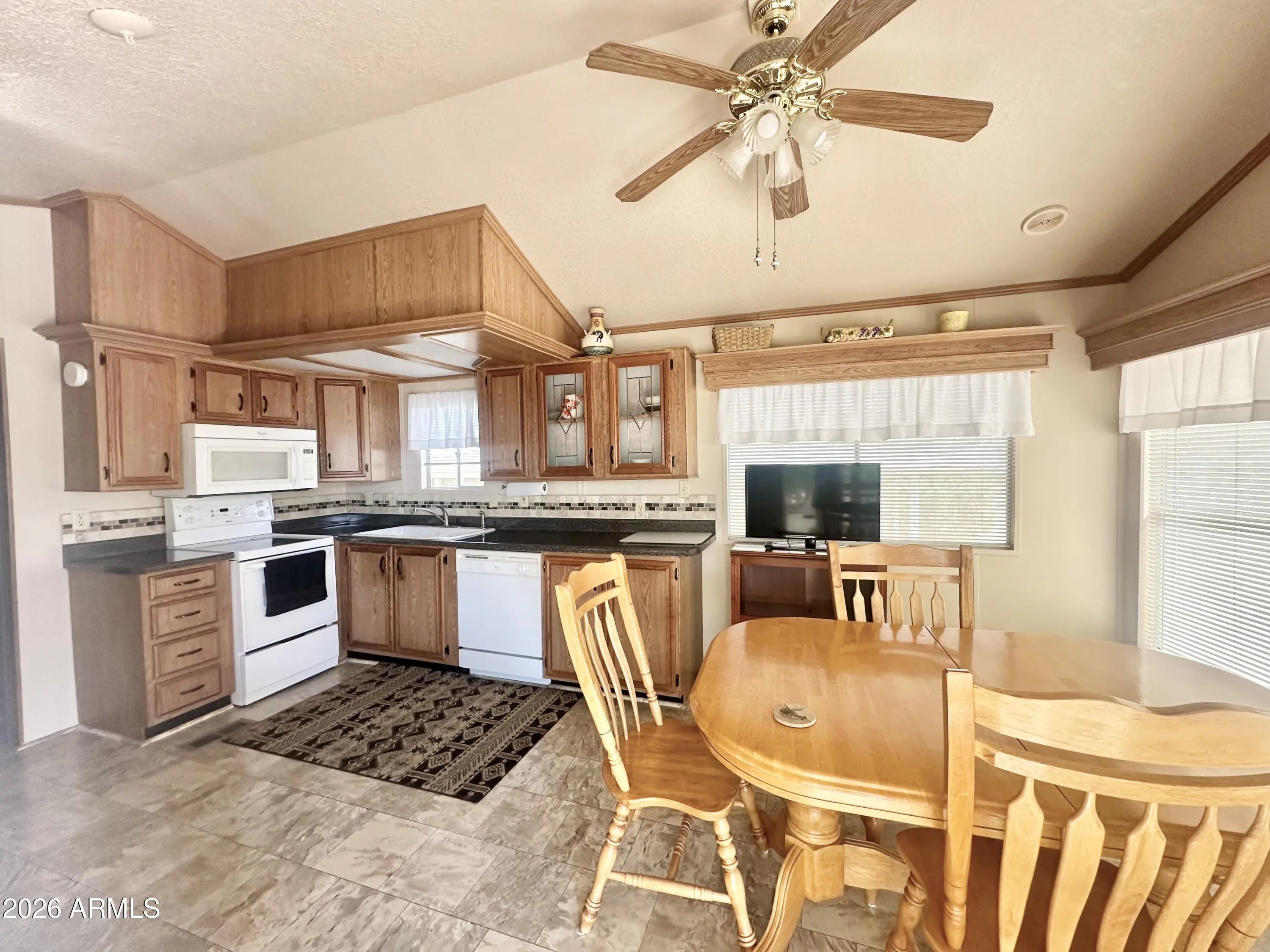 Spacious Home on an Oversized Lot in Greenfield Village! Situated on a large, extended lot, this one-of-a-kind home offers exceptional indoor and outdoor living space, perfect for entertaining, relaxing, and enjoying the Arizona lifestyle. Step onto the huge front deck, ideal for morning coffee or evening gatherings, and into the home's open-concept layout featuring vaulted ceilings and a bright dining area. The kitchen is well-appointed with a flat-top range, microwave, dishwasher, garbage disposal, and a large porcelain sink, making it both functional and inviting. Down the hallway, you'll find a built-in desk with storage, perfect for a home office or hobby space. The spacious bathroom includes a newer walk-in shower and convenient pocket door. The primary bedroom offers a comfortable retreat with a large closet, built-in shelving, and ample storage. One of the standout features is the impressive 20x20 Arizona room, complete with vaulted ceilings, oversized windows, and transom windows that fill the space with natural light. A large patio door provides seamless access to the carport area, while an additional sliding glass door leads to the covered back patio with fruit trees--a perfect setting for outdoor entertaining. Just off the Arizona room, you'll find a super-sized laundry room with a three-quarter bath, walk-in shower, extensive cabinetry, oversized closet, extra refrigerator/freezer, second water heater, and even loft storage above--offering incredible versatility and convenience. Additional highlights include a newer AC unit, sunscreens, a recently coated roof and new PEX plumbing in 2024. This home truly stands out with its generous space, thoughtful layout, and entertaining potential--all located in the highly desirable 55 + Greenfield Village community. Own the land own the fun!