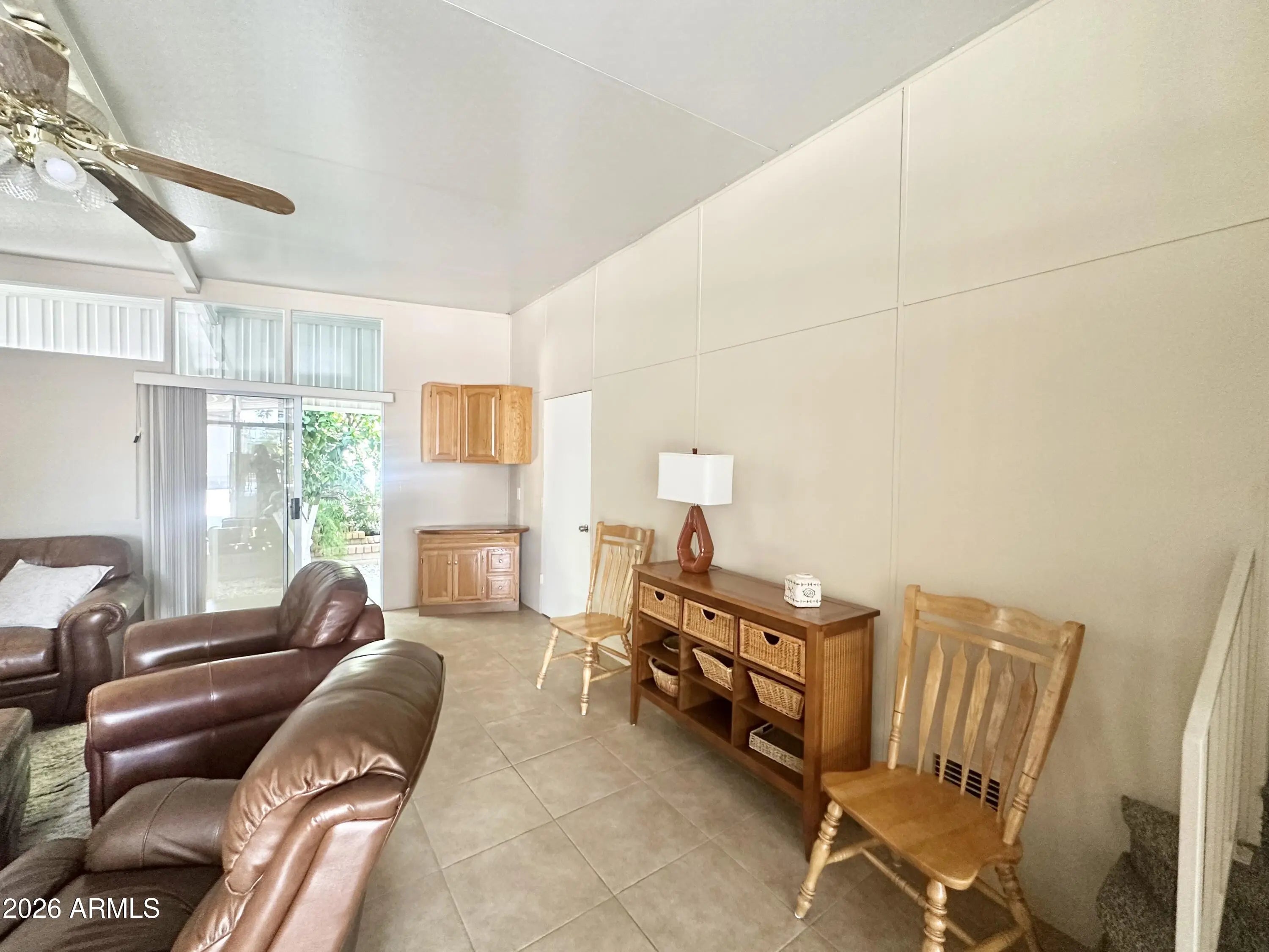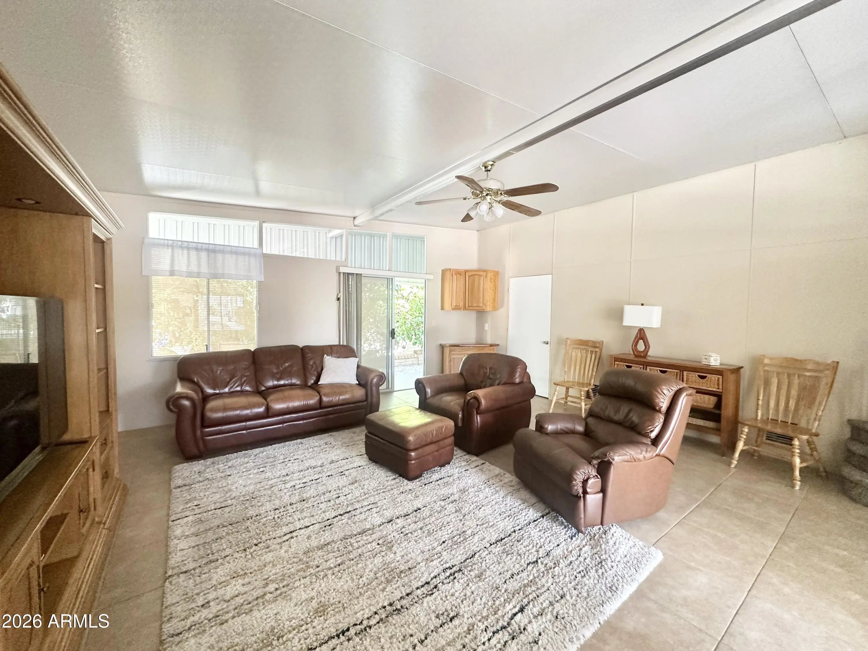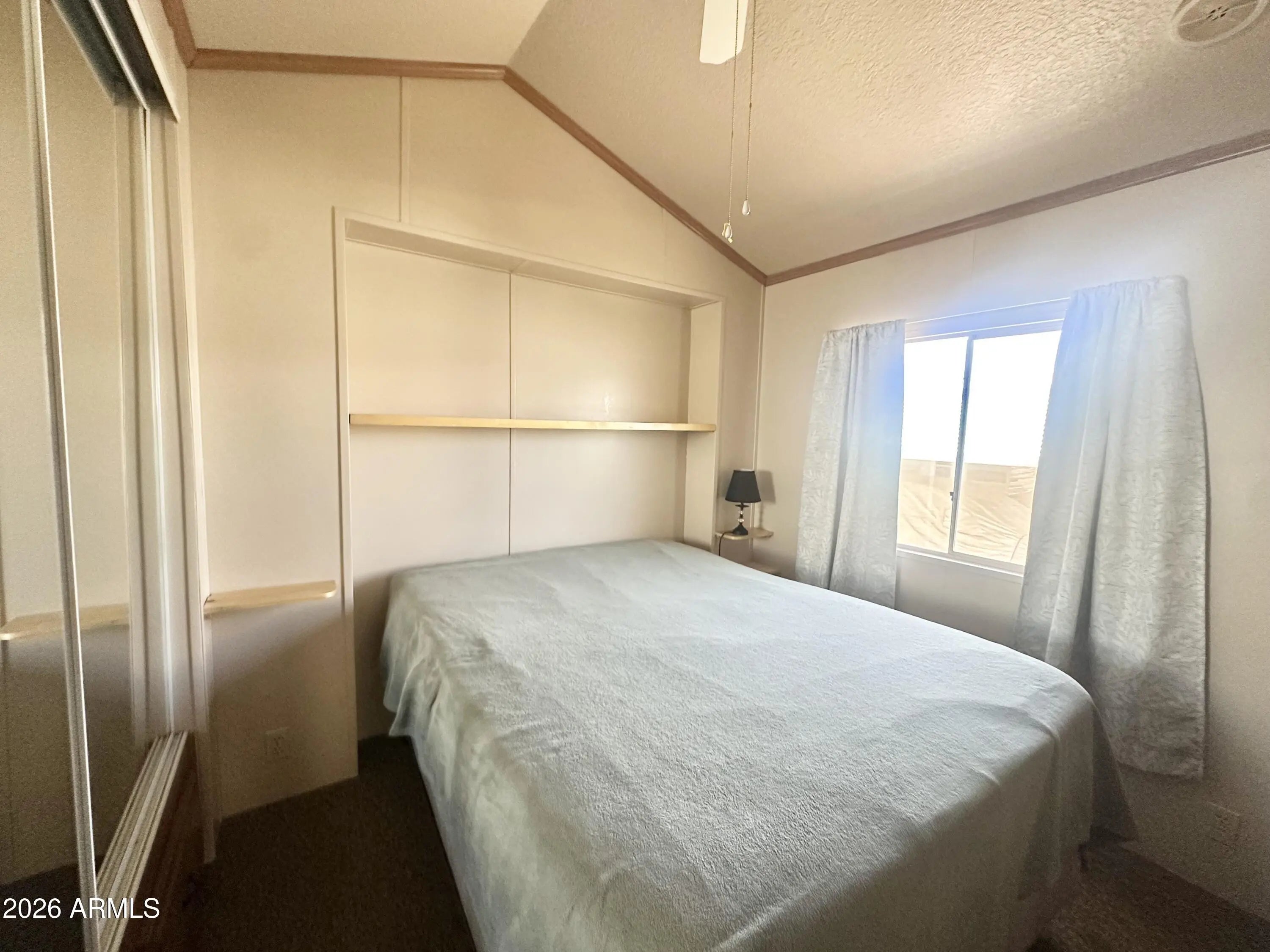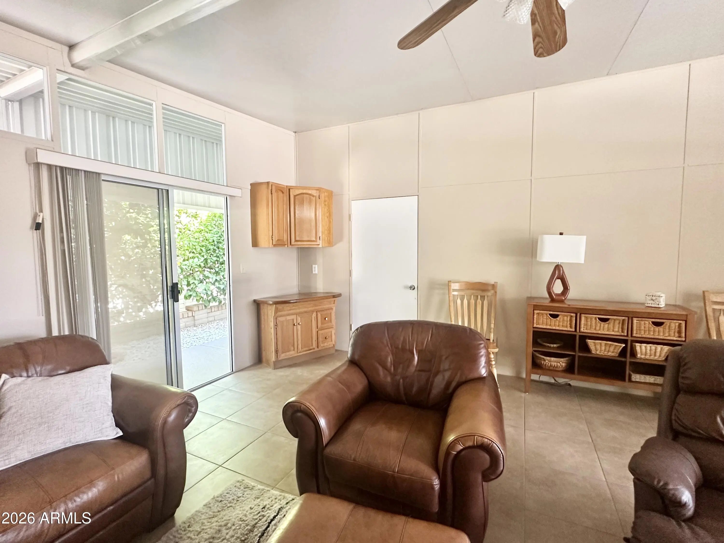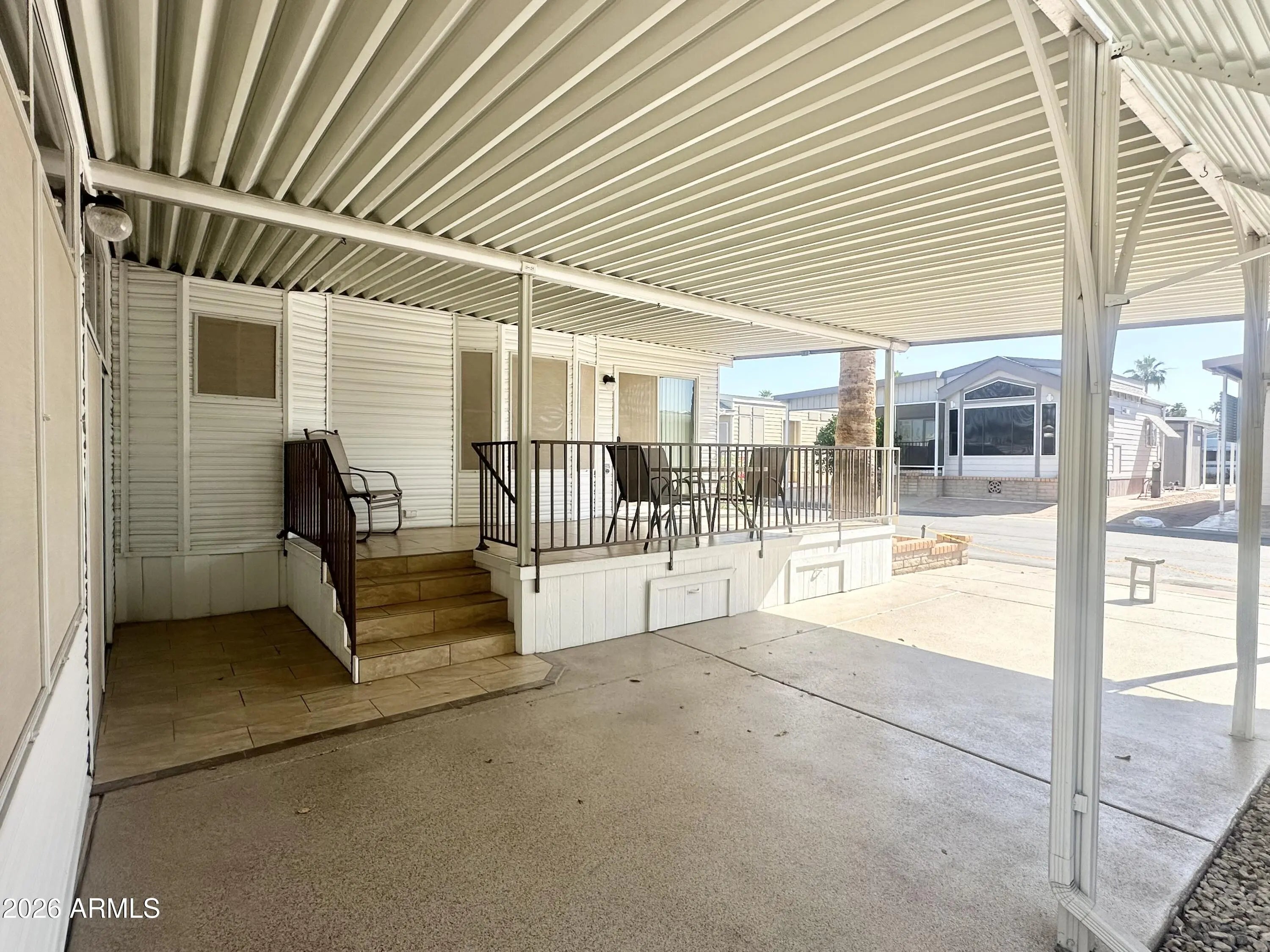 Spacious Home on an Oversized Lot in Greenfield Village! Situated on a large, extended lot, this one-of-a-kind home offers exceptional indoor and outdoor living space, perfect for entertaining, relaxing, and enjoying the Arizona lifestyle. Step onto the huge front deck, ideal for morning coffee or evening gatherings, and into the home's open-concept layout featuring vaulted ceilings and a bright dining area. The kitchen is well-appointed with a flat-top range, microwave, dishwasher, garbage disposal, and a large porcelain sink, making it both functional and inviting. Down the hallway, you'll find a built-in desk with storage, perfect for a home office or hobby space. The spacious bathroom includes a newer walk-in shower and convenient pocket door. The primary bedroom offers a comfortable retreat with a large closet, built-in shelving, and ample storage. One of the standout features is the impressive 20x20 Arizona room, complete with vaulted ceilings, oversized windows, and transom windows that fill the space with natural light. A large patio door provides seamless access to the carport area, while an additional sliding glass door leads to the covered back patio with fruit trees--a perfect setting for outdoor entertaining. Just off the Arizona room, you'll find a super-sized laundry room with a three-quarter bath, walk-in shower, extensive cabinetry, oversized closet, extra refrigerator/freezer, second water heater, and even loft storage above--offering incredible versatility and convenience. Additional highlights include a newer AC unit, sunscreens, a recently coated roof and new PEX plumbing in 2024. This home truly stands out with its generous space, thoughtful layout, and entertaining potential--all located in the highly desirable 55 + Greenfield Village community. Own the land own the fun!
