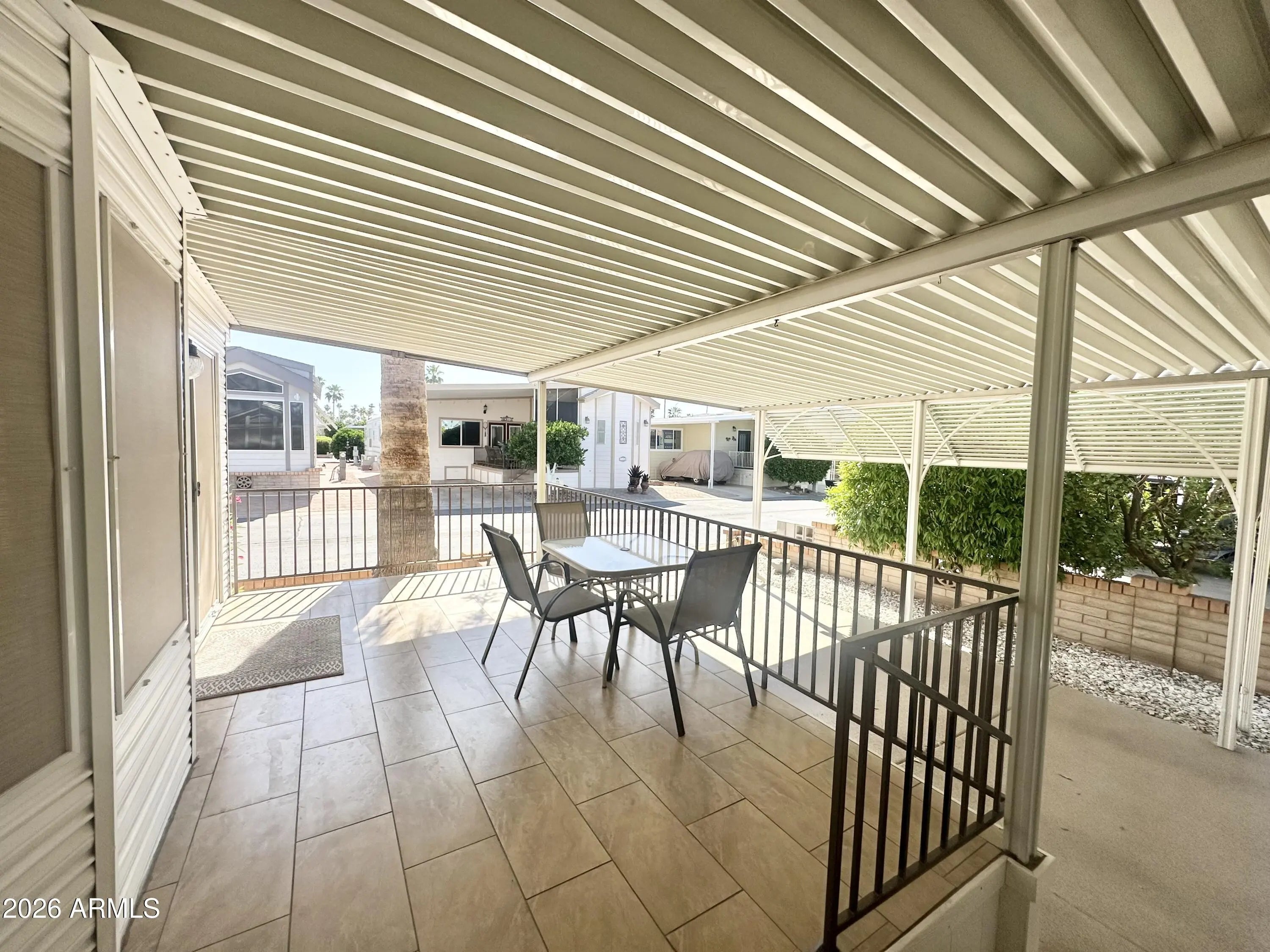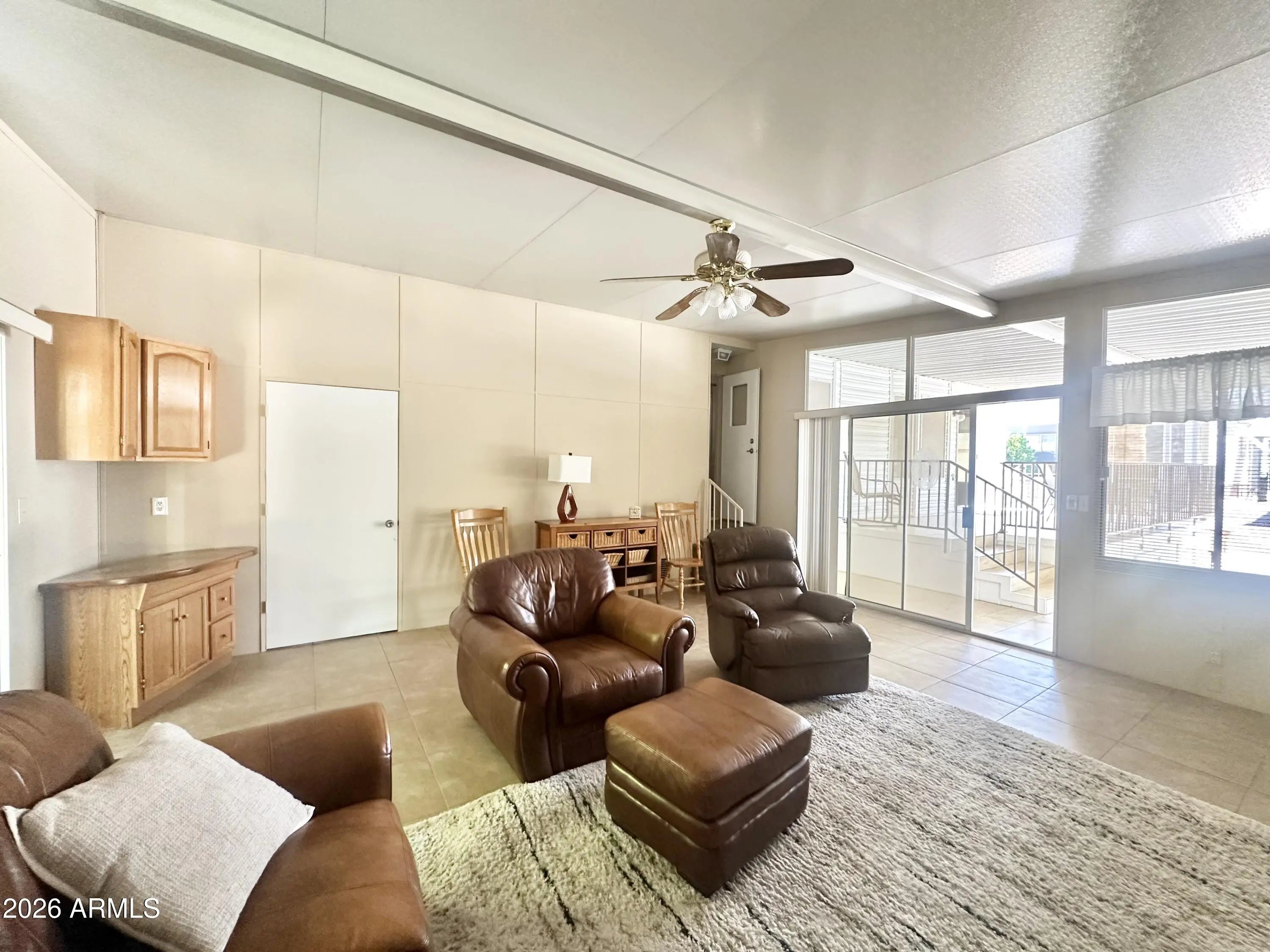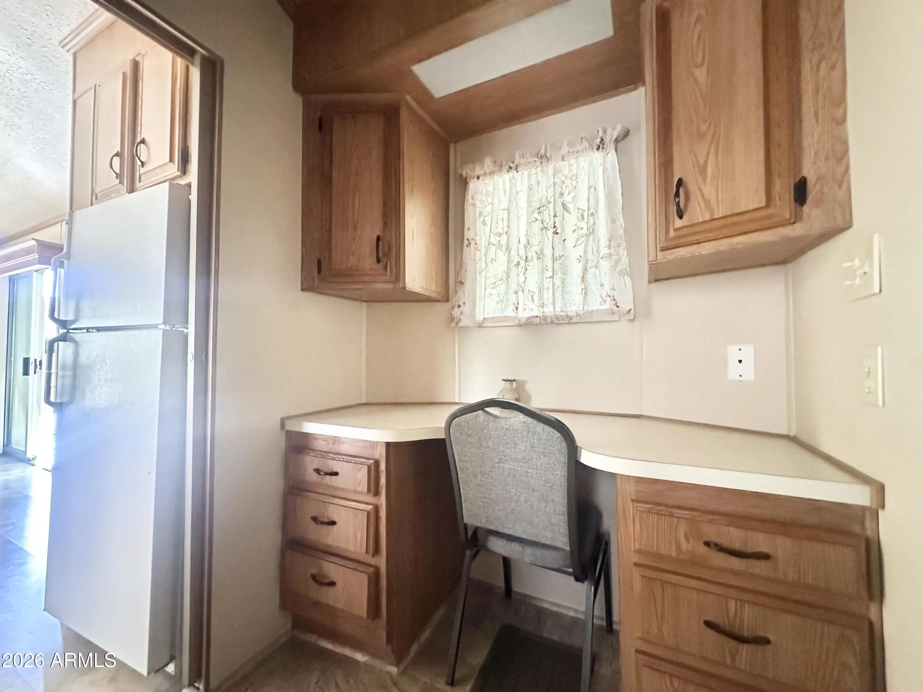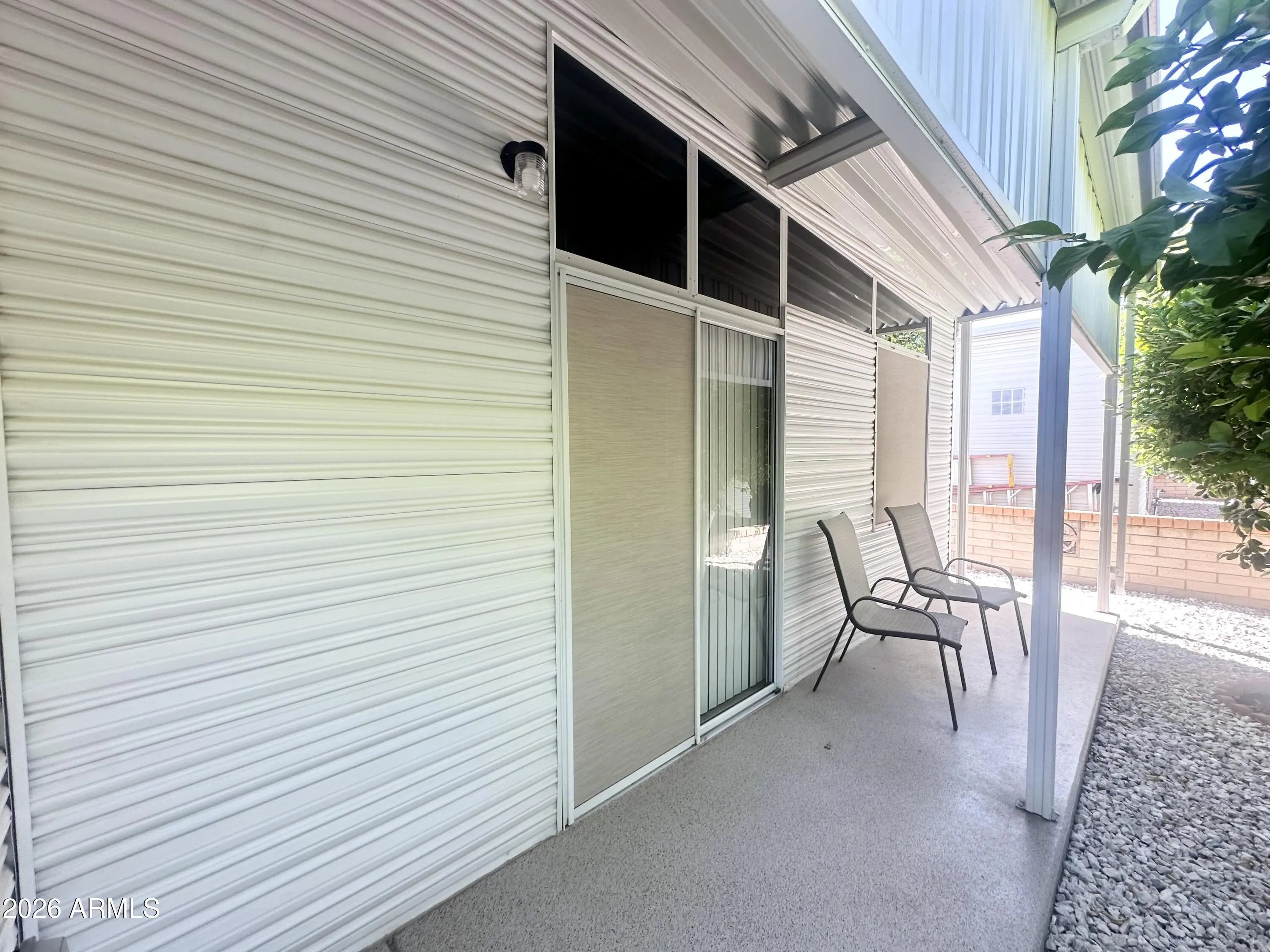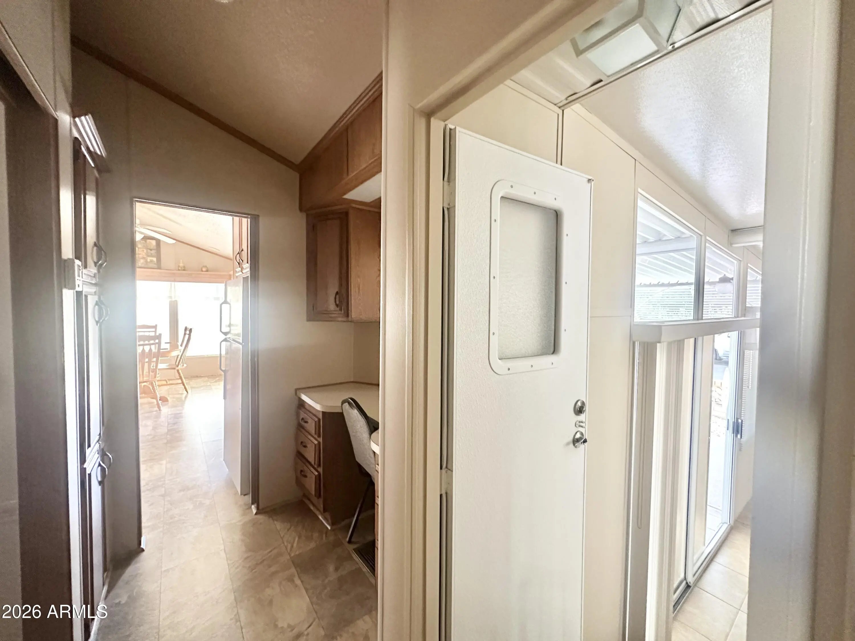 Spacious Home on an Oversized Lot in Greenfield Village! Situated on a large, extended lot, this one-of-a-kind home offers exceptional indoor and outdoor living space, perfect for entertaining, relaxing, and enjoying the Arizona lifestyle. Step onto the huge front deck, ideal for morning coffee or evening gatherings, and into the home's open-concept layout featuring vaulted ceilings and a bright dining area. The kitchen is well-appointed with a flat-top range, microwave, dishwasher, garbage disposal, and a large porcelain sink, making it both functional and inviting. Down the hallway, you'll find a built-in desk with storage, perfect for a home office or hobby space. The spacious bathroom includes a newer walk-in shower and convenient pocket door. The primary bedroom offers a comfortable retreat with a large closet, built-in shelving, and ample storage. One of the standout features is the impressive 20x20 Arizona room, complete with vaulted ceilings, oversized windows, and transom windows that fill the space with natural light. A large patio door provides seamless access to the carport area, while an additional sliding glass door leads to the covered back patio with fruit trees--a perfect setting for outdoor entertaining. Just off the Arizona room, you'll find a super-sized laundry room with a three-quarter bath, walk-in shower, extensive cabinetry, oversized closet, extra refrigerator/freezer, second water heater, and even loft storage above--offering incredible versatility and convenience. Additional highlights include a newer AC unit, sunscreens, a recently coated roof and new PEX plumbing in 2024. This home truly stands out with its generous space, thoughtful layout, and entertaining potential--all located in the highly desirable 55 + Greenfield Village community. Own the land own the fun!