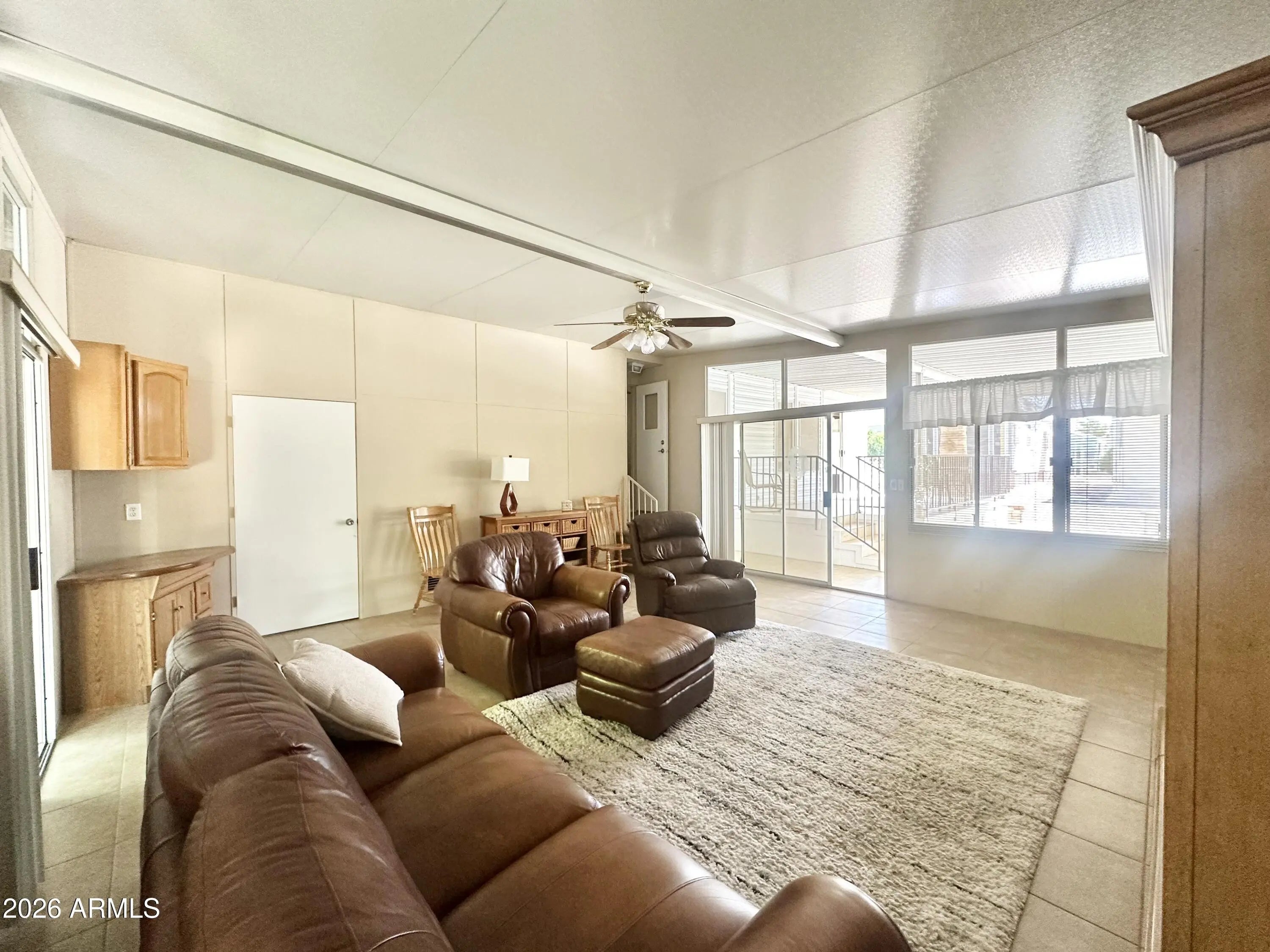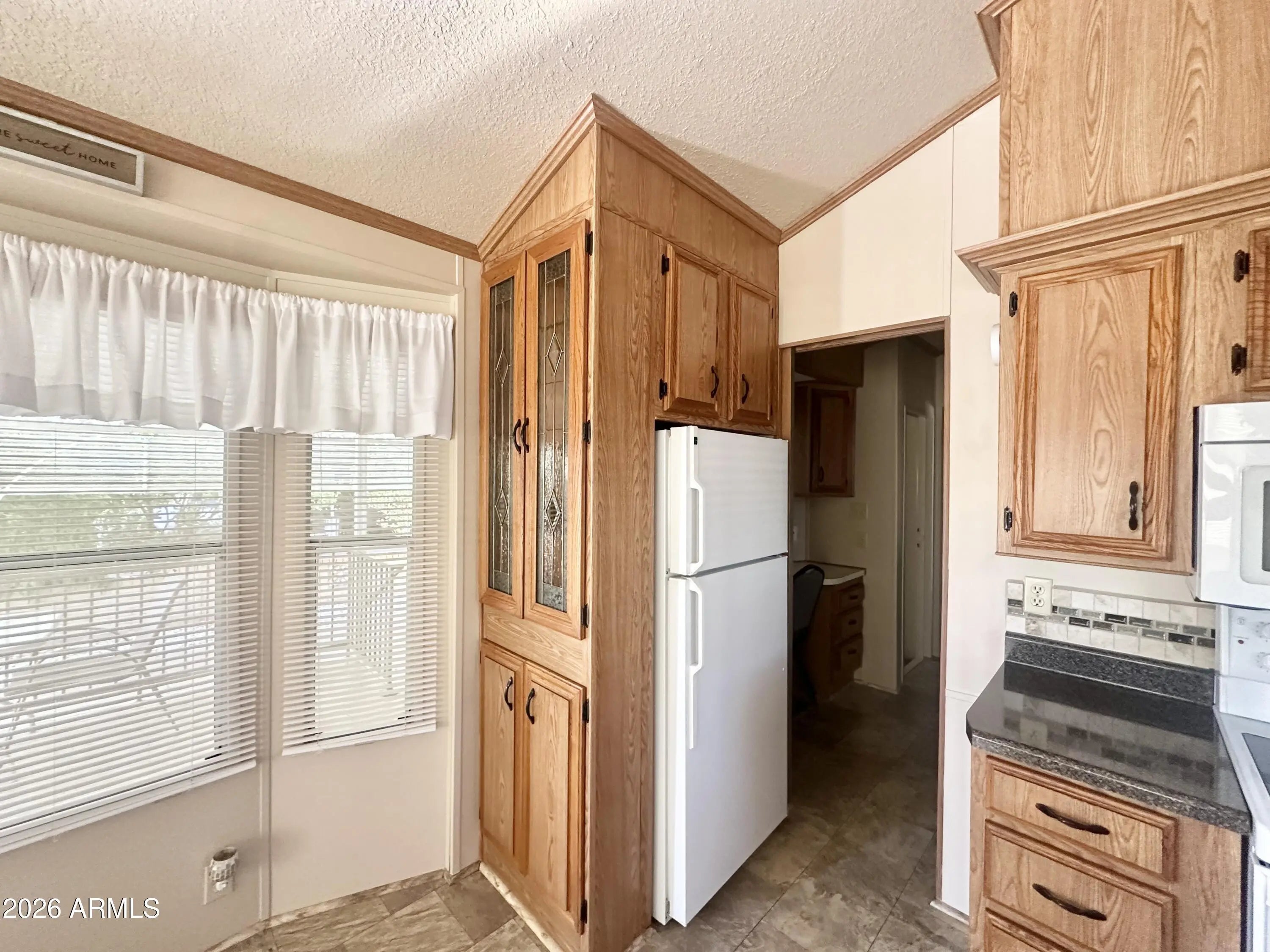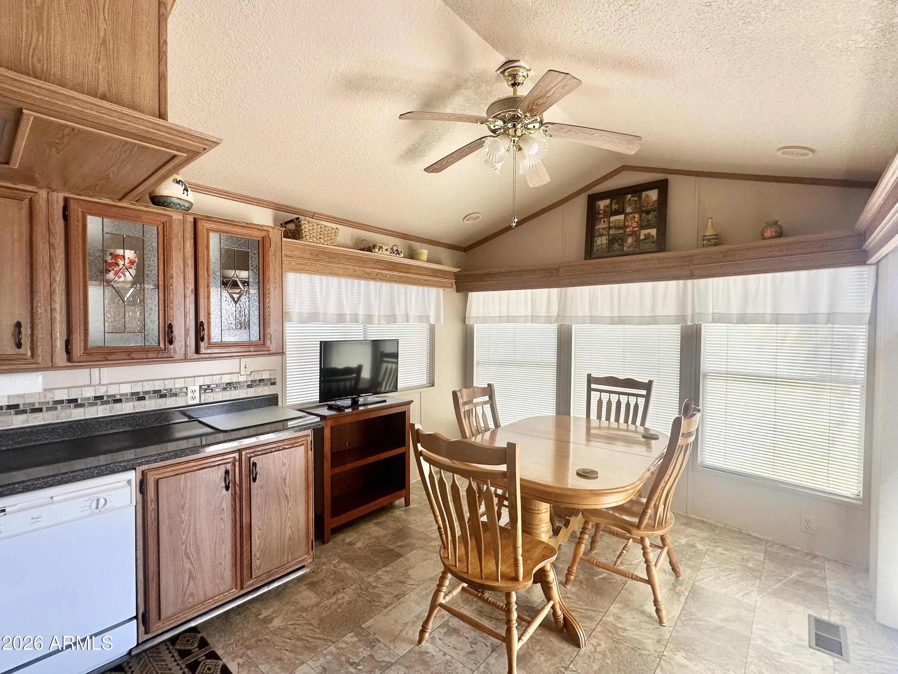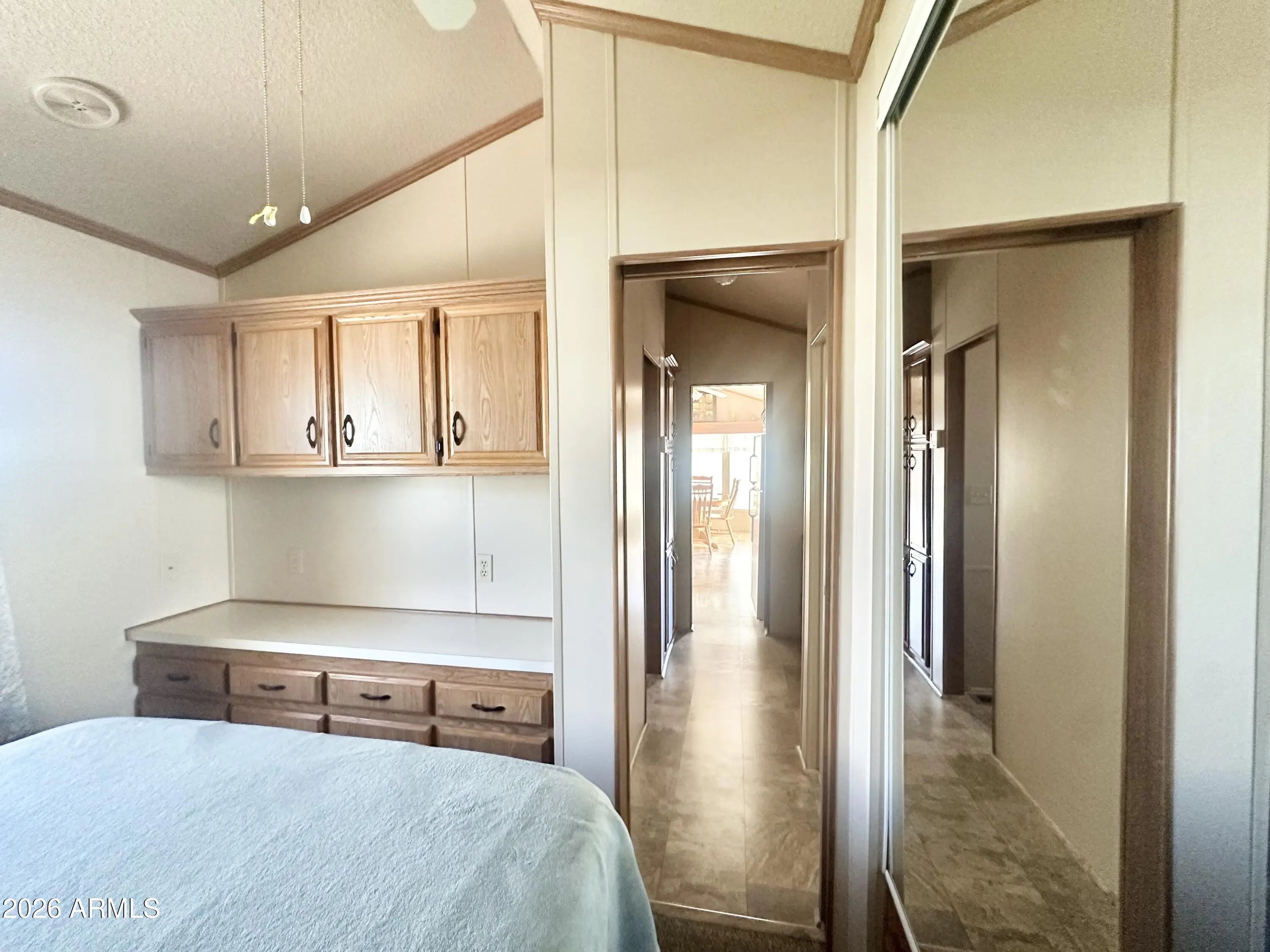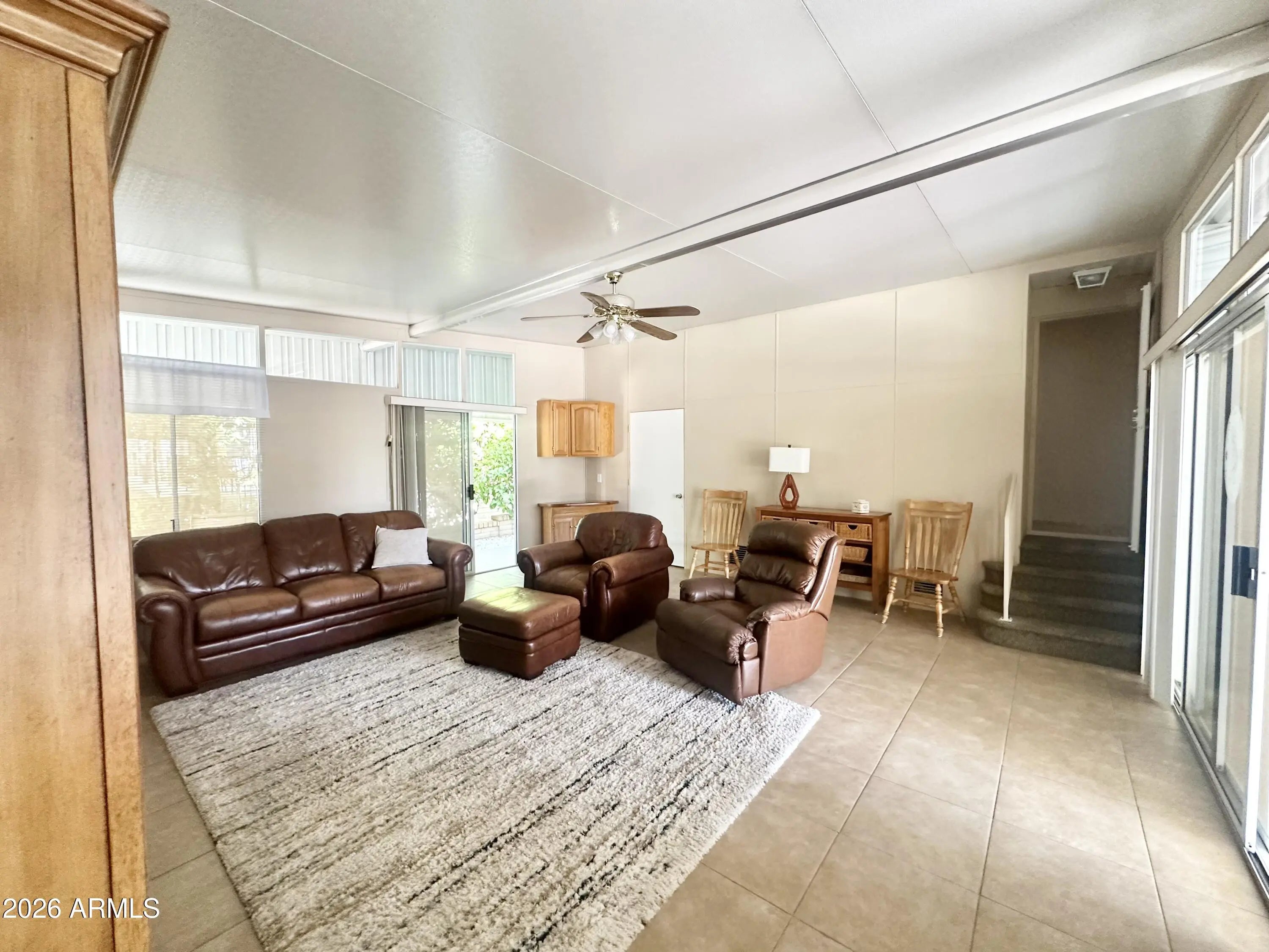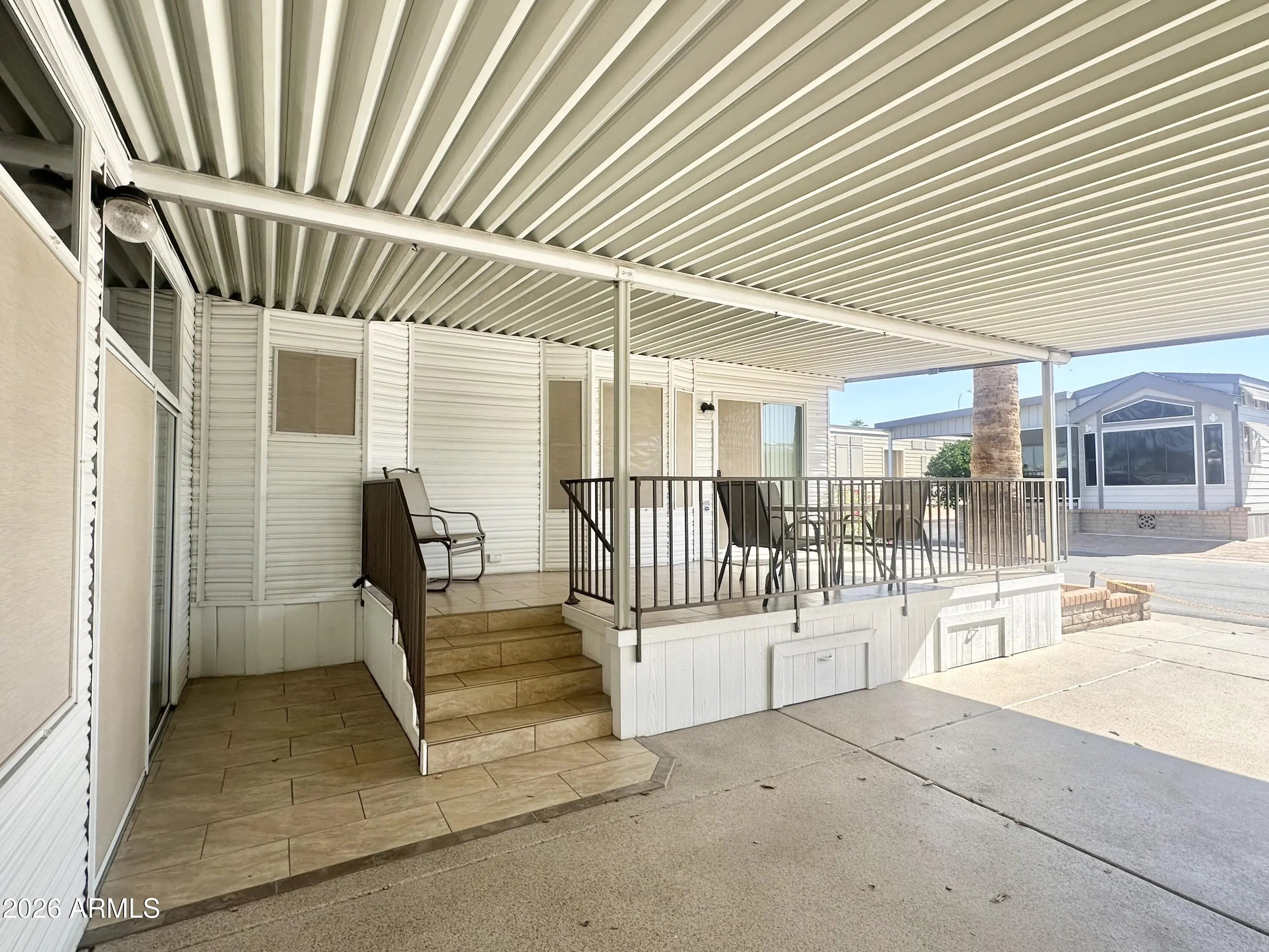 Spacious Home on an Oversized Lot in Greenfield Village! Situated on a large, extended lot, this one-of-a-kind home offers exceptional indoor and outdoor living space, perfect for entertaining, relaxing, and enjoying the Arizona lifestyle. Step onto the huge front deck, ideal for morning coffee or evening gatherings, and into the home's open-concept layout featuring vaulted ceilings and a bright dining area. The kitchen is well-appointed with a flat-top range, microwave, dishwasher, garbage disposal, and a large porcelain sink, making it both functional and inviting. Down the hallway, you'll find a built-in desk with storage, perfect for a home office or hobby space. The spacious bathroom includes a newer walk-in shower and convenient pocket door. The primary bedroom offers a comfortable retreat with a large closet, built-in shelving, and ample storage. One of the standout features is the impressive 20x20 Arizona room, complete with vaulted ceilings, oversized windows, and transom windows that fill the space with natural light. A large patio door provides seamless access to the carport area, while an additional sliding glass door leads to the covered back patio with fruit trees--a perfect setting for outdoor entertaining. Just off the Arizona room, you'll find a super-sized laundry room with a three-quarter bath, walk-in shower, extensive cabinetry, oversized closet, extra refrigerator/freezer, second water heater, and even loft storage above--offering incredible versatility and convenience. Additional highlights include a newer AC unit, sunscreens, a recently coated roof and new PEX plumbing in 2024. This home truly stands out with its generous space, thoughtful layout, and entertaining potential--all located in the highly desirable 55 + Greenfield Village community. Own the land own the fun!