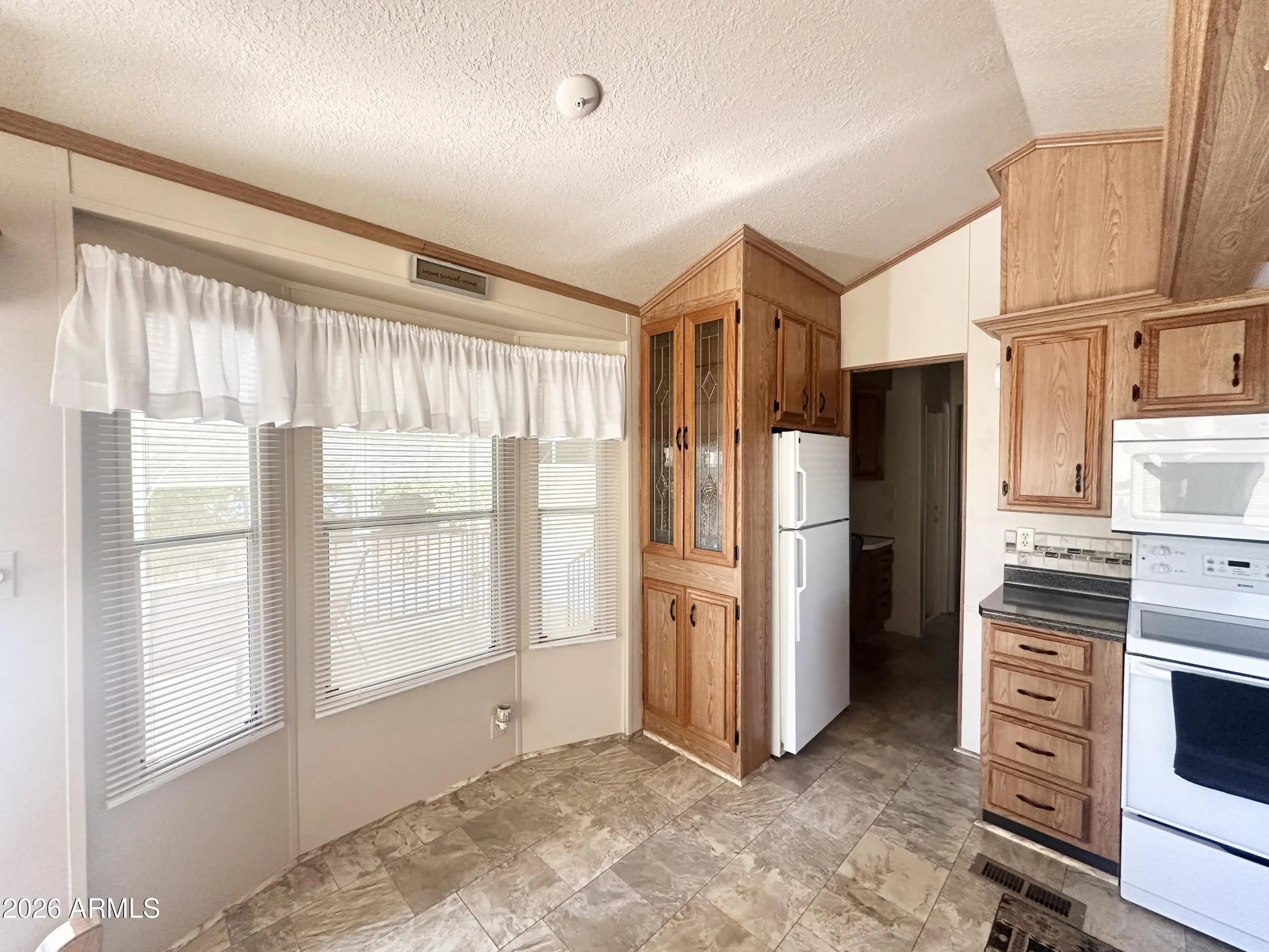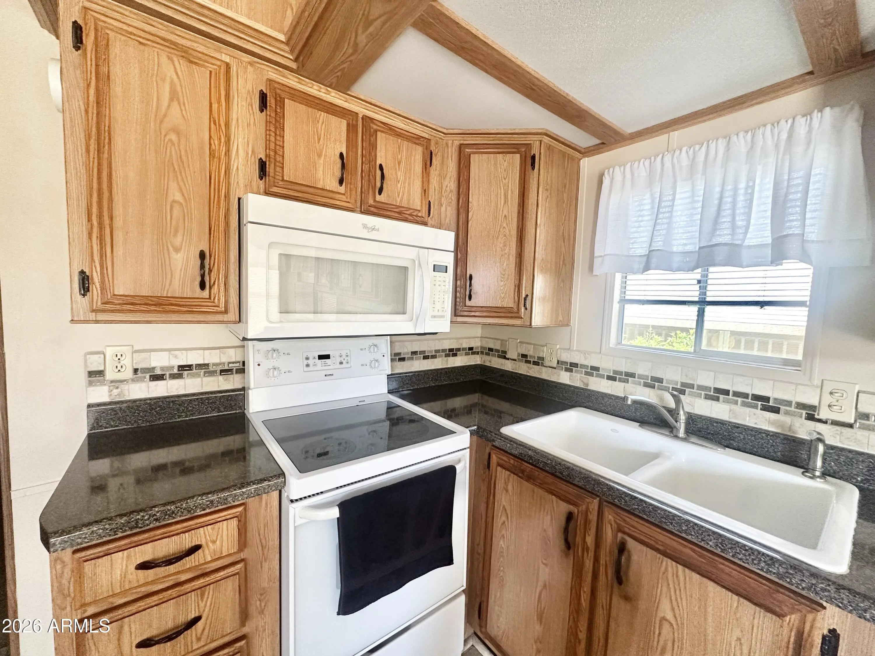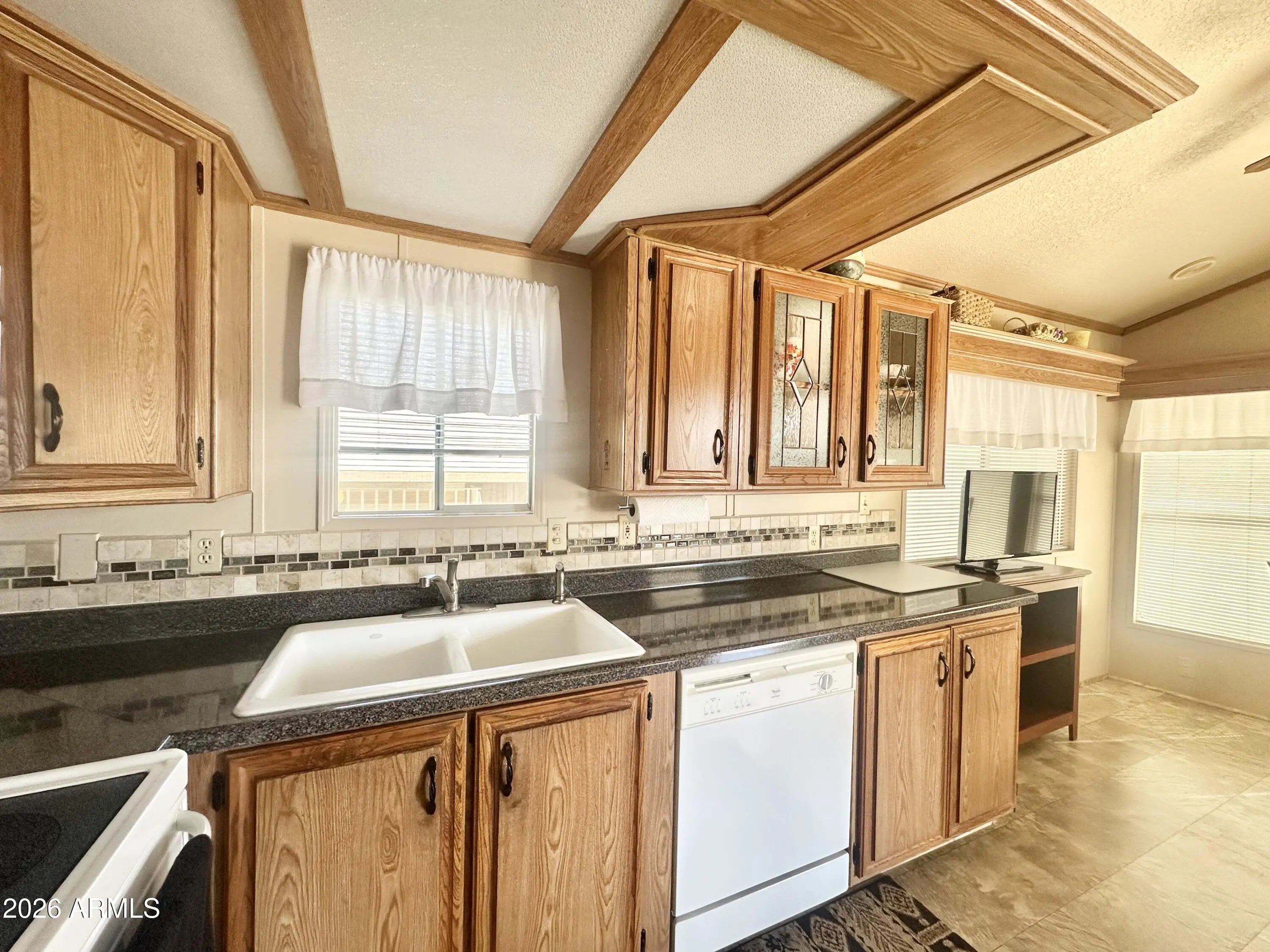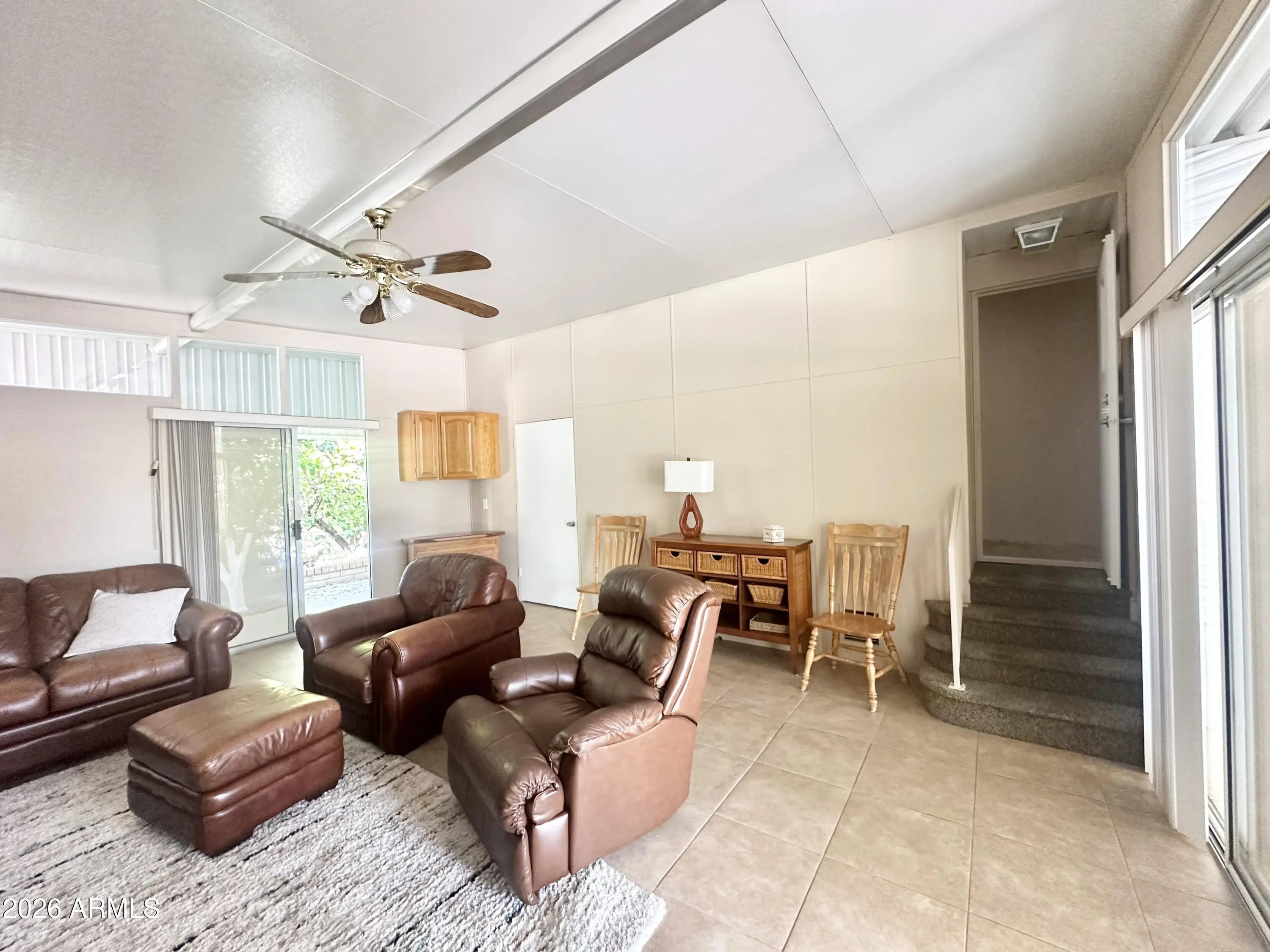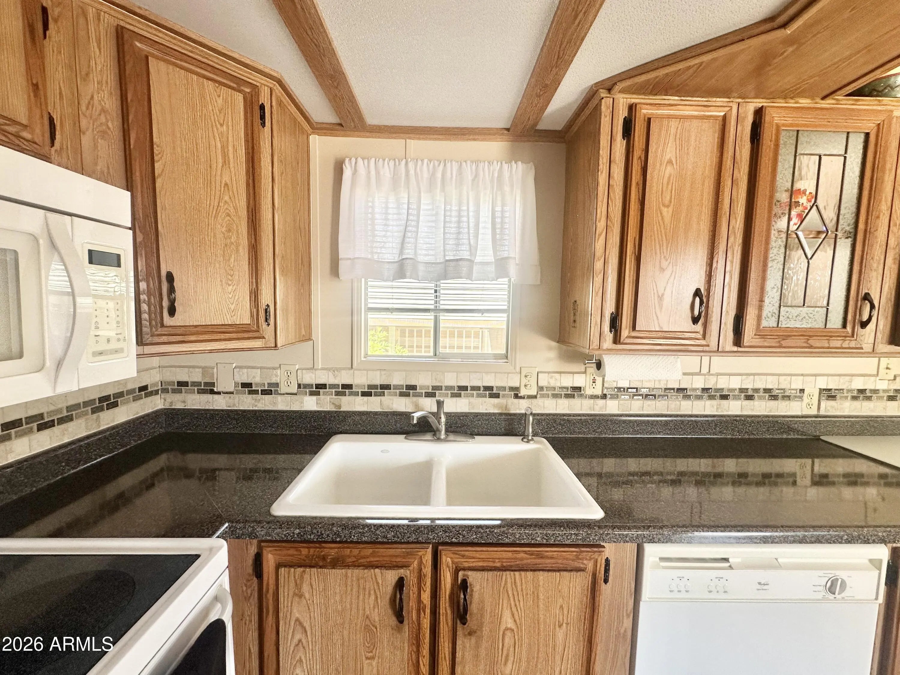 Spacious Home on an Oversized Lot in Greenfield Village! Situated on a large, extended lot, this one-of-a-kind home offers exceptional indoor and outdoor living space, perfect for entertaining, relaxing, and enjoying the Arizona lifestyle. Step onto the huge front deck, ideal for morning coffee or evening gatherings, and into the home's open-concept layout featuring vaulted ceilings and a bright dining area. The kitchen is well-appointed with a flat-top range, microwave, dishwasher, garbage disposal, and a large porcelain sink, making it both functional and inviting. Down the hallway, you'll find a built-in desk with storage, perfect for a home office or hobby space. The spacious bathroom includes a newer walk-in shower and convenient pocket door. The primary bedroom offers a comfortable retreat with a large closet, built-in shelving, and ample storage. One of the standout features is the impressive 20x20 Arizona room, complete with vaulted ceilings, oversized windows, and transom windows that fill the space with natural light. A large patio door provides seamless access to the carport area, while an additional sliding glass door leads to the covered back patio with fruit trees--a perfect setting for outdoor entertaining. Just off the Arizona room, you'll find a super-sized laundry room with a three-quarter bath, walk-in shower, extensive cabinetry, oversized closet, extra refrigerator/freezer, second water heater, and even loft storage above--offering incredible versatility and convenience. Additional highlights include a newer AC unit, sunscreens, a recently coated roof and new PEX plumbing in 2024. This home truly stands out with its generous space, thoughtful layout, and entertaining potential--all located in the highly desirable 55 + Greenfield Village community. Own the land own the fun!