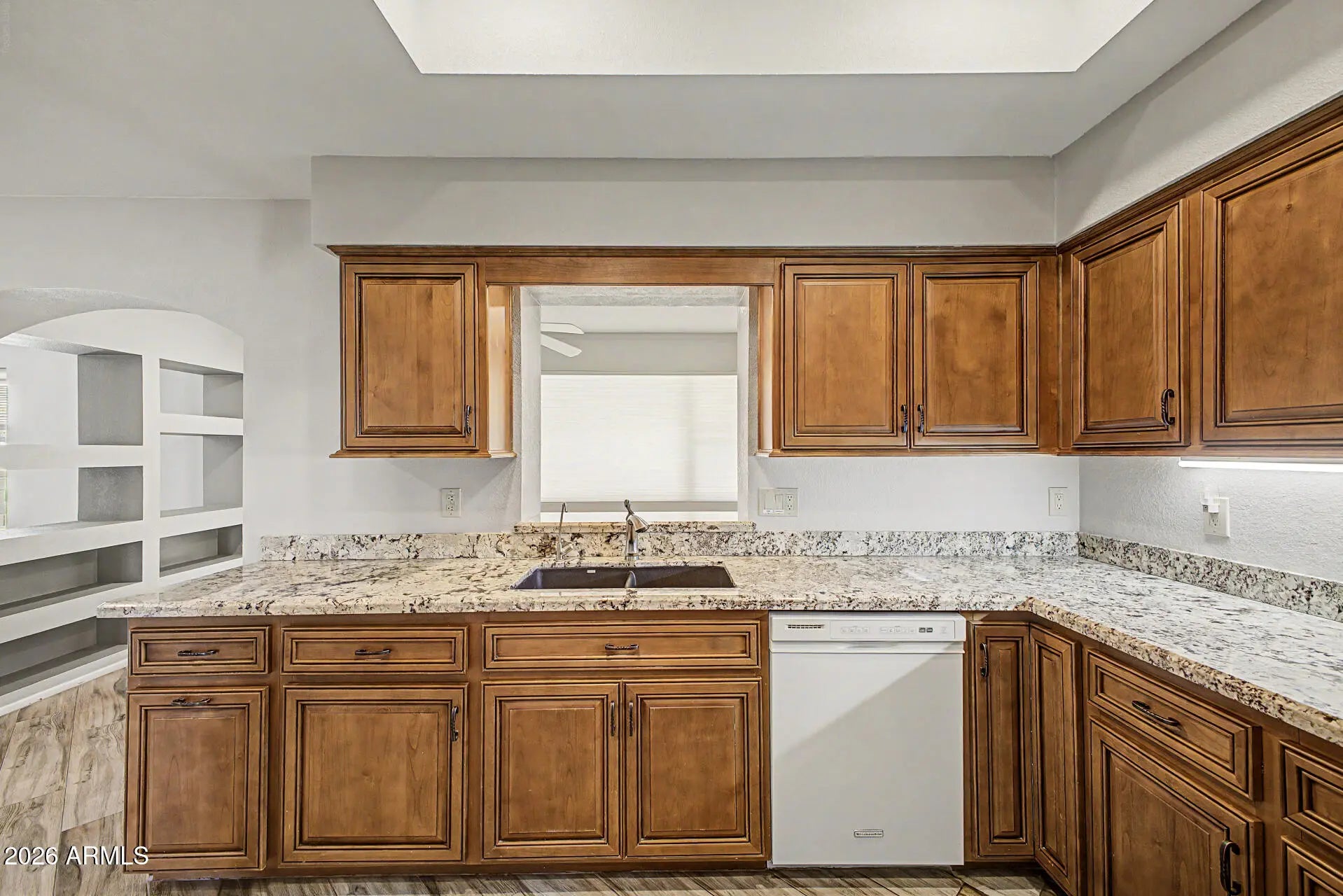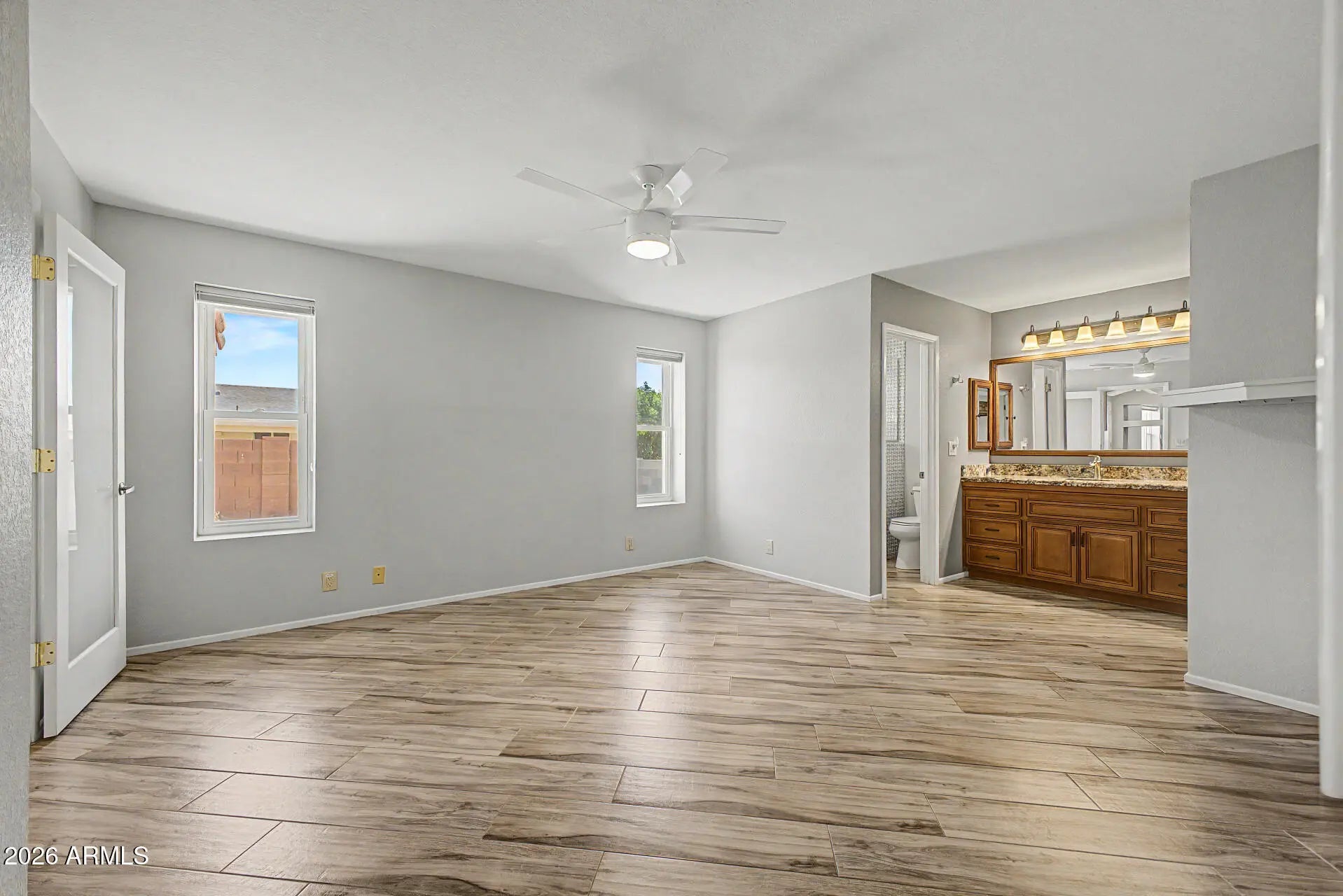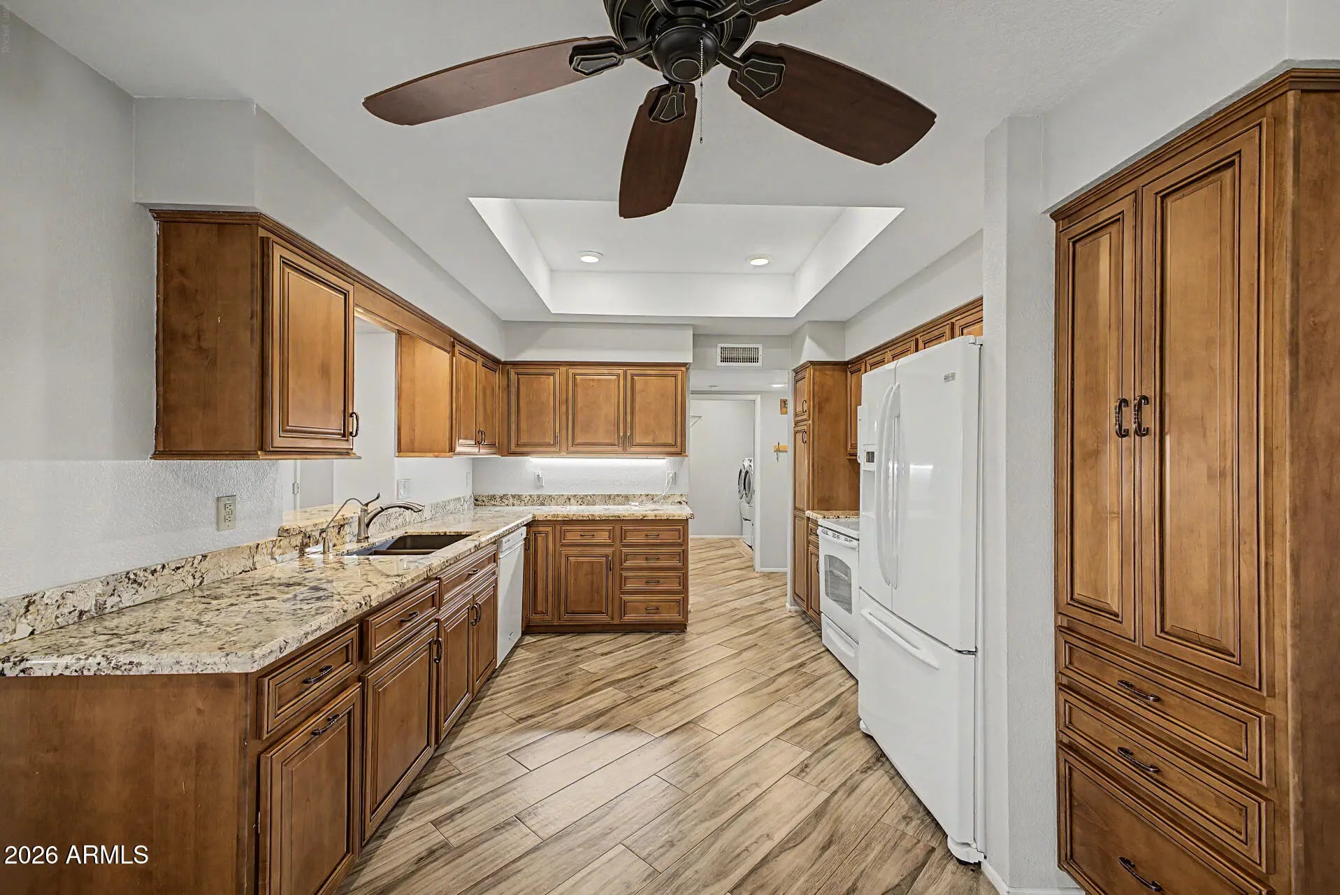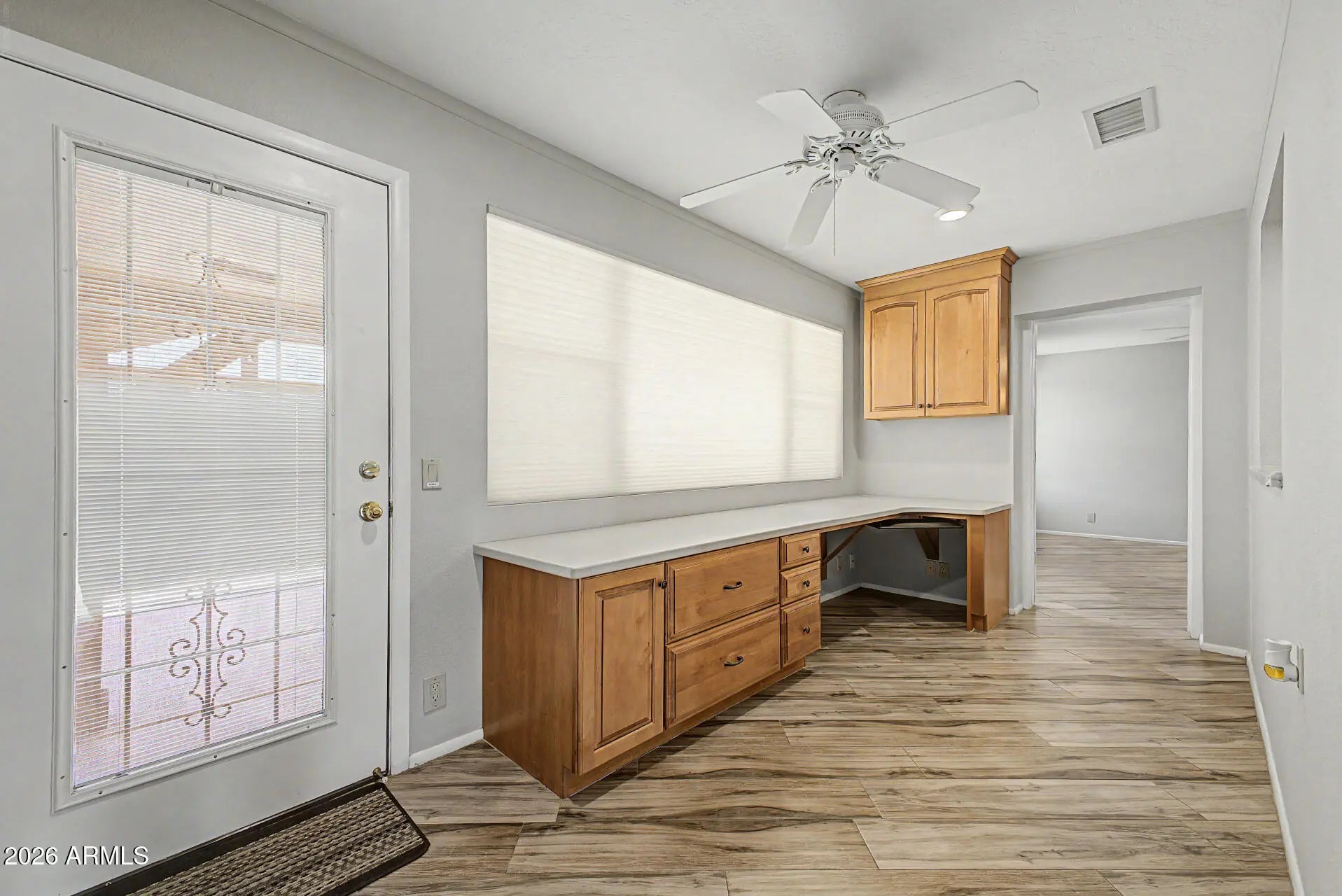 Just appraised at $455K. Listed well below market value. A lovely 2-bedroom, 2-bath home. Inside, you'll find a living room with vaulted ceilings with plantation shutters, a large family room, and an office. A spacious 2-car garage, desert landscaping, and an inviting front patio. Stylish wood-plank tile flooring throughout. The kitchen with granite counters, ample wood cabinetry, recessed lighting, and essential built-in appliances. The primary bedroom with on-suite bathroom, no step shower, and walk-in closet. Private backyard, with a covered patio.