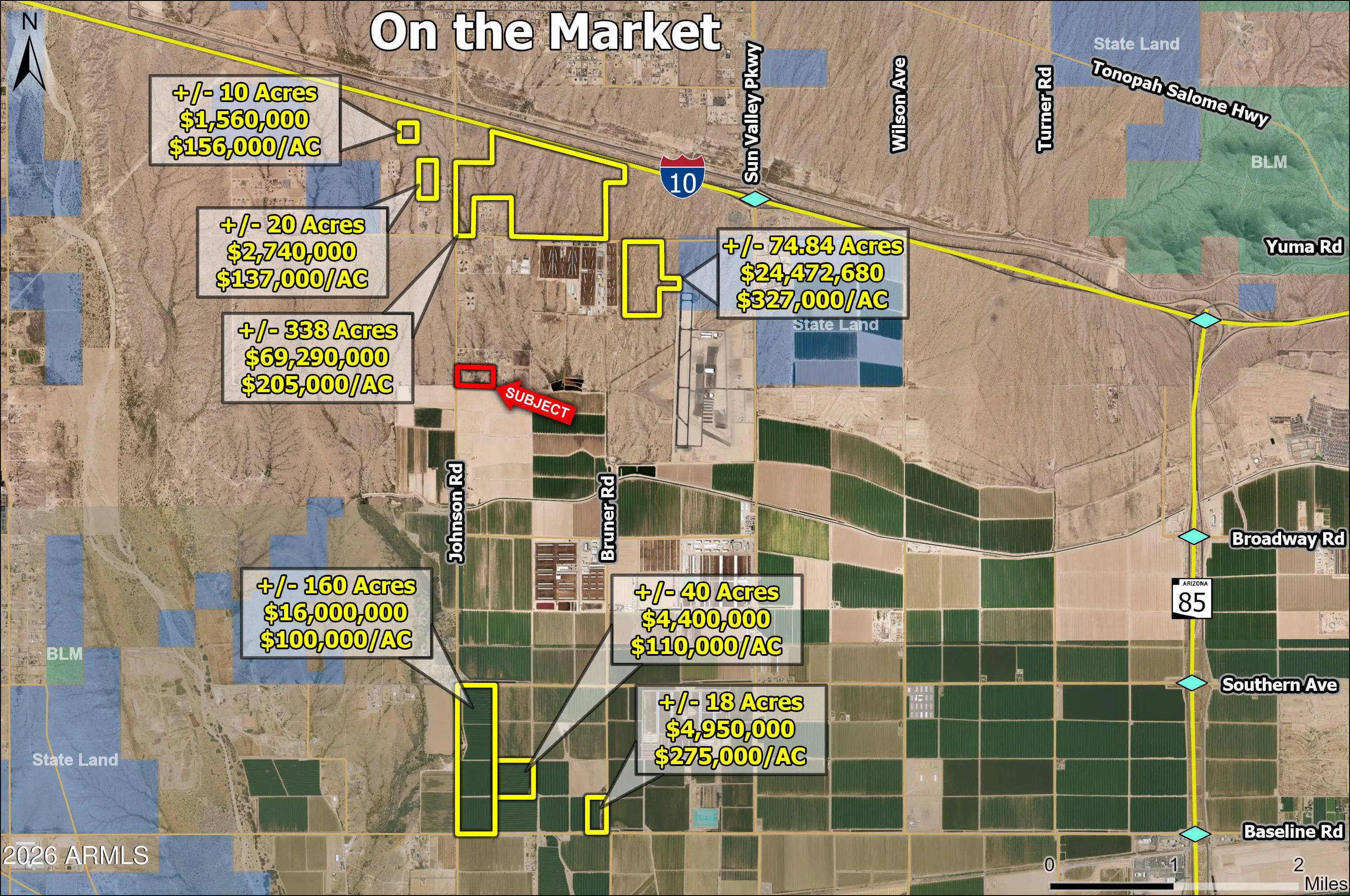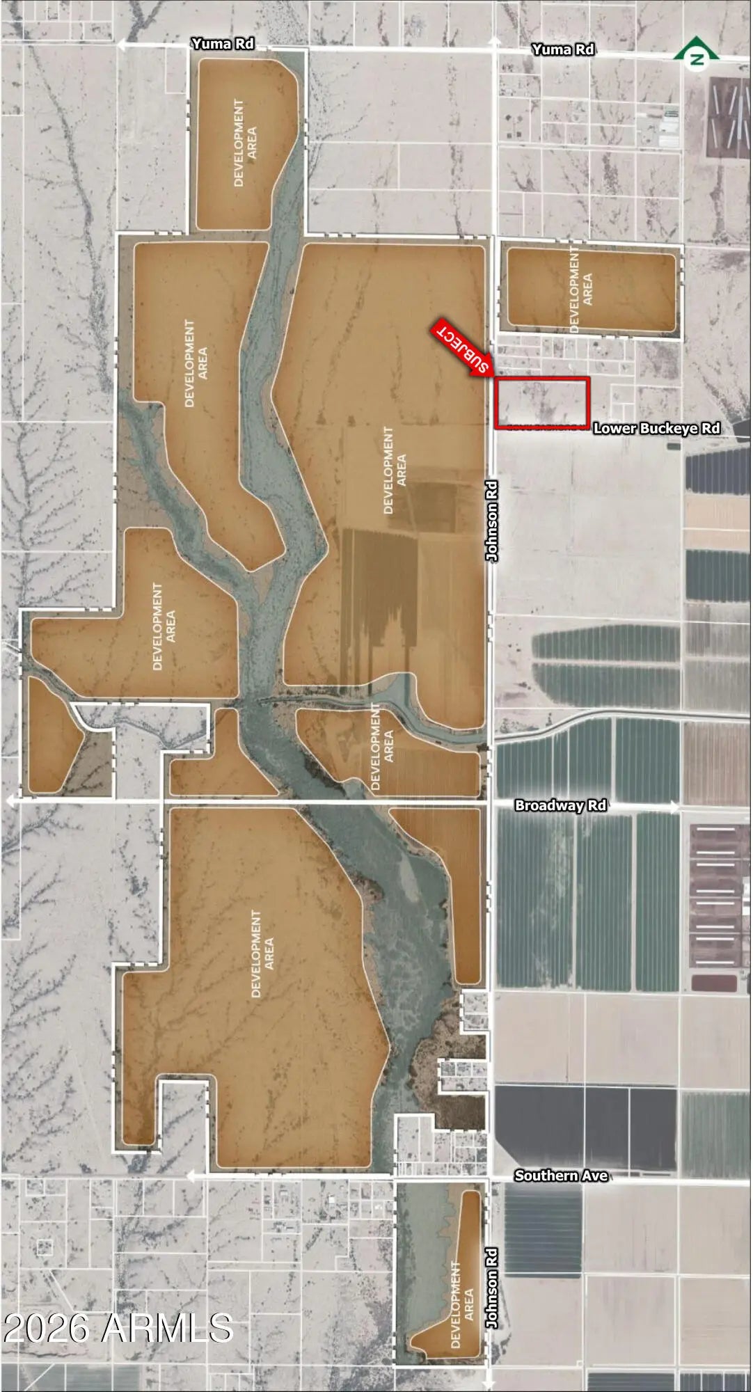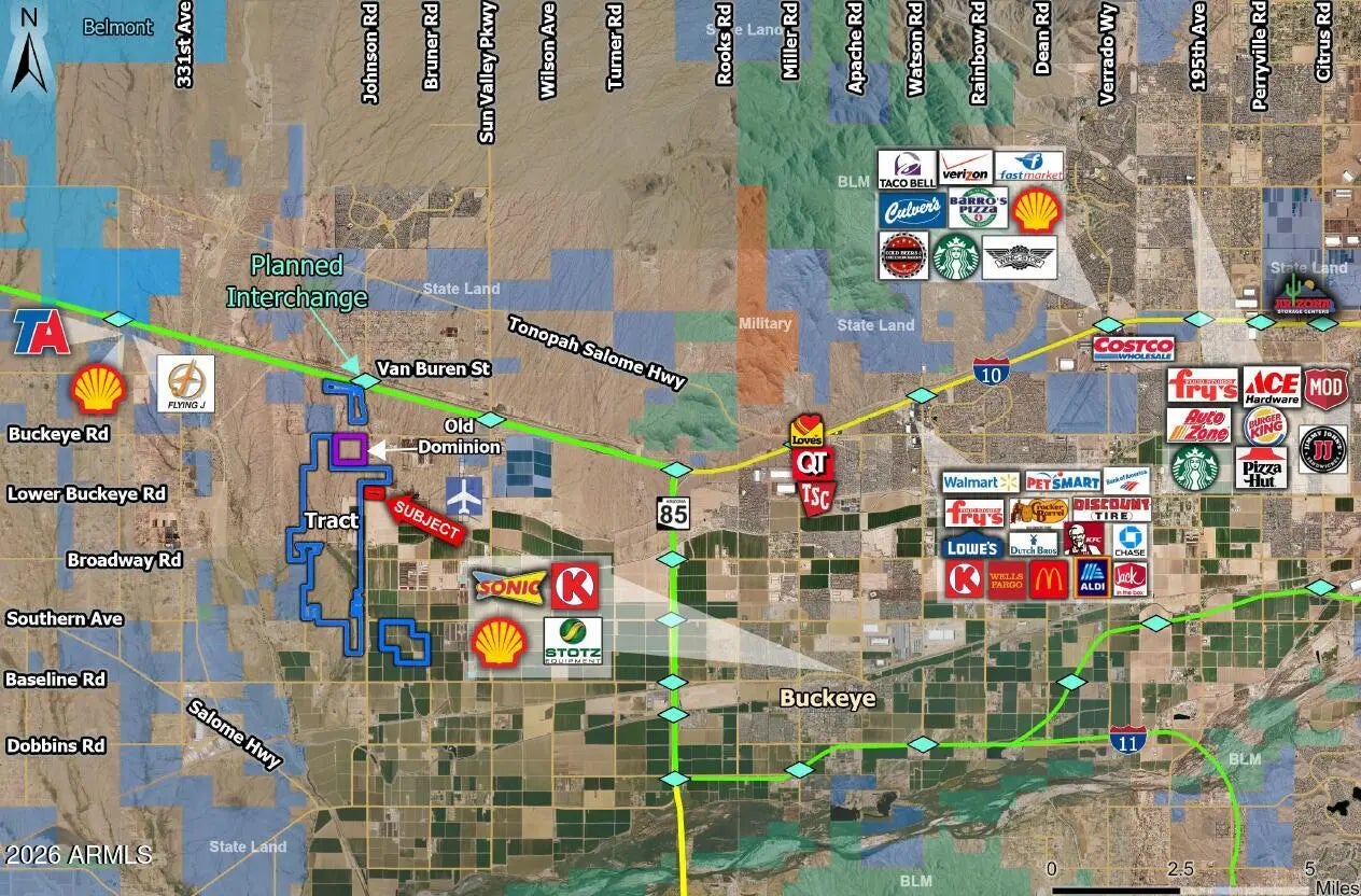 Hard corner of Johnson & Lower Buckeye, ideal for Industrial and Commercial uses. Johnson Rd is a planned I-10 interchange exit with nearly $20MM already allocated for its development. Direct neighbor to Tract's Buckeye Technology Park, the largest contiguous data center project in the Phoenix Market. Massive infrastructure upgrades are already underway to support this 2,019 acre, 1.8-Gigawatt project. Located less than ½ mile South of Old Dominion's new Buckeye terminal, which is set to begin construction in 2026, and will bring up to 350 high salary jobs upon completion.