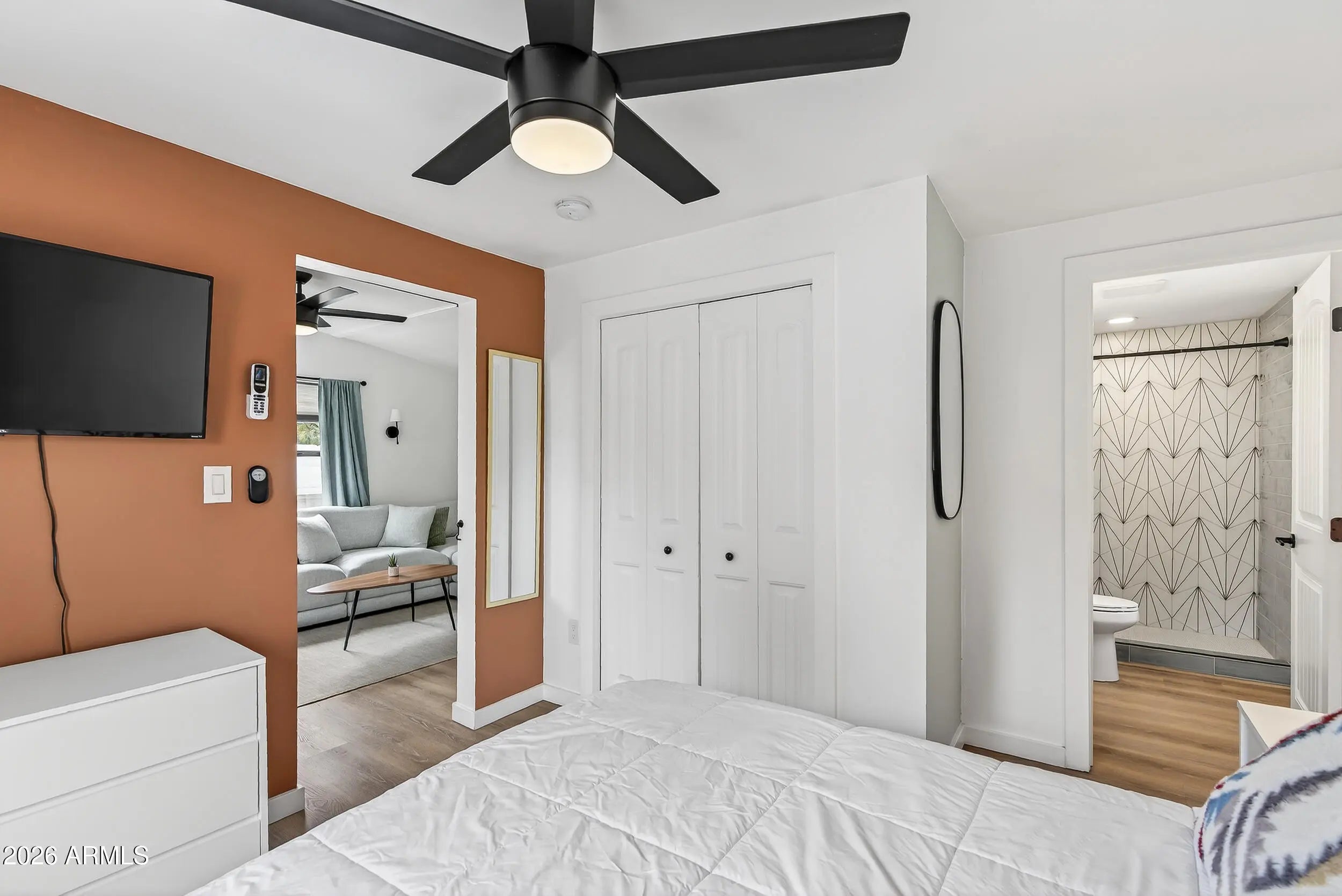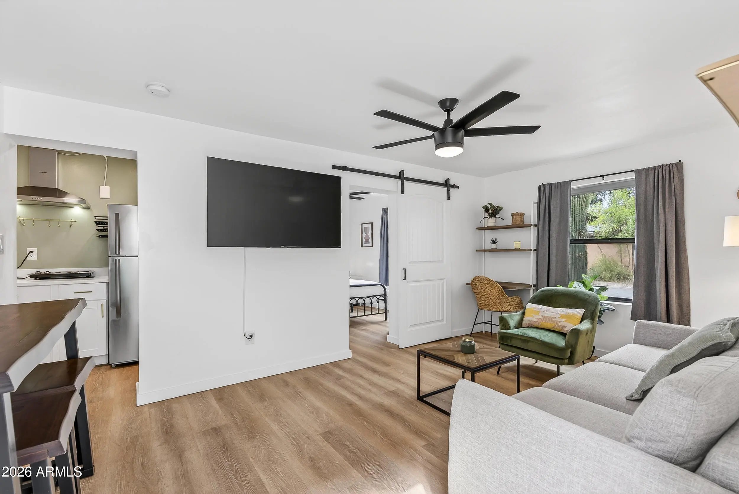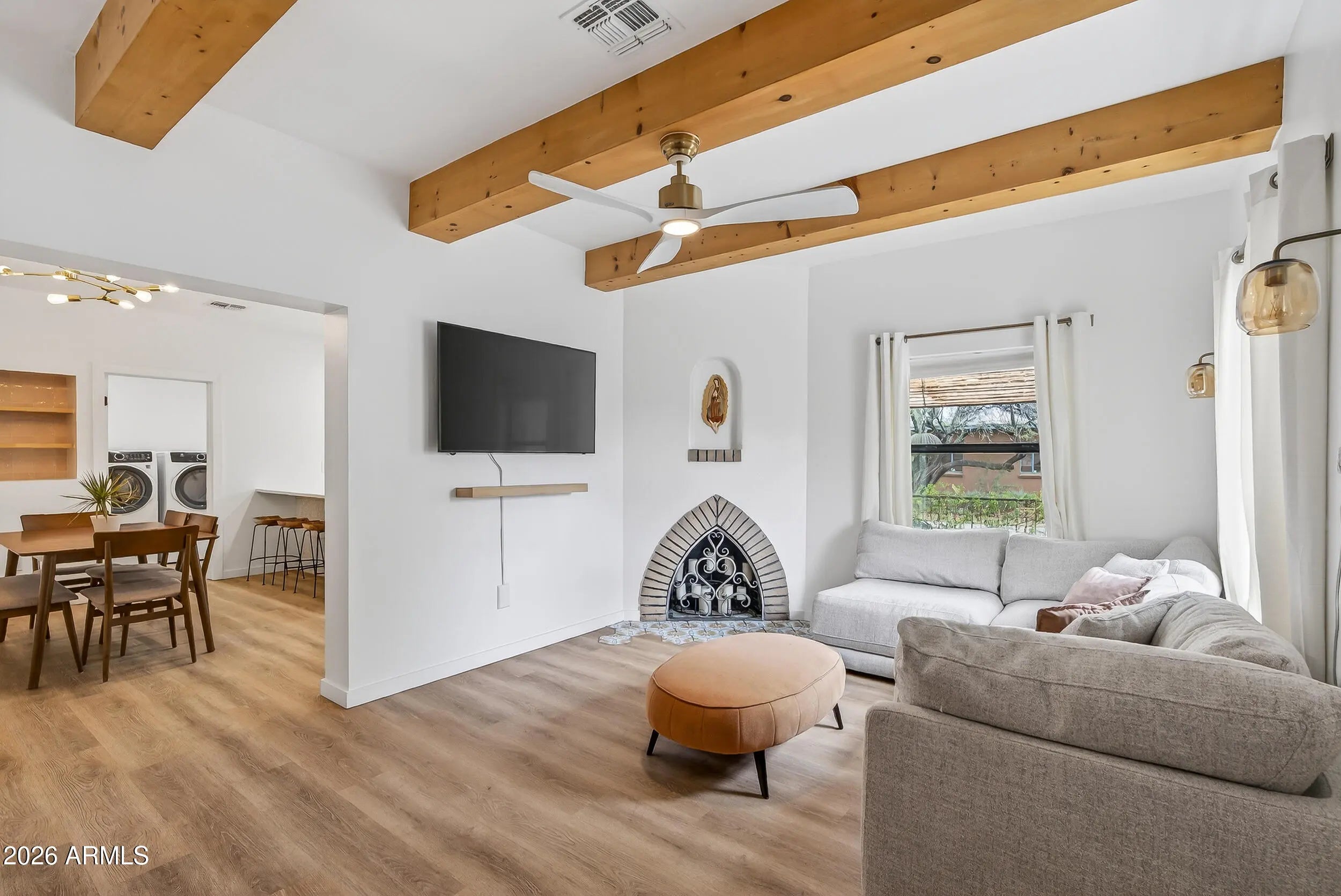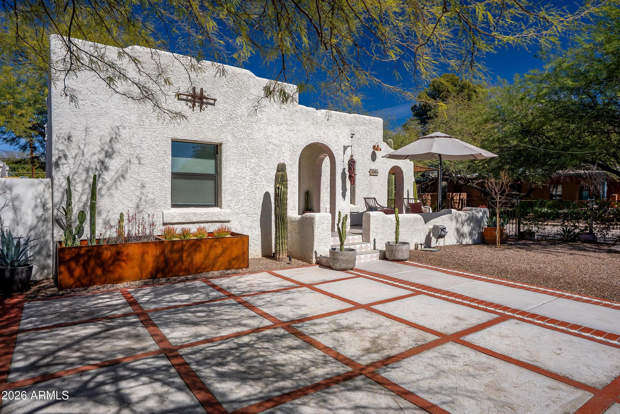 Located on a prime corner lot in the coveted Sam Hughes neighborhood of Tucson, this stunning modern Southwestern property blends timeless desert charm with contemporary luxury and exceptional versatility. The main residence showcases thoughtful design and elevated finishes throughout, featuring quartz countertops, crisp white shaker cabinetry, a peninsula with breakfast bar seating, and double ovens in the beautifully appointed kitchen. Striking exposed beams and modern designer lighting add warmth and architectural character to the open living spaces. The primary suite offers a spa-inspired retreat with a custom ceramic tile shower, while a finished basement bonus room/studio provides flexible space ideal for a home office, art studio, gym, or media room.